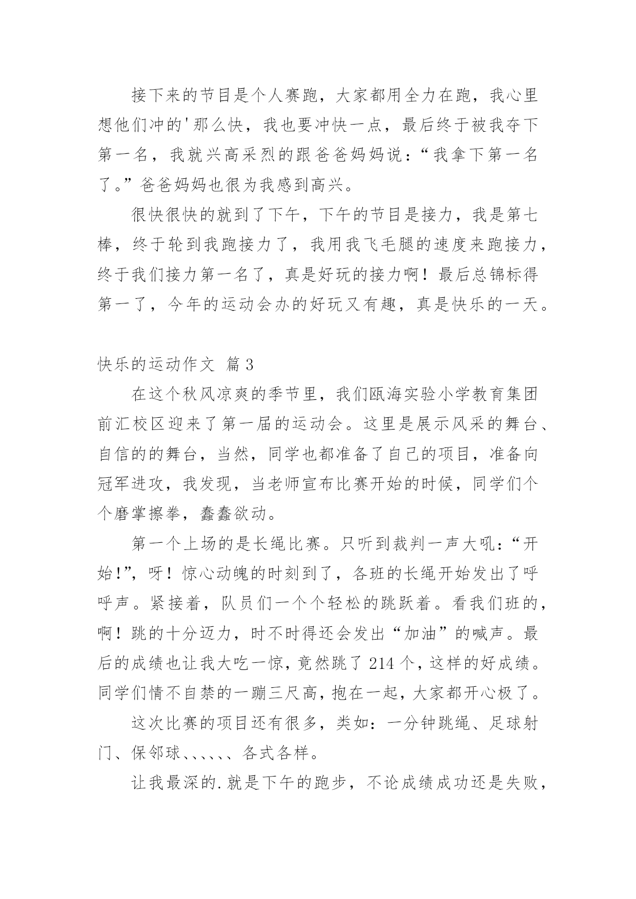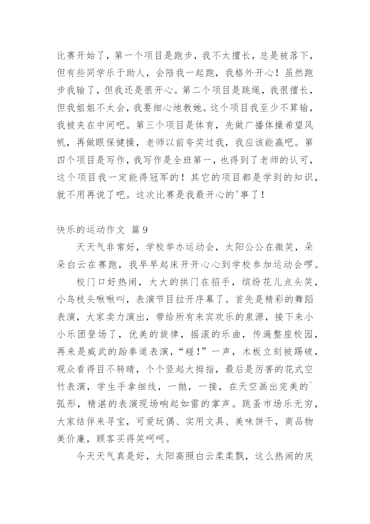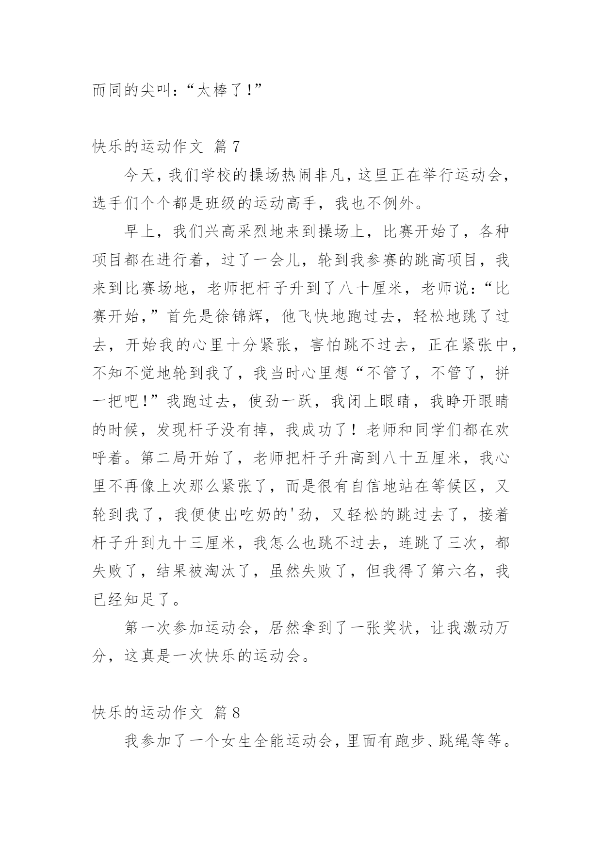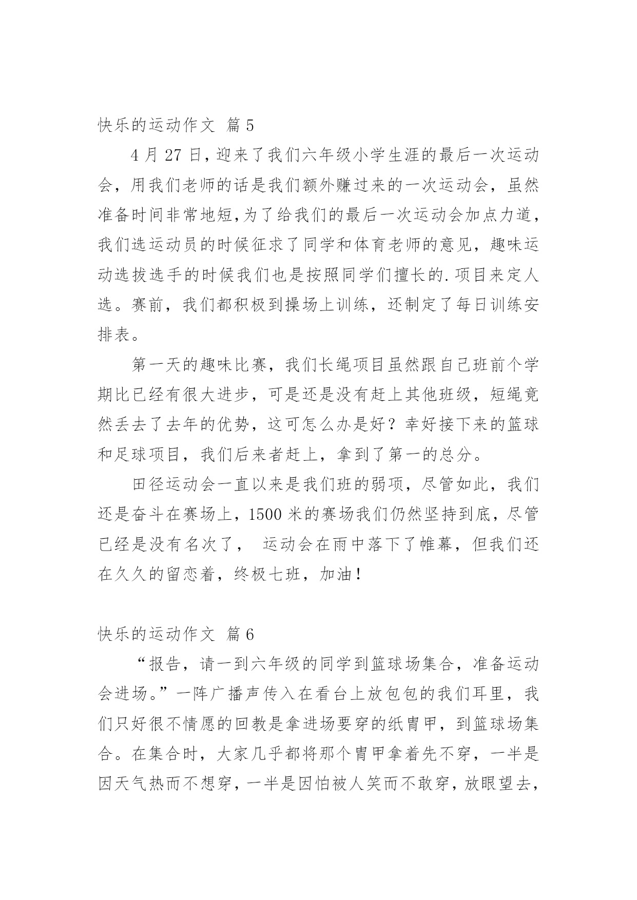 快乐的运动作文【精选】快乐的运动作文汇总9篇无论在学习、工作或是生活中,大家都尝试过写作文吧,作文是通过文字来表达一个主题意义的记叙方法。那么你知道一篇好的作文该怎么写吗?下面是小编精心整理的快乐的运动作文9篇,欢迎阅读与收藏。快乐的运动作文篇1学校一年一度的运动会马上就要举行了,我和同学们怀着激动的心情来到学校,准备在这次运动会上再展雄风。其实昨天我是有点怪“老天爷”的,本来好好的天气说变就变了,运动会的计划也泡了汤。今天天公作美,万里无云,这让我的心情好了很多,也忘却了昨天的不快,精神饱满的来参加运动会了,铃声一响,我就飞奔进了教室,等待老师的安排。我们听从学校的安排来到操场上,那里已经有好多同学和我一样,满怀激情的等待运动会的开始;我参加的项目是50米跑和班级的迎面接力比赛。首先开始的是接力比赛,男女生各十名,相距30米进行接力棒的传递;一开始,我们班就处在领先的.位置,我的小伙伴都很认真的传递着接力棒,一点也不敢马虎,当时的我好想得到第一名,所以拿到接力棒就拼命的冲向终点,结果在我们的齐心协力下,终于梦想成真,夺得了年级比赛第一名。全班同学都在欢歌跳跃,我们好开心啊!50米跑开始了,我站在赛道上,心里既紧张又激动,听到发令枪一响,拼命向前冲去,听到旁边同学们的加油声,我加快速度奔向终点,最后只得了第二名,心里很难过。这时明老师笑着安慰我说:“没有关系,下次再来,要知道失败是成功之母。”我点点头,下定决心下次的运动会一定要为班级拿第一名,不辜负老师的期望。这次的运动会我好开心,同时也让我知道失败只要不气馁,成功的机会还有很多,我一定要吸收教训,相信我一定能做的更好。快乐的运动作文篇2十月二十八日星期六是大安小学的运动会,早上一来到学校我就看到一个个风车在那边转呀!转呀!风一停他就不转了。一到教室就听到同学们在那边七嘴八舌的讨论,大家都很期待运动会的开始。运动会终于正式开始了,我们第一个节目是进场,我们兴高采烈的在小操场等待,时间像水一样的快速,很快很快的就轮到我们,我们脸上戴着帅气十足的眼罩,手上拿着五颜六色的指挥棒,真是美丽动人。时间一分一秒的过去,很快很快的就到了团体进赛,我们团体进赛的名称叫“魔法魅地奇”大家都用像飞机一样快速的脚往前冲,最后的名次很不理想,是第三名,老师和我们都很失望。接下来的节目是个人赛跑,大家都用全力在跑,我心里想他们冲的'那么快,我也要冲快一点,最后终于被我夺下第一名,我就兴高采烈的跟爸爸妈妈说:“我拿下第一名了。”爸爸妈妈也很为我感到高兴。很快很快的就到了下午,下午的节目是接力,我是第七棒,终于轮到我跑接力了,我用我飞毛腿的速度来跑接力,终于我们接力第一名了,真是好玩的接力啊!最后总锦标得第一了,今年的运动会办的好玩又有趣,真是快乐的一天。快乐的运动作文篇3在这个秋风凉爽的季节里,我们瓯海实验小学教育集团前汇校区迎来了第一届的运动会。这里是展示风采的舞台、自信的的舞台,当然,同学也都准备了自己的项目,准备向冠军进攻,我发现,当老师宣布比赛开始的时候,同学们个个磨掌擦拳,蠢蠢欲动。第一个上场的是长绳比赛。只听到裁判一声大吼:“开始!”,呀!惊心动魄的时刻到了,各班的长绳开始发出了呼呼声。紧接着,队员们一个个轻松的跳跃着。看我们班的,啊!跳的十分迈力,时不时得还会发出“加油”的喊声。最后的成绩也让我大吃一惊,竟然跳了214个,这样的好成绩。同学们情不自禁的一蹦三尺高,抱在一起,大家都开心极了。这次比赛的项目还有很多,类如:一分钟跳绳、足球射门、保邻球、、、、、、各式各样。让我最深的.就是下午的跑步,不论成绩成功还是失败,选手们都能坚持到底,永不放弃。特别是我们班的黄佳颖同学,她在一队队精英里脱颖而出。一声枪响,她简直像一个冲刺的流星,飞了出去,转眼,他已经跑到路途的一半了,旁边立刻从四面八方传来了呐喊声,“黄佳颖加油!加油!向前冲!”、、、、、、近了近了,更近了!啊!黄佳颖以最快的速度,取得了女子组200米第一名!让我佩服得五体投地。我们班的同学也不例外,团团将她围住,并且一口一个黄佳颖、、、、、、啊!运动会真是个神圣而又快乐的运动!快乐的运动作文篇4我们盼望已久的秋季运动会终于召开了,有各种各样、丰富多彩的项目。运动会那天,我们全校师生个个精神抖擞,走到操场,坐在椅子上观看表演。先是高年级的`大哥哥骑着自行车在操场上转了一圈,我也会骑大自行车,我也想上去表演一下。接着是中年级同学的溜冰表演,啊!他们滑的真好呀!我好佩服哎!最后是滑板车和老师拔河比赛,我们都为老师们加油呀!我们为那方加油的老师胜利了。我们欢快的跳了起来。接下来是广播操比赛,我们三年级的同学纷纷跑上操场,做操了,我们都做了起来,我很紧张,害怕做错,一会儿做完了,我们再次跑回自己的椅子上,坐好,准备散会。在这个运动会里,我们开