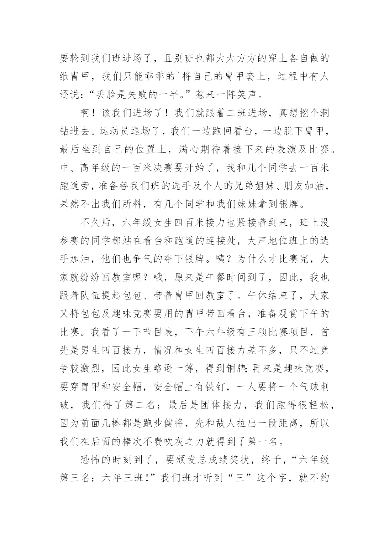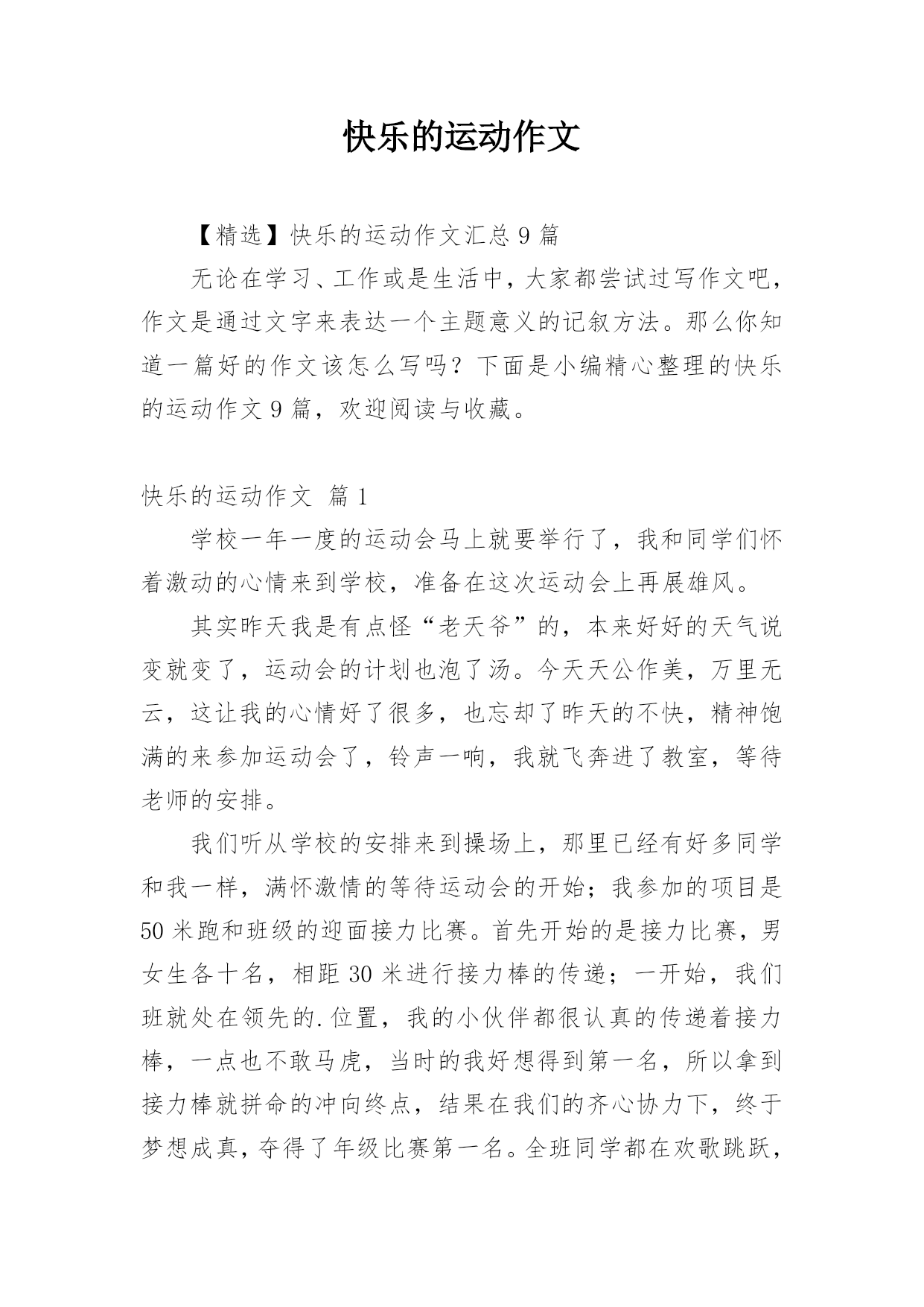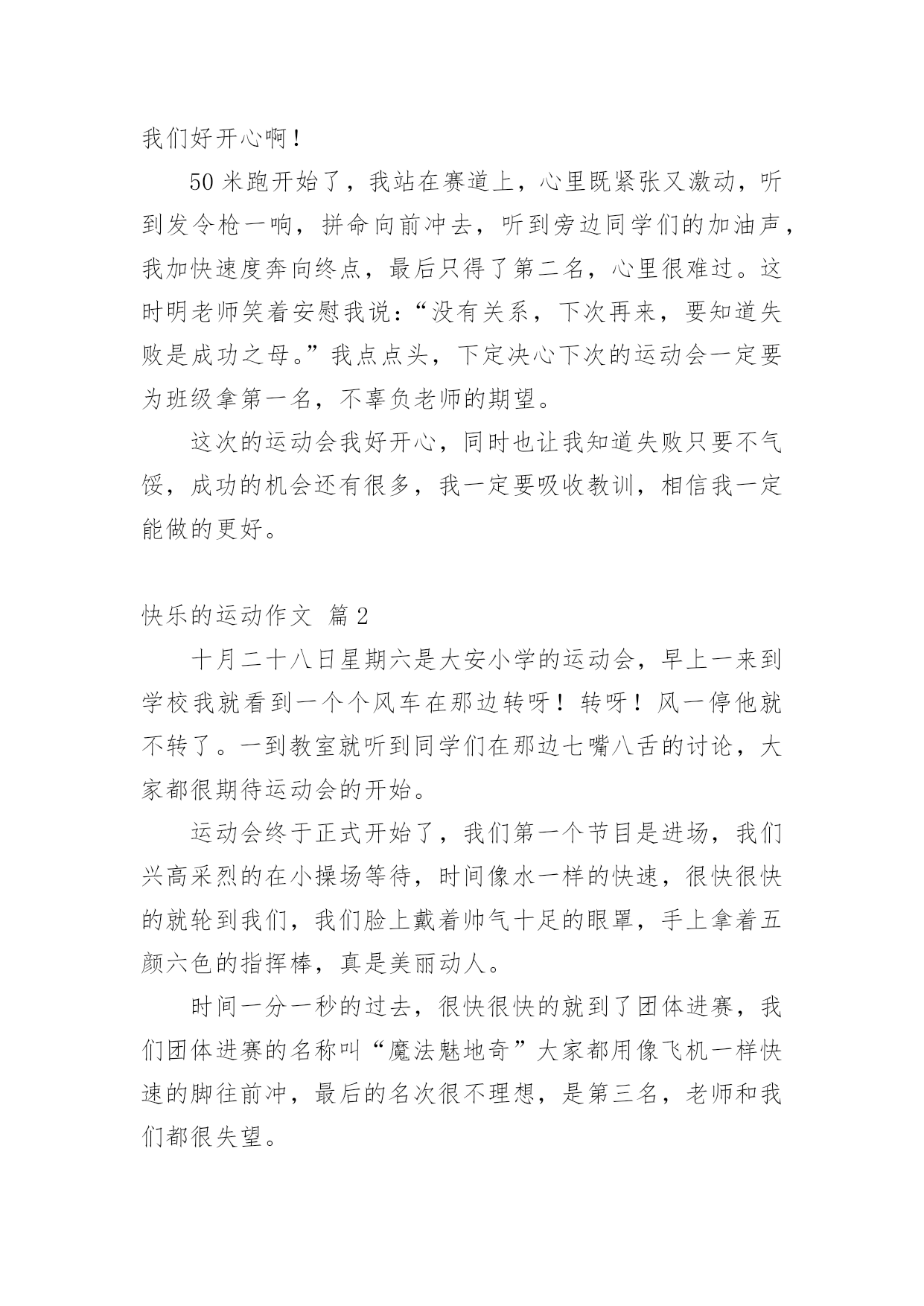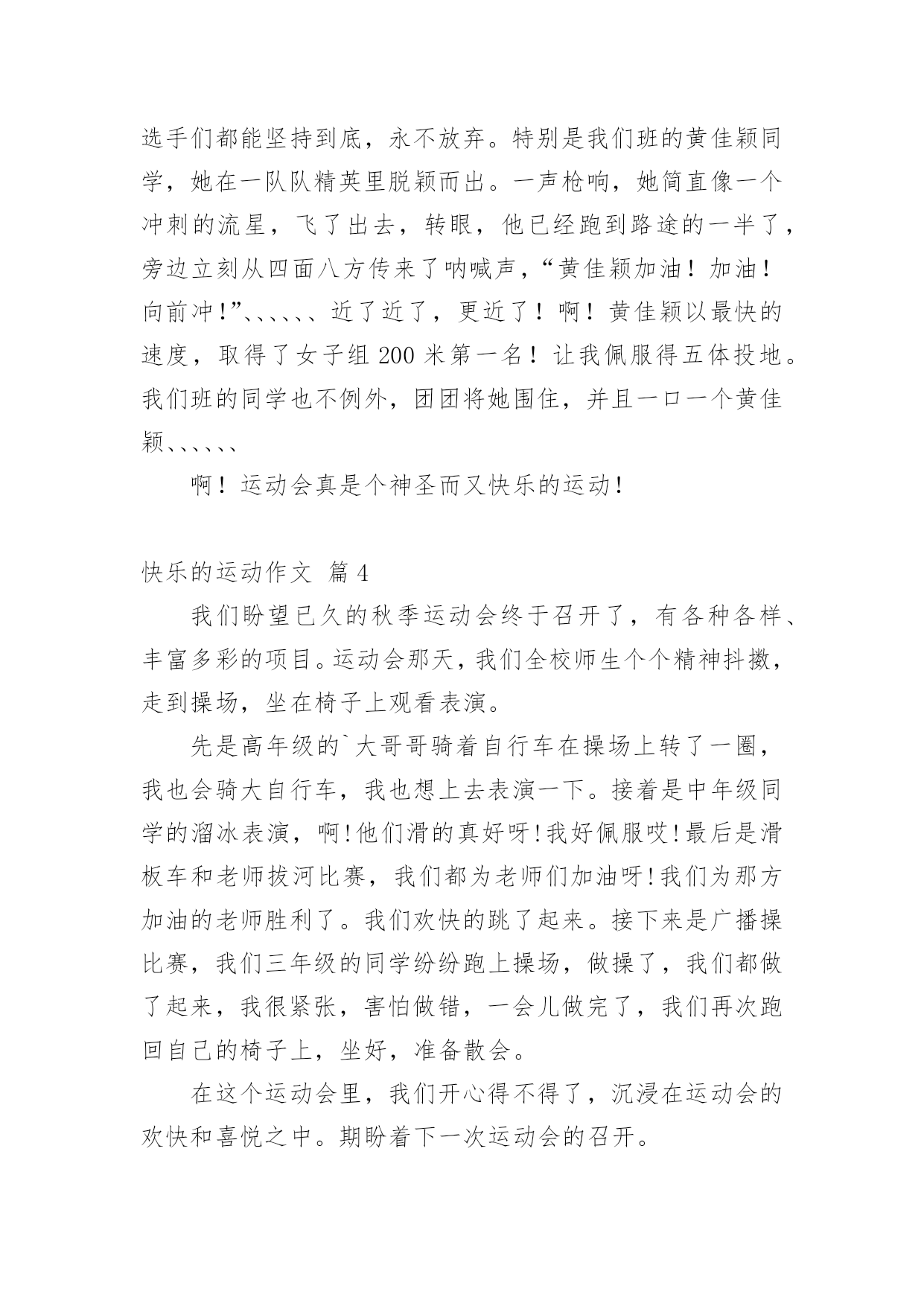 快乐的运动作文【精选】快乐的运动作文汇总9篇无论在学习、工作或是生活中,大家都尝试过写作文吧,作文是通过文字来表达一个主题意义的记叙方法。那么你知道一篇好的作文该怎么写吗?下面是小编精心整理的快乐的运动作文9篇,欢迎阅读与收藏。快乐的运动作文篇1学校一年一度的运动会马上就要举行了,我和同学们怀着激动的心情来到学校,准备在这次运动会上再展雄风。其实昨天我是有点怪“老天爷”的,本来好好的天气说变就变了,运动会的计划也泡了汤。今天天公作美,万里无云,这让我的心情好了很多,也忘却了昨天的不快,精神饱满的来参加运动会了,铃声一响,我就飞奔进了教室,等待老师的安排。我们听从学校的安排来到操场上,那里已经有好多同学和我一样,满怀激情的等待运动会的开始;我参加的项目是50米跑和班级的迎面接力比赛。首先开始的是接力比赛,男女生各十名,相距30米进行接力棒的传递;一开始,我们班就处在领先的.位置,我的小伙伴都很认真的传递着接力棒,一点也不敢马虎,当时的我好想得到第一名,所以拿到接力棒就拼命的冲向终点,结果在我们的齐心协力下,终于梦想成真,夺得了年级比赛第一名。全班同学都在欢歌跳跃,我们好开心啊!50米跑开始了,我站在赛道上,心里既紧张又激动,听到发令枪一响,拼命向前冲去,听到旁边同学们的加油声,我加快速度奔向终点,最后只得了第二名,心里很难过。这时明老师笑着安慰我说:“没有关系,下次再来,要知道失败是成功之母。”我点点头,下定决心下次的运动会一定要为班级拿第一名,不辜负老师的期望。这次的运动会我好开心,同时也让我知道失败只要不气馁,成功的机会还有很多,我一定要吸收教训,相信我一定能做的更好。快乐的运动作文篇2十月二十八日星期六是大安小学的运动会,早上一来到学校我就看到一个个风车在那边转呀!转呀!风一停他就不转了。一到教室就听到同学们在那边七嘴八舌的讨论,大家都很期待运动会的开始。运动会终于正式开始了,我们第一个节目是进场,我们兴高采烈的在小操场等待,时间像水一样的快速,很快很快的就轮到我们,我们脸上戴着帅气十足的眼罩,手上拿着五颜六色的指挥棒,真是美丽动人。时间一分一秒的过去,很快很快的就到了团体进赛,我们团体进赛的名称叫“魔法魅地奇”大家都用像飞机一样快速的脚往前冲,最后的名次很不理想,是第三名,老师和我们都很失望。接下来的节目是个人赛跑,大家都用全力在跑,我心里想他们冲的'那么快,我也要冲快一点,最后终于被我夺下第一名,我就兴高采烈的跟爸爸妈妈说:“我拿下第一名了。”爸爸妈妈也很为我感到高兴。很快很快的就到了下午,下午的节目是接力,我是第七棒,终于轮到我跑接力了,我用我飞毛腿的速度来跑接力,终于我们接力第一名了,真是好玩的接力啊!最后总锦标得第一了,今年的运动会办的好玩又有趣,真是快乐的一天。快乐的运动作文篇3在这个秋风凉爽的季节里,我们瓯海实验小学教育集团前汇校区迎来了第一届的运动会。这里是展示风采的舞台、自信的的舞台,当然,同学也都准备了自己的项目,准备向冠军进攻,我发现,当老师宣布比赛开始的时候,同学们个个磨掌擦拳,蠢蠢欲动。第一个上场的是长绳比赛。只听到裁判一声大吼:“开始!”,呀!惊心动魄的时刻到了,各班的长绳开始发出了呼呼声。紧接着,队员们一个个轻松的跳跃着。看我们班的,啊!跳的十分迈力,时不时得还会发出“加油”的喊声。最后的成绩也让我大吃一惊,竟然跳了214个,这样的好成绩。同学们情不自禁的一蹦三尺高,抱在一起,大家都开心极了。这次比赛的项目还有很多,类如:一分钟跳绳、足球射门、保邻球、、、、、、各式各样。让我最深的.就是下午的跑步,不论成绩成功还是失败,选手们都能坚持到底,永不放弃。特别是我们班的黄佳颖同学,她在一队队精英里脱颖而出。一声枪响,她简直像一个冲刺的流星,飞了出去,转眼,他已经跑到路途的一半了,旁边立刻从四面八方传来了呐喊声,“黄佳颖加油!加油!向前冲!”、、、、、、近了近了,更近了!啊!黄佳颖以最快的速度,取得了女子组200米第一名!让我佩服得五体投地。我们班的同学也不例外,团团将她围住,并且一口一个黄佳颖、、、、、、啊!运动会真是个神圣而又快乐的运动!快乐的运动作文篇4我们盼望已久的秋季运动会终于召开了,有各种各样、丰富多彩的项目。运动会那天,我们全校师生个个精神抖擞,走到操场,坐在椅子上观看表演。先是高年级的`大哥哥骑着自行车在操场上转了一圈,我也会骑大自行车,我也想上去表演一下。接着是中年级同学的溜冰表演,啊!他们滑的真好呀!我好佩服哎!最后是滑板车和老师拔河比赛,我们都为老师们加油呀!我们为那方加油的老师胜利了。我们欢快的跳了起来。接下来是广播操比赛,我们三年级的同学纷纷跑上操场,做操了,我们都做了起来,我很紧张,害怕做错,一会儿做完了,我们再次跑回自己的椅子上,坐好,准备散会。在这个运动会里,我们开