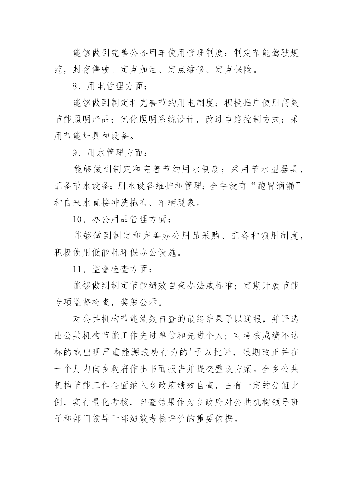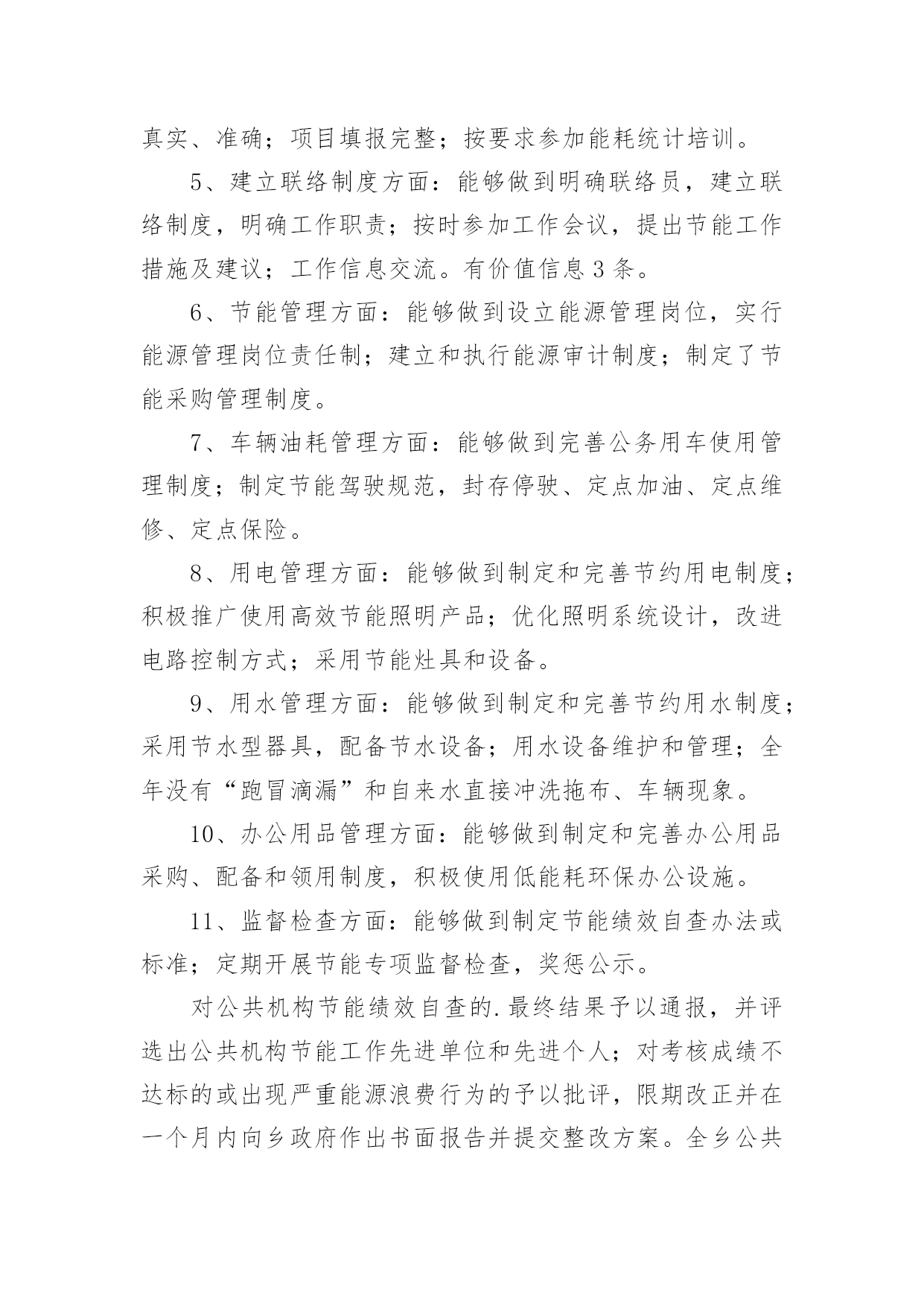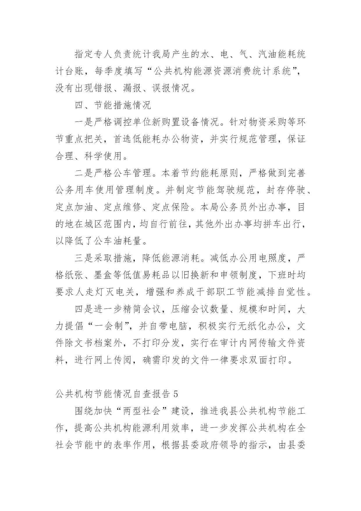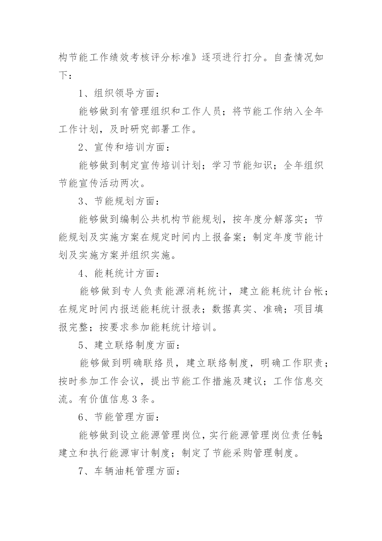 公共机构节能情况自查报告公共机构节能情况自查报告精选6篇在人们越来越注重自身素养的今天,越来越多的事务都会使用到报告,报告根据用途的不同也有着不同的类型。为了让您不再为写报告头疼,下面是小编为大家整理的公共机构节能情况自查报告,仅供参考,大家一起来看看吧。公共机构节能情况自查报告1为了推动公共机构节能,提高公共机构能源利用效率,依法推进全乡公共机构节能工作,乡公共机构节能工作领导小组成员组成节能绩效自查小组,对全乡进行绩效自查。绩效自查采取“听、查、评”的方式进行:听取公共机构节能工作情况汇报、核实验证并根据检查情况按照《xx乡公共机构节能工作绩效考核评分标准》逐项进行打分。1、组织领导方面:能够做到有管理组织和工作人员;将节能工作纳入全年工作计划,及时研究部署工作。2、宣传和培训方面:能够做到制定宣传培训计划;学习节能知识;全年组织节能宣传活动两次。3、节能规划方面:能够做到编制公共机构节能规划,按年度分解落实;节能规划及实施方案在规定时间内上报备案;制定年度节能计划及实施方案并组织实施。4、能耗统计方面:能够做到专人负责能源消耗统计,建立能耗统计台帐;在规定时间内报送能耗统计报表;数据真实、准确;项目填报完整;按要求参加能耗统计培训。5、建立联络制度方面:能够做到明确联络员,建立联络制度,明确工作职责;按时参加工作会议,提出节能工作措施及建议;工作信息交流。有价值信息3条。6、节能管理方面:能够做到设立能源管理岗位,实行能源管理岗位责任制;建立和执行能源审计制度;制定了节能采购管理制度。7、车辆油耗管理方面:能够做到完善公务用车使用管理制度;制定节能驾驶规范,封存停驶、定点加油、定点维修、定点保险。8、用电管理方面:能够做到制定和完善节约用电制度;积极推广使用高效节能照明产品;优化照明系统设计,改进电路控制方式;采用节能灶具和设备。9、用水管理方面:能够做到制定和完善节约用水制度;采用节水型器具,配备节水设备;用水设备维护和管理;全年没有“跑冒滴漏”和自来水直接冲洗拖布、车辆现象。10、办公用品管理方面:能够做到制定和完善办公用品采购、配备和领用制度,积极使用低能耗环保办公设施。11、监督检查方面:能够做到制定节能绩效自查办法或标准;定期开展节能专项监督检查,奖惩公示。对公共机构节能绩效自查的.最终结果予以通报,并评选出公共机构节能工作先进单位和先进个人;对考核成绩不达标的或出现严重能源浪费行为的予以批评,限期改正并在一个月内向乡政府作出书面报告并提交整改方案。全乡公共机构节能工作全面纳入乡政府绩效自查,占有一定的分值比例,实行量化考核,自查结果作为乡政府对公共机构领导班子和部门领导干部绩效考核评价的重要依据。公共机构节能情况自查报告2按照《XX县人民政府关于深入推进公共机构节能工作的意见》要求,县住建委高度重视,结合自身实际,理清思路、细化措施,对机关各科室及委属各单位的节能工作进行了全面彻查,现将自查情况报告如下:一、高度重视,加强组织领导为进一步加强公共机构节能管理,我委将节能工作纳入重要议事日程,成立了由主要领导任组长,各分管领导任副组长,各科室、单位主要负责人为成员的节能工作推进领导小组,不定期进行督导,对工作中遇到的问题及时进行研究,确保落实好节约资源能源的各项要求。同时,将节能降耗工作各项任务进行了仔细分解,落实到相关责任科室,目前由办公室牵头负责、各科室协调配合、专人负责统计的工作格局逐步形成。二、多措并举,切实降低能耗(一)加强思想教育。通过组织广大干部职工认真学习《公共机构节能条例》和开展节能政策法规知识竞赛,进一步增强了节能降耗意识,牢固树立了“节约光荣、浪费可耻”的思想意识,摒弃了节约资源“事不关已”和“花公家钱不心疼”的错误观念,逐步养成了事事、处处节能的好习惯。(二)降低办公能耗。一是节约用水用电。坚决杜绝“长流水、长明灯”现象,提倡自然采光办公,养成人走灯灭的好习惯。合理设置办公室空调温度,夏季空调温度不低于26度,冬季空调温度不高于20度。二是节约公车用油。加强公务用车的日常管理,提倡近距离办事步行前往,在公务活动中,提倡集中乘车,科学调度。严格执行定点加油制度,实行定点加油、专卡专用、统一管理;非工作日、非工作时间车辆集中停放,节假日实行封闭管理;实行用车申报制度,杜绝公车私用。三是节约办公用纸。年初,对历年的办公用纸各项指标进行了横向比较,更换了性价比高的纸张。积极推行电子政务,实行无纸化办公,委属各单位、机关各科室之间传递非涉密文件、资料时,均使用办公自动化网络,初始文件尽量使用电子文档传阅,文件资料原则上双面打印。四是节约经费。倡导使用节能产品,尽量避免使用一次性办公用品。(三)创新节能机制。每周各科室、单位向办公室报送能源资源统计报表,同步实施能耗监测和统计报告专人负责制,及时