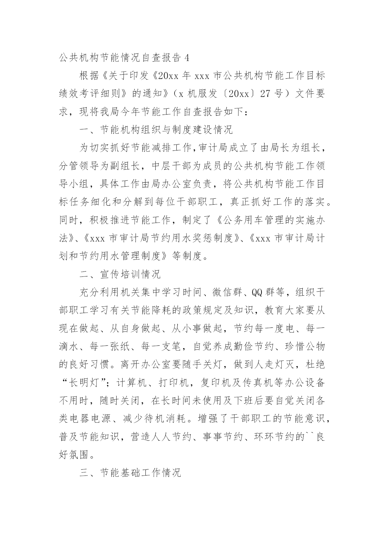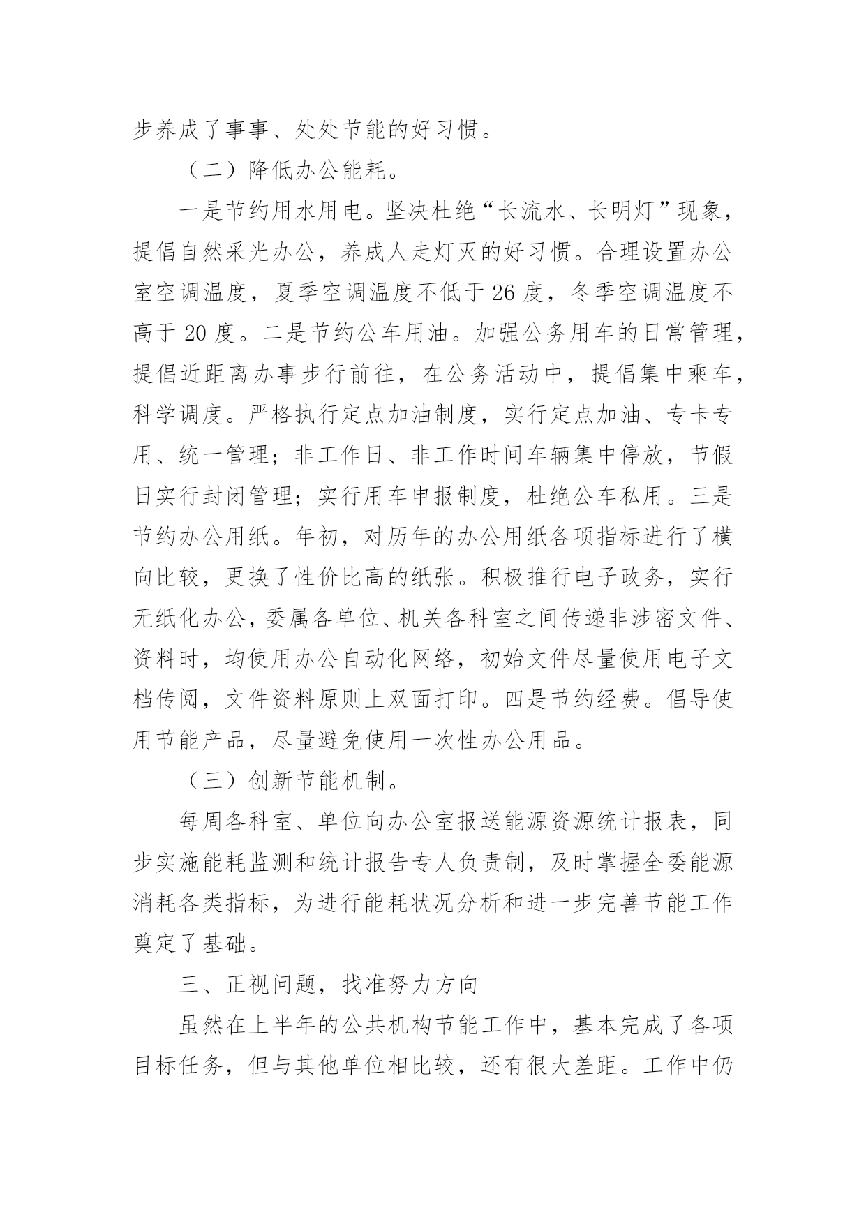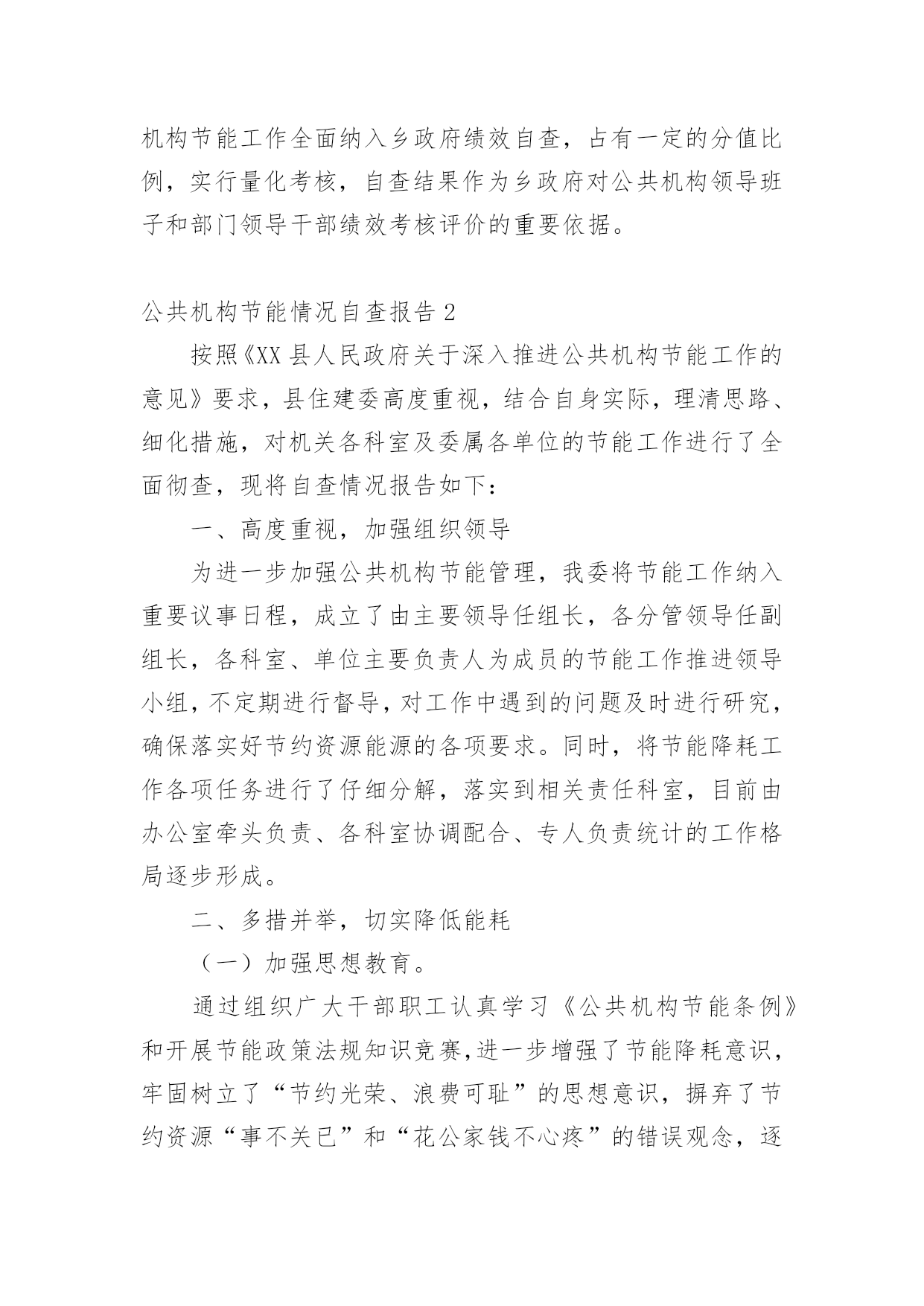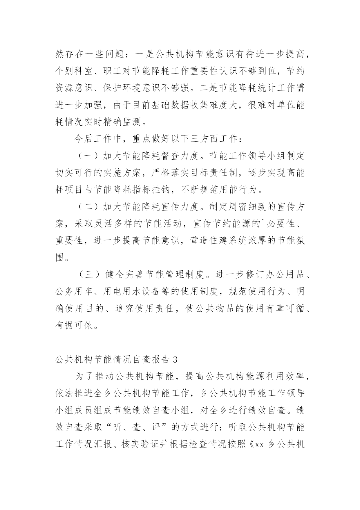 公共机构节能情况自查报告公共机构节能情况自查报告精选6篇在人们越来越注重自身素养的今天,越来越多的事务都会使用到报告,报告根据用途的不同也有着不同的类型。为了让您不再为写报告头疼,下面是小编为大家整理的公共机构节能情况自查报告,仅供参考,大家一起来看看吧。公共机构节能情况自查报告1为了推动公共机构节能,提高公共机构能源利用效率,依法推进全乡公共机构节能工作,乡公共机构节能工作领导小组成员组成节能绩效自查小组,对全乡进行绩效自查。绩效自查采取“听、查、评”的方式进行:听取公共机构节能工作情况汇报、核实验证并根据检查情况按照《xx乡公共机构节能工作绩效考核评分标准》逐项进行打分。1、组织领导方面:能够做到有管理组织和工作人员;将节能工作纳入全年工作计划,及时研究部署工作。2、宣传和培训方面:能够做到制定宣传培训计划;学习节能知识;全年组织节能宣传活动两次。3、节能规划方面:能够做到编制公共机构节能规划,按年度分解落实;节能规划及实施方案在规定时间内上报备案;制定年度节能计划及实施方案并组织实施。4、能耗统计方面:能够做到专人负责能源消耗统计,建立能耗统计台帐;在规定时间内报送能耗统计报表;数据真实、准确;项目填报完整;按要求参加能耗统计培训。5、建立联络制度方面:能够做到明确联络员,建立联络制度,明确工作职责;按时参加工作会议,提出节能工作措施及建议;工作信息交流。有价值信息3条。6、节能管理方面:能够做到设立能源管理岗位,实行能源管理岗位责任制;建立和执行能源审计制度;制定了节能采购管理制度。7、车辆油耗管理方面:能够做到完善公务用车使用管理制度;制定节能驾驶规范,封存停驶、定点加油、定点维修、定点保险。8、用电管理方面:能够做到制定和完善节约用电制度;积极推广使用高效节能照明产品;优化照明系统设计,改进电路控制方式;采用节能灶具和设备。9、用水管理方面:能够做到制定和完善节约用水制度;采用节水型器具,配备节水设备;用水设备维护和管理;全年没有“跑冒滴漏”和自来水直接冲洗拖布、车辆现象。10、办公用品管理方面:能够做到制定和完善办公用品采购、配备和领用制度,积极使用低能耗环保办公设施。11、监督检查方面:能够做到制定节能绩效自查办法或标准;定期开展节能专项监督检查,奖惩公示。对公共机构节能绩效自查的.最终结果予以通报,并评选出公共机构节能工作先进单位和先进个人;对考核成绩不达标的或出现严重能源浪费行为的予以批评,限期改正并在一个月内向乡政府作出书面报告并提交整改方案。全乡公共机构节能工作全面纳入乡政府绩效自查,占有一定的分值比例,实行量化考核,自查结果作为乡政府对公共机构领导班子和部门领导干部绩效考核评价的重要依据。公共机构节能情况自查报告2按照《XX县人民政府关于深入推进公共机构节能工作的意见》要求,县住建委高度重视,结合自身实际,理清思路、细化措施,对机关各科室及委属各单位的节能工作进行了全面彻查,现将自查情况报告如下:一、高度重视,加强组织领导为进一步加强公共机构节能管理,我委将节能工作纳入重要议事日程,成立了由主要领导任组长,各分管领导任副组长,各科室、单位主要负责人为成员的节能工作推进领导小组,不定期进行督导,对工作中遇到的问题及时进行研究,确保落实好节约资源能源的各项要求。同时,将节能降耗工作各项任务进行了仔细分解,落实到相关责任科室,目前由办公室牵头负责、各科室协调配合、专人负责统计的工作格局逐步形成。二、多措并举,切实降低能耗(一)加强思想教育。通过组织广大干部职工认真学习《公共机构节能条例》和开展节能政策法规知识竞赛,进一步增强了节能降耗意识,牢固树立了“节约光荣、浪费可耻”的思想意识,摒弃了节约资源“事不关已”和“花公家钱不心疼”的错误观念,逐步养成了事事、处处节能的好习惯。(二)降低办公能耗。一是节约用水用电。坚决杜绝“长流水、长明灯”现象,提倡自然采光办公,养成人走灯灭的好习惯。合理设置办公室空调温度,夏季空调温度不低于26度,冬季空调温度不高于20度。二是节约公车用油。加强公务用车的日常管理,提倡近距离办事步行前往,在公务活动中,提倡集中乘车,科学调度。严格执行定点加油制度,实行定点加油、专卡专用、统一管理;非工作日、非工作时间车辆集中停放,节假日实行封闭管理;实行用车申报制度,杜绝公车私用。三是节约办公用纸。年初,对历年的办公用纸各项指标进行了横向比较,更换了性价比高的纸张。积极推行电子政务,实行无纸化办公,委属各单位、机关各科室之间传递非涉密文件、资料时,均使用办公自动化网络,初始文件尽量使用电子文档传阅,文件资料原则上双面打印。四是节约经费。倡导使用节能产品,尽量避免使用一次性办公用品。(三)创新节能机制。每周各科室、单位向办公室报送能源资源统计报表,同步实施能耗监测和统计报告专人负责制,及时