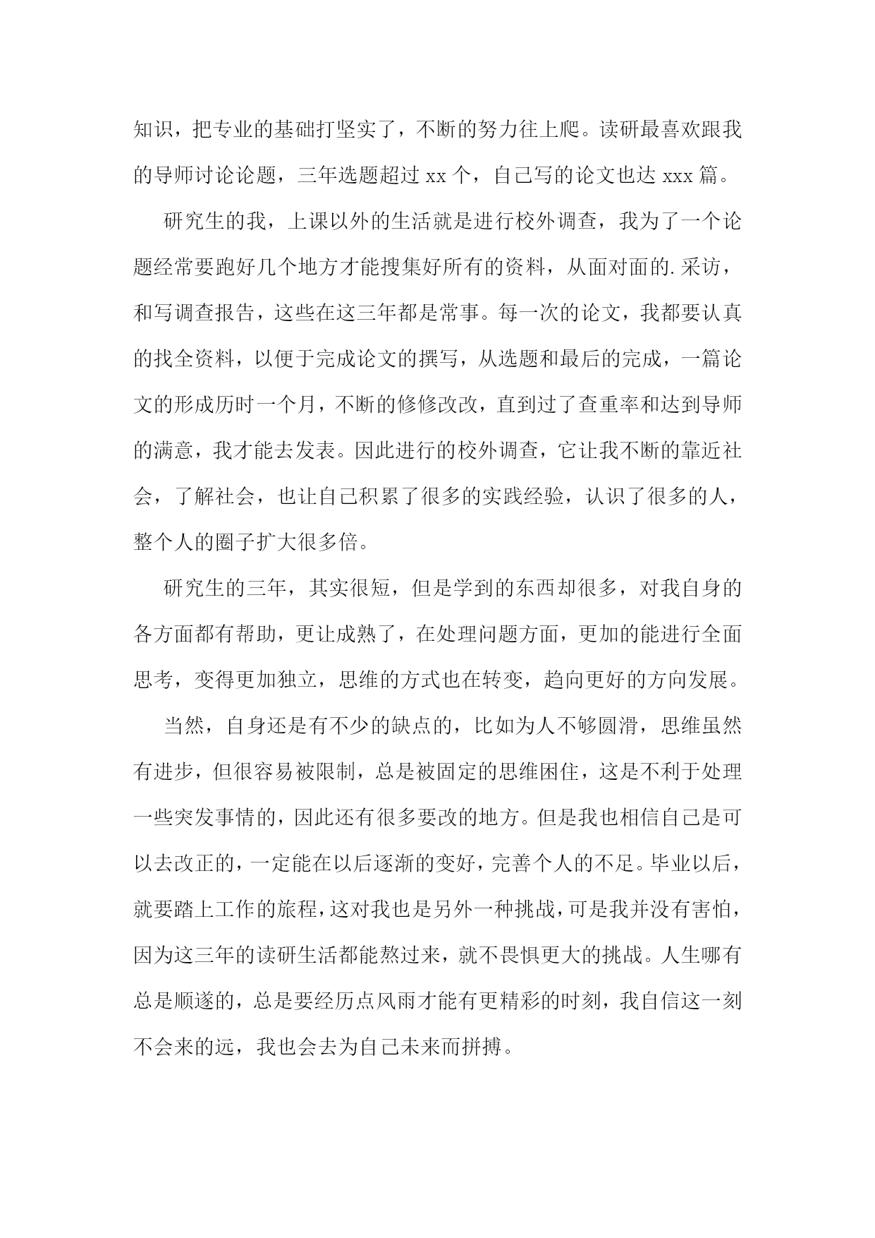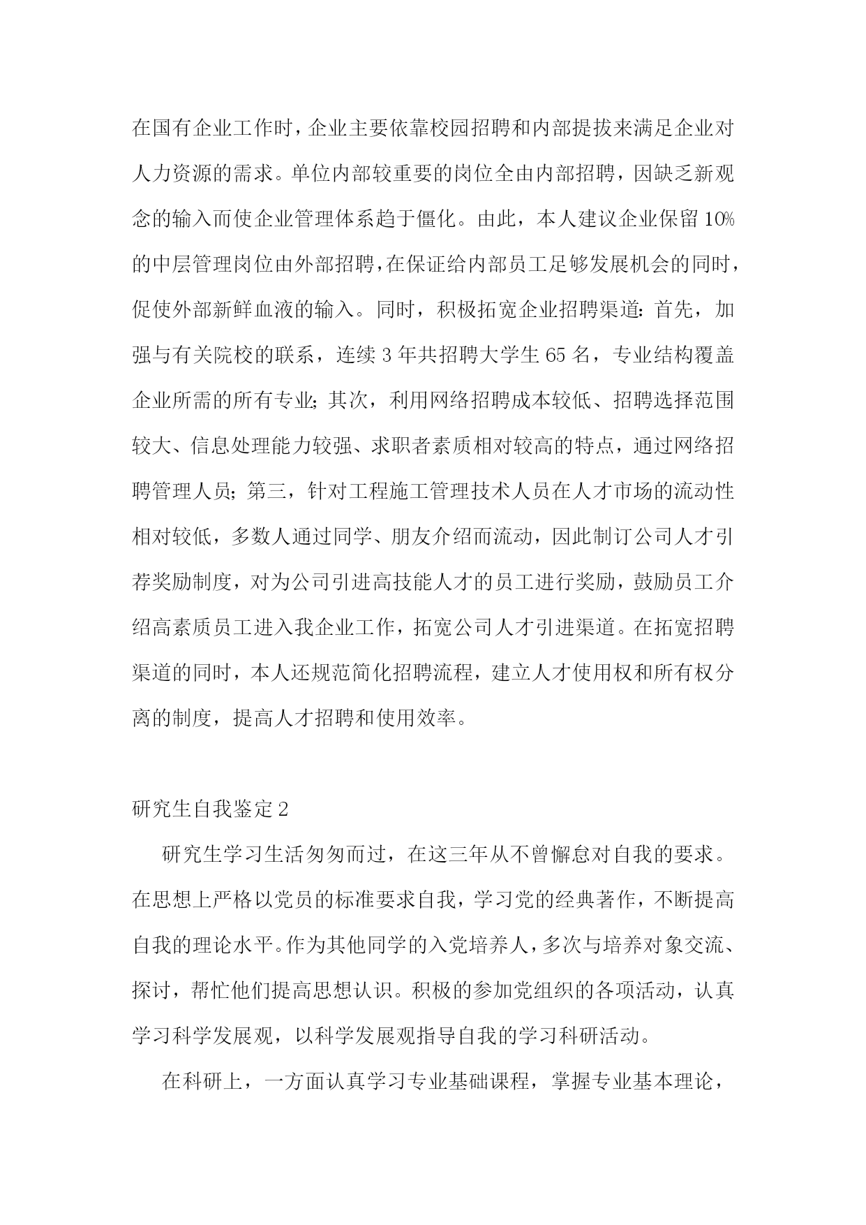 研究生自我鉴定15篇研究生自我鉴定1自1992年参加工作以来一直从事企业管理工作,其中专业从事人事劳动管理和人力资源管理工作的时间逾XX年。其间经历了国有企业的人事劳动管理、私营企业的人事管理及现所在的大型综合性民营企业集团的人力资源管理,企业跨及建材、电子、酒店、商场、化工、矿山以及贸易等行业,并先后亲历了几家企业的转制过程,亲自处理转制过程中的员工安置事宜。十八年的企业管理特别是其间的人事劳动或人力资源管理工作经历,可以说见证了我国劳动法律法规体系的建立过程,见证了我国职工社会保障体系从试点到建立再到调整,从而达到今天相对完善的过程,同时还见证了企业职工从固定工、农民合同工、大集体工以及临时工等不同身份统一向全员劳动合同制工人转换的过程。多年的人力资源管理工作经历,加之自己人力资源管理知识的不断更新,理论联系实际,使自己积累了丰富的人力资源管理工作实战经验。现将主要业务工作实践总结如下:一、人力资源规划方面人力资源规划指的是企业为了实现整体经营目标,根据发展需要并结合企业内外部环境,运用科学有效的方法,进行的人力资源预测、投资和控制,在此基础上制定职务编制、人员配置、教育培训、薪资分配、职业发展、人力资源投资方面的人力资源管理方面的全局性的计划,使企业在持续发展中获得竞争力,为企业整体发展战略提供人力资源方面的保证与服务。企业人力资源规划具体包括企业组织结构的设计与变革、企业人力资源需求和供给预测、工作岗位分析、企业劳动定员管理、人力资源管理制度规划以及人力资源管理费用预算等内容。我曾经经历过一个塑料编织袋厂、一个氮肥厂和两个酒店的开业组建工作,独立操作完成了从企业组织机构设置、定岗定员、工作岗位分析、人员招聘、岗前培训以及人力资源管理制度建立的全过程。对于不同的行业,我首先要熟悉行业的情况,深入到同类型的企业的每个岗位,再结合本企业自身的具体情况,从最精简高效的原则出发,确定企业的组织机构设置。组织机构确定后,根据工作流程及工序、每个岗位的管理幅度、员工的劳动强度等来确定岗位设置,制订出工作岗位说明书,再根据工作时间及工作量来确定每个岗位的员工数量。比如氮肥厂是连续生产型企业,很多岗位在国有企业时必须按四班运转配置人员,但现在是民营企业,不能完全照搬国有企业的模式,在配置人员为了考虑节约人力成本,多数按三班三运转配置人员,当然同时还得考虑劳动安全及职业卫生,所以在配置人员时必须对每个岗位做精细的工作分析,把握每个岗位的劳动强度、劳动环境等提出对员工的任职要求。在担任所在企业的人力资源管理职位过程中,每年初都要根据企业年度计划制定人力资源管理计划,提出人员需求计划、人力资源管理费用计划以及对人力资源管理制度进行适时修改。二、招聘与配置方面员工招聘是企业获得人力资源的重要手段,是人力资源管理的第一道关口。一个有效的招聘系统将使企业获得胜任工作并对所从事的工作感到满意的人才,从而提升企业的效益。原在国有企业工作时,企业主要依靠校园招聘和内部提拔来满足企业对人力资源的需求。单位内部较重要的岗位全由内部招聘,因缺乏新观念的输入而使企业管理体系趋于僵化。由此,本人建议企业保留10%的中层管理岗位由外部招聘,在保证给内部员工足够发展机会的同时,促使外部新鲜血液的输入。同时,积极拓宽企业招聘渠道:首先,加强与有关院校的联系,连续3年共招聘大学生65名,专业结构覆盖企业所需的所有专业;其次,利用网络招聘成本较低、招聘选择范围较大、信息处理能力较强、求职者素质相对较高的特点,通过网络招聘管理人员;第三,针对工程施工管理技术人员在人才市场的流动性相对较低,多数人通过同学、朋友介绍而流动,因此制订公司人才引荐奖励制度,对为公司引进高技能人才的员工进行奖励,鼓励员工介绍高素质员工进入我企业工作,拓宽公司人才引进渠道。在拓宽招聘渠道的同时,本人还规范简化招聘流程,建立人才使用权和所有权分离的制度,提高人才招聘和使用效率。研究生自我鉴定2研究生学习生活匆匆而过,在这三年从不曾懈怠对自我的要求。在思想上严格以党员的标准要求自我,学习党的经典著作,不断提高自我的理论水平。作为其他同学的入党培养人,多次与培养对象交流、探讨,帮忙他们提高思想认识。积极的参加党组织的各项活动,认真学习科学发展观,以科学发展观指导自我的学习科研活动。在科研上,一方面认真学习专业基础课程,掌握专业基本理论,夯实专业基础,拓宽知识领域,为自我的科研工作打下扎实基础;另一方面根据自我研究方向,有针对性的进行学习和研究,探寻本专业的学科前沿领域,积极研究并发表学术论文。除此之外还广泛涉猎了各方面知识,开阔视野。在英语学习方面,经过了大学英语六级考试,具备了较强的英语听说本事。在教学实践的过程中,认真备课,查阅学术资料,在授课过程中提高了自我的理论水平和实践本事,在日