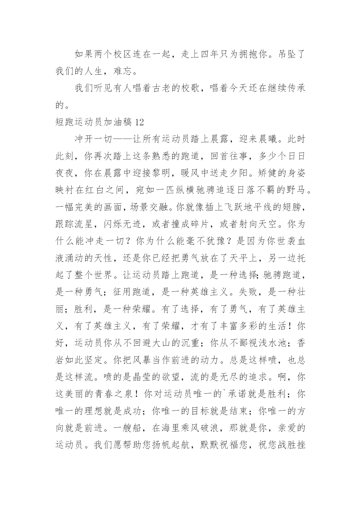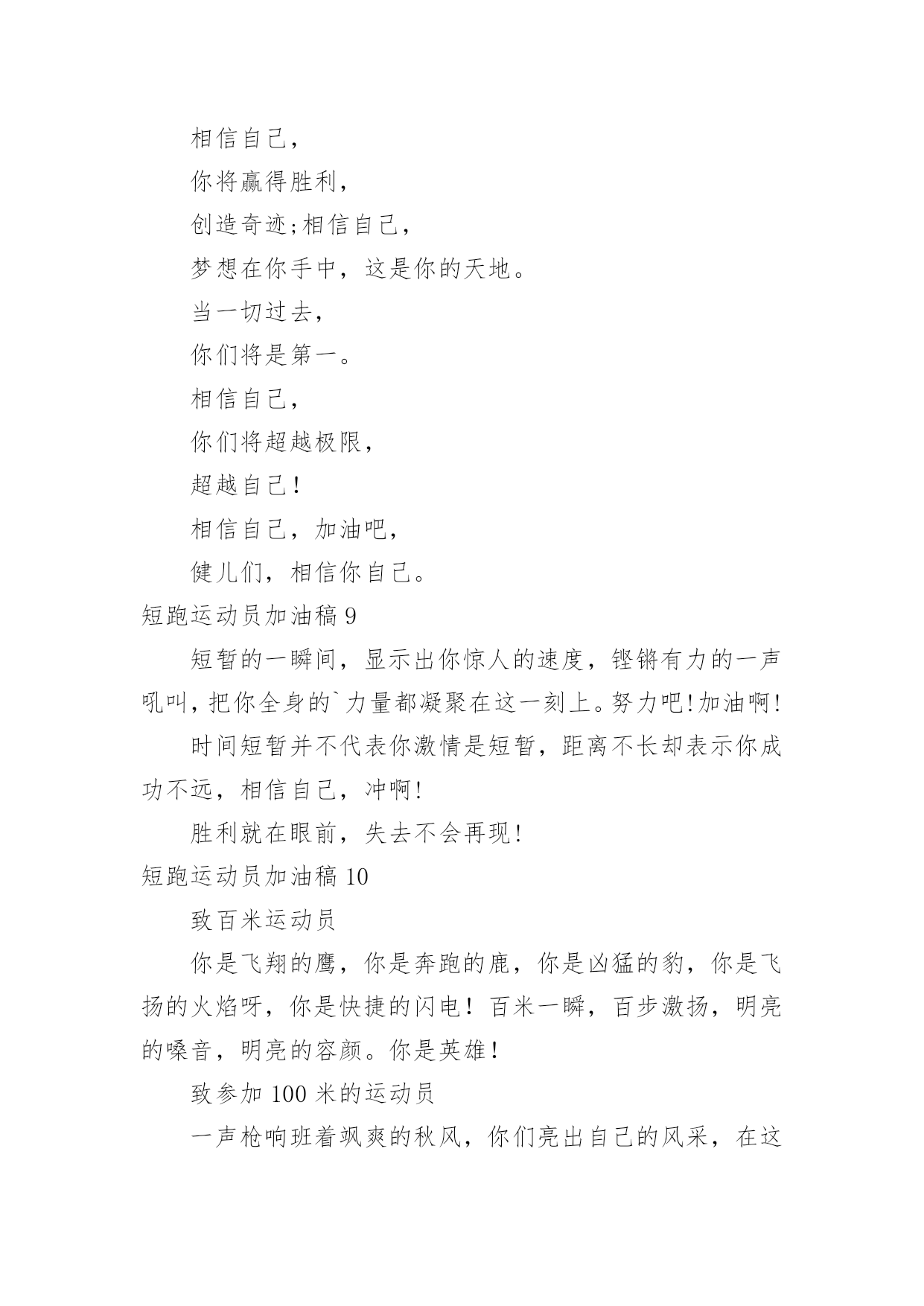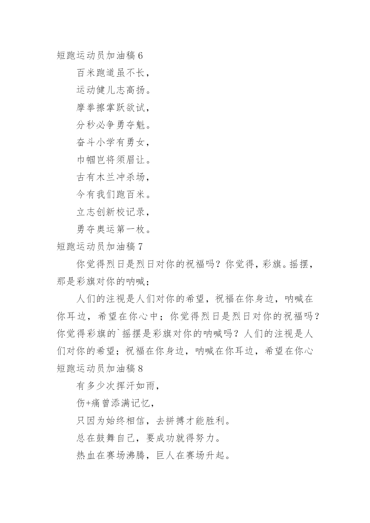 短跑运动员加油稿短跑运动员加油稿在社会一步步向前发展的今天,我们都不可避免地要接触到加油稿,加油稿可以起到活跃气氛的作用。你所见过的加油稿是什么样的呢?下面是小编收集整理的短跑运动员加油稿,欢迎阅读,希望大家能够喜欢。短跑运动员加油稿1冲开一切——致全体运动员踏着晨露,迎来晨曦。此刻,你再次踏上这熟悉的跑道,回首昔日,多少个日日夜夜,你晨露时迎接黎明,暖风中送走夕阳。矫健的身姿映衬在红白之间,犹如一匹纵横驰骋追逐落日不羁的野马。一副完美的图画,情景交融。你如同插上了飞跃地平线的翅膀,追踪流星、闪逝无迹或撞成碎片,或射向天际。为什么你能冲开一切?为什么你能义无反顾?是因为你世袭的血液涌动的天性,还是你已将勇气放上天平,另一边托起整个天地。致运动员踏上跑道,是一种选择;驰骋跑道,是一种勇气;征去跑道,是一种豪迈。失败,是一种壮烈;胜利,是一种荣耀。有了选择,有了勇气,有了豪迈,有了壮烈,有了荣耀,才有人生的绚丽多彩!你好,运动员你从不回避大山的`沉重;你从不鄙视水潭的浅陋;香岩石那样坚定。你把风暴当成前进的动力。总这样的喷,也总这样的流。喷的是晶莹的渴望,流的是不息的追求。啊,你这美丽的青春之泉!致运动员你唯一的承诺是胜利;你唯一的理想是成功;你唯一的目标是终点;你唯一的方向是前进。一只船,在大海中乘风破浪,那就是你,亲爱的运动员。我们愿助你扬起风帆,默默地祝福你,祝你战胜挫折,冲向终点,冲向未来!短跑运动员加油稿2有多少次挥汗如雨,伤痛曾添满记忆,只因为始终相信,去拼搏才能胜利。总在鼓舞自己,要成功就得努力。热血在赛场沸腾,巨人在赛场升起。相信自己,你将赢得胜利,创造奇迹;相信自己,梦想在你手中,这是你的天地。当一切过去,你们将是第一。相信自己,你们将超越极限,超越自己!相信自己,加油吧,健儿们,相信你自己。短跑运动员加油稿3阳光明媚下,是你潇洒的风姿;风萧萧吟里,是你坚定的目光;热情滚滚的跑道上,是你青春的步履。带着希望,带着激情,带着勇气,你这般自由地踏上了这片运动场;青春的脚步,青春的.速度,青春的活力,青春的激情,将会在你们的身上尽情体现。迎接自我,挑战自我,战胜自我!我们相信你们一定能行,加油吧,运动员!终点就在眼前!短跑运动员加油稿4你是否感到,烈日的照射,那是烈日对你的祝福;你是否感到,彩旗的摇摆,那是彩旗对你的呐喊;人们的注视,那是人们对你的希望祝福在你身边,呐喊在你耳边希望在你心中;你是否感到,烈日的照射,那是烈日对你的祝福;你是否感到,彩旗的摇摆,那是彩旗对你的.呐喊;人们的注视,那是人们对你的希望;祝福在你身边,呐喊在你耳边希望在你心中短跑运动员加油稿5我敢说,很多高尚的品德都在这个小运动场上展现出来了请不要相信。跑200米的同学不小心摔倒了,但他并不气馁。他仍然坚持跑下去。看到一个男人3000米后,一个同学摔倒了,但他向他伸出了多少爱的手。我很感动,也很佩服。它可以出现在球场上。在我看来,这是一件伟大的事情。谁不会害怕强大的竞争对手?但我还是会默默地对自己说:“我能行!“微笑和欢呼,我不会放弃,为了实现生活中不可或缺的目标.!太棒了啊,太棒了!你们应该充满自信。400米运动员:在400米的跑道上,你在飞驰,面对如此遥远的道路,你可能腿脚麻木,你可能有点不知所措。但你知道,在你身后,有一双同学们期待的眼睛;在你身后,是你每天苦练的.汗水。鼓起勇气,勇往直前!铅球运动员手里拿着沉重的铅球,它凝聚了你的希望,你的理想,全身的力量,理想,希望,铅球在空中闪耀,理想在空中闪耀短跑运动员加油稿6百米跑道虽不长,运动健儿志高扬。摩拳擦掌跃欲试,分秒必争勇夺魁。奋斗小学有勇女,巾帼岂将须眉让。古有木兰冲杀场,今有我们跑百米。立志创新校记录,勇夺奥运第一枚。短跑运动员加油稿7你觉得烈日是烈日对你的祝福吗?你觉得,彩旗。摇摆,那是彩旗对你的呐喊;人们的注视是人们对你的希望,祝福在你身边,呐喊在你耳边,希望在你心中;你觉得烈日是烈日对你的祝福吗?你觉得彩旗的`摇摆是彩旗对你的呐喊吗?人们的注视是人们对你的希望;祝福在你身边,呐喊在你耳边,希望在你心短跑运动员加油稿8有多少次挥汗如雨,伤+痛曾添满记忆,只因为始终相信,去拼搏才能胜利。总在鼓舞自己,要成功就得努力。热血在赛场沸腾,巨人在赛场升起。相信自己,你将赢得胜利,创造奇迹;相信自己,梦想在你手中,这是你的天地。当一切过去,你们将是第一。相信自己,你们将超越极限,超越自己!相信自己,加油吧,健儿们,相信你自己。短跑运动员加油稿9短暂的一瞬间,显示出你惊人的速度,铿锵有力的一声吼叫,把你全身的`力量都凝聚在这一刻上。努力吧!加油啊!时间短暂并不代表你激情是短暂,距离不长却表示你成功不远,相信自己,冲啊!胜利就在眼前,失去不会再现!短跑运动员加油稿10致百米运动员你是飞翔的鹰