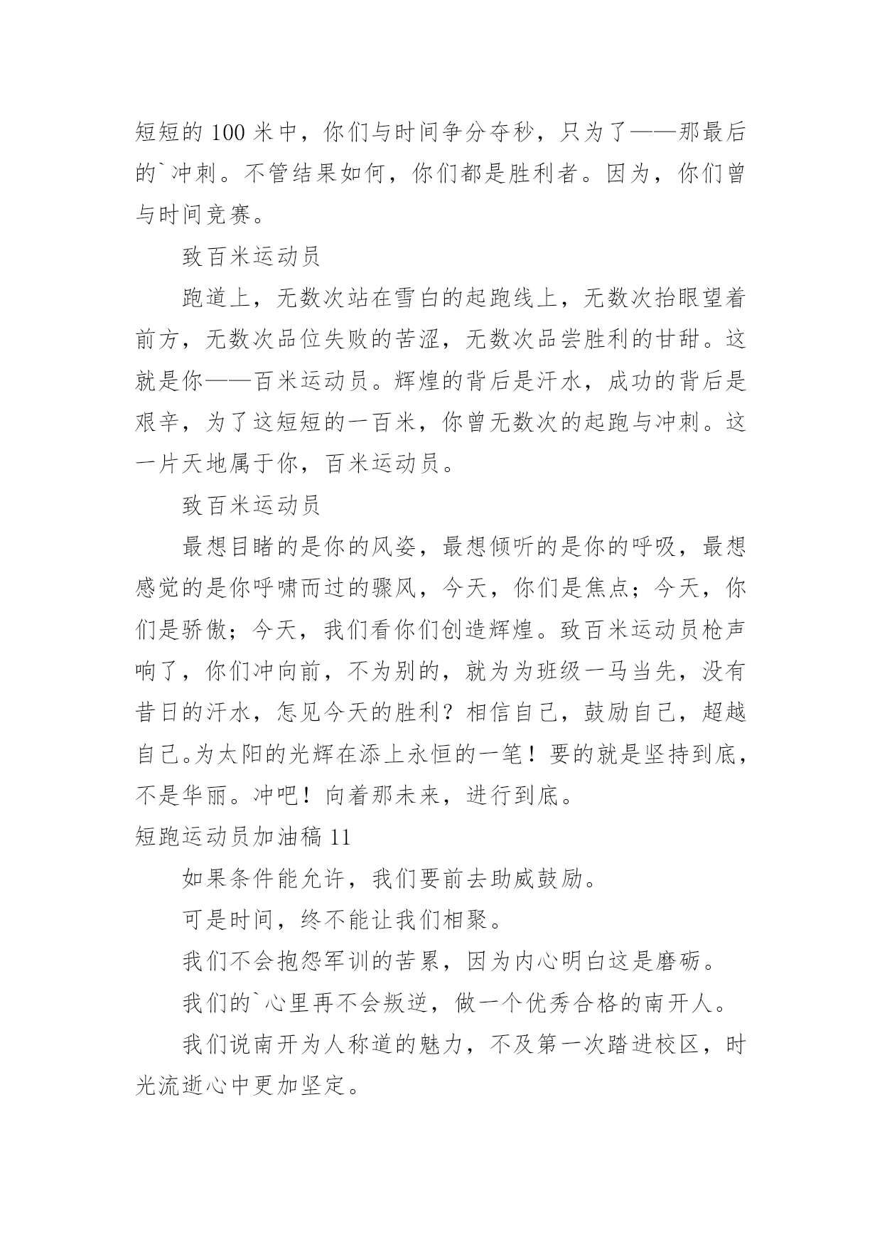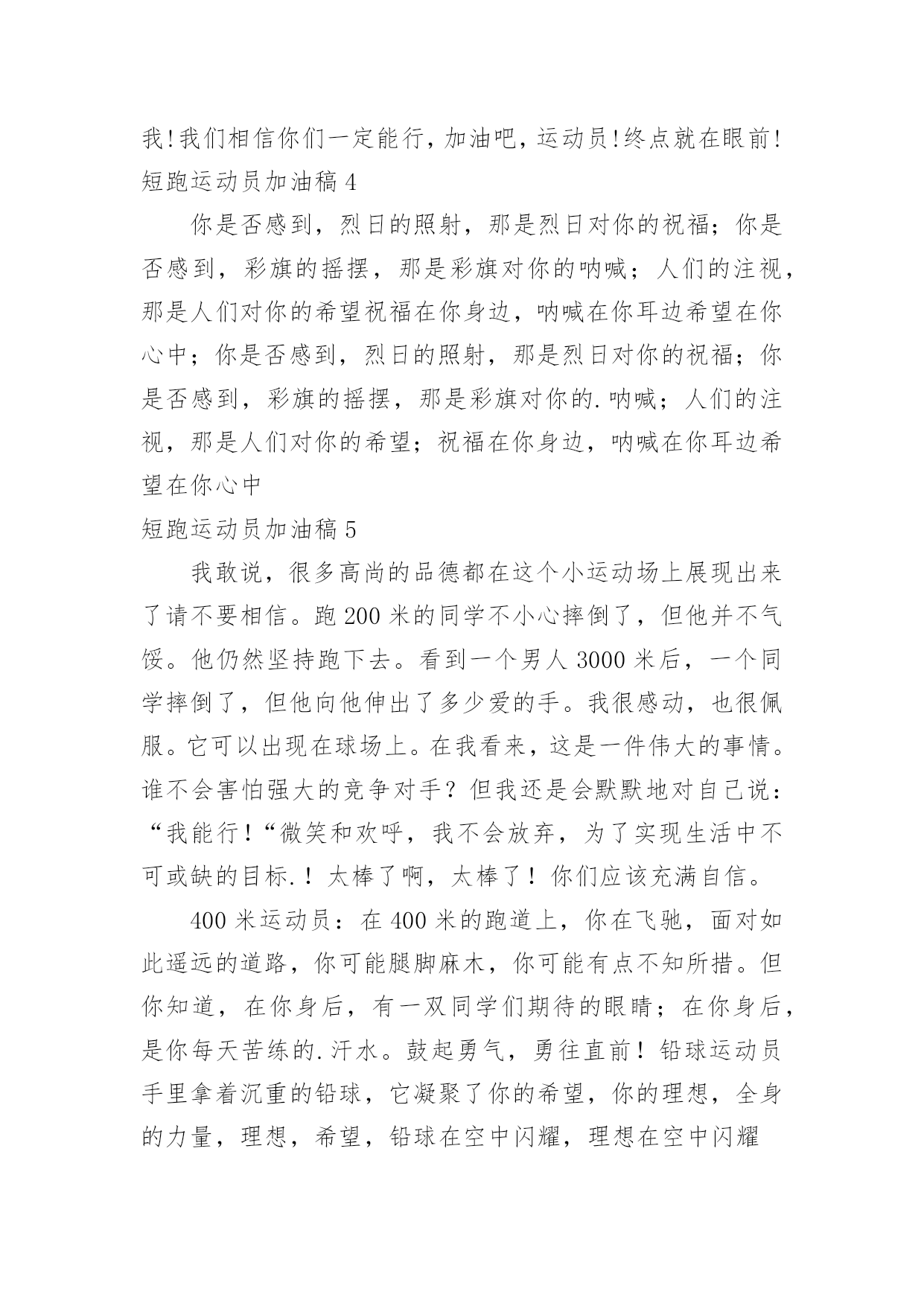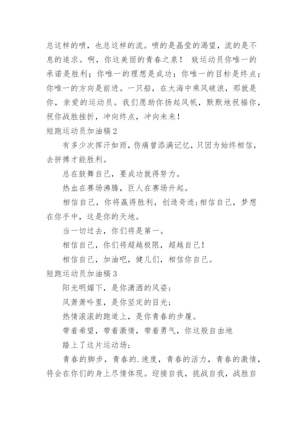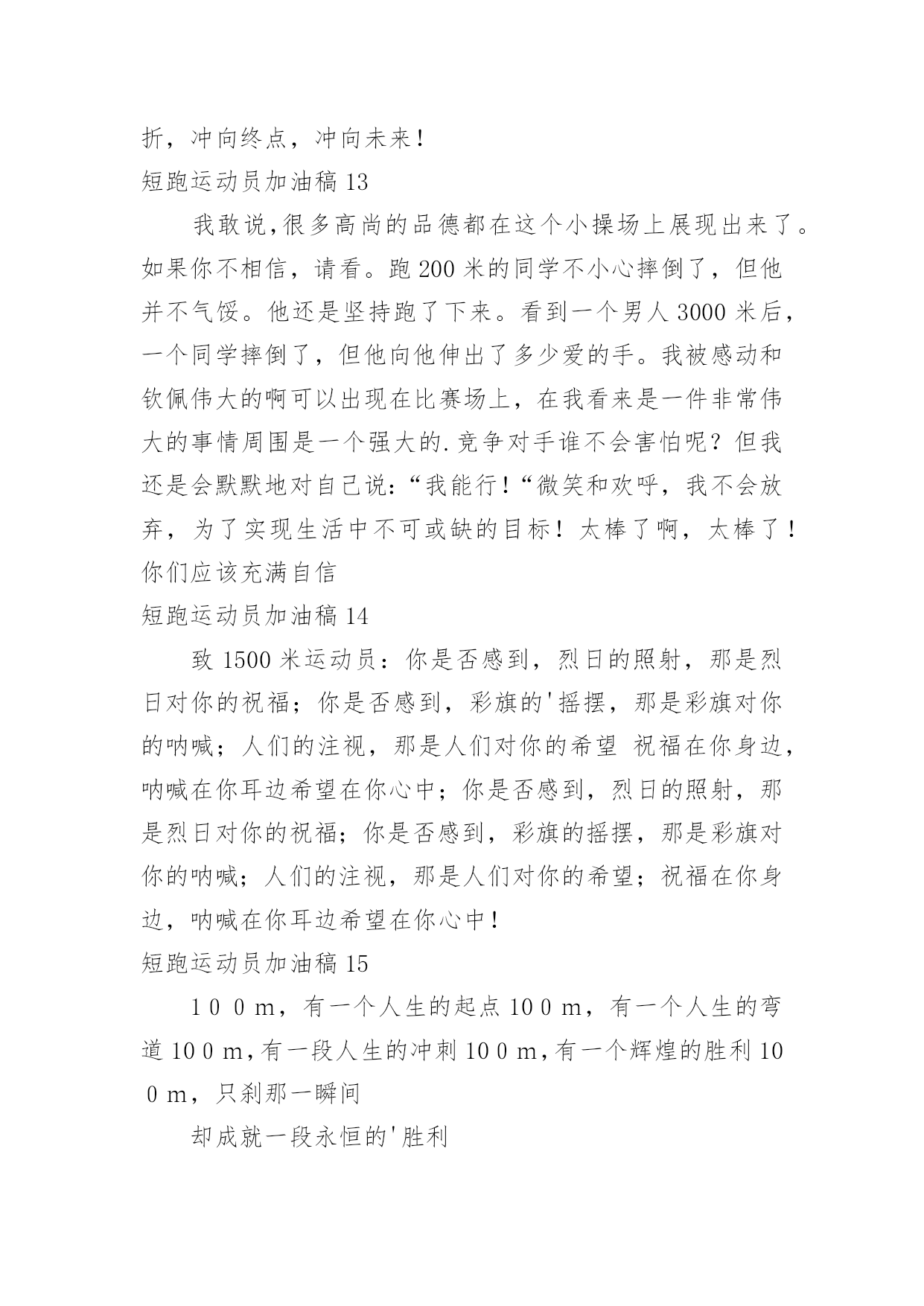 短跑运动员加油稿短跑运动员加油稿在社会一步步向前发展的今天,我们都不可避免地要接触到加油稿,加油稿可以起到活跃气氛的作用。你所见过的加油稿是什么样的呢?下面是小编收集整理的短跑运动员加油稿,欢迎阅读,希望大家能够喜欢。短跑运动员加油稿1冲开一切——致全体运动员踏着晨露,迎来晨曦。此刻,你再次踏上这熟悉的跑道,回首昔日,多少个日日夜夜,你晨露时迎接黎明,暖风中送走夕阳。矫健的身姿映衬在红白之间,犹如一匹纵横驰骋追逐落日不羁的野马。一副完美的图画,情景交融。你如同插上了飞跃地平线的翅膀,追踪流星、闪逝无迹或撞成碎片,或射向天际。为什么你能冲开一切?为什么你能义无反顾?是因为你世袭的血液涌动的天性,还是你已将勇气放上天平,另一边托起整个天地。致运动员踏上跑道,是一种选择;驰骋跑道,是一种勇气;征去跑道,是一种豪迈。失败,是一种壮烈;胜利,是一种荣耀。有了选择,有了勇气,有了豪迈,有了壮烈,有了荣耀,才有人生的绚丽多彩!你好,运动员你从不回避大山的`沉重;你从不鄙视水潭的浅陋;香岩石那样坚定。你把风暴当成前进的动力。总这样的喷,也总这样的流。喷的是晶莹的渴望,流的是不息的追求。啊,你这美丽的青春之泉!致运动员你唯一的承诺是胜利;你唯一的理想是成功;你唯一的目标是终点;你唯一的方向是前进。一只船,在大海中乘风破浪,那就是你,亲爱的运动员。我们愿助你扬起风帆,默默地祝福你,祝你战胜挫折,冲向终点,冲向未来!短跑运动员加油稿2有多少次挥汗如雨,伤痛曾添满记忆,只因为始终相信,去拼搏才能胜利。总在鼓舞自己,要成功就得努力。热血在赛场沸腾,巨人在赛场升起。相信自己,你将赢得胜利,创造奇迹;相信自己,梦想在你手中,这是你的天地。当一切过去,你们将是第一。相信自己,你们将超越极限,超越自己!相信自己,加油吧,健儿们,相信你自己。短跑运动员加油稿3阳光明媚下,是你潇洒的风姿;风萧萧吟里,是你坚定的目光;热情滚滚的跑道上,是你青春的步履。带着希望,带着激情,带着勇气,你这般自由地踏上了这片运动场;青春的脚步,青春的.速度,青春的活力,青春的激情,将会在你们的身上尽情体现。迎接自我,挑战自我,战胜自我!我们相信你们一定能行,加油吧,运动员!终点就在眼前!短跑运动员加油稿4你是否感到,烈日的照射,那是烈日对你的祝福;你是否感到,彩旗的摇摆,那是彩旗对你的呐喊;人们的注视,那是人们对你的希望祝福在你身边,呐喊在你耳边希望在你心中;你是否感到,烈日的照射,那是烈日对你的祝福;你是否感到,彩旗的摇摆,那是彩旗对你的.呐喊;人们的注视,那是人们对你的希望;祝福在你身边,呐喊在你耳边希望在你心中短跑运动员加油稿5我敢说,很多高尚的品德都在这个小运动场上展现出来了请不要相信。跑200米的同学不小心摔倒了,但他并不气馁。他仍然坚持跑下去。看到一个男人3000米后,一个同学摔倒了,但他向他伸出了多少爱的手。我很感动,也很佩服。它可以出现在球场上。在我看来,这是一件伟大的事情。谁不会害怕强大的竞争对手?但我还是会默默地对自己说:“我能行!“微笑和欢呼,我不会放弃,为了实现生活中不可或缺的目标.!太棒了啊,太棒了!你们应该充满自信。400米运动员:在400米的跑道上,你在飞驰,面对如此遥远的道路,你可能腿脚麻木,你可能有点不知所措。但你知道,在你身后,有一双同学们期待的眼睛;在你身后,是你每天苦练的.汗水。鼓起勇气,勇往直前!铅球运动员手里拿着沉重的铅球,它凝聚了你的希望,你的理想,全身的力量,理想,希望,铅球在空中闪耀,理想在空中闪耀短跑运动员加油稿6百米跑道虽不长,运动健儿志高扬。摩拳擦掌跃欲试,分秒必争勇夺魁。奋斗小学有勇女,巾帼岂将须眉让。古有木兰冲杀场,今有我们跑百米。立志创新校记录,勇夺奥运第一枚。短跑运动员加油稿7你觉得烈日是烈日对你的祝福吗?你觉得,彩旗。摇摆,那是彩旗对你的呐喊;人们的注视是人们对你的希望,祝福在你身边,呐喊在你耳边,希望在你心中;你觉得烈日是烈日对你的祝福吗?你觉得彩旗的`摇摆是彩旗对你的呐喊吗?人们的注视是人们对你的希望;祝福在你身边,呐喊在你耳边,希望在你心短跑运动员加油稿8有多少次挥汗如雨,伤+痛曾添满记忆,只因为始终相信,去拼搏才能胜利。总在鼓舞自己,要成功就得努力。热血在赛场沸腾,巨人在赛场升起。相信自己,你将赢得胜利,创造奇迹;相信自己,梦想在你手中,这是你的天地。当一切过去,你们将是第一。相信自己,你们将超越极限,超越自己!相信自己,加油吧,健儿们,相信你自己。短跑运动员加油稿9短暂的一瞬间,显示出你惊人的速度,铿锵有力的一声吼叫,把你全身的`力量都凝聚在这一刻上。努力吧!加油啊!时间短暂并不代表你激情是短暂,距离不长却表示你成功不远,相信自己,冲啊!胜利就在眼前,失去不会再现!短跑运动员加油稿10致百米运动员你是飞翔的鹰