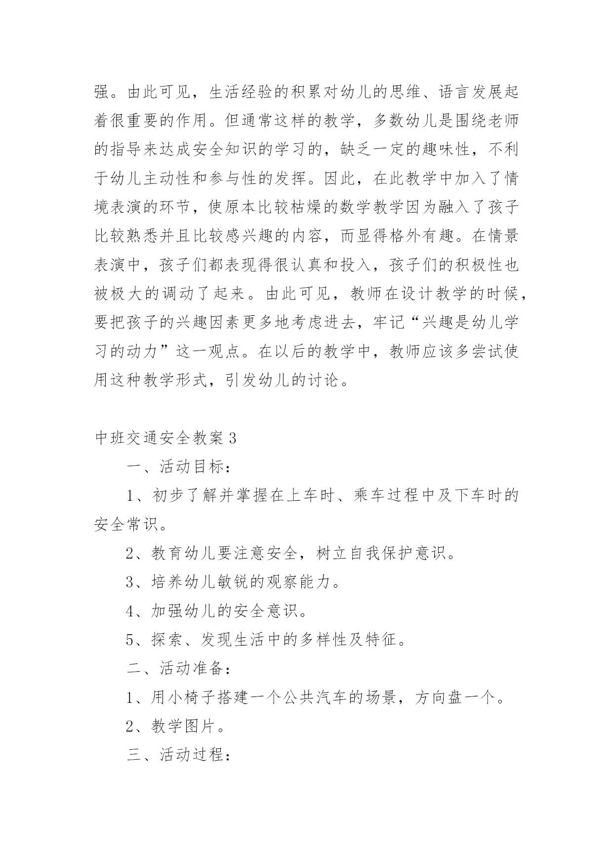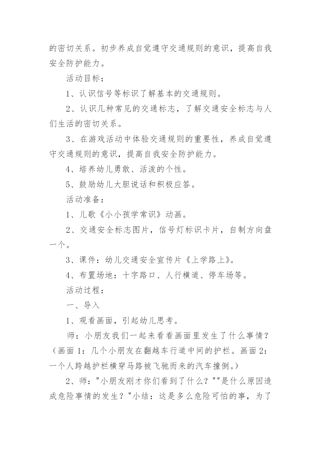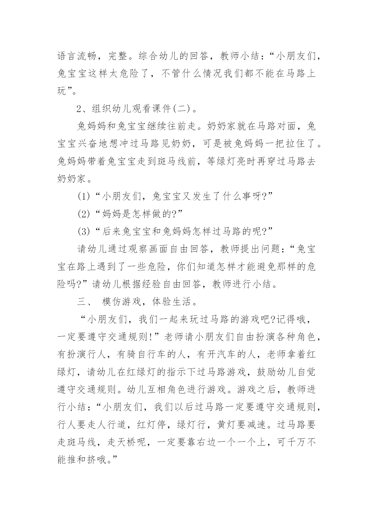 中班交通安全教案作为一位兢兢业业的人民教师,时常会需要准备好教案,教案是教学活动的依据,有着重要的地位。那么大家知道正规的教案是怎么写的吗?以下是小编帮大家整理的中班交通安全教案,仅供参考,欢迎大家阅读。中班交通安全教案1设计意图城市交通的不断发展促使我们加强交通安全教育,让幼儿了解一些危险因素,知道遵守交通规则的重要性,懂得如何保护自己。《新纲要》中指出:“幼儿园必须把保护幼儿的生命和促进幼儿的健康放在工作的首位”。从小让幼儿懂得交通安全知识,养成自觉遵守交通安全的好习惯,对孩子来说可以受益终生。这也符合《新纲要》所提到的“选择的教育内容既贴进幼儿的生活,符合幼儿的现实需要,又有利于其长远发展,为所有在园幼儿的健康成长服务。”为此我设计了这个中班的安全教育活动。活动目标1.让幼儿初步懂得遵守交通安全的重要性,养成自觉遵守交通规则的好习惯。2.让幼儿认识交通安全标志,培养一定的自我保护意识和能力。3.培养幼儿敏锐的观察能力。4.探索、发现生活中的多样性及特征。5.加强幼儿的安全意识。活动准备1、事先在户外布置马路场景:人行道,斑马线、红绿灯,十字路口,天桥。2、儿童自行车两辆、骑车方向盘四个、各种交通安全标志,小贴纸。3、多媒体课件:(1)兔宝宝离开妈妈跑到马路上去玩,差点被车撞到。(2)兔宝宝不看红绿灯,想冲到马路对面去,被妈妈给拉住了。妈妈带着兔宝宝等绿灯时从斑马线过过路了。活动过程一、教师带领幼儿去儿童乐园玩,激发孩子的兴趣。师问:“小朋友们,今天老师要带你们去儿童乐园玩,你们开心吗?我们一起出发吧!”场景一:老师带领幼儿走到人行道和车行道前。师问:(1)“小朋友们,我们应该走哪一种路呀?”(2)“为什么要走这条路呢?”请幼儿自由观察,讨论,引导幼儿认识人行道和车行道的安全标志图。师:我们应该注意什么?(靠右边走,不能边走边玩,特别是不能到车行道上玩。)场景二:继续带领幼儿走到十字路口。师问:“小朋友们,我们要过马路了,应该怎么走?”“这个路像什么呀?它有什么名字的?”“红绿灯是干嘛的呀?”通过老师提问,幼儿观察,学习认识斑马线和红绿灯的作用,知道“过马路要走斑马线,红灯停,绿灯行,黄灯要减速”。场景三:带幼儿继续走到天桥。师问:“小朋友们,这是什么?”“那我们应该怎么走呢?”通过老师的提问,幼儿自由讨论回答,教师小结:“走天桥就像走幼儿园的'楼梯,要靠右边一个跟着一个走,不能推也不能挤。”顺利到达儿童乐园之后,老师和小朋友一起围成一个圈,老师出示刚刚认识的交通安全标志,请幼儿进行抢答,看看谁最能干!老师奖励小贴纸对回答问题的幼儿进行鼓励。二、幼儿观看课件。1、组织观看课件(一)。(1)兔奶奶生病了,兔妈妈带兔宝宝去看望她。半路上,兔妈妈到水果店给奶奶买水果,兔宝宝就跑到了马路上。她看到花丛中有一只漂亮的蝴蝶,就去捉蝴蝶玩。蝴蝶飞到了马路中央,兔宝宝就一路追过去,差点被车撞上。师问:(1)“小朋友们,这个动画片中有谁呀?”(2)“她们发生了什么事呢?”(3)“兔宝宝为什么不能这样做?”(4)“小朋友,如果你是兔宝宝,你会怎样做呢?”请幼儿自由回答,让幼儿发挥他们的想象力,要求幼儿语言流畅,完整。综合幼儿的回答,教师小结:“小朋友们,兔宝宝这样太危险了,不管什么情况我们都不能在马路上玩”。2、组织幼儿观看课件(二)。兔妈妈和兔宝宝继续往前走。奶奶家就在马路对面,兔宝宝兴奋地想冲过马路见奶奶,可是被兔妈妈一把拉住了。兔妈妈带着兔宝宝走到斑马线前,等绿灯亮时再穿过马路去奶奶家。(1)“小朋友们,兔宝宝又发生了什么事呀?”(2)“妈妈是怎样做的?”(3)“后来兔宝宝和兔妈妈怎样过马路的呢?”请幼儿通过观察画面自由回答,教师提出问题:“兔宝宝在路上遇到了一些危险,你们知道怎样才能避免那样的危险吗?”请幼儿根据经验自由回答,教师进行小结。三、模仿游戏,体验生活。“小朋友们,我们一起来玩过马路的游戏吧?记得哦,一定要遵守交通规则!”老师请小朋友们自由扮演各种角色,有扮演行人,有骑自行车的人,有开汽车的人,老师拿着红绿灯,请幼儿在红绿灯的指示下过马路游戏,鼓励幼儿自觉遵守交通规则。幼儿互相角色进行游戏。游戏之后,教师进行小结:“小朋友们,我们以后过马路一定要遵守交通规则,行人要走人行道,红灯停,绿灯行,黄灯要减速。过马路要走斑马线,走天桥呢,一定要靠右边一个一个上,可千万不能推和挤哦。”四、延伸活动:(1)教师课后将交通场景放在区域中,让幼儿自由游戏,(2)请家长利用适当时机对幼儿进行遵守交通规则的教育,并处处以身作则影响孩子。课后反思:本次活动通过丰富的教学方法激发了孩子的学习兴趣,让孩子在游戏中提高了交通安全意识,知道遵守交通规则的重要性。让孩子在玩中学。这次活动对孩子来说教育意义很大,也体现了活动的重要性。本次活动课堂气氛非常