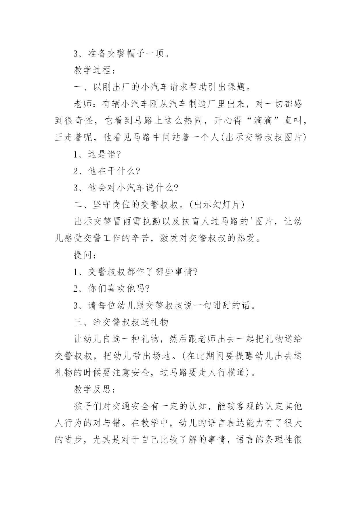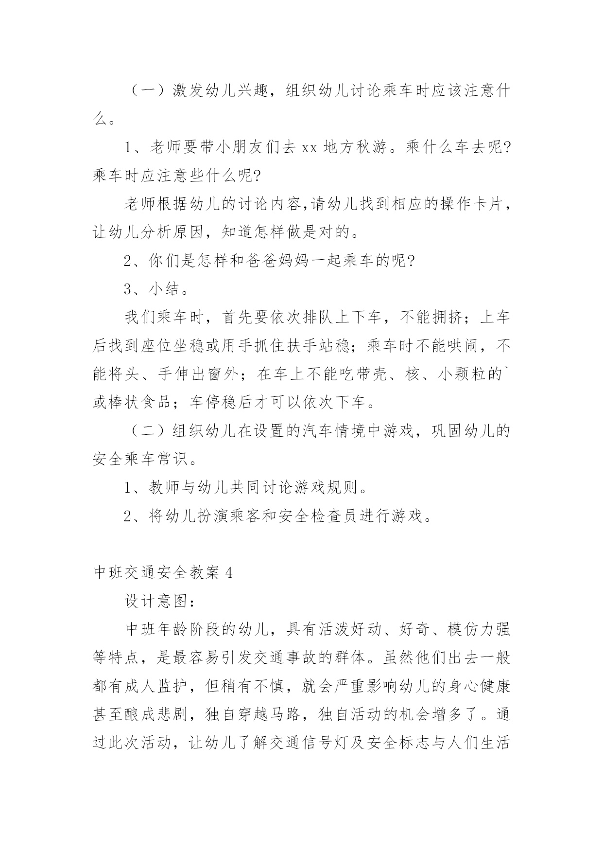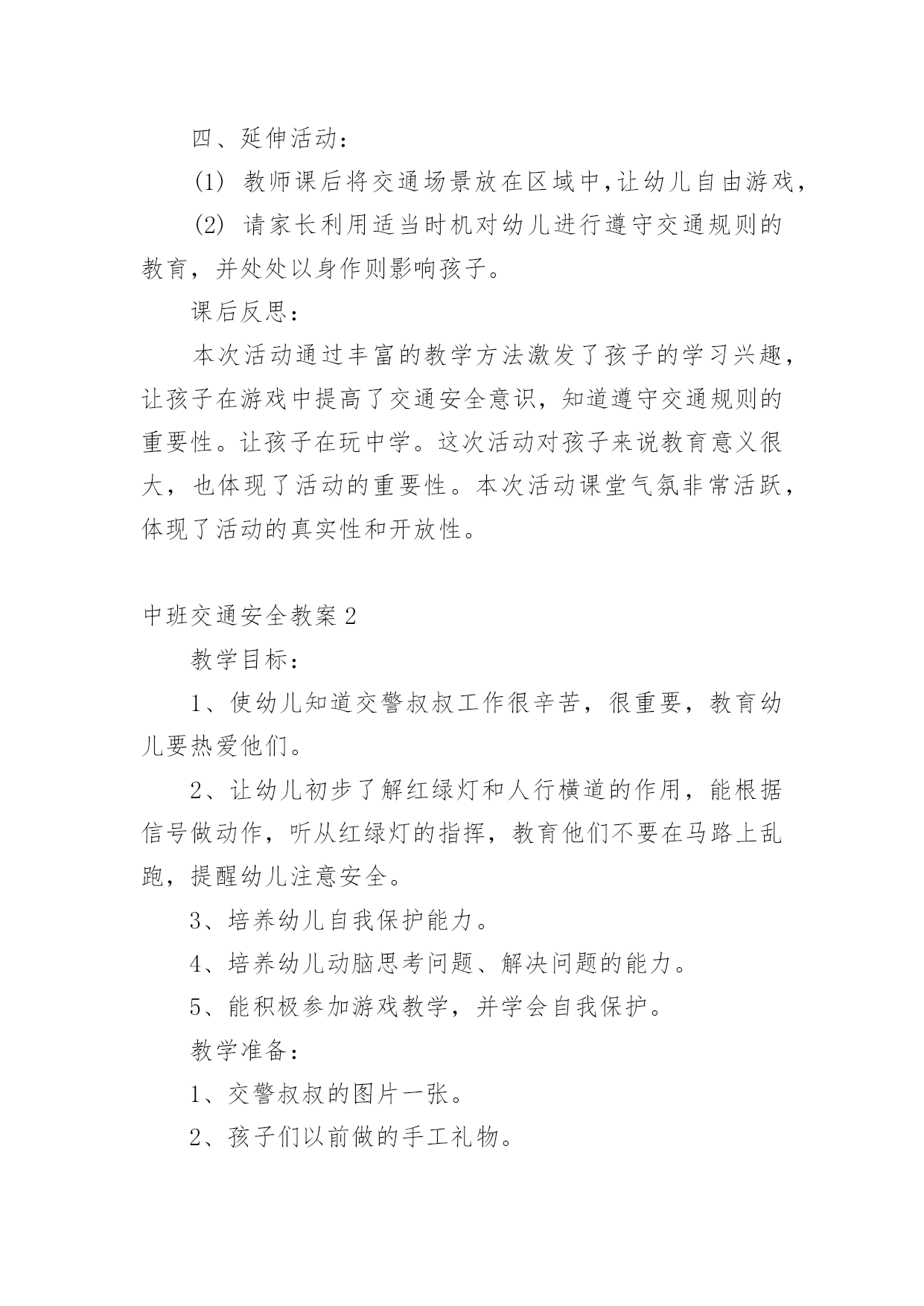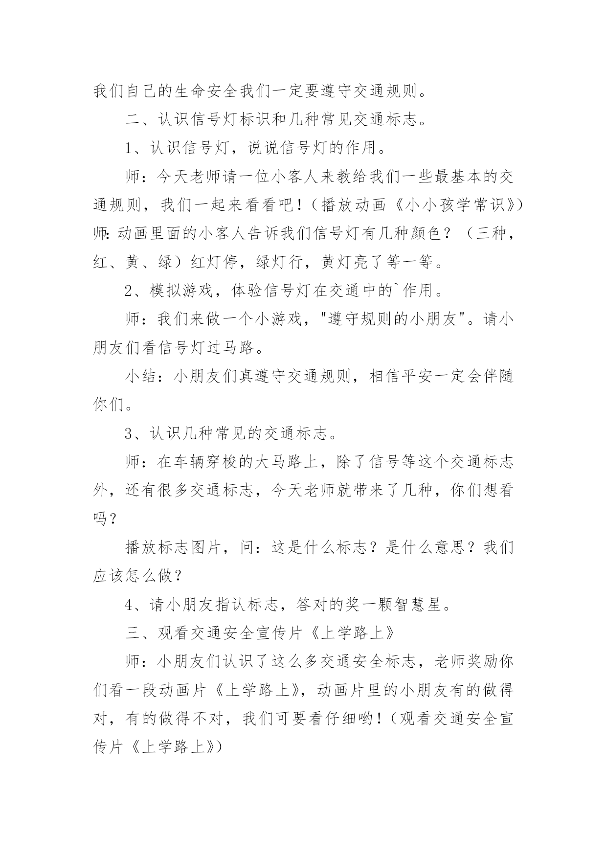 中班交通安全教案作为一位兢兢业业的人民教师,时常会需要准备好教案,教案是教学活动的依据,有着重要的地位。那么大家知道正规的教案是怎么写的吗?以下是小编帮大家整理的中班交通安全教案,仅供参考,欢迎大家阅读。中班交通安全教案1设计意图城市交通的不断发展促使我们加强交通安全教育,让幼儿了解一些危险因素,知道遵守交通规则的重要性,懂得如何保护自己。《新纲要》中指出:“幼儿园必须把保护幼儿的生命和促进幼儿的健康放在工作的首位”。从小让幼儿懂得交通安全知识,养成自觉遵守交通安全的好习惯,对孩子来说可以受益终生。这也符合《新纲要》所提到的“选择的教育内容既贴进幼儿的生活,符合幼儿的现实需要,又有利于其长远发展,为所有在园幼儿的健康成长服务。”为此我设计了这个中班的安全教育活动。活动目标1.让幼儿初步懂得遵守交通安全的重要性,养成自觉遵守交通规则的好习惯。2.让幼儿认识交通安全标志,培养一定的自我保护意识和能力。3.培养幼儿敏锐的观察能力。4.探索、发现生活中的多样性及特征。5.加强幼儿的安全意识。活动准备1、事先在户外布置马路场景:人行道,斑马线、红绿灯,十字路口,天桥。2、儿童自行车两辆、骑车方向盘四个、各种交通安全标志,小贴纸。3、多媒体课件:(1)兔宝宝离开妈妈跑到马路上去玩,差点被车撞到。(2)兔宝宝不看红绿灯,想冲到马路对面去,被妈妈给拉住了。妈妈带着兔宝宝等绿灯时从斑马线过过路了。活动过程一、教师带领幼儿去儿童乐园玩,激发孩子的兴趣。师问:“小朋友们,今天老师要带你们去儿童乐园玩,你们开心吗?我们一起出发吧!”场景一:老师带领幼儿走到人行道和车行道前。师问:(1)“小朋友们,我们应该走哪一种路呀?”(2)“为什么要走这条路呢?”请幼儿自由观察,讨论,引导幼儿认识人行道和车行道的安全标志图。师:我们应该注意什么?(靠右边走,不能边走边玩,特别是不能到车行道上玩。)场景二:继续带领幼儿走到十字路口。师问:“小朋友们,我们要过马路了,应该怎么走?”“这个路像什么呀?它有什么名字的?”“红绿灯是干嘛的呀?”通过老师提问,幼儿观察,学习认识斑马线和红绿灯的作用,知道“过马路要走斑马线,红灯停,绿灯行,黄灯要减速”。场景三:带幼儿继续走到天桥。师问:“小朋友们,这是什么?”“那我们应该怎么走呢?”通过老师的提问,幼儿自由讨论回答,教师小结:“走天桥就像走幼儿园的'楼梯,要靠右边一个跟着一个走,不能推也不能挤。”顺利到达儿童乐园之后,老师和小朋友一起围成一个圈,老师出示刚刚认识的交通安全标志,请幼儿进行抢答,看看谁最能干!老师奖励小贴纸对回答问题的幼儿进行鼓励。二、幼儿观看课件。1、组织观看课件(一)。(1)兔奶奶生病了,兔妈妈带兔宝宝去看望她。半路上,兔妈妈到水果店给奶奶买水果,兔宝宝就跑到了马路上。她看到花丛中有一只漂亮的蝴蝶,就去捉蝴蝶玩。蝴蝶飞到了马路中央,兔宝宝就一路追过去,差点被车撞上。师问:(1)“小朋友们,这个动画片中有谁呀?”(2)“她们发生了什么事呢?”(3)“兔宝宝为什么不能这样做?”(4)“小朋友,如果你是兔宝宝,你会怎样做呢?”请幼儿自由回答,让幼儿发挥他们的想象力,要求幼儿语言流畅,完整。综合幼儿的回答,教师小结:“小朋友们,兔宝宝这样太危险了,不管什么情况我们都不能在马路上玩”。2、组织幼儿观看课件(二)。兔妈妈和兔宝宝继续往前走。奶奶家就在马路对面,兔宝宝兴奋地想冲过马路见奶奶,可是被兔妈妈一把拉住了。兔妈妈带着兔宝宝走到斑马线前,等绿灯亮时再穿过马路去奶奶家。(1)“小朋友们,兔宝宝又发生了什么事呀?”(2)“妈妈是怎样做的?”(3)“后来兔宝宝和兔妈妈怎样过马路的呢?”请幼儿通过观察画面自由回答,教师提出问题:“兔宝宝在路上遇到了一些危险,你们知道怎样才能避免那样的危险吗?”请幼儿根据经验自由回答,教师进行小结。三、模仿游戏,体验生活。“小朋友们,我们一起来玩过马路的游戏吧?记得哦,一定要遵守交通规则!”老师请小朋友们自由扮演各种角色,有扮演行人,有骑自行车的人,有开汽车的人,老师拿着红绿灯,请幼儿在红绿灯的指示下过马路游戏,鼓励幼儿自觉遵守交通规则。幼儿互相角色进行游戏。游戏之后,教师进行小结:“小朋友们,我们以后过马路一定要遵守交通规则,行人要走人行道,红灯停,绿灯行,黄灯要减速。过马路要走斑马线,走天桥呢,一定要靠右边一个一个上,可千万不能推和挤哦。”四、延伸活动:(1)教师课后将交通场景放在区域中,让幼儿自由游戏,(2)请家长利用适当时机对幼儿进行遵守交通规则的教育,并处处以身作则影响孩子。课后反思:本次活动通过丰富的教学方法激发了孩子的学习兴趣,让孩子在游戏中提高了交通安全意识,知道遵守交通规则的重要性。让孩子在玩中学。这次活动对孩子来说教育意义很大,也体现了活动的重要性。本次活动课堂气氛非常