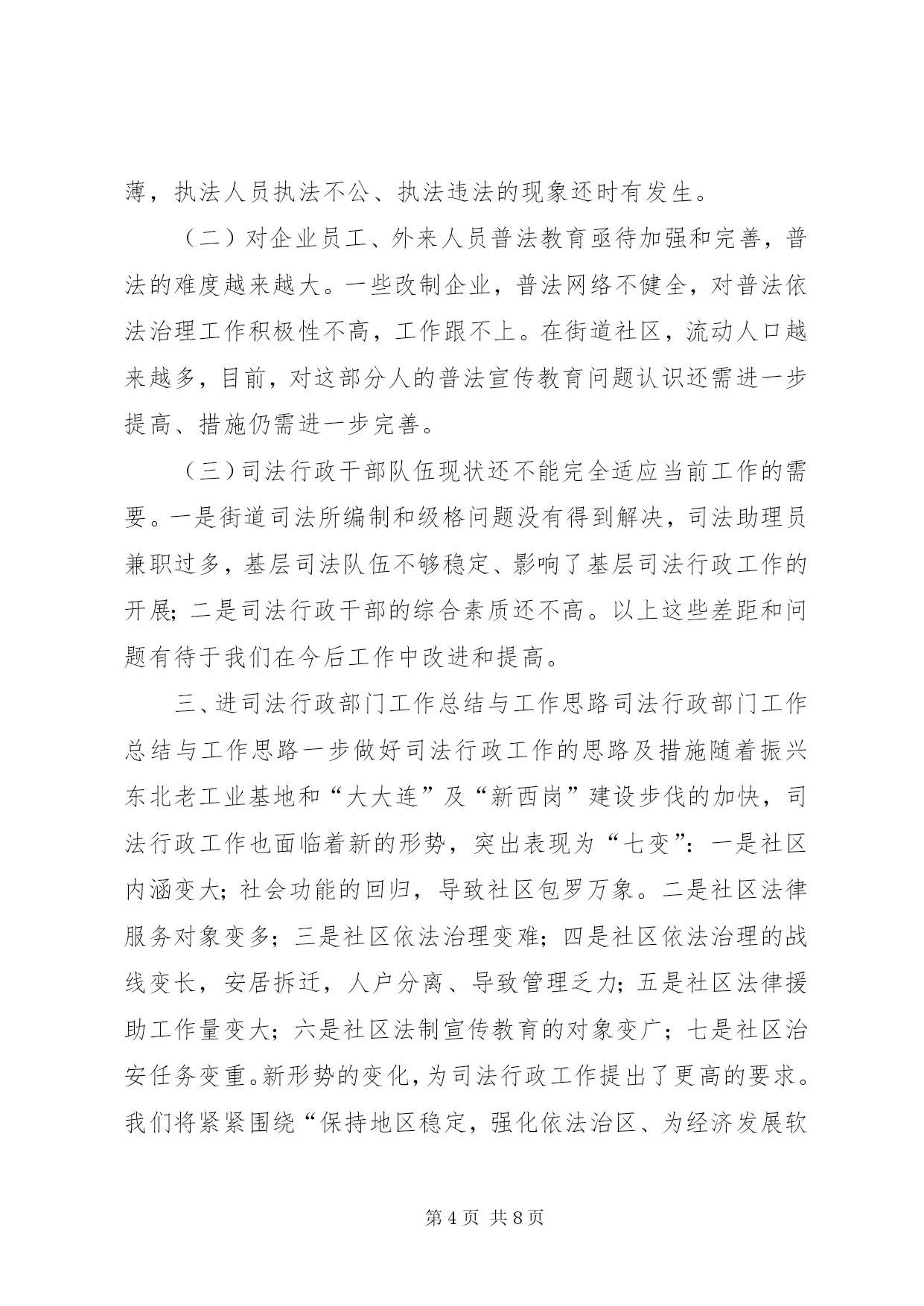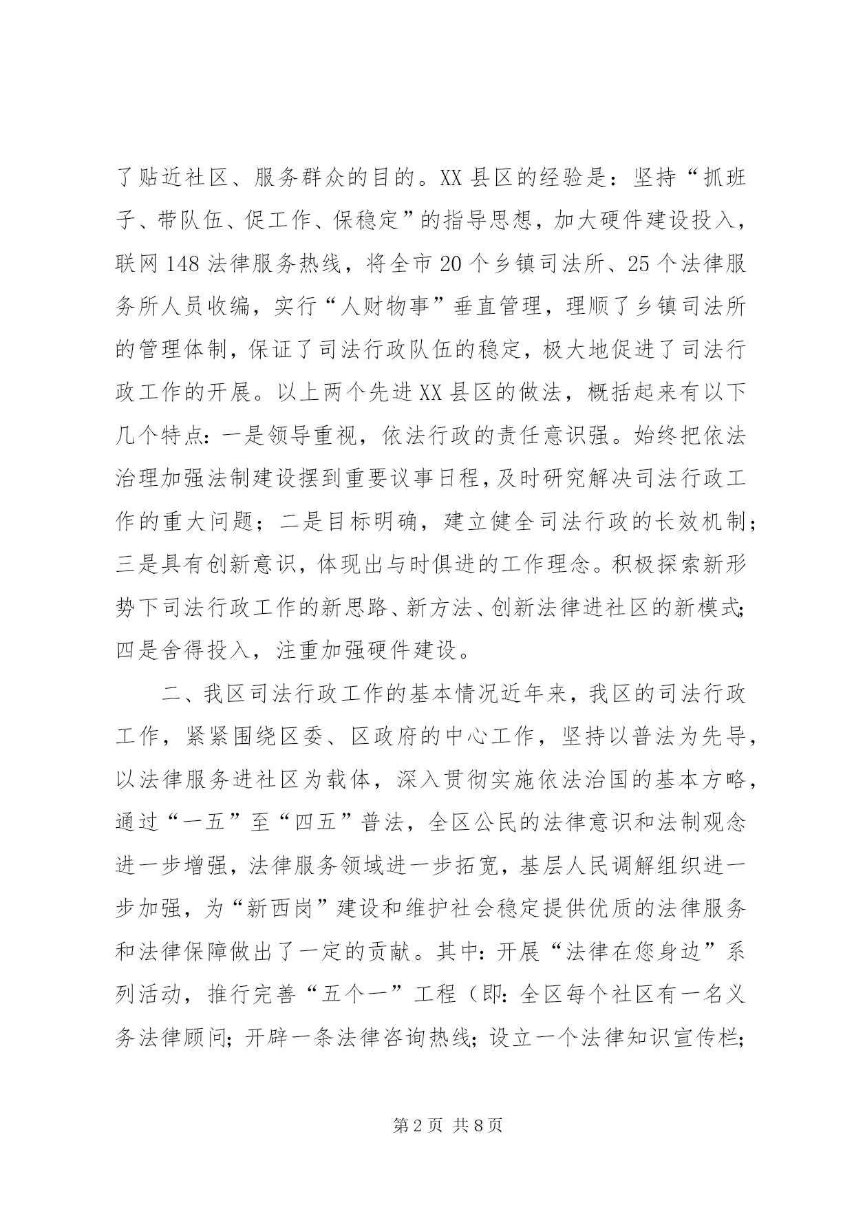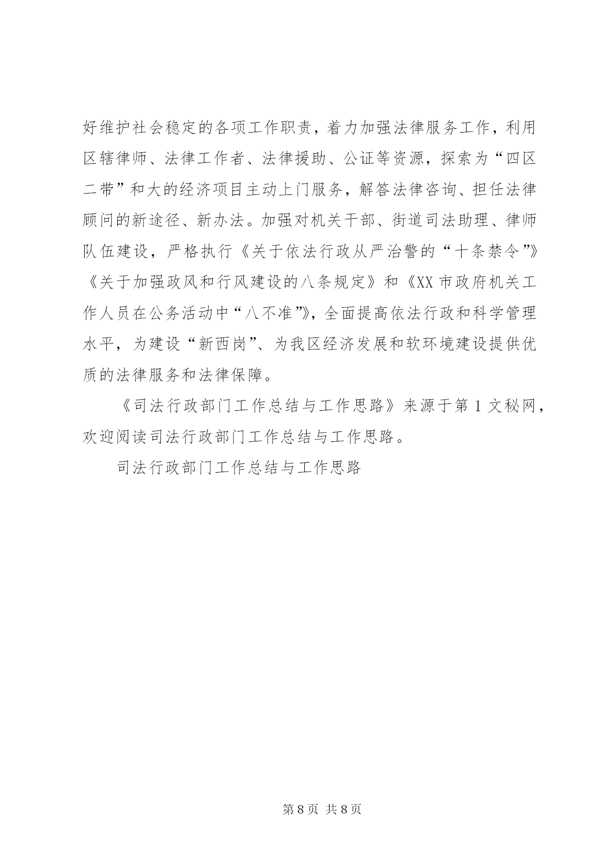 第PAGE\*Arabic\*MERGEFORMAT8页共NUMPAGES\*MERGEFORMAT8页司法行政部门工作总结与工作思路司法行政工作在维护社会稳定、推动地区经济发展中起着不可替代的作用。随着时代的发展,对司法行政工作赋予了新的内涵。党的十六届四中全会对做好司法行政工作提出了更新、更高的要求。在“新西岗”建设中,努力做好司法行政工作,为我区经济建设和社会事业的发展,提供优质的法律服务和优良的法制环境是我们当前一项重要的工作。今天,借举办干部论坛的机会,我从三个方面谈点认识和体会:一、先进XX县区的基本经验XX市XX县区和XX县区的司法行政工作是全国司法行政系统的先进典型。2003年11月,区委副书记王玢带队到XX市XX县区等地进行了学习考察,所到之处、所见所闻给我们留下了深刻的印象。XX市XX县区的先进经验是:坚持“围绕一个中心、抓好两项结合、促进“三个提高”的工作思路(即围绕社会稳定这个中心;抓好普及相关法律知识与受教育人群的职业特点相结合;与区委、区政府中心工作相结合。促进公民法律素质的提高;促进依法行政水平的提高;促进司法局外在地位、形象的提高)。注重在“三提供、三帮助(即提供法律咨询,帮助群众知法;提供法律服务,帮助群众懂法;提供法律保障,帮助群众用法)上下功夫。在法制宣传上,将普法阵地前移,送法进社区;在法律服务上,将办案人员工作重心下移,拓宽服务市场;在人民调解上,坚持调防结合,寓防于调,达到了贴近社区、服务群众的目的。XX县区的经验是:坚持“抓班子、带队伍、促工作、保稳定”的指导思想,加大硬件建设投入,联网148法律服务热线,将全市20个乡镇司法所、25个法律服务所人员收编,实行“人财物事”垂直管理,理顺了乡镇司法所的管理体制,保证了司法行政队伍的稳定,极大地促进了司法行政工作的开展。以上两个先进XX县区的做法,概括起来有以下几个特点:一是领导重视,依法行政的责任意识强。始终把依法治理加强法制建设摆到重要议事日程,及时研究解决司法行政工作的重大问题;二是目标明确,建立健全司法行政的长效机制;三是具有创新意识,体现出与时俱进的工作理念。积极探索新形势下司法行政工作的新思路、新方法、创新法律进社区的新模式;四是舍得投入,注重加强硬件建设。二、我区司法行政工作的基本情况近年来,我区的司法行政工作,紧紧围绕区委、区政府的中心工作,坚持以普法为先导,以法律服务进社区为载体,深入贯彻实施依法治国的基本方略,通过“一五”至“四五”普法,全区公民的法律意识和法制观念进一步增强,法律服务领域进一步拓宽,基层人民调解组织进一步加强,为“新西岗”建设和维护社会稳定提供优质的法律服务和法律保障做出了一定的贡献。其中:开展“法律在您身边”系列活动,推行完善“五个一”工程(即:全区每个社区有一名义务法律顾问;开辟一条法律咨询热线;设立一个法律知识宣传栏;建立一个法制课堂;有一个法律图书角)使社区居民遇有一般法律问题不出社区就可得到解决,形成了法律服务与群众“零距离”的“五进社区”工作模式,受到上级主管部门和社区居民的好评。法律援助工作被XX省司法厅授予“XX省法律援助先进集体”和“XX市司法行政系统先进集体”。为农民工讨要拖欠工资实施法律援助,在社会上引起了较大反响。省、市政府对我们的做法给予肯定,市内多家媒体进行了报道。开展法律进社区,送法送书入户活动得到区委、区政府的高度重视,被列为全区为民办实事项目。投入10余万元,编印“一书四指南”(即:《常用法律知识手册》、《外来劳务人员法律知识指南》《人民调解指南》《公证指南》《法律援助指南》)免费向社区居民发放,做到“一户一册”。近年,围绕旧XX县区改造开展矛盾纠纷排查调处专项治理的做法被市司法局推广。指导石道街小学开展的“少年模拟法庭”大赛活动被中央电视台和司法部联合制成光盘向全国发行。虽然,我们在普法宣传、法律服务等方面作了一些工作,取得了一定的成绩,但与典型XX县区相比,与司法行政工作的内在要求相比,与人民群众的法律需求相比,还存在着差距和不足,主要表现在以下三个方面:(一)对普法依法治理工作重要性的认识亟待提高。一是个别部门和行业的领导对法制化管理的重视程度不够,缺乏紧迫感和责任感。二是在执法环节上,部分执法人员秉公执法的意识淡薄,执法人员执法不公、执法违法的现象还时有发生。(二)对企业员工、外来人员普法教育亟待加强和完善,普法的难度越来越大。一些改制企业,普法网络不健全,对普法依法治理工作积极性不高,工作跟不上。在街道社区,流动人口越来越多,目前,对这部分人的普法宣传教育问题认识还需进一步提高、措施仍需进一步完善。(三)司法行政干部队伍现状还不能完全适应当前工作的需要。一是街道司法所编制和级格问题没有得到解决,司法助理员兼职过多,基层司法队伍不够