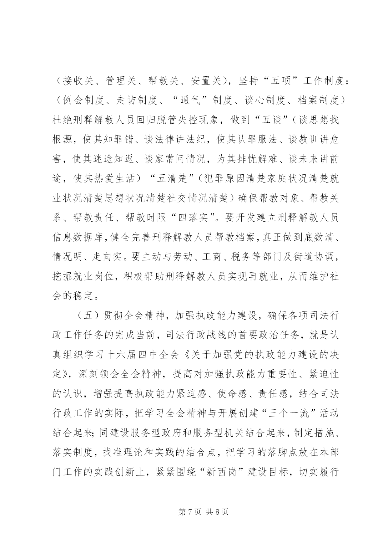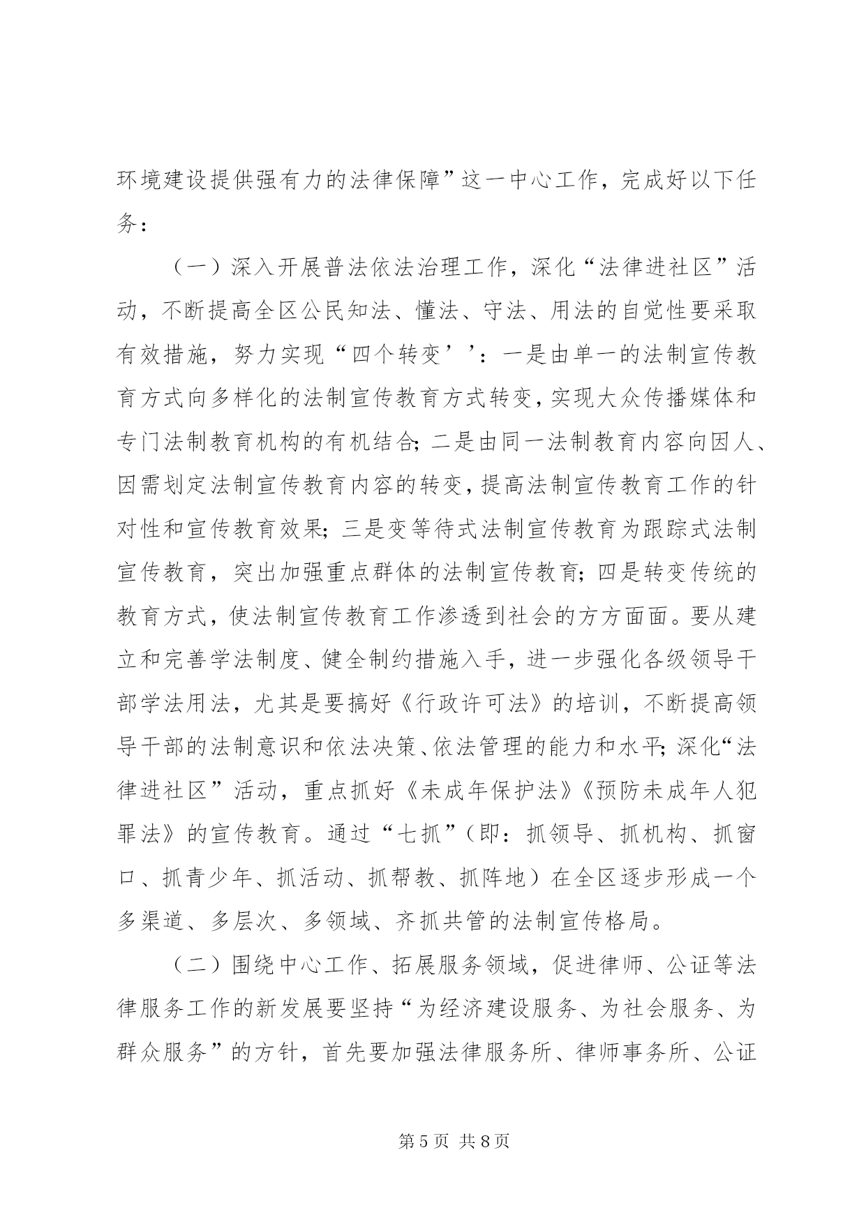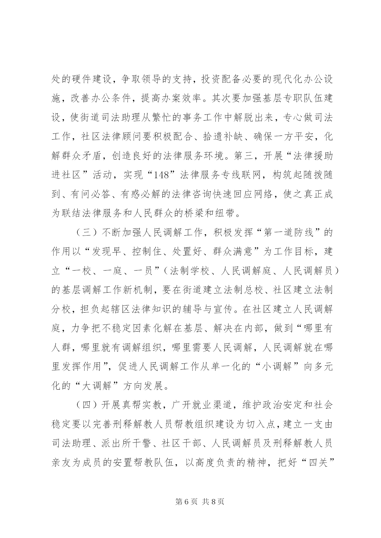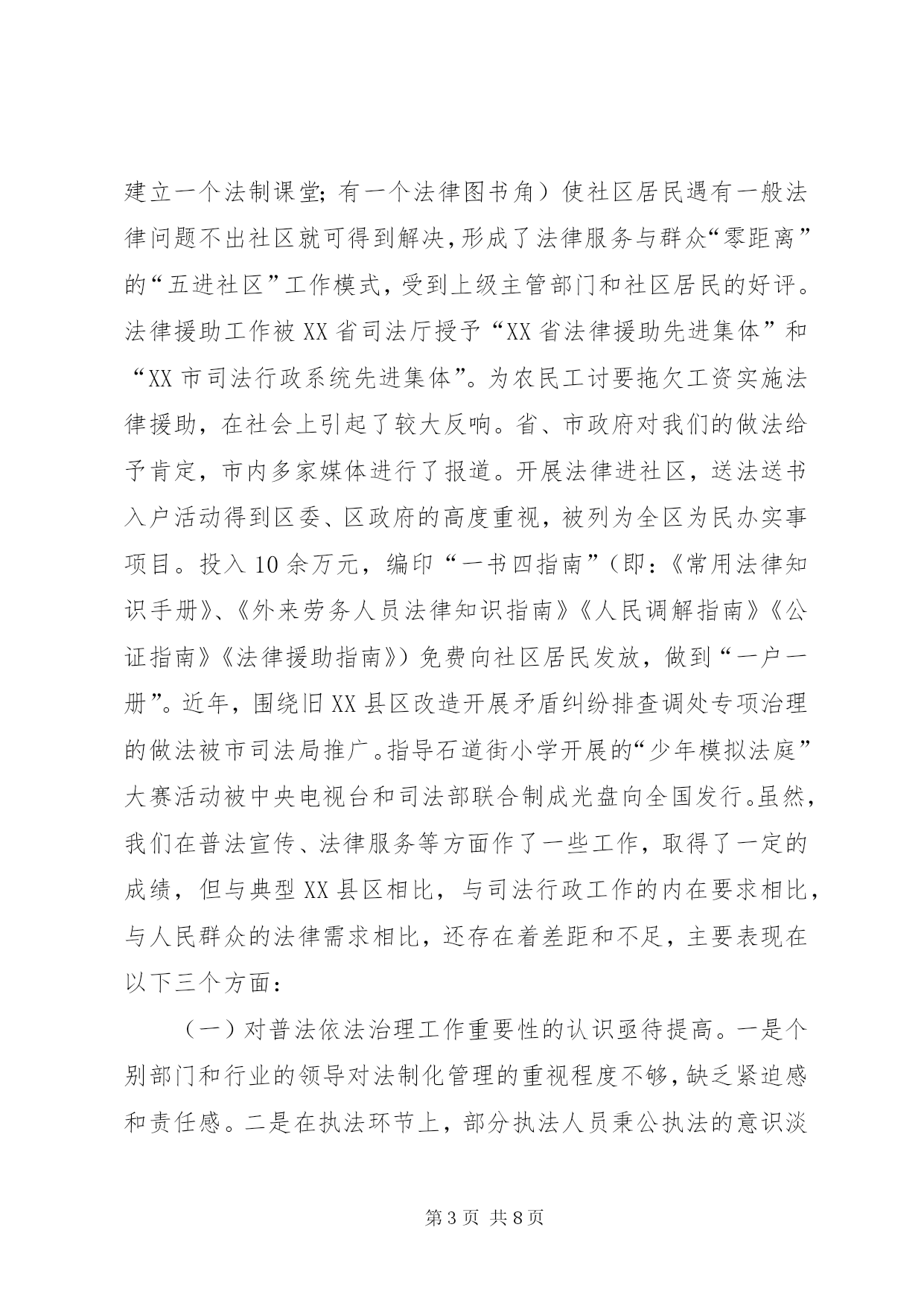 第PAGE\*Arabic\*MERGEFORMAT8页共NUMPAGES\*MERGEFORMAT8页司法行政部门工作总结与工作思路司法行政工作在维护社会稳定、推动地区经济发展中起着不可替代的作用。随着时代的发展,对司法行政工作赋予了新的内涵。党的十六届四中全会对做好司法行政工作提出了更新、更高的要求。在“新西岗”建设中,努力做好司法行政工作,为我区经济建设和社会事业的发展,提供优质的法律服务和优良的法制环境是我们当前一项重要的工作。今天,借举办干部论坛的机会,我从三个方面谈点认识和体会:一、先进XX县区的基本经验XX市XX县区和XX县区的司法行政工作是全国司法行政系统的先进典型。2003年11月,区委副书记王玢带队到XX市XX县区等地进行了学习考察,所到之处、所见所闻给我们留下了深刻的印象。XX市XX县区的先进经验是:坚持“围绕一个中心、抓好两项结合、促进“三个提高”的工作思路(即围绕社会稳定这个中心;抓好普及相关法律知识与受教育人群的职业特点相结合;与区委、区政府中心工作相结合。促进公民法律素质的提高;促进依法行政水平的提高;促进司法局外在地位、形象的提高)。注重在“三提供、三帮助(即提供法律咨询,帮助群众知法;提供法律服务,帮助群众懂法;提供法律保障,帮助群众用法)上下功夫。在法制宣传上,将普法阵地前移,送法进社区;在法律服务上,将办案人员工作重心下移,拓宽服务市场;在人民调解上,坚持调防结合,寓防于调,达到了贴近社区、服务群众的目的。XX县区的经验是:坚持“抓班子、带队伍、促工作、保稳定”的指导思想,加大硬件建设投入,联网148法律服务热线,将全市20个乡镇司法所、25个法律服务所人员收编,实行“人财物事”垂直管理,理顺了乡镇司法所的管理体制,保证了司法行政队伍的稳定,极大地促进了司法行政工作的开展。以上两个先进XX县区的做法,概括起来有以下几个特点:一是领导重视,依法行政的责任意识强。始终把依法治理加强法制建设摆到重要议事日程,及时研究解决司法行政工作的重大问题;二是目标明确,建立健全司法行政的长效机制;三是具有创新意识,体现出与时俱进的工作理念。积极探索新形势下司法行政工作的新思路、新方法、创新法律进社区的新模式;四是舍得投入,注重加强硬件建设。二、我区司法行政工作的基本情况近年来,我区的司法行政工作,紧紧围绕区委、区政府的中心工作,坚持以普法为先导,以法律服务进社区为载体,深入贯彻实施依法治国的基本方略,通过“一五”至“四五”普法,全区公民的法律意识和法制观念进一步增强,法律服务领域进一步拓宽,基层人民调解组织进一步加强,为“新西岗”建设和维护社会稳定提供优质的法律服务和法律保障做出了一定的贡献。其中:开展“法律在您身边”系列活动,推行完善“五个一”工程(即:全区每个社区有一名义务法律顾问;开辟一条法律咨询热线;设立一个法律知识宣传栏;建立一个法制课堂;有一个法律图书角)使社区居民遇有一般法律问题不出社区就可得到解决,形成了法律服务与群众“零距离”的“五进社区”工作模式,受到上级主管部门和社区居民的好评。法律援助工作被XX省司法厅授予“XX省法律援助先进集体”和“XX市司法行政系统先进集体”。为农民工讨要拖欠工资实施法律援助,在社会上引起了较大反响。省、市政府对我们的做法给予肯定,市内多家媒体进行了报道。开展法律进社区,送法送书入户活动得到区委、区政府的高度重视,被列为全区为民办实事项目。投入10余万元,编印“一书四指南”(即:《常用法律知识手册》、《外来劳务人员法律知识指南》《人民调解指南》《公证指南》《法律援助指南》)免费向社区居民发放,做到“一户一册”。近年,围绕旧XX县区改造开展矛盾纠纷排查调处专项治理的做法被市司法局推广。指导石道街小学开展的“少年模拟法庭”大赛活动被中央电视台和司法部联合制成光盘向全国发行。虽然,我们在普法宣传、法律服务等方面作了一些工作,取得了一定的成绩,但与典型XX县区相比,与司法行政工作的内在要求相比,与人民群众的法律需求相比,还存在着差距和不足,主要表现在以下三个方面:(一)对普法依法治理工作重要性的认识亟待提高。一是个别部门和行业的领导对法制化管理的重视程度不够,缺乏紧迫感和责任感。二是在执法环节上,部分执法人员秉公执法的意识淡薄,执法人员执法不公、执法违法的现象还时有发生。(二)对企业员工、外来人员普法教育亟待加强和完善,普法的难度越来越大。一些改制企业,普法网络不健全,对普法依法治理工作积极性不高,工作跟不上。在街道社区,流动人口越来越多,目前,对这部分人的普法宣传教育问题认识还需进一步提高、措施仍需进一步完善。(三)司法行政干部队伍现状还不能完全适应当前工作的需要。一是街道司法所编制和级格问题没有得到解决,司法助理员兼职过多,基层司法队伍不够