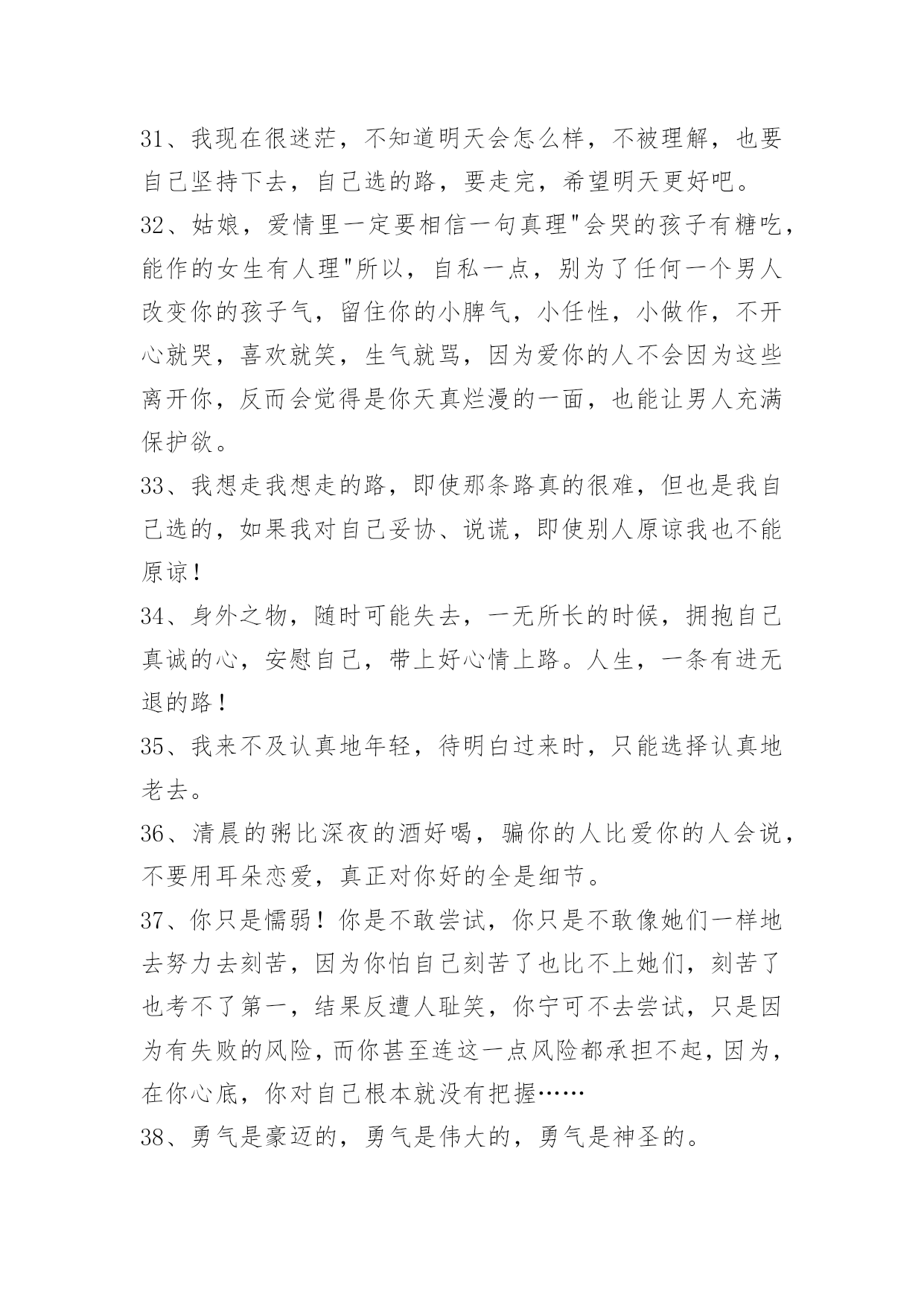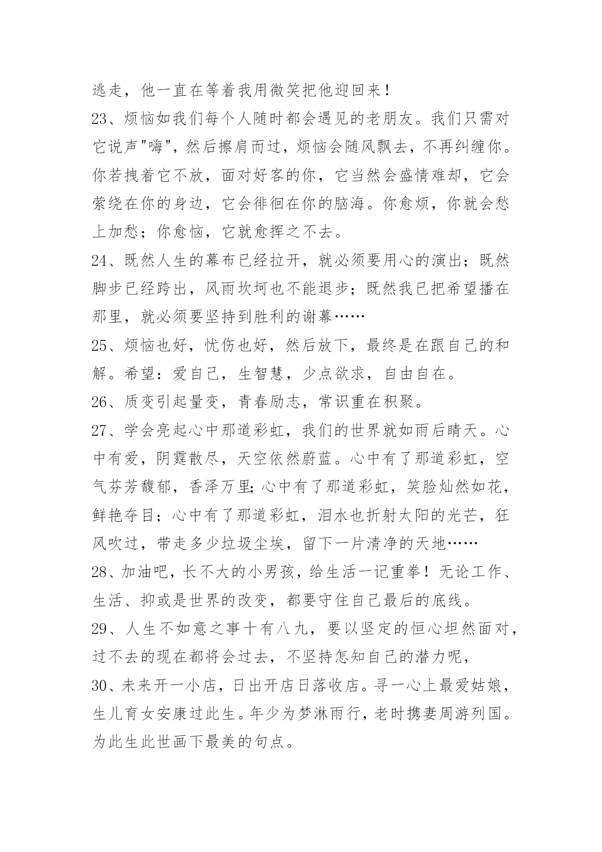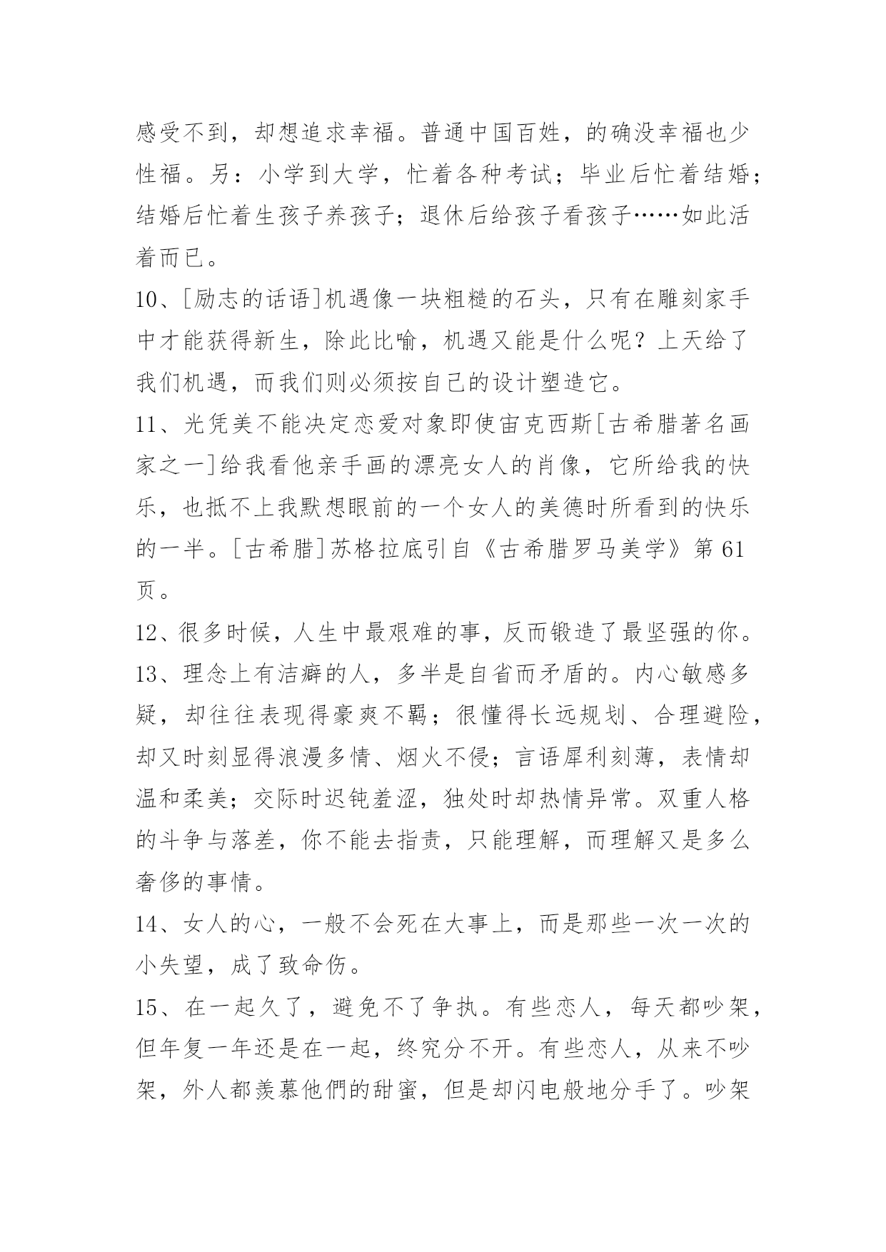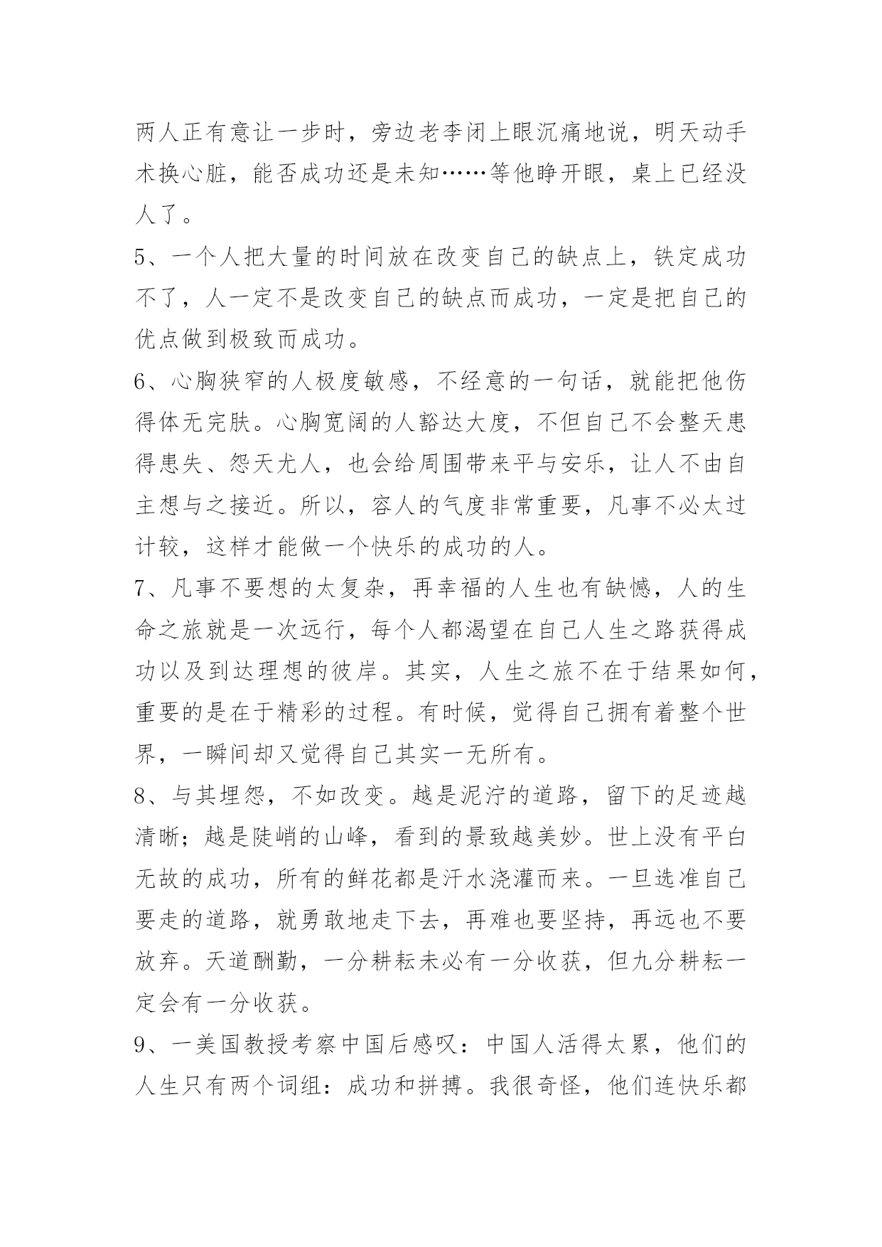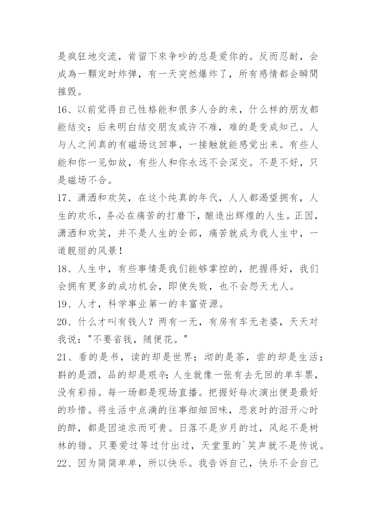 工作励志语录49条【热门】2021年工作励志语录49条秋天到了,换上了一个秋主题的面板,让自己的心情也象秋天的硕果一样有丰收的喜悦。象秋天的红叶,片片都充满了热情。下面是小编给各位读者分享的工作励志语录49条,大家快来看看吧。1、人能成全他人,也能毁弃他人;互相帮助能使人奋发向上,互相抱怨会使人退缩不前。人与人之间的这种影响,就像阳光与寒霜对田野的影响一样。每个人都随时发出一种呼唤,促使别人荣辱毁誉,生死成败。2、心是承载梦想的地方,让心灵最先到达你想去的地方。听从心灵的召唤,让它带你走近成功。这正如爬山活动中,决定你能否到达山顶的不是你的体能,而是你的信念,如果你坚信自己能够爬到顶峰,你就可以;如果你觉得自己不行,那你就很难到达最高处。把心作为起跳的动力,你才会跳得更高。3、成功者告诉我们,每个人都会有一种为自己奋斗的理由。生活在这个世界,我们始终要坚定一种信仰,那就是终身为自己的理想而奋斗。为自己而奋斗,我们才会竭尽全力地昂首向前,我们才不会有一丝的保留。4、四个老头在打牌,老赵说自己有肝硬化,不能生气,打牌要让着他点;老钱撩开衣服,说上个月割掉半个胃,正调养,也不能生气;老孙不慌不忙掏出瓶药,那是治癌症的药,两人正有意让一步时,旁边老李闭上眼沉痛地说,明天动手术换心脏,能否成功还是未知……等他睁开眼,桌上已经没人了。5、一个人把大量的时间放在改变自己的缺点上,铁定成功不了,人一定不是改变自己的缺点而成功,一定是把自己的优点做到极致而成功。6、心胸狭窄的人极度敏感,不经意的一句话,就能把他伤得体无完肤。心胸宽阔的人豁达大度,不但自己不会整天患得患失、怨天尤人,也会给周围带来平与安乐,让人不由自主想与之接近。所以,容人的气度非常重要,凡事不必太过计较,这样才能做一个快乐的成功的人。7、凡事不要想的太复杂,再幸福的人生也有缺憾,人的生命之旅就是一次远行,每个人都渴望在自己人生之路获得成功以及到达理想的彼岸。其实,人生之旅不在于结果如何,重要的是在于精彩的过程。有时候,觉得自己拥有着整个世界,一瞬间却又觉得自己其实一无所有。8、与其埋怨,不如改变。越是泥泞的道路,留下的足迹越清晰;越是陡峭的山峰,看到的景致越美妙。世上没有平白无故的成功,所有的鲜花都是汗水浇灌而来。一旦选准自己要走的道路,就勇敢地走下去,再难也要坚持,再远也不要放弃。天道酬勤,一分耕耘未必有一分收获,但九分耕耘一定会有一分收获。9、一美国教授考察中国后感叹:中国人活得太累,他们的人生只有两个词组:成功和拼搏。我很奇怪,他们连快乐都感受不到,却想追求幸福。普通中国百姓,的确没幸福也少性福。另:小学到大学,忙着各种考试;毕业后忙着结婚;结婚后忙着生孩子养孩子;退休后给孩子看孩子……如此活着而已。10、[励志的话语]机遇像一块粗糙的石头,只有在雕刻家手中才能获得新生,除此比喻,机遇又能是什么呢?上天给了我们机遇,而我们则必须按自己的设计塑造它。11、光凭美不能决定恋爱对象即使宙克西斯[古希腊著名画家之一]给我看他亲手画的漂亮女人的肖像,它所给我的快乐,也抵不上我默想眼前的一个女人的美德时所看到的快乐的一半。[古希腊]苏格拉底引自《古希腊罗马美学》。12、很多时候,人生中最艰难的事,反而锻造了最坚强的你。13、理念上有洁癖的人,多半是自省而矛盾的。内心敏感多疑,却往往表现得豪爽不羁;很懂得长远规划、合理避险,却又时刻显得浪漫多情、烟火不侵;言语犀利刻薄,表情却温和柔美;交际时迟钝羞涩,独处时却热情异常。双重人格的斗争与落差,你不能去指责,只能理解,而理解又是多么奢侈的事情。14、女人的心,一般不会死在大事上,而是那些一次一次的小失望,成了致命伤。15、在一起久了,避免不了争执。有些恋人,每天都吵架,但年复一年还是在一起,终究分不开。有些恋人,从来不吵架,外人都羨慕他們的甜蜜,但是却闪电般地分手了。吵架是疯狂地交流,肯留下來争吵的总是爱你的。反而忍耐,会成為一顆定时炸弹,有一天突然爆炸了,所有感情都会瞬間摧毀。16、以前觉得自己性格能和很多人合的来,什么样的朋友都能结交;后来明白结交朋友或许不难,难的是变成知己。人与人之间真的有磁场这回事,一接触就能感觉出来。有些人能和你一见如故,有些人和你永远不会深交。不是不好,只是磁场不合。17、潇洒和欢笑,在这个纯真的年代,人人都渴望拥有,人生的欢乐,务必在痛苦的打磨下,酿造出辉煌的人生。正因,潇洒和欢笑,并不是人生的全部,痛苦就成为我人生中,一道靓丽的风景!18、人生中,有些事情是我们能够掌控的,把握得好,我们会拥有更多的成功机会,即使失败,也不会怨天尤人。19、人才,科学事业第一的丰富资源。20、什么才叫有钱人?两有一无,有房有车无老婆,天天对我说:"不要省钱,随便花。"21、看的是书,读的却是世界;沏的是茶,尝的却是生活;