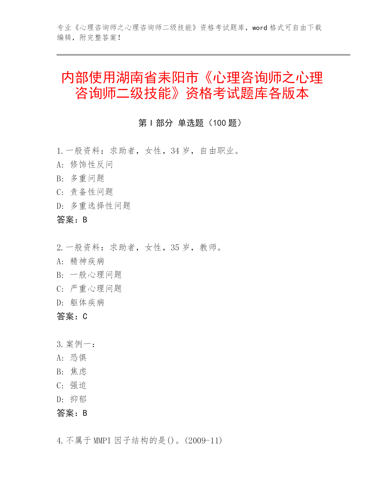 内部使用湖南省耒阳市《心理咨询师之心理咨询师二级技能》资格考试题库各版本