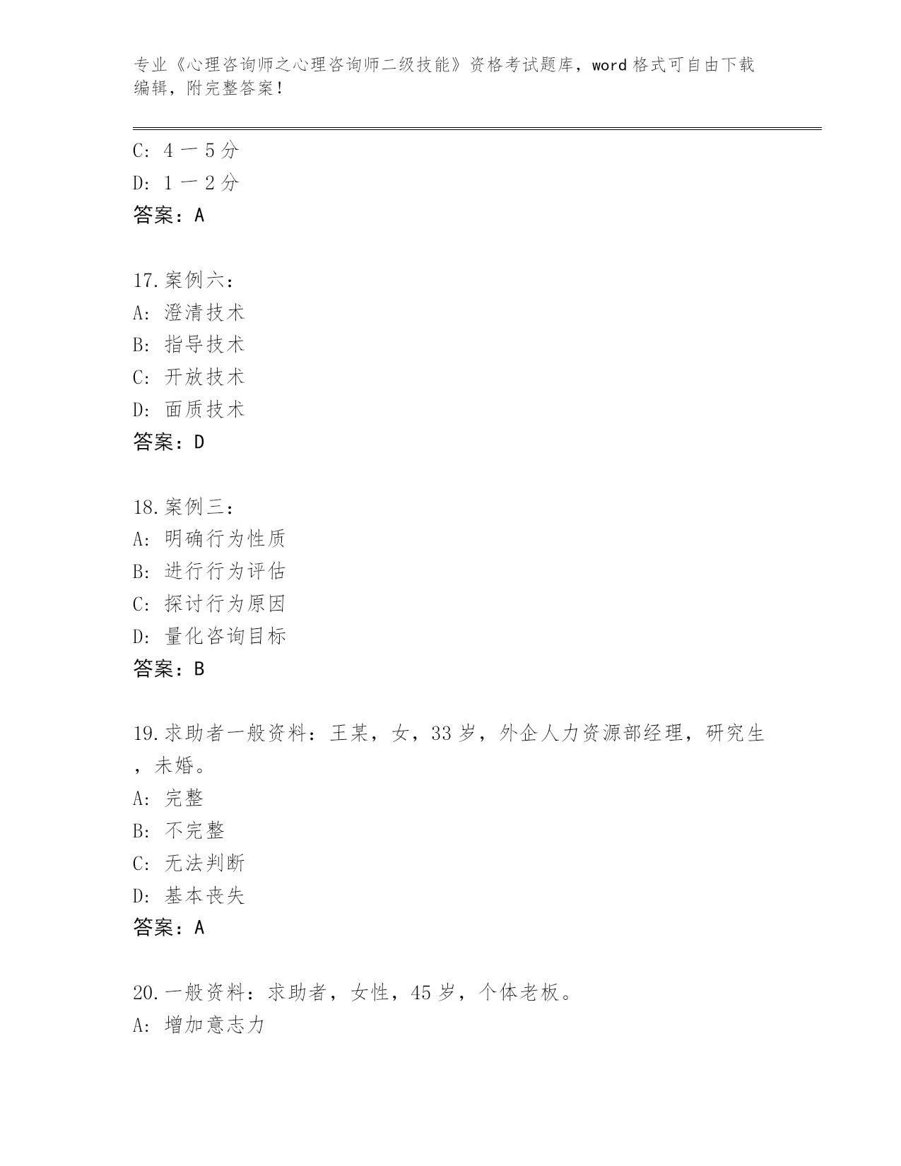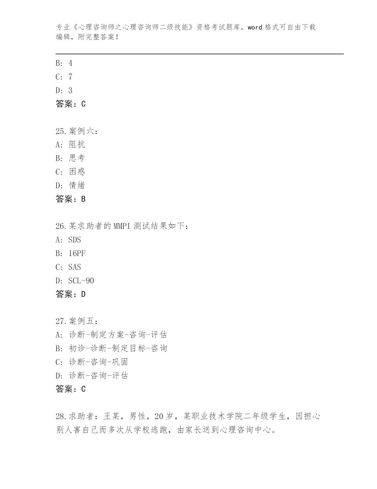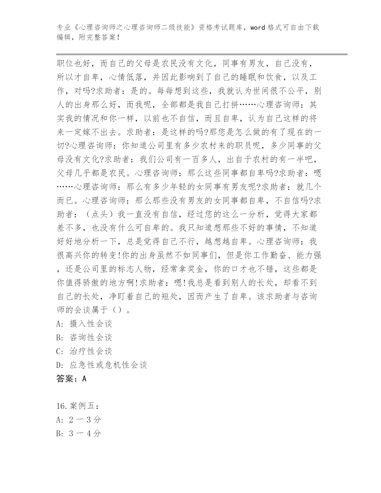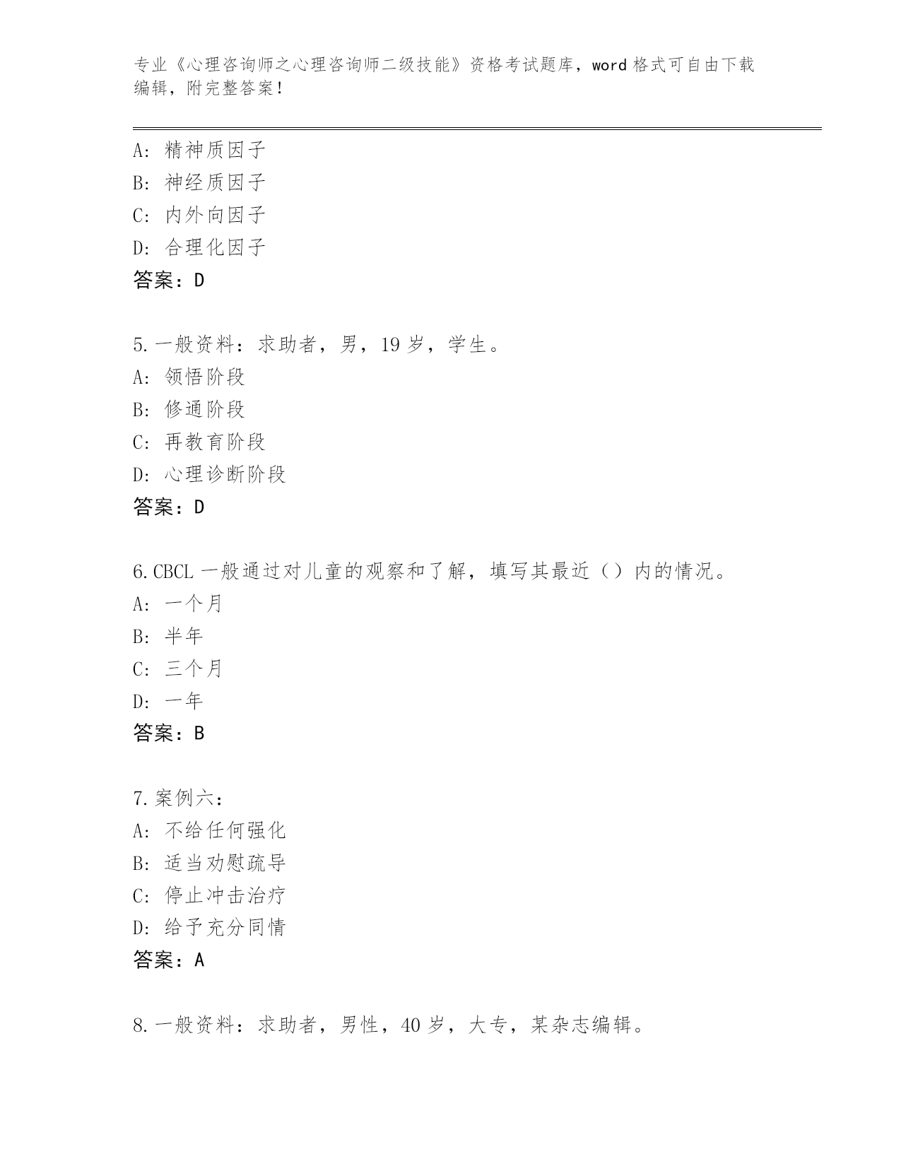 内部使用湖南省嘉禾县《心理咨询师之心理咨询师二级技能》资格考试王牌题库及答案下载
