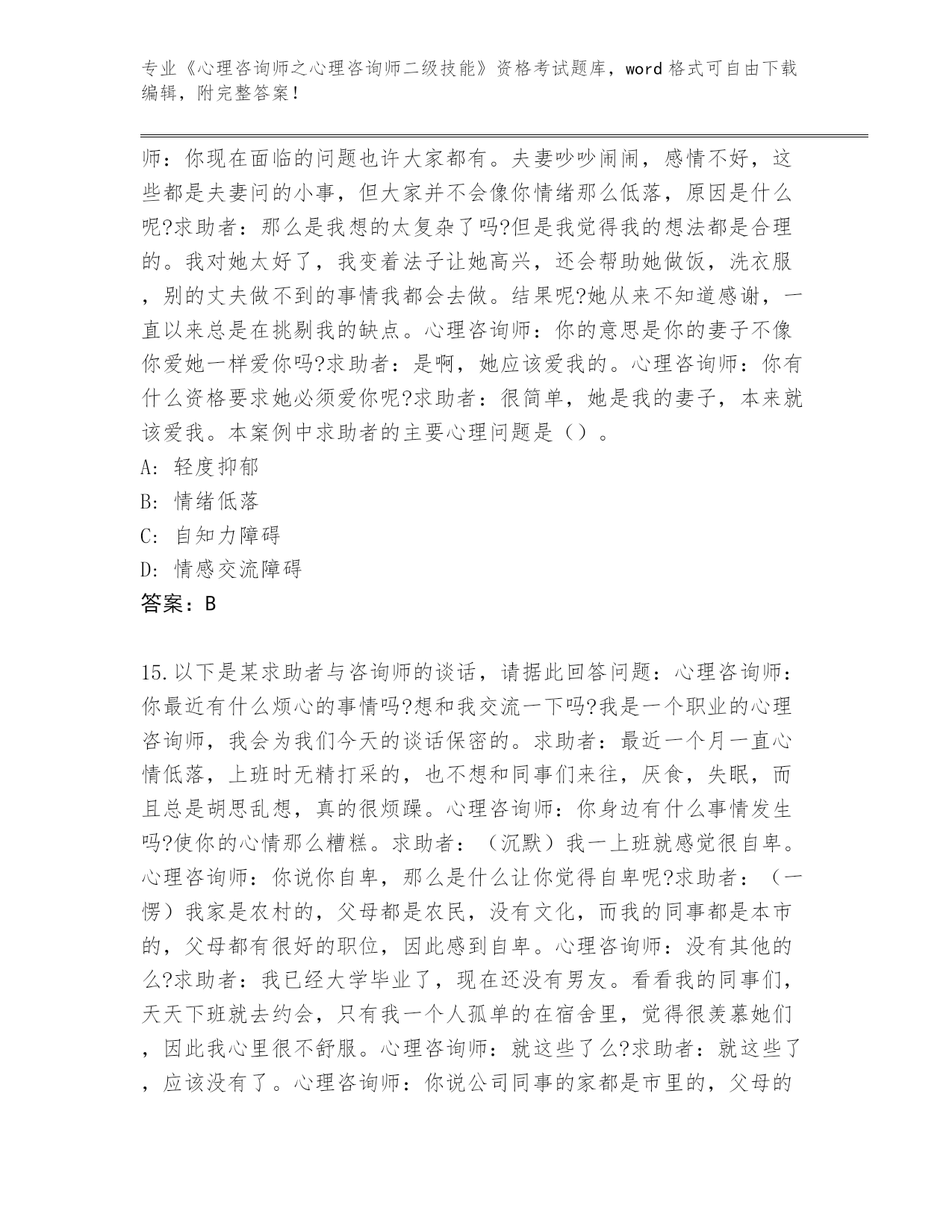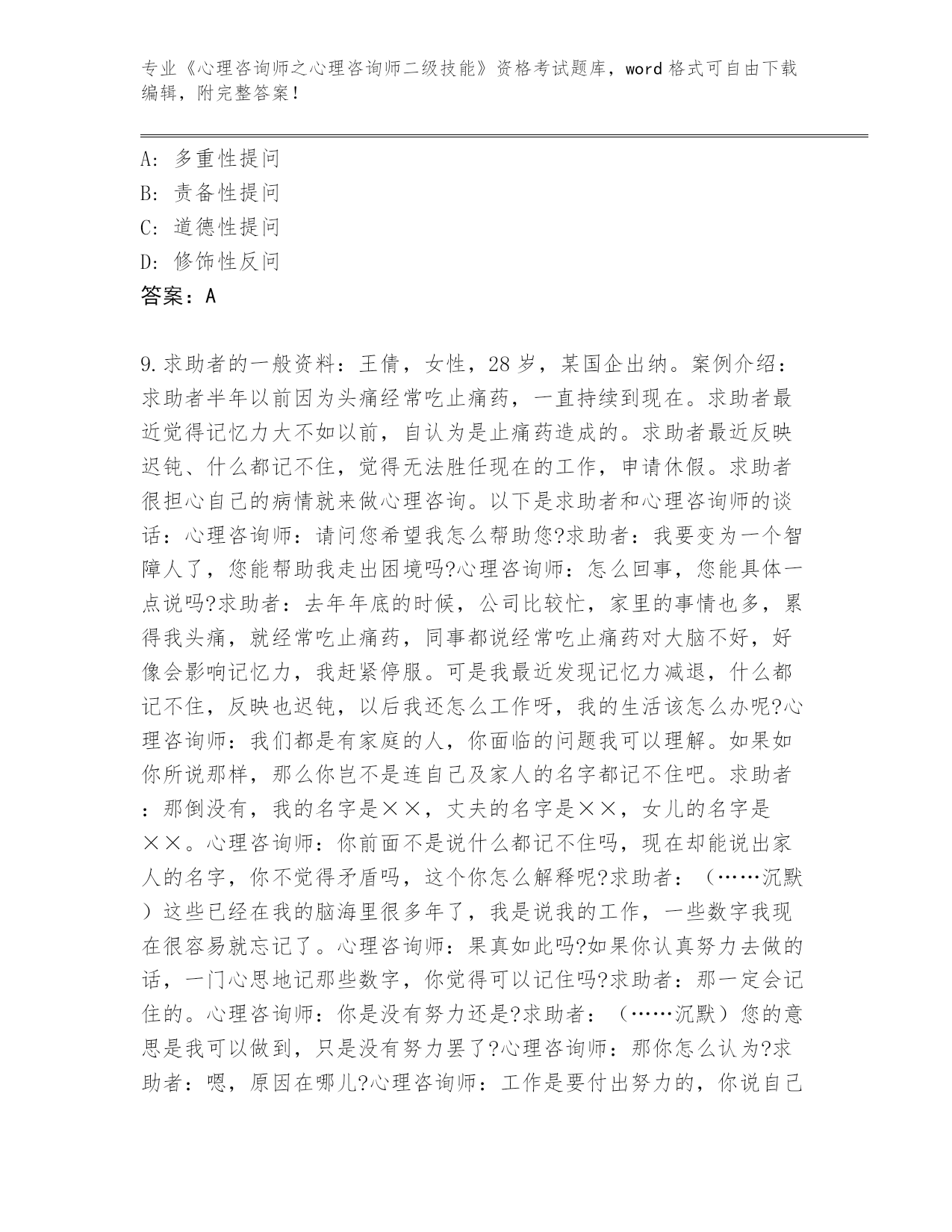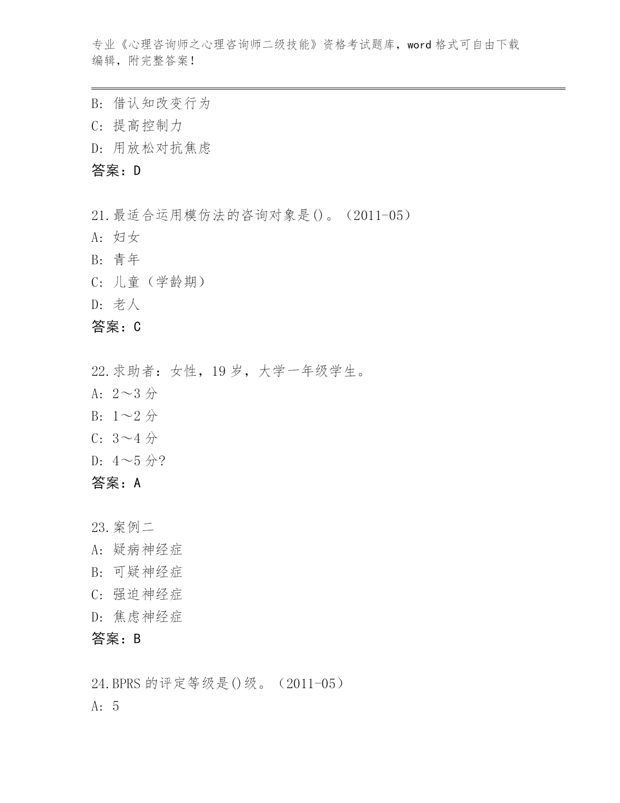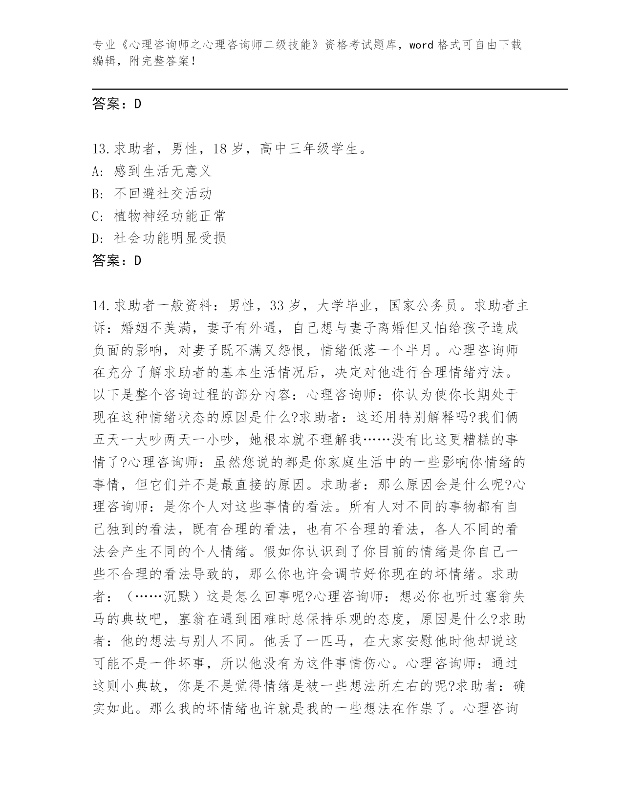 湖南省内部使用《心理咨询师之心理咨询师二级技能》资格考试内部题库(历年真题)