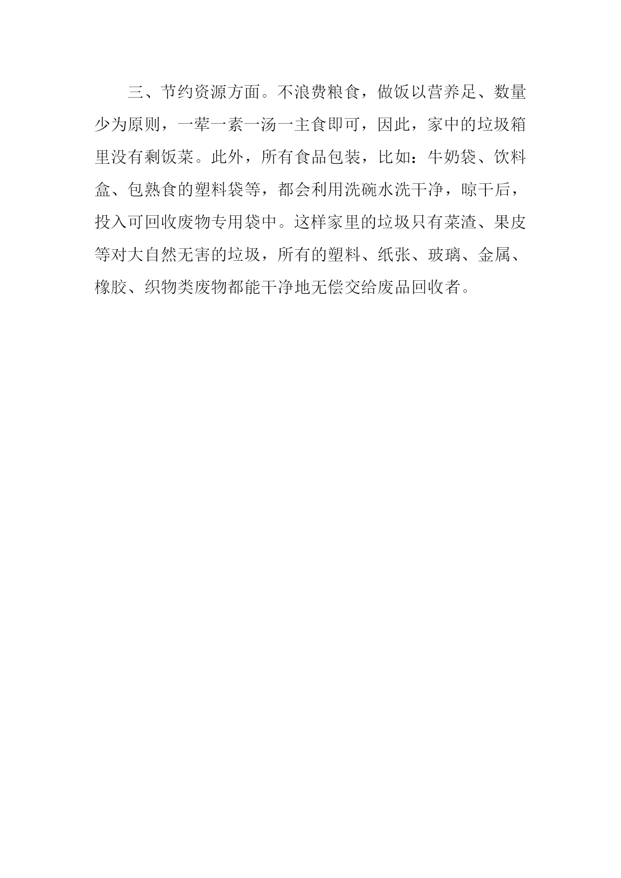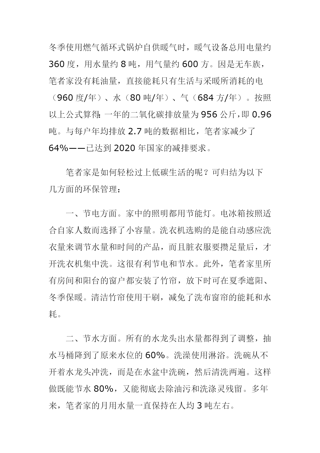 低碳:从40%的生活能耗做起“低碳生活”指的是能耗少的生活方式。为什么“减碳”要从生活做起?国家发改委能源研究所的一项研究指出:目前中国居民生活的能耗(含衣、食、住、行、用、服务六项)占全国能源消费总量的40%以上。因此,居民在生活中节能对全国的减排至关重要。在哥本哈根大会上,中国向世界承诺:到2020年,单位GDP的碳排放下降40%-45%。这使许多公众想从自家做起,来减少碳排放。家庭直接能耗产生的“碳排放”由四部分构成:用电量、用水量、用气量、耗油量。方便的计算公式是,将用量与相应的二氧化碳排放强度系数相乘:用电的碳排放:度数×0.785(公斤)用水的碳排放:吨数×0.91(公斤)用气的碳排放:立方数×0.19(公斤)耗油的碳排放:公升数×2.7(公斤)在目前的中国,每户家庭因直接能耗而产生的二氧化碳排放量一年约为2.7吨。利用以上公式,笔者计算了自家的碳排放。笔者家住房面积110平方米,常住人口2人,每月生活平均用电量50度,用水量6吨,用天然气量7立方。冬季使用燃气循环式锅炉自供暖气时,暖气设备总用电量约360度,用水量约8吨,用气量约600方。因是无车族,笔者家没有耗油量,直接能耗只有生活与采暖所消耗的电(960度/年)、水(80吨/年)、气(684方/年)。按照以上公式算得:一年的二氧化碳排放量为956公斤,即0.96吨。与每户年均排放2.7吨的数据相比,笔者家减少了64%——已达到2020年国家的减排要求。笔者家是如何轻松过上低碳生活的呢?可归结为以下几方面的环保管理:一、节电方面。家中的照明都用节能灯。电冰箱按照适合自家人数而选择了小容量。洗衣机选购的是能自动感应洗衣量来调节水量和时间的产品,而且脏衣服要攒足量后,才开洗衣机集中洗。这很有利节电和节水。此外,笔者家里所有房间和阳台的窗户都安装了竹帘,放下时可在夏季遮阳、冬季保暖。清洁竹帘使用干刷,减免了洗布窗帘的能耗和水耗。二、节水方面。所有的水龙头出水量都得到了调整,抽水马桶降到了原来水位的60%。洗澡使用淋浴。洗碗从不开着水龙头冲洗,而是在水盆中洗碗,然后清洗两遍。这样做既能节水80%,又能彻底去除油污和洗涤灵残留。多年来,笔者家的月用水量一直保持在人均3吨左右。三、节约资源方面。不浪费粮食,做饭以营养足、数量少为原则,一荤一素一汤一主食即可,因此,家中的垃圾箱里没有剩饭菜。此外,所有食品包装,比如:牛奶袋、饮料盒、包熟食的塑料袋等,都会利用洗碗水洗干净,晾干后,投入可回收废物专用袋中。这样家里的垃圾只有菜渣、果皮等对大自然无害的垃圾,所有的塑料、纸张、玻璃、金属、橡胶、织物类废物都能干净地无偿交给废品回收者。