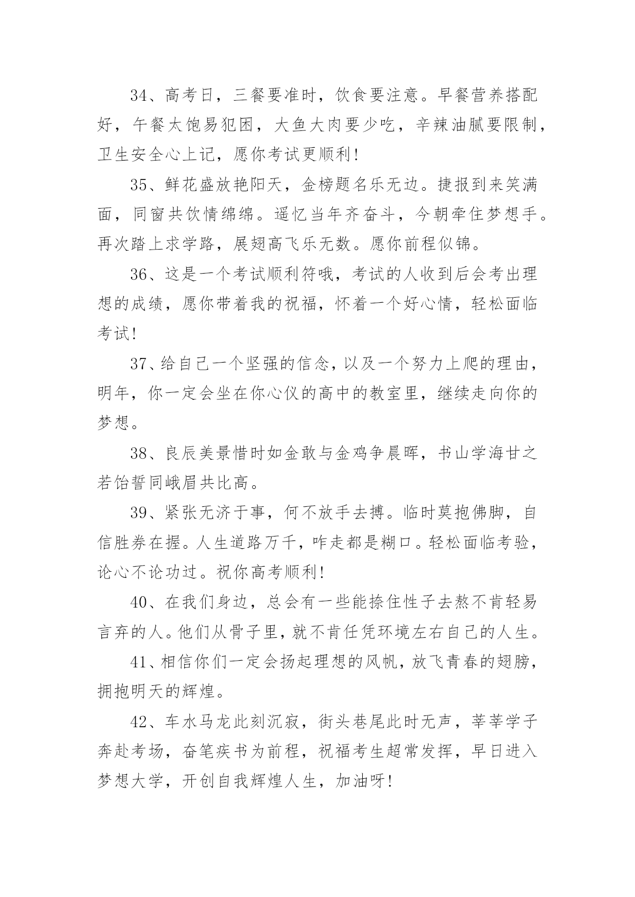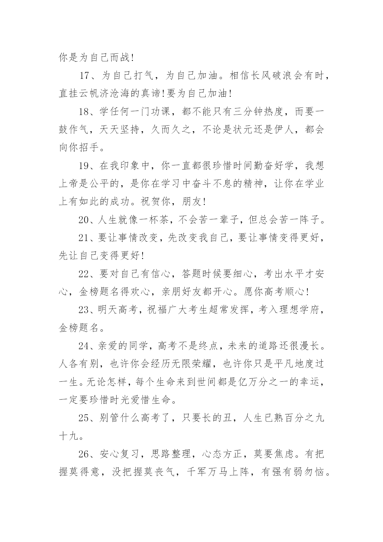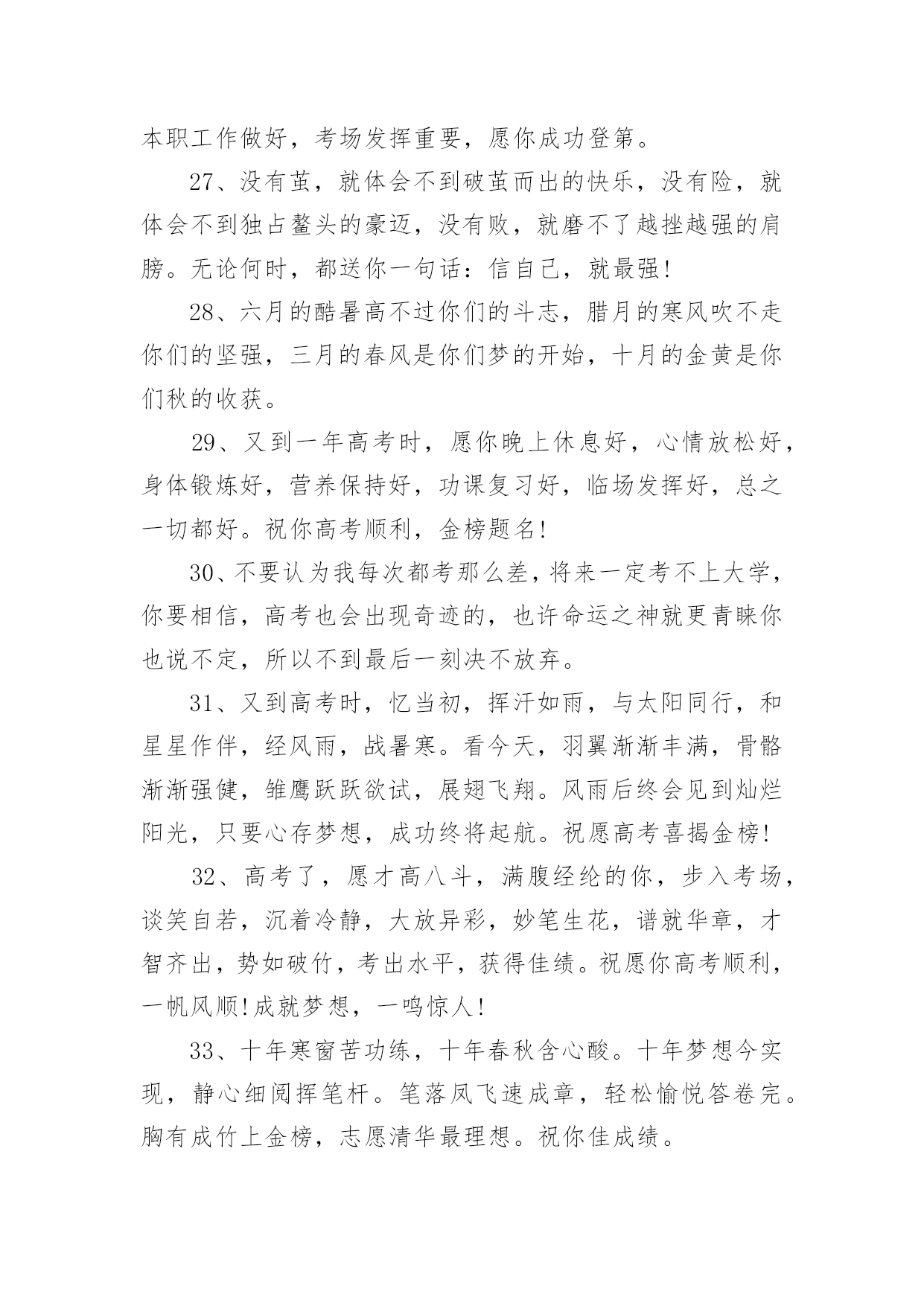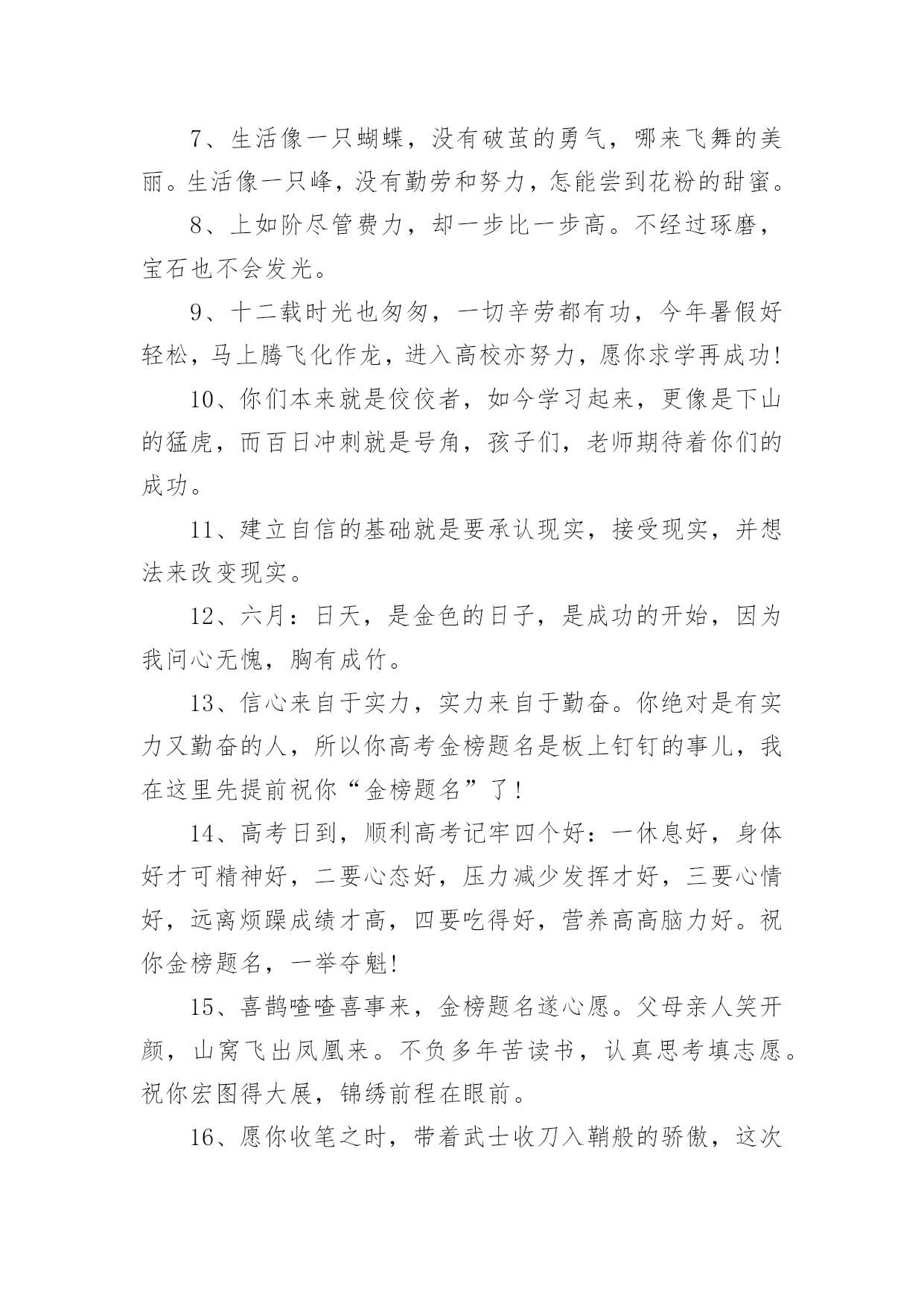 祝贺高考的祝福语在日常的学习、工作、生活中,大家都经常接触到祝福语吧,祝福语是指对人们的美好祝福的语句。那什么样的祝福语才算得上是好的祝福语呢?以下是小编为大家收集的祝贺高考的祝福语,欢迎阅读与收藏。1、孩子,请记住,除了父母,没有人有义务对你好,别人帮你,一定要心怀感恩,并且涌泉相报。别人不帮你,是他的本份,请不要怨恨。2、高考的意义是在于你真正投入的过程。请务必坚持信念,守得云开见月明!祝大家高考学子们成功!3、不要放弃奋斗,没有人会帮你一辈子,靠自己努力才最有保障。4、在坚持不懈的过程中,实在累了的时候,拿来读一读,看一看,又会有继续奋斗的动力。记住,再苦再累是自己选择的路,决不能放弃,更不能掉眼泪。只有毕业胜利的时候,眼泪才能留下。祝高考顺利。5、海阔凭鱼跃,天高任鸟飞,又到高考时,千万别紧张。放松心态,沉着应对,冷静分析,机智灵活,先易后难,用心答题,步步为营,心气平和,发挥才智,如鱼得水。愿各位学子高考步步顺利!6、每个人心中都有个梦,可能梦想千差万别,但只要是今天踏入考场的考生而言,他们向上的心却都是共同的。7、生活像一只蝴蝶,没有破茧的勇气,哪来飞舞的美丽。生活像一只峰,没有勤劳和努力,怎能尝到花粉的甜蜜。8、上如阶尽管费力,却一步比一步高。不经过琢磨,宝石也不会发光。9、十二载时光也匆匆,一切辛劳都有功,今年暑假好轻松,马上腾飞化作龙,进入高校亦努力,愿你求学再成功!10、你们本来就是佼佼者,如今学习起来,更像是下山的猛虎,而百日冲刺就是号角,孩子们,老师期待着你们的成功。11、建立自信的基础就是要承认现实,接受现实,并想法来改变现实。12、六月:日天,是金色的日子,是成功的开始,因为我问心无愧,胸有成竹。13、信心来自于实力,实力来自于勤奋。你绝对是有实力又勤奋的人,所以你高考金榜题名是板上钉钉的事儿,我在这里先提前祝你“金榜题名”了!14、高考日到,顺利高考记牢四个好:一休息好,身体好才可精神好,二要心态好,压力减少发挥才好,三要心情好,远离烦躁成绩才高,四要吃得好,营养高高脑力好。祝你金榜题名,一举夺魁!15、喜鹊喳喳喜事来,金榜题名遂心愿。父母亲人笑开颜,山窝飞出凤凰来。不负多年苦读书,认真思考填志愿。祝你宏图得大展,锦绣前程在眼前。16、愿你收笔之时,带着武士收刀入鞘般的骄傲,这次你是为自己而战!17、为自己打气,为自己加油。相信长风破浪会有时,直挂云帆济沧海的真谛!要为自己加油!18、学任何一门功课,都不能只有三分钟热度,而要一鼓作气,天天坚持,久而久之,不论是状元还是伊人,都会向你招手。19、在我印象中,你一直都很珍惜时间勤奋好学,我想上帝是公平的,是你在学习中奋斗不息的精神,让你在学业上有如此的成功。祝贺你,朋友!20、人生就像一杯茶,不会苦一辈子,但总会苦一阵子。21、要让事情改变,先改变我自己,要让事情变得更好,先让自己变得更好!22、要对自己有信心,答题时候要细心,考出水平才安心,金榜题名得欢心,亲朋好友都开心。愿你高考顺心!23、明天高考,祝福广大考生超常发挥,考入理想学府,金榜题名。24、亲爱的同学,高考不是终点,未来的道路还很漫长。人各有别,也许你会经历无限荣耀,也许你只是平凡地度过一生。无论怎样,每个生命来到世间都是亿万分之一的幸运,一定要珍惜时光爱惜生命。25、别管什么高考了,只要长的丑,人生已熟百分之九十九。26、安心复习,思路整理,心态方正,莫要焦虑。有把握莫得意,没把握莫丧气,千军万马上阵,有强有弱勿恼。本职工作做好,考场发挥重要,愿你成功登第。27、没有茧,就体会不到破茧而出的快乐,没有险,就体会不到独占鳌头的豪迈,没有败,就磨不了越挫越强的肩膀。无论何时,都送你一句话:信自己,就最强!28、六月的酷暑高不过你们的斗志,腊月的寒风吹不走你们的坚强,三月的春风是你们梦的开始,十月的金黄是你们秋的收获。29、又到一年高考时,愿你晚上休息好,心情放松好,身体锻炼好,营养保持好,功课复习好,临场发挥好,总之一切都好。祝你高考顺利,金榜题名!30、不要认为我每次都考那么差,将来一定考不上大学,你要相信,高考也会出现奇迹的,也许命运之神就更青睐你也说不定,所以不到最后一刻决不放弃。31、又到高考时,忆当初,挥汗如雨,与太阳同行,和星星作伴,经风雨,战暑寒。看今天,羽翼渐渐丰满,骨骼渐渐强健,雏鹰跃跃欲试,展翅飞翔。风雨后终会见到灿烂阳光,只要心存梦想,成功终将起航。祝愿高考喜揭金榜!32、高考了,愿才高八斗,满腹经纶的你,步入考场,谈笑自若,沉着冷静,大放异彩,妙笔生花,谱就华章,才智齐出,势如破竹,考出水平,获得佳绩。祝愿你高考顺利,一帆风顺!成就梦想,一鸣惊人!33、十年寒窗苦功练,十年春秋含心酸。十年梦想今实现,静心细阅挥笔杆。笔落凤飞速成章,轻松愉悦答卷完。胸有成竹上金