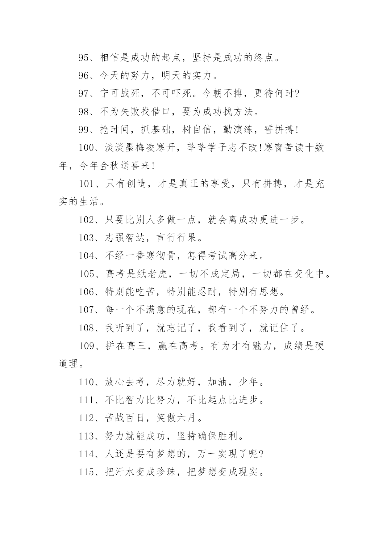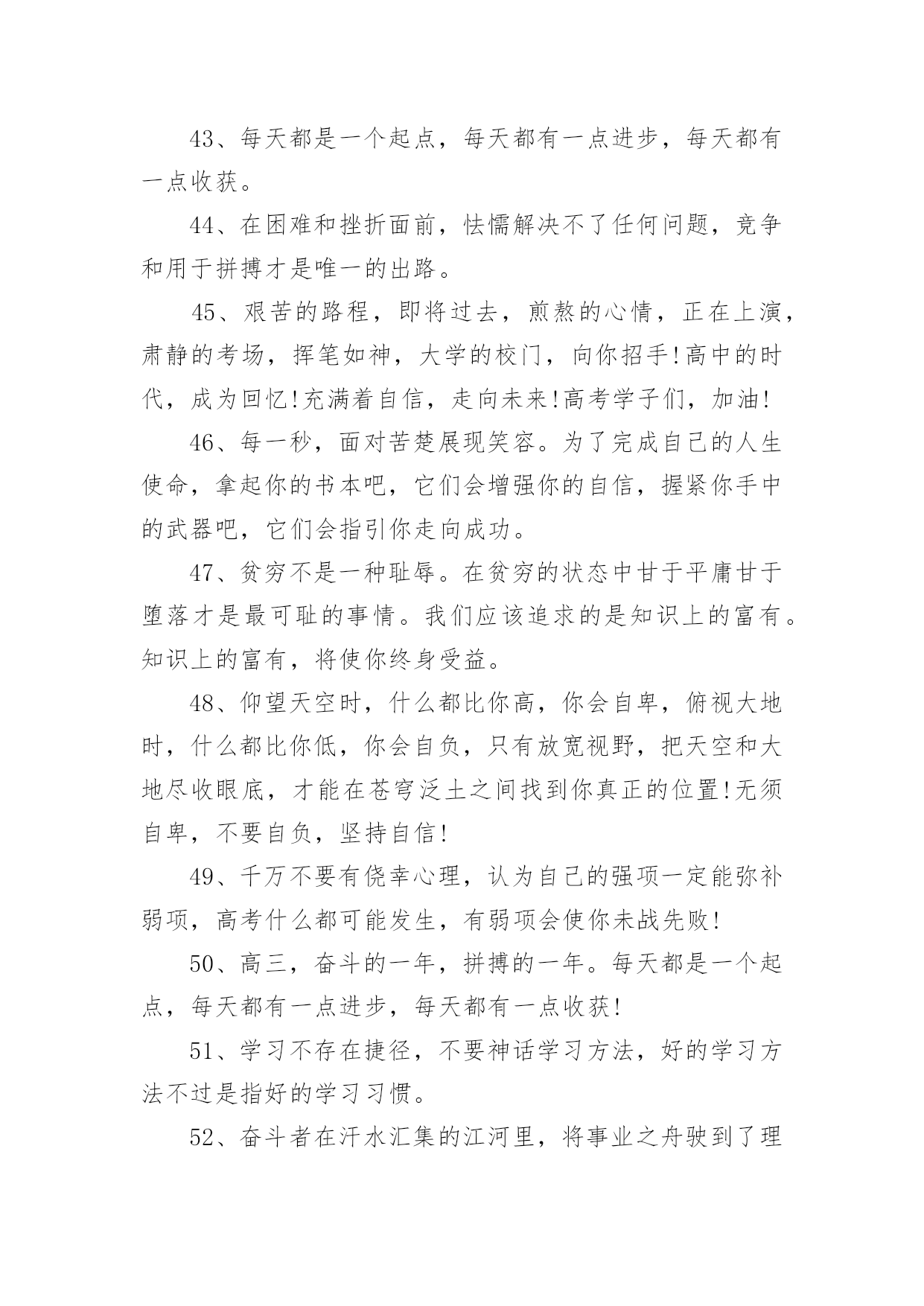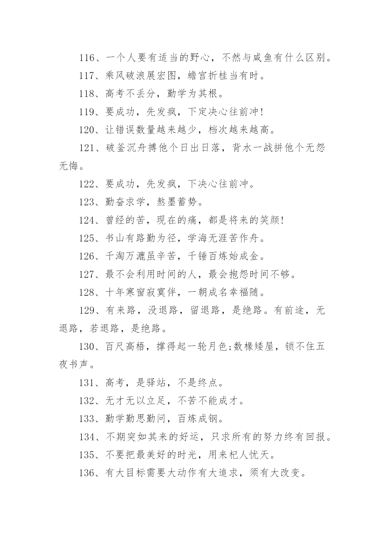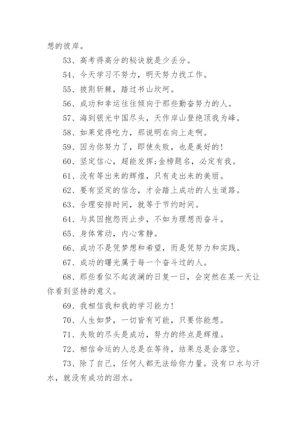 祝贺高考的祝福语在日常的学习、工作、生活中,大家都经常接触到祝福语吧,祝福语是指对人们的美好祝福的语句。那什么样的祝福语才算得上是好的祝福语呢?以下是小编为大家收集的祝贺高考的祝福语,欢迎阅读与收藏。1、孩子,请记住,除了父母,没有人有义务对你好,别人帮你,一定要心怀感恩,并且涌泉相报。别人不帮你,是他的本份,请不要怨恨。2、高考的意义是在于你真正投入的过程。请务必坚持信念,守得云开见月明!祝大家高考学子们成功!3、不要放弃奋斗,没有人会帮你一辈子,靠自己努力才最有保障。4、在坚持不懈的过程中,实在累了的时候,拿来读一读,看一看,又会有继续奋斗的动力。记住,再苦再累是自己选择的路,决不能放弃,更不能掉眼泪。只有毕业胜利的时候,眼泪才能留下。祝高考顺利。5、海阔凭鱼跃,天高任鸟飞,又到高考时,千万别紧张。放松心态,沉着应对,冷静分析,机智灵活,先易后难,用心答题,步步为营,心气平和,发挥才智,如鱼得水。愿各位学子高考步步顺利!6、每个人心中都有个梦,可能梦想千差万别,但只要是今天踏入考场的考生而言,他们向上的心却都是共同的。7、生活像一只蝴蝶,没有破茧的勇气,哪来飞舞的美丽。生活像一只峰,没有勤劳和努力,怎能尝到花粉的甜蜜。8、上如阶尽管费力,却一步比一步高。不经过琢磨,宝石也不会发光。9、十二载时光也匆匆,一切辛劳都有功,今年暑假好轻松,马上腾飞化作龙,进入高校亦努力,愿你求学再成功!10、你们本来就是佼佼者,如今学习起来,更像是下山的猛虎,而百日冲刺就是号角,孩子们,老师期待着你们的成功。11、建立自信的基础就是要承认现实,接受现实,并想法来改变现实。12、六月:日天,是金色的日子,是成功的开始,因为我问心无愧,胸有成竹。13、信心来自于实力,实力来自于勤奋。你绝对是有实力又勤奋的人,所以你高考金榜题名是板上钉钉的事儿,我在这里先提前祝你“金榜题名”了!14、高考日到,顺利高考记牢四个好:一休息好,身体好才可精神好,二要心态好,压力减少发挥才好,三要心情好,远离烦躁成绩才高,四要吃得好,营养高高脑力好。祝你金榜题名,一举夺魁!15、喜鹊喳喳喜事来,金榜题名遂心愿。父母亲人笑开颜,山窝飞出凤凰来。不负多年苦读书,认真思考填志愿。祝你宏图得大展,锦绣前程在眼前。16、愿你收笔之时,带着武士收刀入鞘般的骄傲,这次你是为自己而战!17、为自己打气,为自己加油。相信长风破浪会有时,直挂云帆济沧海的真谛!要为自己加油!18、学任何一门功课,都不能只有三分钟热度,而要一鼓作气,天天坚持,久而久之,不论是状元还是伊人,都会向你招手。19、在我印象中,你一直都很珍惜时间勤奋好学,我想上帝是公平的,是你在学习中奋斗不息的精神,让你在学业上有如此的成功。祝贺你,朋友!20、人生就像一杯茶,不会苦一辈子,但总会苦一阵子。21、要让事情改变,先改变我自己,要让事情变得更好,先让自己变得更好!22、要对自己有信心,答题时候要细心,考出水平才安心,金榜题名得欢心,亲朋好友都开心。愿你高考顺心!23、明天高考,祝福广大考生超常发挥,考入理想学府,金榜题名。24、亲爱的同学,高考不是终点,未来的道路还很漫长。人各有别,也许你会经历无限荣耀,也许你只是平凡地度过一生。无论怎样,每个生命来到世间都是亿万分之一的幸运,一定要珍惜时光爱惜生命。25、别管什么高考了,只要长的丑,人生已熟百分之九十九。26、安心复习,思路整理,心态方正,莫要焦虑。有把握莫得意,没把握莫丧气,千军万马上阵,有强有弱勿恼。本职工作做好,考场发挥重要,愿你成功登第。27、没有茧,就体会不到破茧而出的快乐,没有险,就体会不到独占鳌头的豪迈,没有败,就磨不了越挫越强的肩膀。无论何时,都送你一句话:信自己,就最强!28、六月的酷暑高不过你们的斗志,腊月的寒风吹不走你们的坚强,三月的春风是你们梦的开始,十月的金黄是你们秋的收获。29、又到一年高考时,愿你晚上休息好,心情放松好,身体锻炼好,营养保持好,功课复习好,临场发挥好,总之一切都好。祝你高考顺利,金榜题名!30、不要认为我每次都考那么差,将来一定考不上大学,你要相信,高考也会出现奇迹的,也许命运之神就更青睐你也说不定,所以不到最后一刻决不放弃。31、又到高考时,忆当初,挥汗如雨,与太阳同行,和星星作伴,经风雨,战暑寒。看今天,羽翼渐渐丰满,骨骼渐渐强健,雏鹰跃跃欲试,展翅飞翔。风雨后终会见到灿烂阳光,只要心存梦想,成功终将起航。祝愿高考喜揭金榜!32、高考了,愿才高八斗,满腹经纶的你,步入考场,谈笑自若,沉着冷静,大放异彩,妙笔生花,谱就华章,才智齐出,势如破竹,考出水平,获得佳绩。祝愿你高考顺利,一帆风顺!成就梦想,一鸣惊人!33、十年寒窗苦功练,十年春秋含心酸。十年梦想今实现,静心细阅挥笔杆。笔落凤飞速成章,轻松愉悦答卷完。胸有成竹上金
