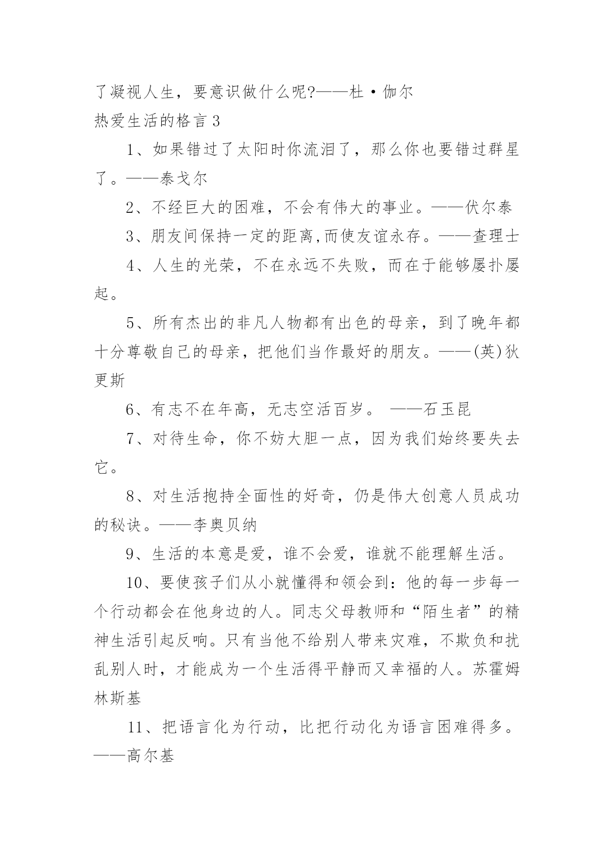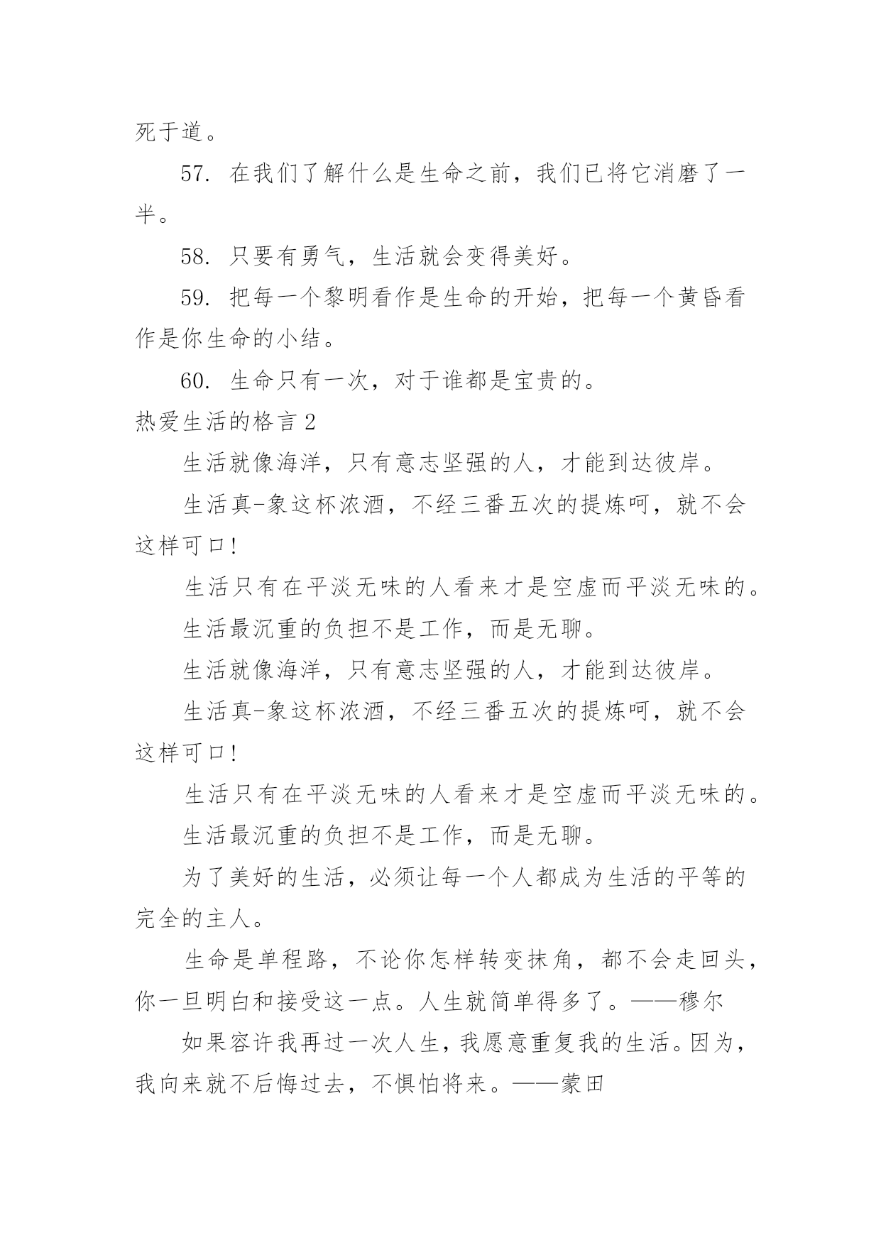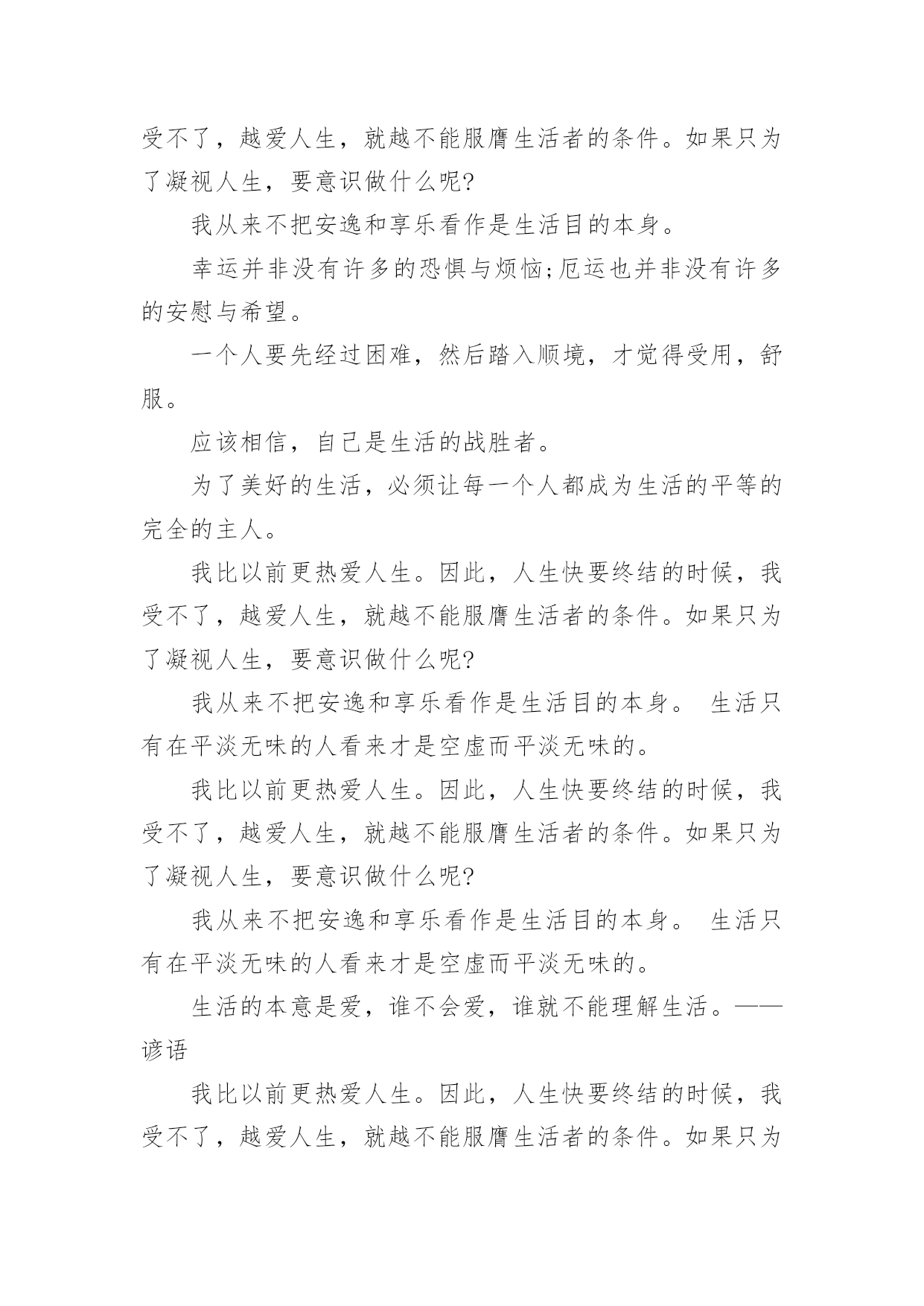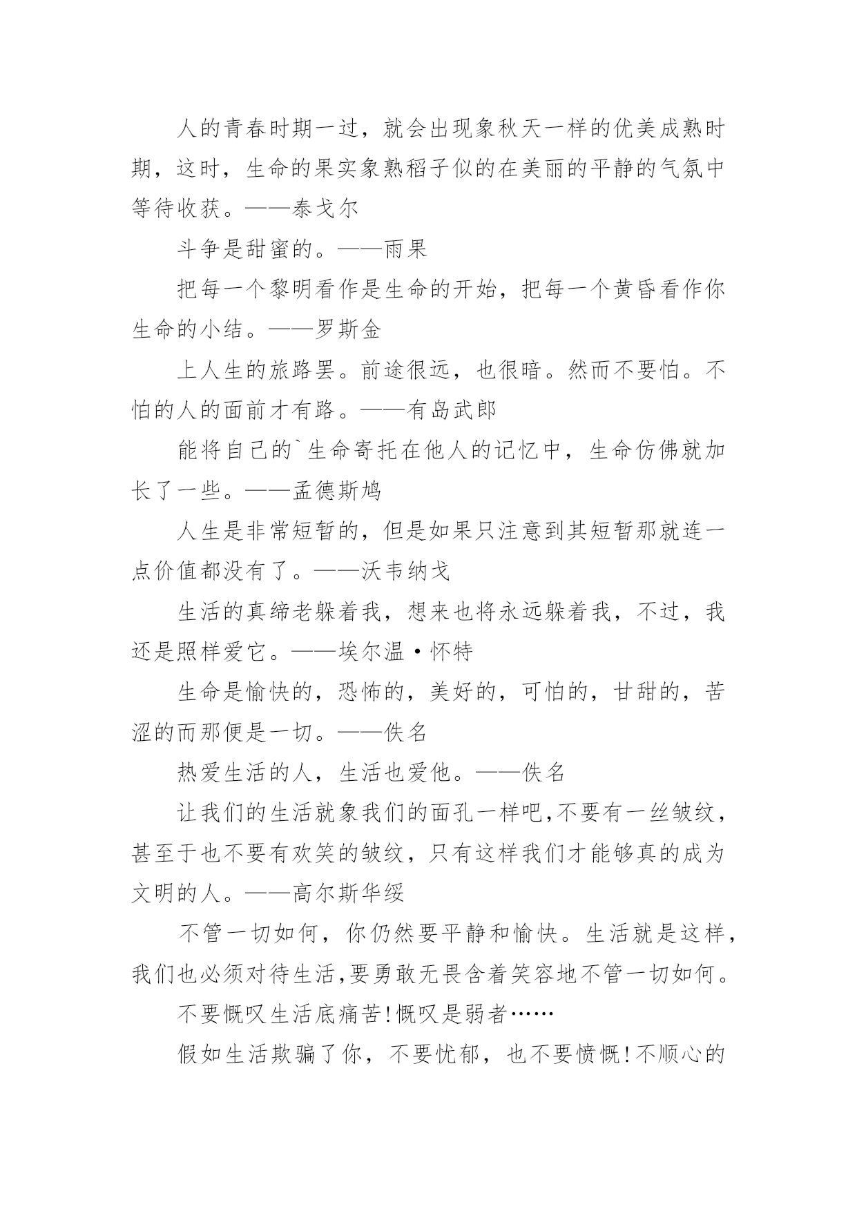 热爱生活的格言热爱生活的格言在日常学习、工作和生活中,说到格言,大家肯定都不陌生吧,格言又称箴言,可以作为人们行为规范的言简意赅的语句,是一个人机智之精华,众人汇成的睿智。那什么样的格言才具有启发意义呢?以下是小编帮大家整理的热爱生活的格言,供大家参考借鉴,希望可以帮助到有需要的朋友。热爱生活的格言11.尊重生命尊重他人也尊重自己的生命,是生命进程中的伴随物,也是心理健康的。2.尊重生命,完全尊重生命。3.今天就是生命——是惟一你能确知的生命。4.热爱生活的格言5.生活的智慧大概就在于遇事问个为什么。6.生活就是战斗。7.生活就像海洋,只有意志坚强的人,才能到达彼岸。8.生活真-象这杯浓酒,不经三番五次的提炼呵,就不会这样可口!9.生活只有在平淡无味的人看来才是空虚而平淡无味的。10.生活最沉重的负担不是工作,而是无聊。11.生命如同寓言,其价值不在与长短,而在与内容。——塞涅卡12.生命在闪光中现出绚烂,在平凡中现出真实。——伯克13.谁能以深刻的'内容充实每个瞬间,谁就是在无限地延长自己的生命。——库尔茨14.生命不可能有两次,但许多人连一次也不善于度过。——吕凯特15.命运就是对一个人的才能考验的偶然。——蓬皮杜16.聪明的人造就机会多与碰到机会。——培根17.平凡的人听从命运,只有强者才是自己的主宰。——维尼18.如果错过了太阳时你流泪了,那么你也要错过群星了。——泰戈尔19.一个人的性格决定他的机遇。如果你喜欢保持你的性格,那么,你就无权拒绝你的机遇。——罗曼.罗兰20.朋友需要你今天帮助,千万不要等到明天。——佚名21.桃花潭水深千尺,不及汪伦送我情。——李白22.和你一同笑过的人,你可能把他忘掉,但是和你一同哭过的人,你却永远不忘.。——纪伯伦23.谁要求没有缺点的朋友,谁就没有朋友!——谚语24.朋友间保持一定的距离,而使友谊永存。——查理士25.友情的纽带,或会因情绪激动而绷紧,但决不可折断.——林肯26.周围都有好朋友的人,比四面楚歌的人不知幸福多少。——卡内基夫人27.财富不是真正的朋友,而朋友却是真正的财富。28.近朱者赤,近墨者黑。——傅玄29.情深恭维少,知己笑谈多。——谚语30.独学而无友,则孤陋而寡闻。——孔子31.树直用处多,人直朋友多。——谚语32.怯懦的人,会把朋友送给刽子手。——罗曼·罗兰33.朋友看朋友是透明的,他们彼此交换着生?——罗曼·罗兰34.良言一句三冬暖,恶语伤人六月寒。——谚语35.酒逢知己千杯少,话不投机半句多。——谚语36.真正的朋友应该说真话,不管那话多么尖锐……——奥斯特洛夫斯基37.朋友间必须是患难相济,那才能说得上是真正的友谊.——莎士比亚38.世界上没有比友谊更美好,更令人愉快的东西了;没有友谊,世界仿佛失去了太阳.——西塞图39.与朋友交而不信。——《论语》40.信任一位虚伪的朋友,增加一个敌对的证人.——西班牙谚语41.什么是朋友?朋友就是你可以精诚相待的人——西塞图42.世间之活动,缺点虽多,但仍是美好的。43.视死若生者,烈士之勇也。44.我的一生始终保持着这样一个信念生命的意义在于付出,在于给予,而不是接受。45.我们的生命是天赋的,我们惟有献出生命,才能得到生命。46.我们既到世上走了一道,就得珍惜生命的价值。在某种意义上说,生要比死更难。47.我只有一次生命,而且它又相当短,我为什么在自己最不想做的事情上浪费我的生命。48.我总觉得,生命本身应该有一种意义,我们绝不是白白来一场的。49.喜爱人生的人绝不是失败者。50.应该笑着面对生活,不管一切如何。51.有生命,那里便有希望。52.不要以感伤的眼光去看过去,因为过去再也不会回来了,最聪明的办法,就是好好的把握现在。53.得其志,虽死犹生,不得其志,虽生犹死。54.懂得生命真谛的人,可以使督促的生命延长。55.有时我想,要是人们把活着的每一天都看作是生命的最后一天该有多好啊!56.鱼生于水,死于水;草木生于土,死于土;人生于道,死于道。57.在我们了解什么是生命之前,我们已将它消磨了一半。58.只要有勇气,生活就会变得美好。59.把每一个黎明看作是生命的开始,把每一个黄昏看作是你生命的小结。60.生命只有一次,对于谁都是宝贵的。热爱生活的格言2生活就像海洋,只有意志坚强的人,才能到达彼岸。生活真-象这杯浓酒,不经三番五次的提炼呵,就不会这样可口!生活只有在平淡无味的人看来才是空虚而平淡无味的。生活最沉重的负担不是工作,而是无聊。生活就像海洋,只有意志坚强的人,才能到达彼岸。生活真-象这杯浓酒,不经三番五次的提炼呵,就不会这样可口!生活只有在平淡无味的人看来才是空虚而平淡无味的。生活最沉重的负担不是工作,而是无聊。为了美好的生活,必须让每一个人都成为生活的平等的完全的主人。生命是单程路,不论你怎