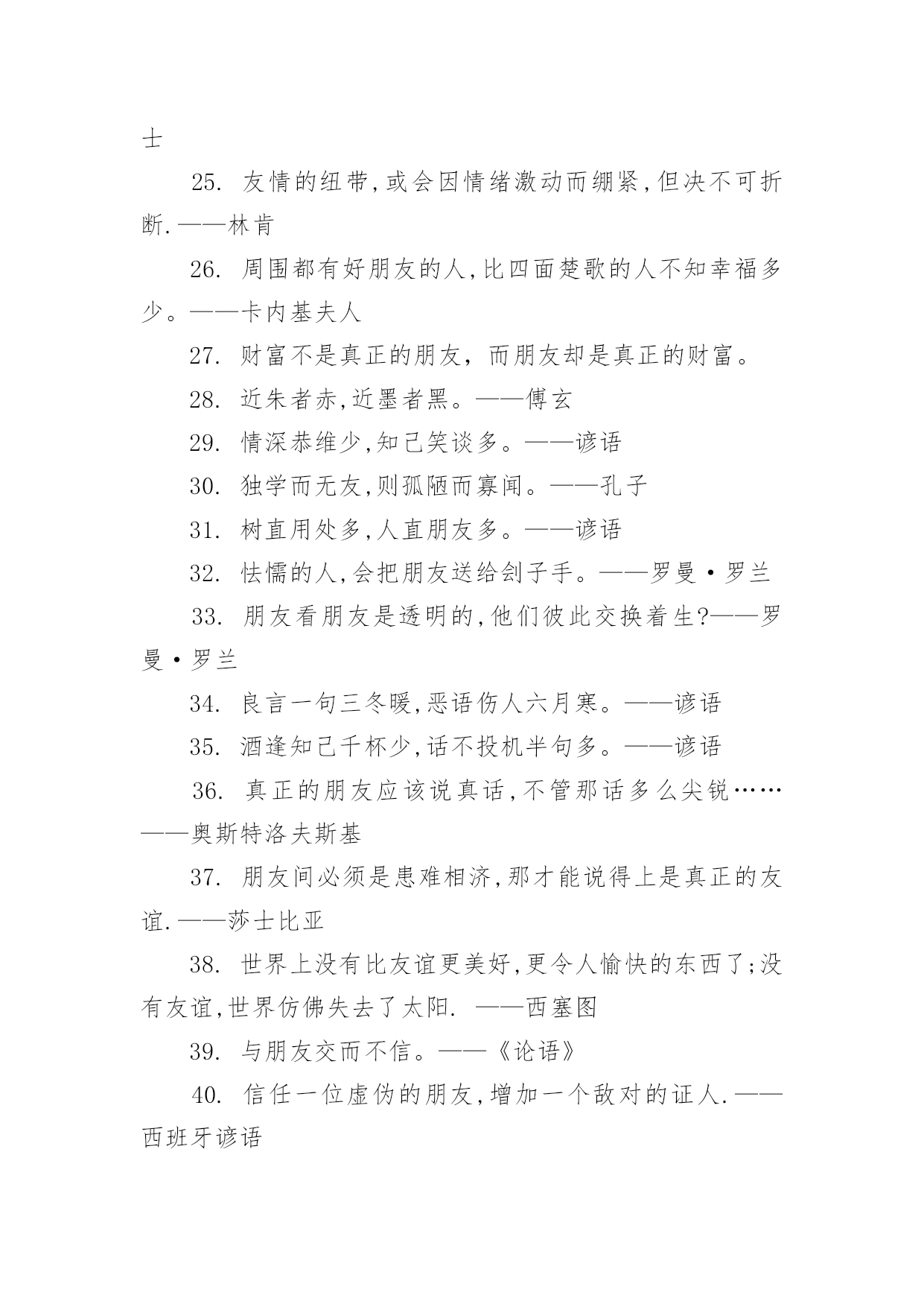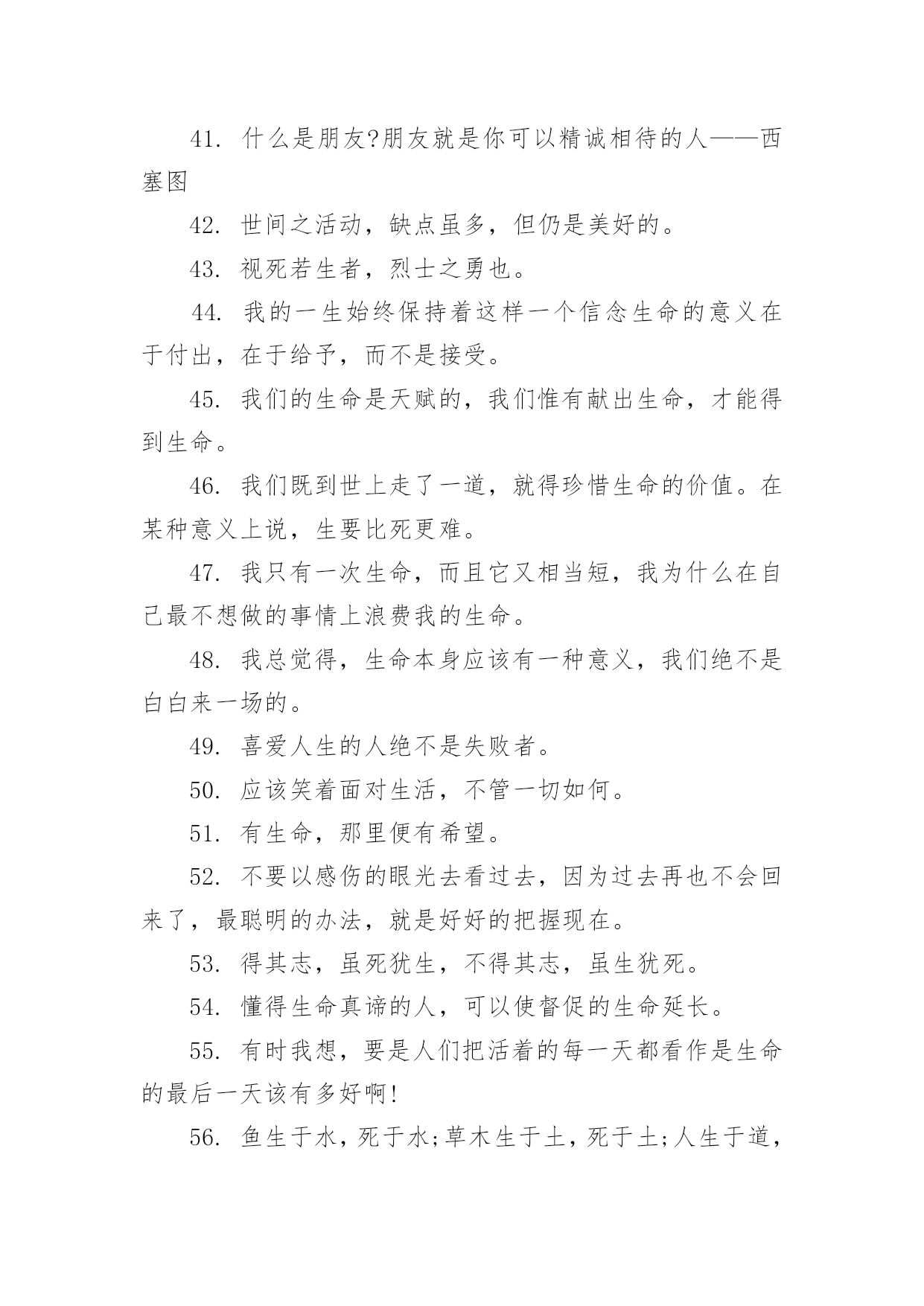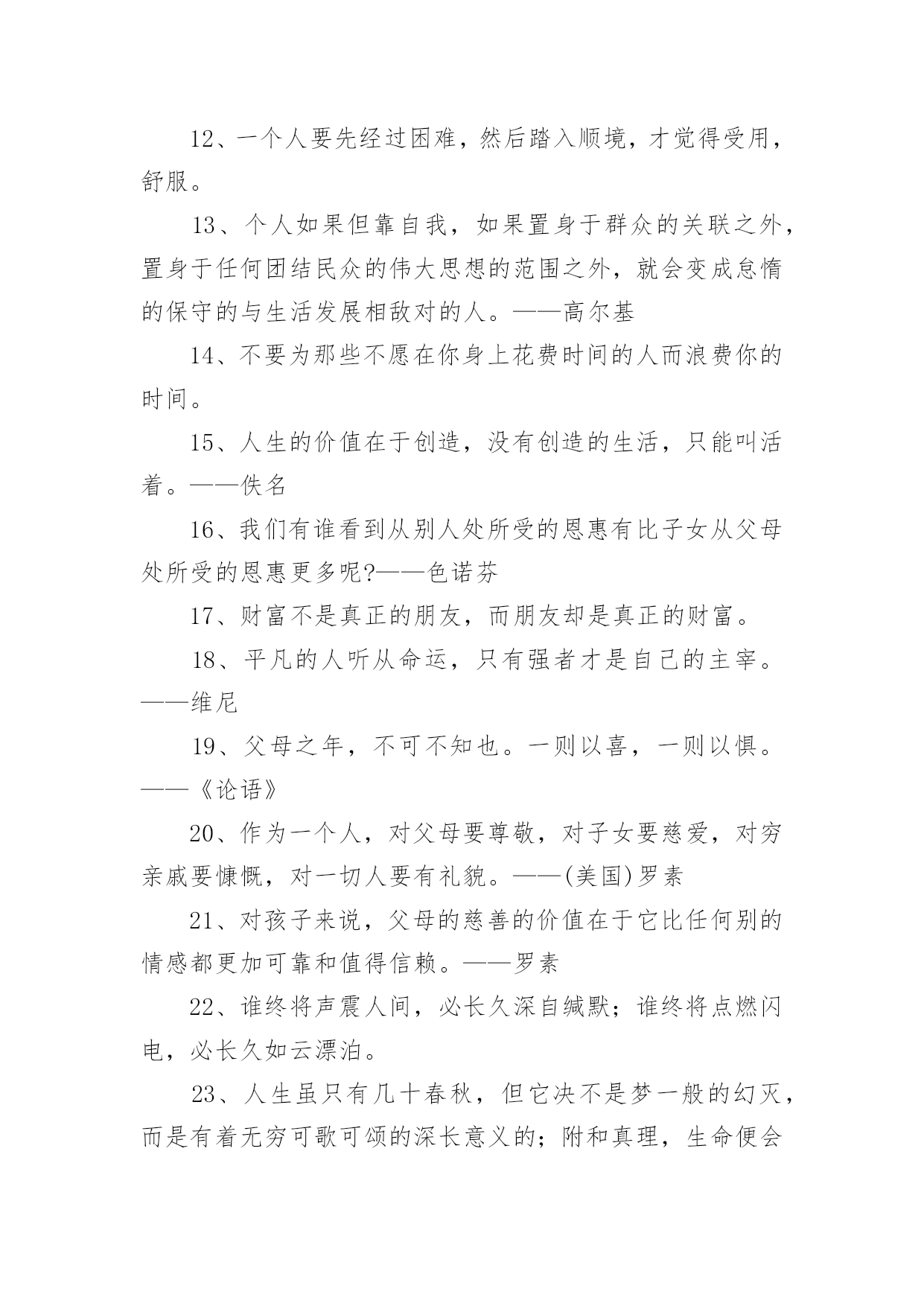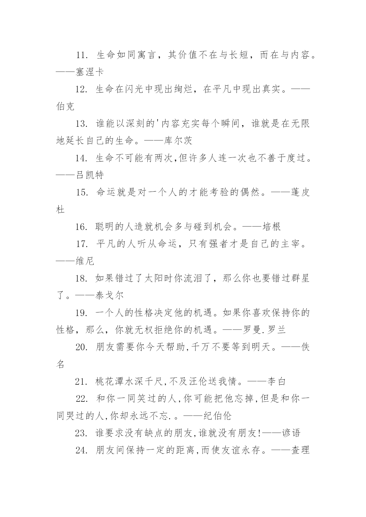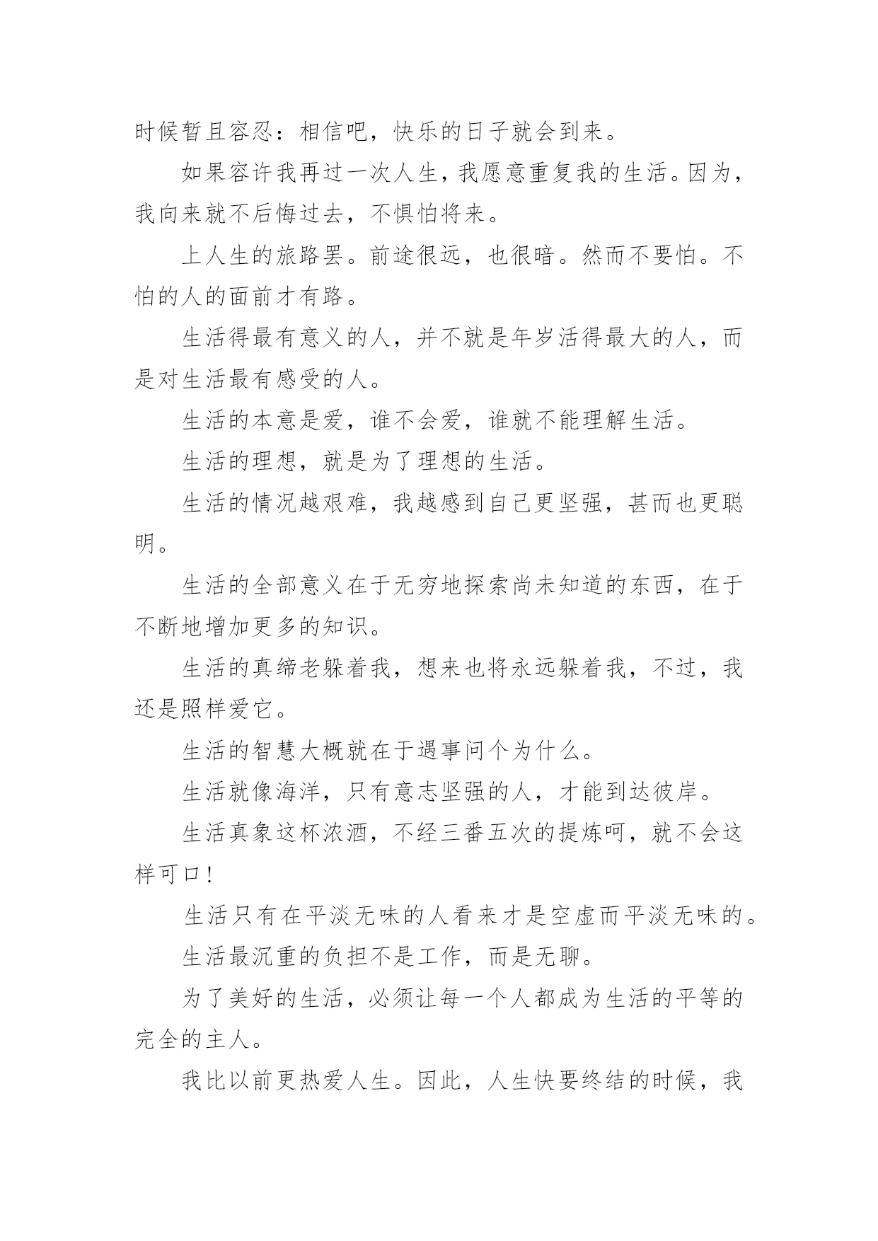 热爱生活的格言热爱生活的格言在日常学习、工作和生活中,说到格言,大家肯定都不陌生吧,格言又称箴言,可以作为人们行为规范的言简意赅的语句,是一个人机智之精华,众人汇成的睿智。那什么样的格言才具有启发意义呢?以下是小编帮大家整理的热爱生活的格言,供大家参考借鉴,希望可以帮助到有需要的朋友。热爱生活的格言11.尊重生命尊重他人也尊重自己的生命,是生命进程中的伴随物,也是心理健康的。2.尊重生命,完全尊重生命。3.今天就是生命——是惟一你能确知的生命。4.热爱生活的格言5.生活的智慧大概就在于遇事问个为什么。6.生活就是战斗。7.生活就像海洋,只有意志坚强的人,才能到达彼岸。8.生活真-象这杯浓酒,不经三番五次的提炼呵,就不会这样可口!9.生活只有在平淡无味的人看来才是空虚而平淡无味的。10.生活最沉重的负担不是工作,而是无聊。11.生命如同寓言,其价值不在与长短,而在与内容。——塞涅卡12.生命在闪光中现出绚烂,在平凡中现出真实。——伯克13.谁能以深刻的'内容充实每个瞬间,谁就是在无限地延长自己的生命。——库尔茨14.生命不可能有两次,但许多人连一次也不善于度过。——吕凯特15.命运就是对一个人的才能考验的偶然。——蓬皮杜16.聪明的人造就机会多与碰到机会。——培根17.平凡的人听从命运,只有强者才是自己的主宰。——维尼18.如果错过了太阳时你流泪了,那么你也要错过群星了。——泰戈尔19.一个人的性格决定他的机遇。如果你喜欢保持你的性格,那么,你就无权拒绝你的机遇。——罗曼.罗兰20.朋友需要你今天帮助,千万不要等到明天。——佚名21.桃花潭水深千尺,不及汪伦送我情。——李白22.和你一同笑过的人,你可能把他忘掉,但是和你一同哭过的人,你却永远不忘.。——纪伯伦23.谁要求没有缺点的朋友,谁就没有朋友!——谚语24.朋友间保持一定的距离,而使友谊永存。——查理士25.友情的纽带,或会因情绪激动而绷紧,但决不可折断.——林肯26.周围都有好朋友的人,比四面楚歌的人不知幸福多少。——卡内基夫人27.财富不是真正的朋友,而朋友却是真正的财富。28.近朱者赤,近墨者黑。——傅玄29.情深恭维少,知己笑谈多。——谚语30.独学而无友,则孤陋而寡闻。——孔子31.树直用处多,人直朋友多。——谚语32.怯懦的人,会把朋友送给刽子手。——罗曼·罗兰33.朋友看朋友是透明的,他们彼此交换着生?——罗曼·罗兰34.良言一句三冬暖,恶语伤人六月寒。——谚语35.酒逢知己千杯少,话不投机半句多。——谚语36.真正的朋友应该说真话,不管那话多么尖锐……——奥斯特洛夫斯基37.朋友间必须是患难相济,那才能说得上是真正的友谊.——莎士比亚38.世界上没有比友谊更美好,更令人愉快的东西了;没有友谊,世界仿佛失去了太阳.——西塞图39.与朋友交而不信。——《论语》40.信任一位虚伪的朋友,增加一个敌对的证人.——西班牙谚语41.什么是朋友?朋友就是你可以精诚相待的人——西塞图42.世间之活动,缺点虽多,但仍是美好的。43.视死若生者,烈士之勇也。44.我的一生始终保持着这样一个信念生命的意义在于付出,在于给予,而不是接受。45.我们的生命是天赋的,我们惟有献出生命,才能得到生命。46.我们既到世上走了一道,就得珍惜生命的价值。在某种意义上说,生要比死更难。47.我只有一次生命,而且它又相当短,我为什么在自己最不想做的事情上浪费我的生命。48.我总觉得,生命本身应该有一种意义,我们绝不是白白来一场的。49.喜爱人生的人绝不是失败者。50.应该笑着面对生活,不管一切如何。51.有生命,那里便有希望。52.不要以感伤的眼光去看过去,因为过去再也不会回来了,最聪明的办法,就是好好的把握现在。53.得其志,虽死犹生,不得其志,虽生犹死。54.懂得生命真谛的人,可以使督促的生命延长。55.有时我想,要是人们把活着的每一天都看作是生命的最后一天该有多好啊!56.鱼生于水,死于水;草木生于土,死于土;人生于道,死于道。57.在我们了解什么是生命之前,我们已将它消磨了一半。58.只要有勇气,生活就会变得美好。59.把每一个黎明看作是生命的开始,把每一个黄昏看作是你生命的小结。60.生命只有一次,对于谁都是宝贵的。热爱生活的格言2生活就像海洋,只有意志坚强的人,才能到达彼岸。生活真-象这杯浓酒,不经三番五次的提炼呵,就不会这样可口!生活只有在平淡无味的人看来才是空虚而平淡无味的。生活最沉重的负担不是工作,而是无聊。生活就像海洋,只有意志坚强的人,才能到达彼岸。生活真-象这杯浓酒,不经三番五次的提炼呵,就不会这样可口!生活只有在平淡无味的人看来才是空虚而平淡无味的。生活最沉重的负担不是工作,而是无聊。为了美好的生活,必须让每一个人都成为生活的平等的完全的主人。生命是单程路,不论你怎