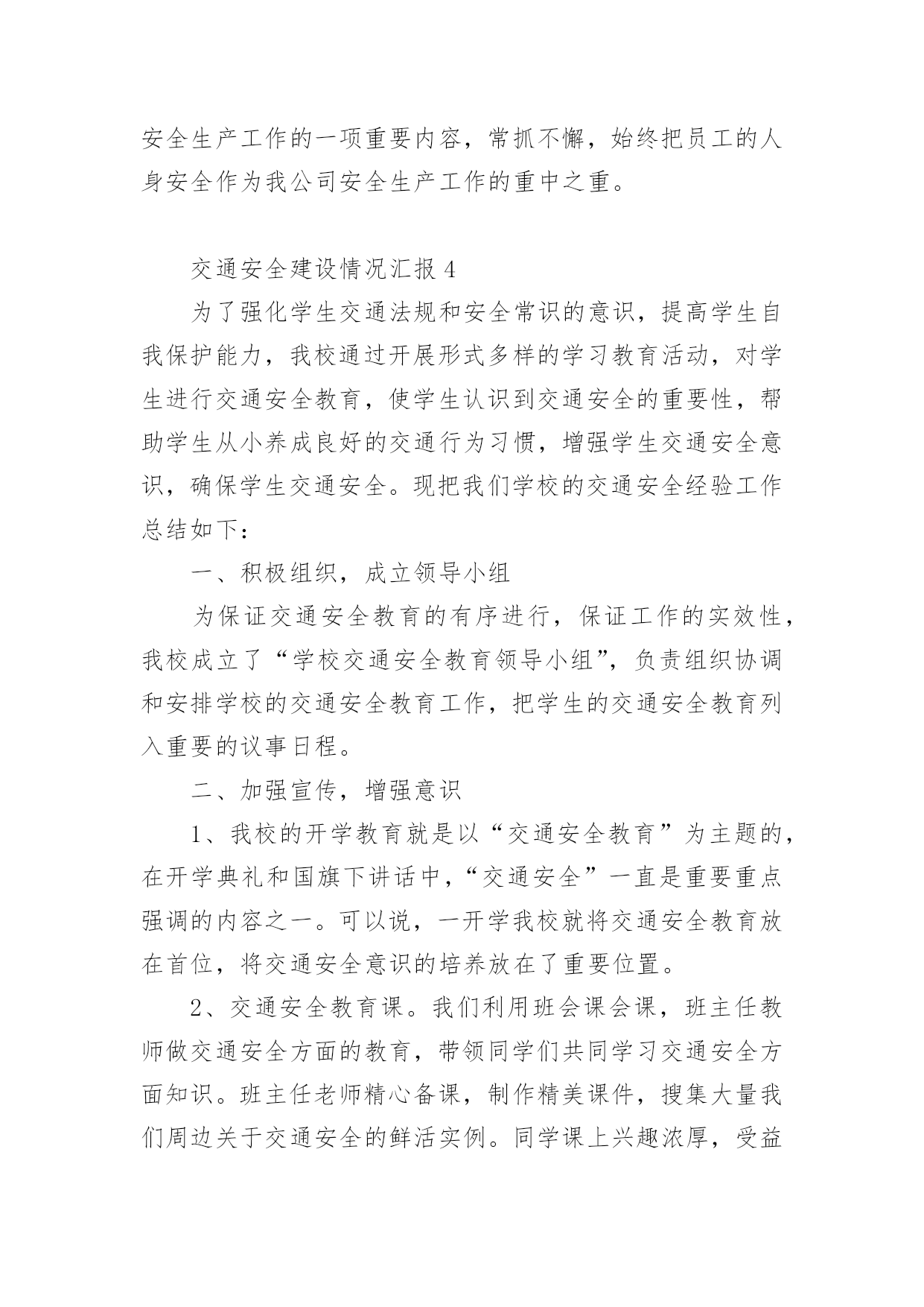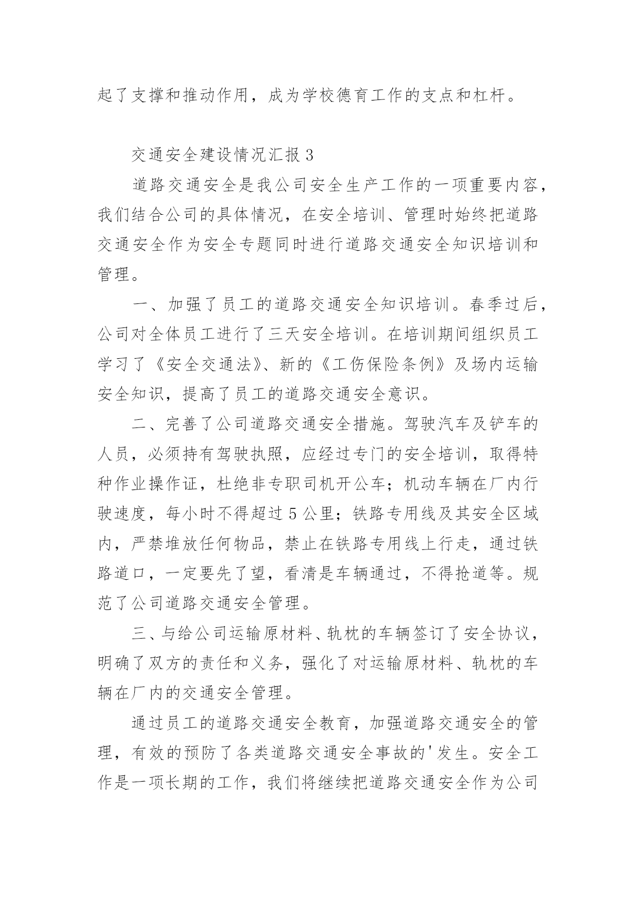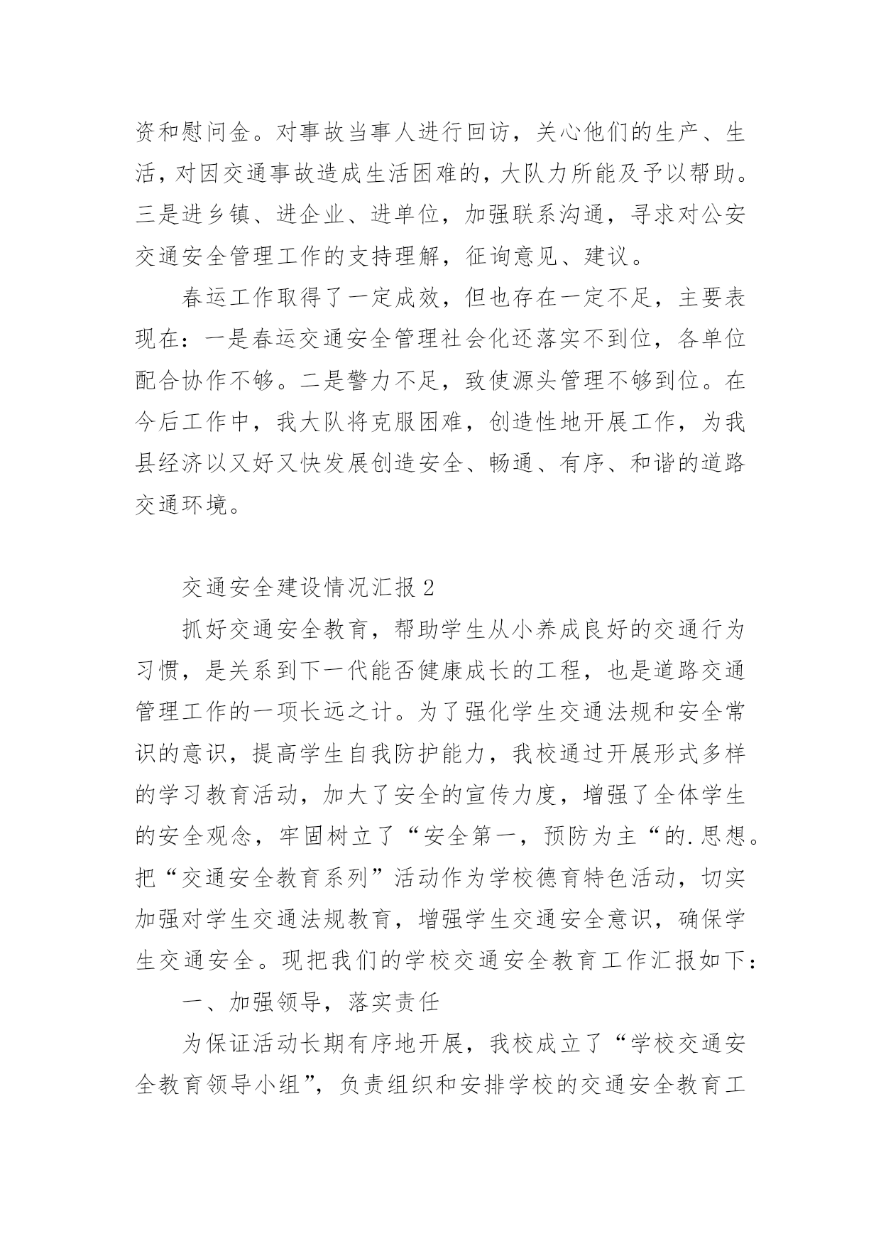 交通安全建设情况汇报交通安全建设情况汇报(通用6篇)在现实的学习、工作中,需要汇报的场景越来越多,汇报的主要内容有工作摘要、内容、花费时间、对应任务、完成情况、总结等,为了帮助大家更好的完成汇报,下面是小编帮大家整理的交通安全建设情况汇报(通用6篇),欢迎大家分享。交通安全建设情况汇报1一、加强组织领导,周密安排部署为确保春运工作开展有效、有序。我县成立了由县人民政府李鸣副县长为组长的春运工作领导小组。制订了《20xx年全县春运道路交通安全管理工作方案》,并由县人民政府印发下发到各乡镇、场及各单位。1月8日,召开了全县春运工作动员会,就春运工作进行动员部署,县人民政府与各乡镇场及运输企业签订了春运交通安全工作责任书。期间,县委常委、公安局长晏秋林、县人民政府李鸣副县长等领导还多次听取春运工作专题汇报,并要求全体参战人员尽职尽责,全力以赴保安全畅通。同时,加大对春运工作的检查督促力度,确保春运各项工作措施的落实。一方面,省交警总队、市交警支队督导组多次深入我县检查、指导春运工作,及时发现问题,及时帮助解决。另一方面,大队领导深入一线,靠前指挥,强化检查督促,狠抓工作落实。二、强化源头管理,消除安全隐患为隐患于末然,我大队从源头入手,严格管理。一是严格排查道路交通安全隐患。会同公路、安监部门对全县通行客车的公路进行拉网式排查。对排查出的安全隐患点段,及时向公路部门提出整改意见,并书面报告县人民政府。交通、公路部门认真履责立即落实整改,对三级以下山区公路设置了夜间禁止客车通行的禁令标志,在县、乡道路弯急坡陡、临崖傍水处设置警示、警告标志牌近百块。二是严格客运车辆及校车的管理。会同运管、教育部门对客运车辆及校车进行排查,落实安全责任,对车辆安全检验及维修实行“谁检验、谁签字、谁负责”的责任制,凡安全技术性能不符合国家标准规定的,一律不得参加春运,不得作为“校车”装运学生幼儿。三是严格客运车辆驾驶人管理。对客运车辆及集中接送学生车辆的驾驶人进行资格审查,严禁不符合资质条件的人驾驶客运车辆及校车。同时,大队与客运车辆驾驶人签订春运安全责任书,并组织他们进行交通安全集中学习教育,要求他们遵章守法,安全行驶。四是严格低速货车、拖拉机等非营运车辆管理。督促低速货车、拖拉机安装防护装置,粘贴反光标识。并按照属地管理原则,各乡镇场对辖区内的低速货车、拖拉机进行登记造册,并安排专人进行看管,坚决杜绝其载客营运、超载等违法行为。五是严格客运企业管理。要求客运企业认真落实安全制度,看好自己的车,作到病车不上路;管好自己的.人,做到身体不适的人不上车驾驶;把好自家的门,做到超员、人货混装等违法车辆不出站。三、强化巡逻管控,保障安全畅通针对春运期间人、车流量急剧增加,我大队科学安排勤务,严格路面管控。期间,共出动警力1120余人次,检查车辆四千余辆次,查纠交通违法行为400余起。一是实行警力下沉。春运期间,大队一律取消休息,除机关必要留守人员外,其余警力全部充实到到路面,并将巡逻车、测速仪、酒精仪等装备全部投入到路面,增加巡逻频度,同时,提高民警的管事率。二是强化重点路段管控,对铜棋线、密西线等危险路段,省道修铜线、上铁线及城区道路加大巡查力度,及时查纠超员、超速、酒后驾驶等违法行为。三是加强恶劣天气下的交通安全管控。加强与气象部门的联系沟通,及时掌握天气状况,遇大雾、冰雪天气,通过短信信息平台、新闻媒体等,及时发布路况和交通信息,增派警力进行巡逻,并通过车载显示屏、喊话、放置警示牌等形式进行安全提醒。对冰冻路面、雾大能见度低路段,必要时进行封闭,派民严防死守,确保万无一失。四是严格春运检查站的管控。排埠省际春运服务站和带溪市际春运服务站,做到人员到位,责任到位,服务到位,检查到位,对七座以上客车逢车必检查必登记必进行温馨提示。与此同时,针对春运交通安全违法特点,我大队集中警力、集中时间,先后开展摩托车集中整治,三反(反超员、反超速、反酒后驾驶)专项整治及城区秩序整治三个专项行动。共查扣摩托车三百余辆,查处客车超员6起,卸客转运76余人次,无证驾驶摩托车、客车超员超速等严重违法行为的高发态势得到遏制,城区交通拥、堵、乱问题得以缓解。四、加强教育宣传,营造春运氛围围绕“春运”主题,大张旗鼓地进行宣传教育。一是充分利用铜鼓电视台、铜鼓报及网络等新闻媒体,刊播公益广告,宣传交通安全法规,反映春运工作动态,曝光违法行为。二是充分利用移动短信平台、车载显示屏进行交通安全温馨提示。期间,共编发短信三万余条。三是在省道、县道、人车流量大路段及各集镇悬挂宣传横幅20余条,在办证大厅、铜鼓汽车站播放宣传片。元月1日,还在人口密集的西湖广场设置了彩虹门,摆放宣传展板60块,散发宣传单1000余份,发放《道路交通安全知识漫画读本》及《XX省实施〈中华人民共和国道路交通安全法〉