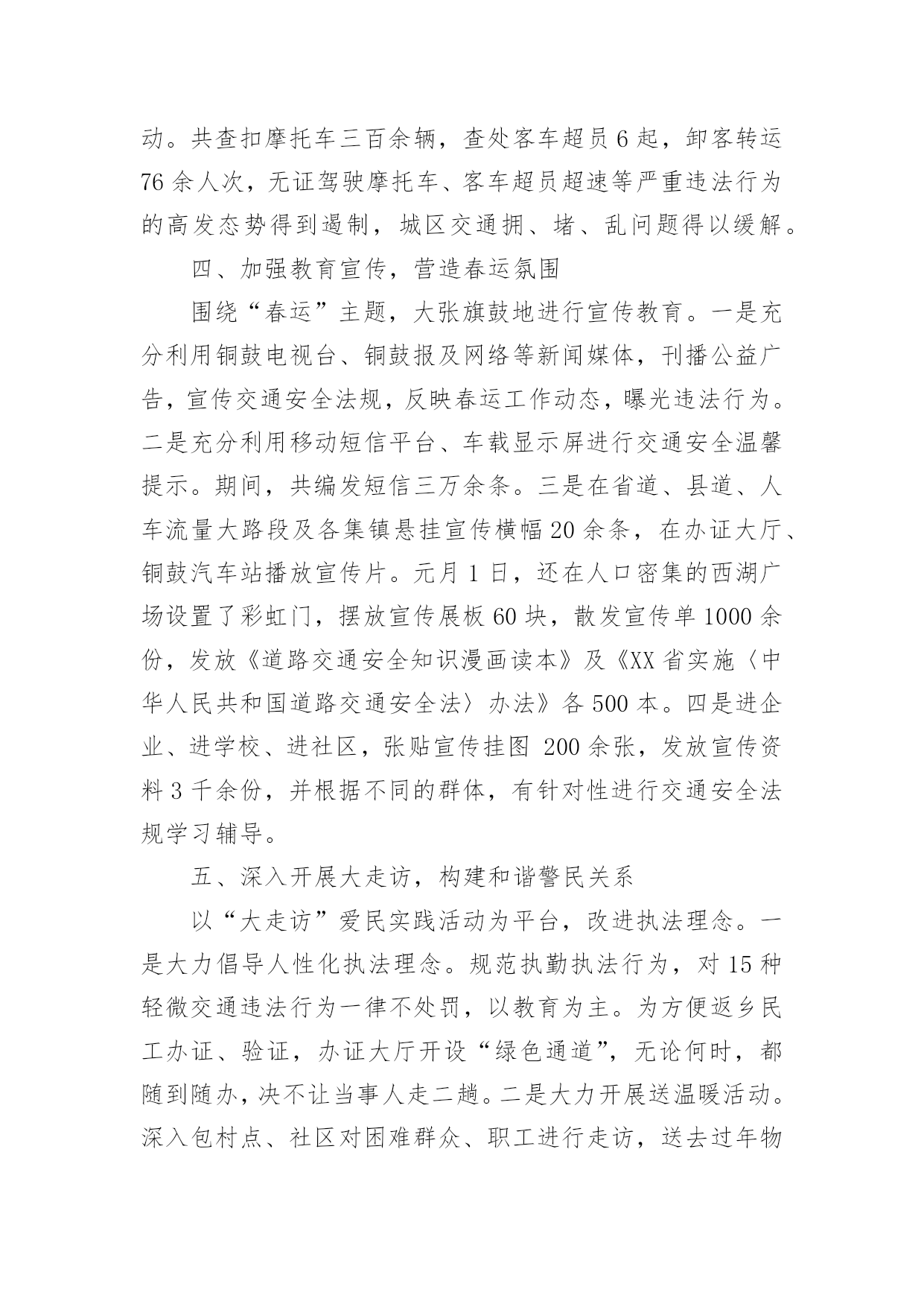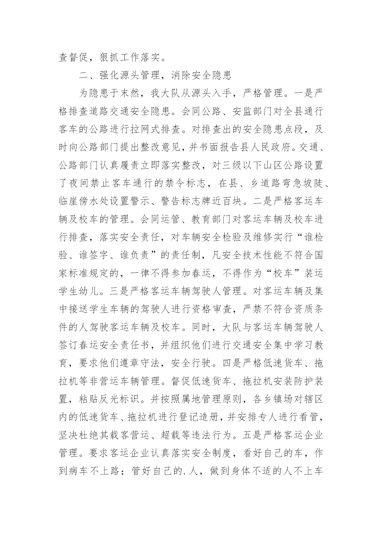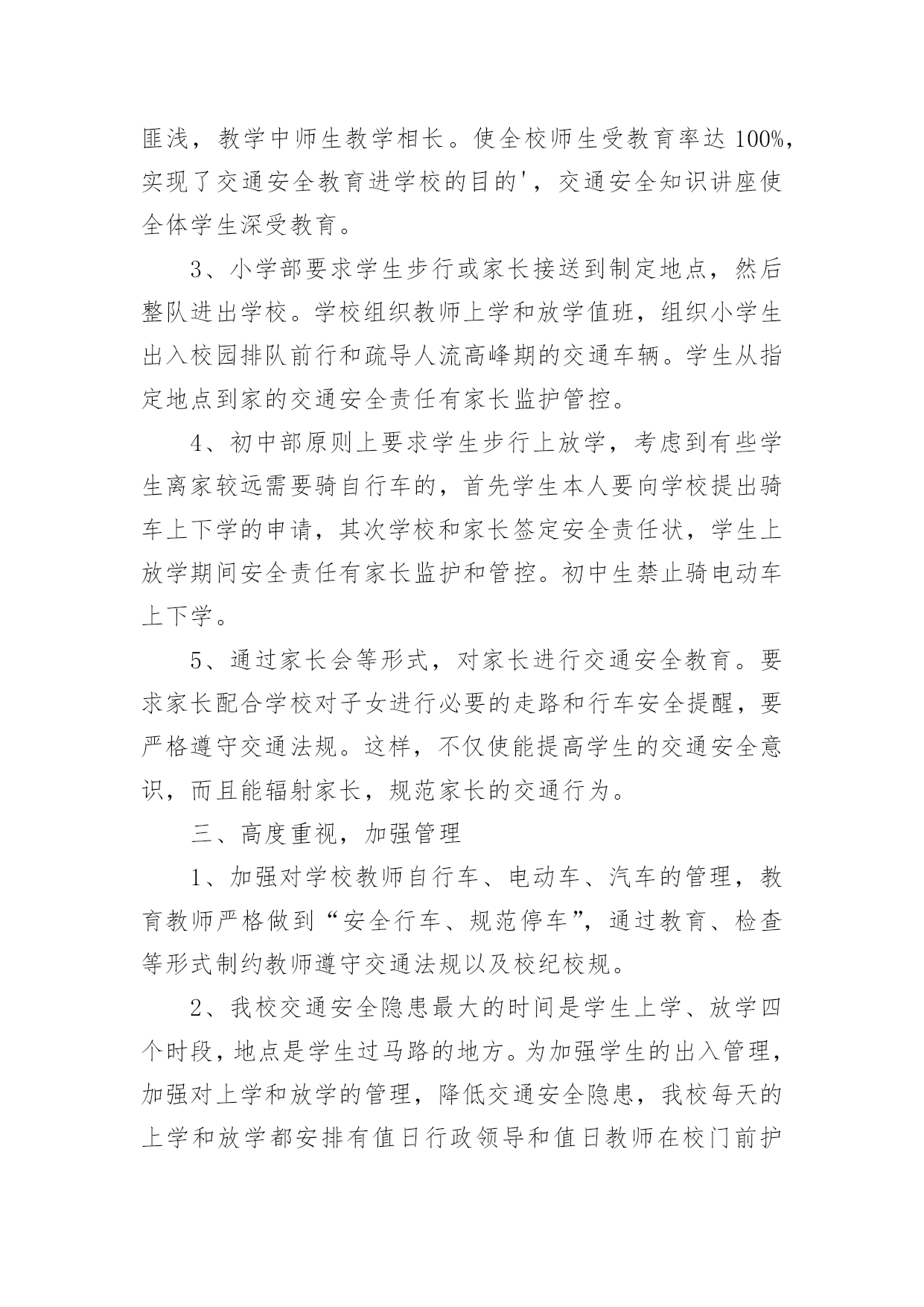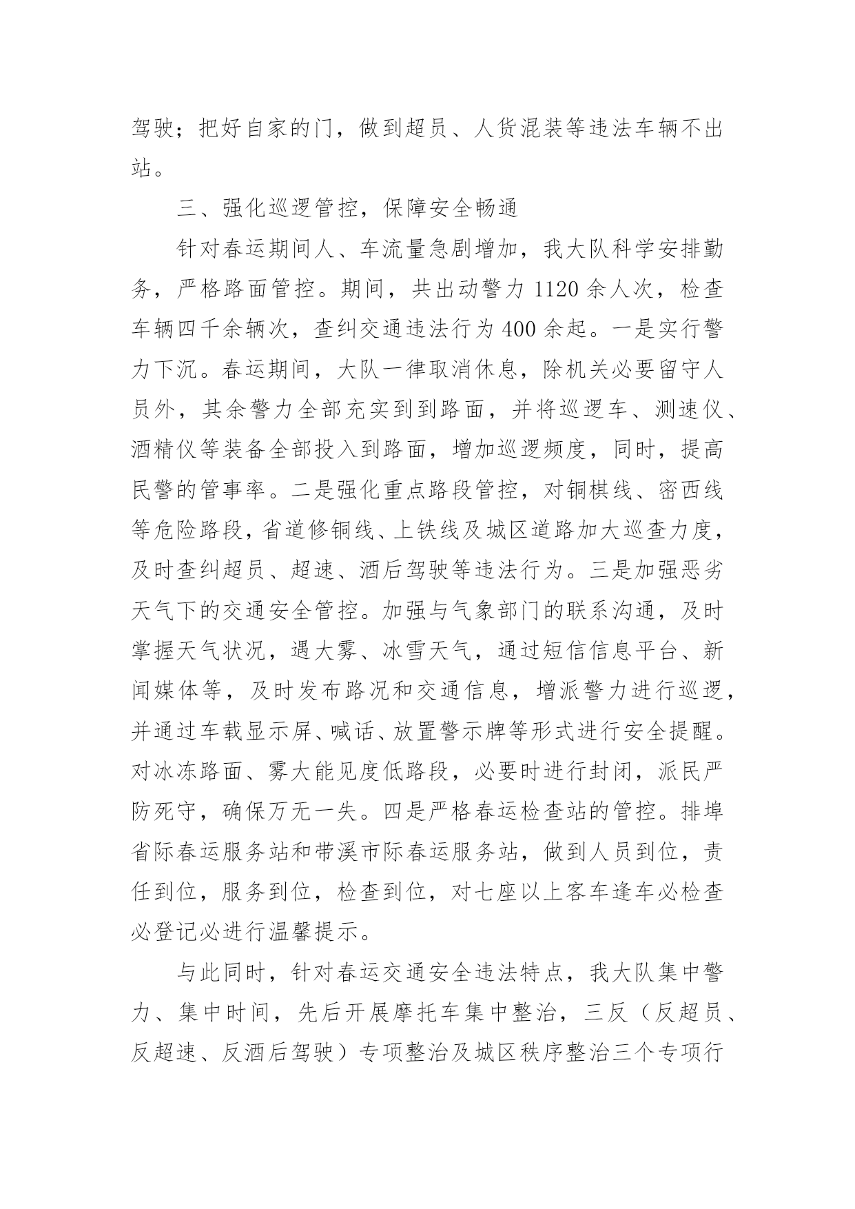 交通安全建设情况汇报交通安全建设情况汇报(通用6篇)在现实的学习、工作中,需要汇报的场景越来越多,汇报的主要内容有工作摘要、内容、花费时间、对应任务、完成情况、总结等,为了帮助大家更好的完成汇报,下面是小编帮大家整理的交通安全建设情况汇报(通用6篇),欢迎大家分享。交通安全建设情况汇报1一、加强组织领导,周密安排部署为确保春运工作开展有效、有序。我县成立了由县人民政府李鸣副县长为组长的春运工作领导小组。制订了《20xx年全县春运道路交通安全管理工作方案》,并由县人民政府印发下发到各乡镇、场及各单位。1月8日,召开了全县春运工作动员会,就春运工作进行动员部署,县人民政府与各乡镇场及运输企业签订了春运交通安全工作责任书。期间,县委常委、公安局长晏秋林、县人民政府李鸣副县长等领导还多次听取春运工作专题汇报,并要求全体参战人员尽职尽责,全力以赴保安全畅通。同时,加大对春运工作的检查督促力度,确保春运各项工作措施的落实。一方面,省交警总队、市交警支队督导组多次深入我县检查、指导春运工作,及时发现问题,及时帮助解决。另一方面,大队领导深入一线,靠前指挥,强化检查督促,狠抓工作落实。二、强化源头管理,消除安全隐患为隐患于末然,我大队从源头入手,严格管理。一是严格排查道路交通安全隐患。会同公路、安监部门对全县通行客车的公路进行拉网式排查。对排查出的安全隐患点段,及时向公路部门提出整改意见,并书面报告县人民政府。交通、公路部门认真履责立即落实整改,对三级以下山区公路设置了夜间禁止客车通行的禁令标志,在县、乡道路弯急坡陡、临崖傍水处设置警示、警告标志牌近百块。二是严格客运车辆及校车的管理。会同运管、教育部门对客运车辆及校车进行排查,落实安全责任,对车辆安全检验及维修实行“谁检验、谁签字、谁负责”的责任制,凡安全技术性能不符合国家标准规定的,一律不得参加春运,不得作为“校车”装运学生幼儿。三是严格客运车辆驾驶人管理。对客运车辆及集中接送学生车辆的驾驶人进行资格审查,严禁不符合资质条件的人驾驶客运车辆及校车。同时,大队与客运车辆驾驶人签订春运安全责任书,并组织他们进行交通安全集中学习教育,要求他们遵章守法,安全行驶。四是严格低速货车、拖拉机等非营运车辆管理。督促低速货车、拖拉机安装防护装置,粘贴反光标识。并按照属地管理原则,各乡镇场对辖区内的低速货车、拖拉机进行登记造册,并安排专人进行看管,坚决杜绝其载客营运、超载等违法行为。五是严格客运企业管理。要求客运企业认真落实安全制度,看好自己的车,作到病车不上路;管好自己的.人,做到身体不适的人不上车驾驶;把好自家的门,做到超员、人货混装等违法车辆不出站。三、强化巡逻管控,保障安全畅通针对春运期间人、车流量急剧增加,我大队科学安排勤务,严格路面管控。期间,共出动警力1120余人次,检查车辆四千余辆次,查纠交通违法行为400余起。一是实行警力下沉。春运期间,大队一律取消休息,除机关必要留守人员外,其余警力全部充实到到路面,并将巡逻车、测速仪、酒精仪等装备全部投入到路面,增加巡逻频度,同时,提高民警的管事率。二是强化重点路段管控,对铜棋线、密西线等危险路段,省道修铜线、上铁线及城区道路加大巡查力度,及时查纠超员、超速、酒后驾驶等违法行为。三是加强恶劣天气下的交通安全管控。加强与气象部门的联系沟通,及时掌握天气状况,遇大雾、冰雪天气,通过短信信息平台、新闻媒体等,及时发布路况和交通信息,增派警力进行巡逻,并通过车载显示屏、喊话、放置警示牌等形式进行安全提醒。对冰冻路面、雾大能见度低路段,必要时进行封闭,派民严防死守,确保万无一失。四是严格春运检查站的管控。排埠省际春运服务站和带溪市际春运服务站,做到人员到位,责任到位,服务到位,检查到位,对七座以上客车逢车必检查必登记必进行温馨提示。与此同时,针对春运交通安全违法特点,我大队集中警力、集中时间,先后开展摩托车集中整治,三反(反超员、反超速、反酒后驾驶)专项整治及城区秩序整治三个专项行动。共查扣摩托车三百余辆,查处客车超员6起,卸客转运76余人次,无证驾驶摩托车、客车超员超速等严重违法行为的高发态势得到遏制,城区交通拥、堵、乱问题得以缓解。四、加强教育宣传,营造春运氛围围绕“春运”主题,大张旗鼓地进行宣传教育。一是充分利用铜鼓电视台、铜鼓报及网络等新闻媒体,刊播公益广告,宣传交通安全法规,反映春运工作动态,曝光违法行为。二是充分利用移动短信平台、车载显示屏进行交通安全温馨提示。期间,共编发短信三万余条。三是在省道、县道、人车流量大路段及各集镇悬挂宣传横幅20余条,在办证大厅、铜鼓汽车站播放宣传片。元月1日,还在人口密集的西湖广场设置了彩虹门,摆放宣传展板60块,散发宣传单1000余份,发放《道路交通安全知识漫画读本》及《XX省实施〈中华人民共和国道路交通安全法〉