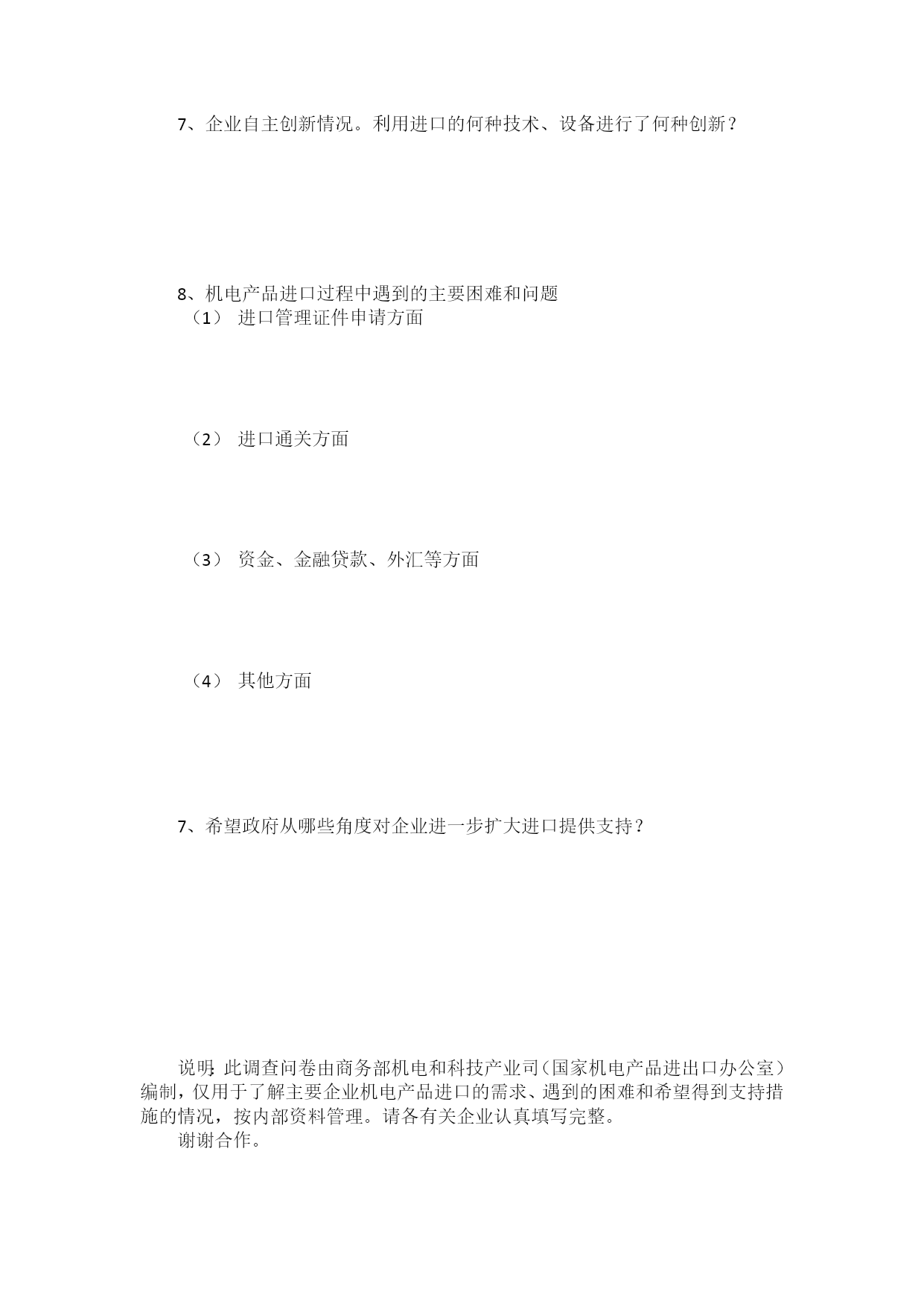 主要企业机电产品进口情况调查问卷企业名称企业所在的省(区)市联系人姓名、联系电话、电子邮件企业所属的行业2010年企业主要进口的机电产品情况(1)主要进口的生产、研发机电设备(种类、进口额、产地、设备的技术水平)(2)主要进口的零配件情况(种类、进口额、产地)6、2011年及“十二五”期间拟进口机电产品的情况(1)主要进口的生产、研发机电设备(种类、进口额、产地、设备的技术水平)(2)主要进口的零配件情况(种类、进口额、产地)7、企业自主创新情况。利用进口的何种技术、设备进行了何种创新?8、机电产品进口过程中遇到的主要困难和问题进口管理证件申请方面进口通关方面资金、金融贷款、外汇等方面其他方面7、希望政府从哪些角度对企业进一步扩大进口提供支持?说明:此调查问卷由商务部机电和科技产业司(国家机电产品进出口办公室)编制,仅用于了解主要企业机电产品进口的需求、遇到的困难和希望得到支持措施的情况,按内部资料管理。请各有关企业认真填写完整。谢谢合作。