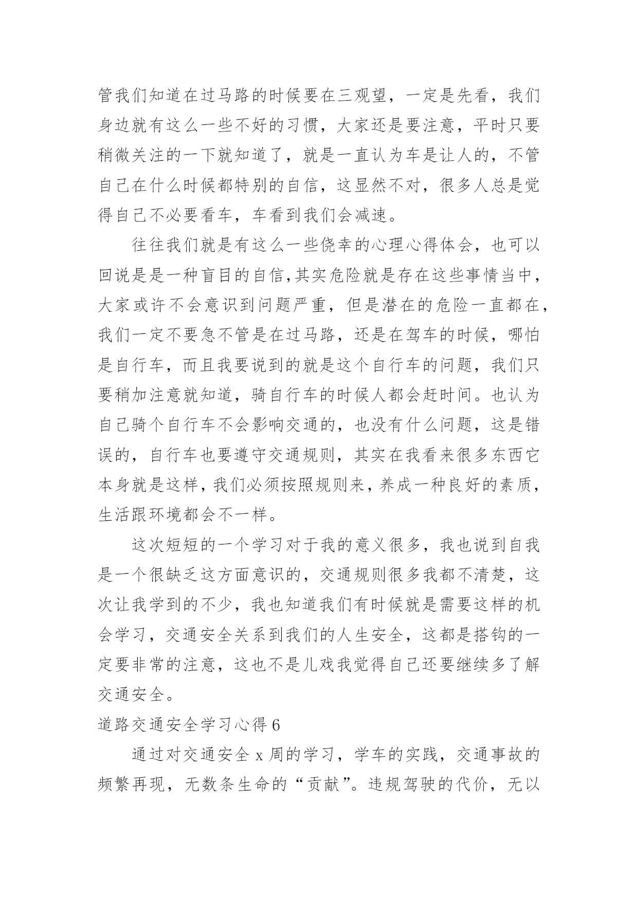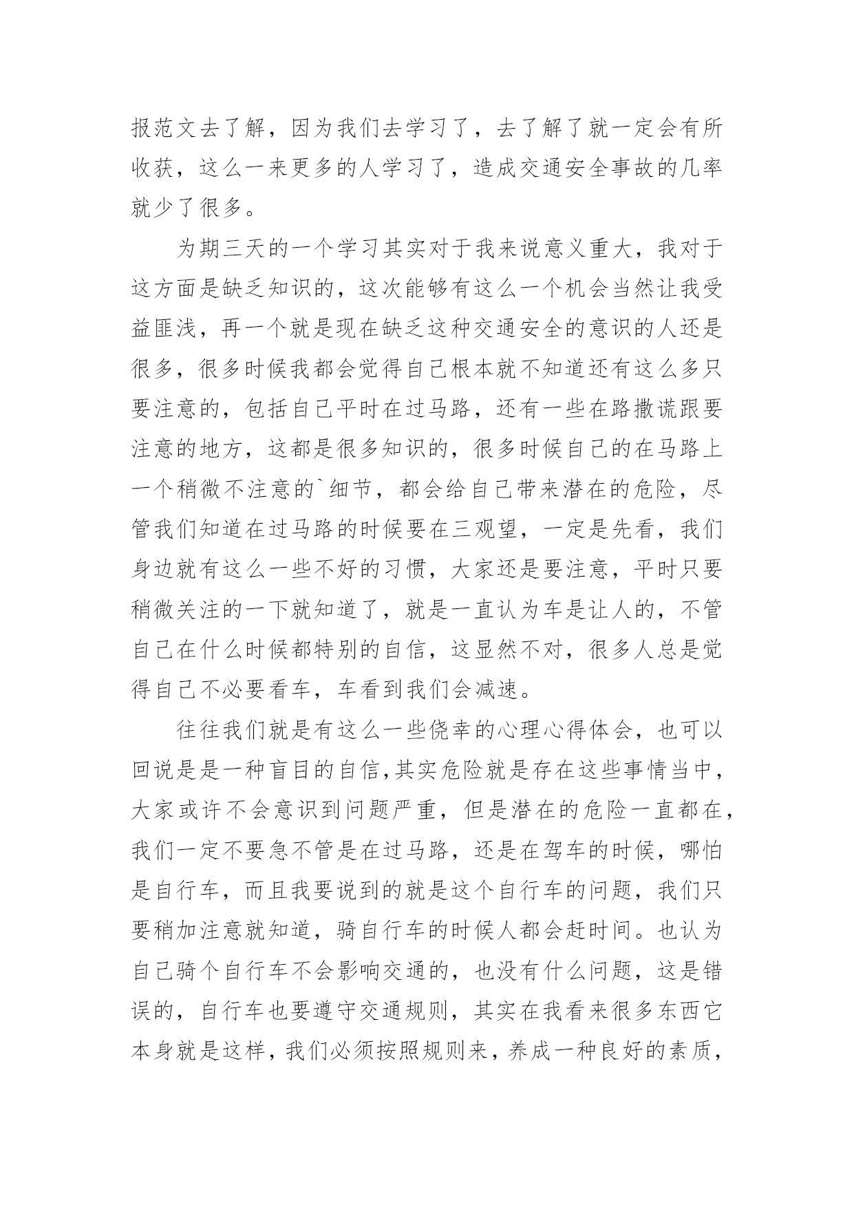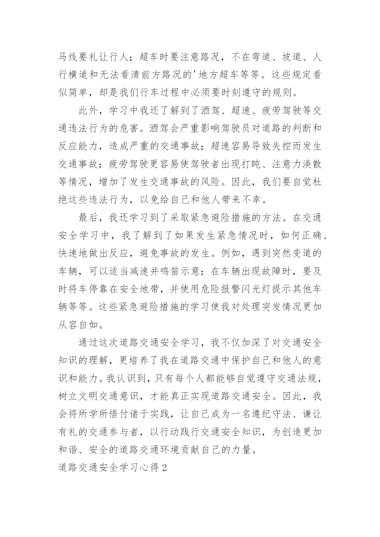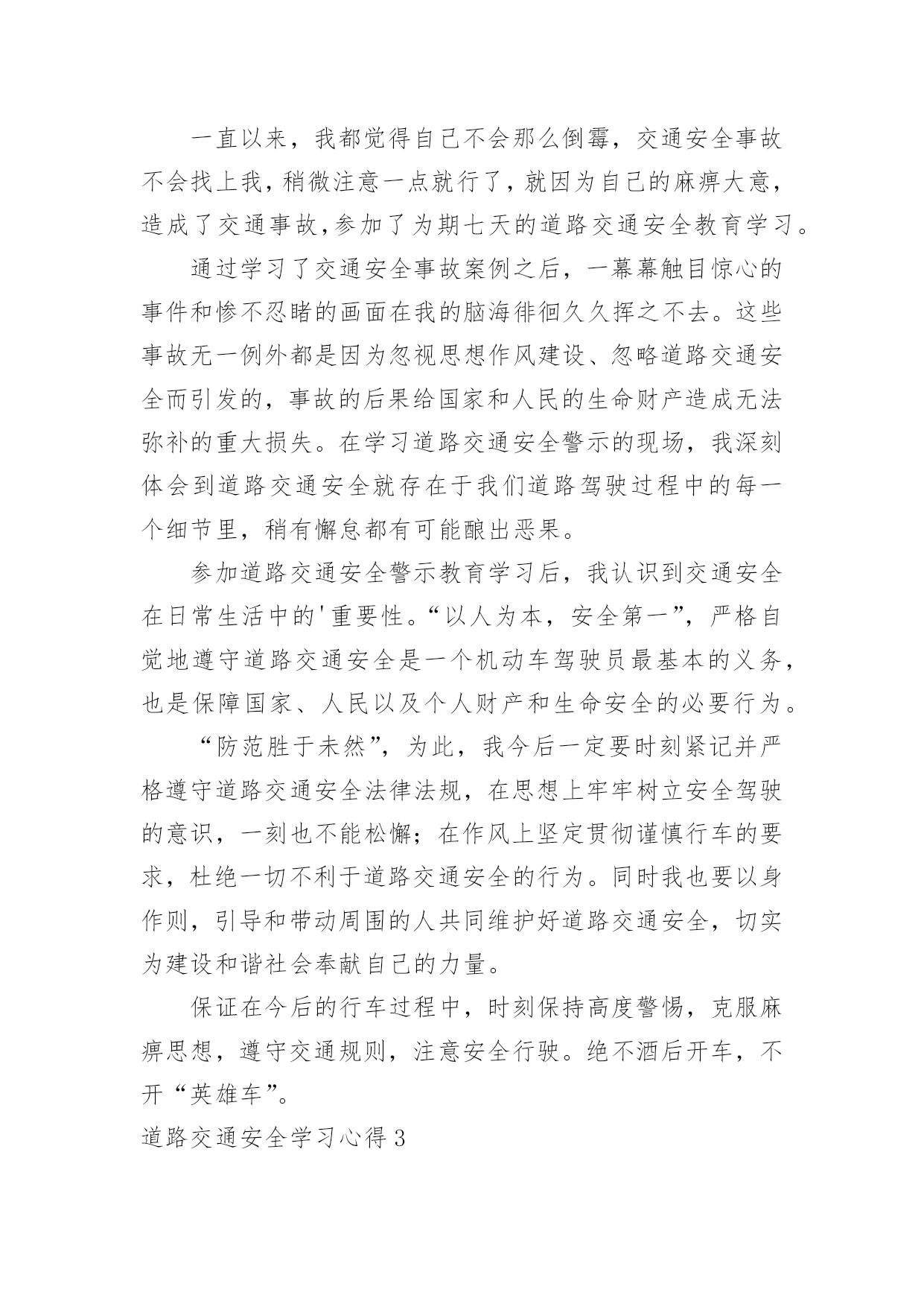道路交通安全学习心得道路交通安全学习心得当我们心中积累了不少感想和见解时,不如来好好地做个总结,写一篇心得体会,通过写心得体会,可以帮助我们总结积累经验。那么心得体会到底应该怎么写呢?下面是小编为大家整理的道路交通安全学习心得,仅供参考,欢迎大家阅读。道路交通安全学习心得1道路交通安全是每个人都应该重视的问题,特别是在当今社会,交通工具多样化、交通流量大的情况下,更需要每个人都具备相关的交通安全知识和技能。为了更好地了解和掌握道路交通安全知识,我参加了一次交通安全学习培训,下面是我对这次学习的心得体会。首先,在学习过程中,我明白了道路交通安全不仅仅是遵守交通法规,更是一种责任和义务。每个参与道路交通的人都应该保持谦让、礼让的态度,遵守交通规则,尊重他人,并且时刻保持警惕。只有大家共同遵守交通规则,才能保障自己和他人的生命安全。其次,我学会了遵守交通标志和标线的重要性。交通标志和标线是指引我们行驶的重要指示,遵守标志标线可以有效减少交通事故的发生。比如,在红灯停,绿灯行;遇到斑马线要礼让行人;超车时要注意路况,不在弯道、坡道、人行横道和无法看清前方路况的'地方超车等等。这些规定看似简单,却是我们行车过程中必须要时刻遵守的规则。此外,学习中我还了解到了酒驾、超速、疲劳驾驶等交通违法行为的危害。酒驾会严重影响驾驶员对道路的判断和反应能力,造成严重的交通事故;超速容易导致失控而发生交通事故;疲劳驾驶更容易使驾驶者出现打盹、注意力涣散等情况,增加了发生交通事故的风险。因此,我们要自觉杜绝这些违法行为,以免给自己和他人带来不幸。最后,我还学习到了采取紧急避险措施的方法。在交通安全学习中,我了解到了如果发生紧急情况时,如何正确、快速地做出反应,避免事故的发生。例如,遇到突然变道的车辆,可以适当减速并鸣笛示意;在车辆出现故障时,要及时将车停靠在安全地带,并使用危险报警闪光灯提示其他车辆等等。这些紧急避险措施的学习使我对处理突发情况更加从容自如。通过这次道路交通安全学习,我不仅加深了对交通安全知识的理解,更培养了我在道路交通中保护自己和他人的意识和能力。我认识到,只有每个人都能够自觉遵守交通法规,树立文明交通意识,才能真正实现道路交通安全。因此,我会将所学所悟付诸于实践,让自己成为一名遵纪守法、谦让有礼的交通参与者,以行动践行交通安全知识,为创造更加和谐、安全的道路交通环境贡献自己的力量。道路交通安全学习心得2一直以来,我都觉得自己不会那么倒霉,交通安全事故不会找上我,稍微注意一点就行了,就因为自己的麻痹大意,造成了交通事故,参加了为期七天的道路交通安全教育学习。通过学习了交通安全事故案例之后,一幕幕触目惊心的事件和惨不忍睹的画面在我的脑海徘徊久久挥之不去。这些事故无一例外都是因为忽视思想作风建设、忽略道路交通安全而引发的,事故的后果给国家和人民的生命财产造成无法弥补的重大损失。在学习道路交通安全警示的现场,我深刻体会到道路交通安全就存在于我们道路驾驶过程中的每一个细节里,稍有懈怠都有可能酿出恶果。参加道路交通安全警示教育学习后,我认识到交通安全在日常生活中的'重要性。“以人为本,安全第一”,严格自觉地遵守道路交通安全是一个机动车驾驶员最基本的义务,也是保障国家、人民以及个人财产和生命安全的必要行为。“防范胜于未然”,为此,我今后一定要时刻紧记并严格遵守道路交通安全法律法规,在思想上牢牢树立安全驾驶的意识,一刻也不能松懈;在作风上坚定贯彻谨慎行车的要求,杜绝一切不利于道路交通安全的行为。同时我也要以身作则,引导和带动周围的人共同维护好道路交通安全,切实为建设和谐社会奉献自己的力量。保证在今后的行车过程中,时刻保持高度警惕,克服麻痹思想,遵守交通规则,注意安全行驶。绝不酒后开车,不开“英雄车”。道路交通安全学习心得3有关法律环境问题的文件就有328件,这期间国务院还制定了700多件行政法规,各丘陵地区省级人大制定和批准了5000多件地方性法规。仅八届人大五年间有,就立法118件。通过普法教育,公民公民的责任意识也有了很大提高,这就要求我们在执法中会,非常注意执法的公正性。文明执法是社会文明的一个缩影,也是社会文明进步的整体表现。所谓文明执法,是指执法人员科学管理,依照立法规定的职权和权限程序,运用法律规范办理各种案件,坚持教育工作与处罚相结合,坚持严格、公正、文明执法。文明执法是行政执法的属性所决定的。我们执法的对象大多是人民百姓(驾驶员),遇到的症结大量的属于人民内部矛盾,有的违法行为轻微没有造成后果较轻的,应教育其纠正。如果言语粗鲁,行为野蛮,不但不能纠正其违法行为,而且会增加违法者的对立恐慌情绪,破坏政府形象。执法讲文明,要求有礼在先,出示证件在先,态度和蔼,举止端庄,教育疏导,以理服人,既是执法人员文明素养的公安民警展示,也是行政执法