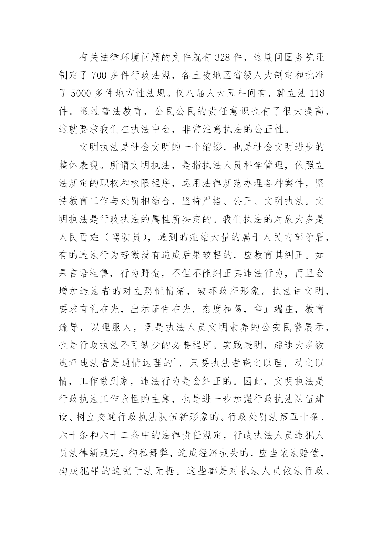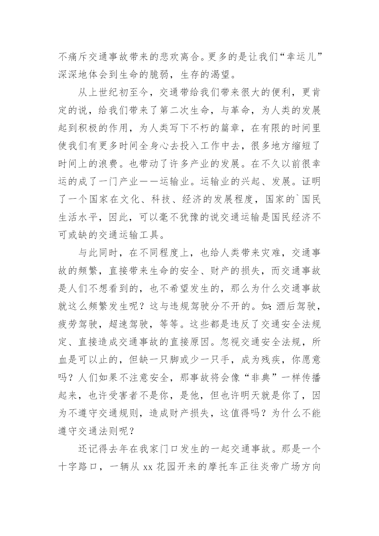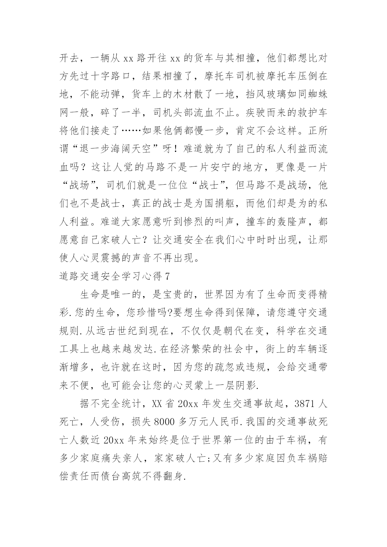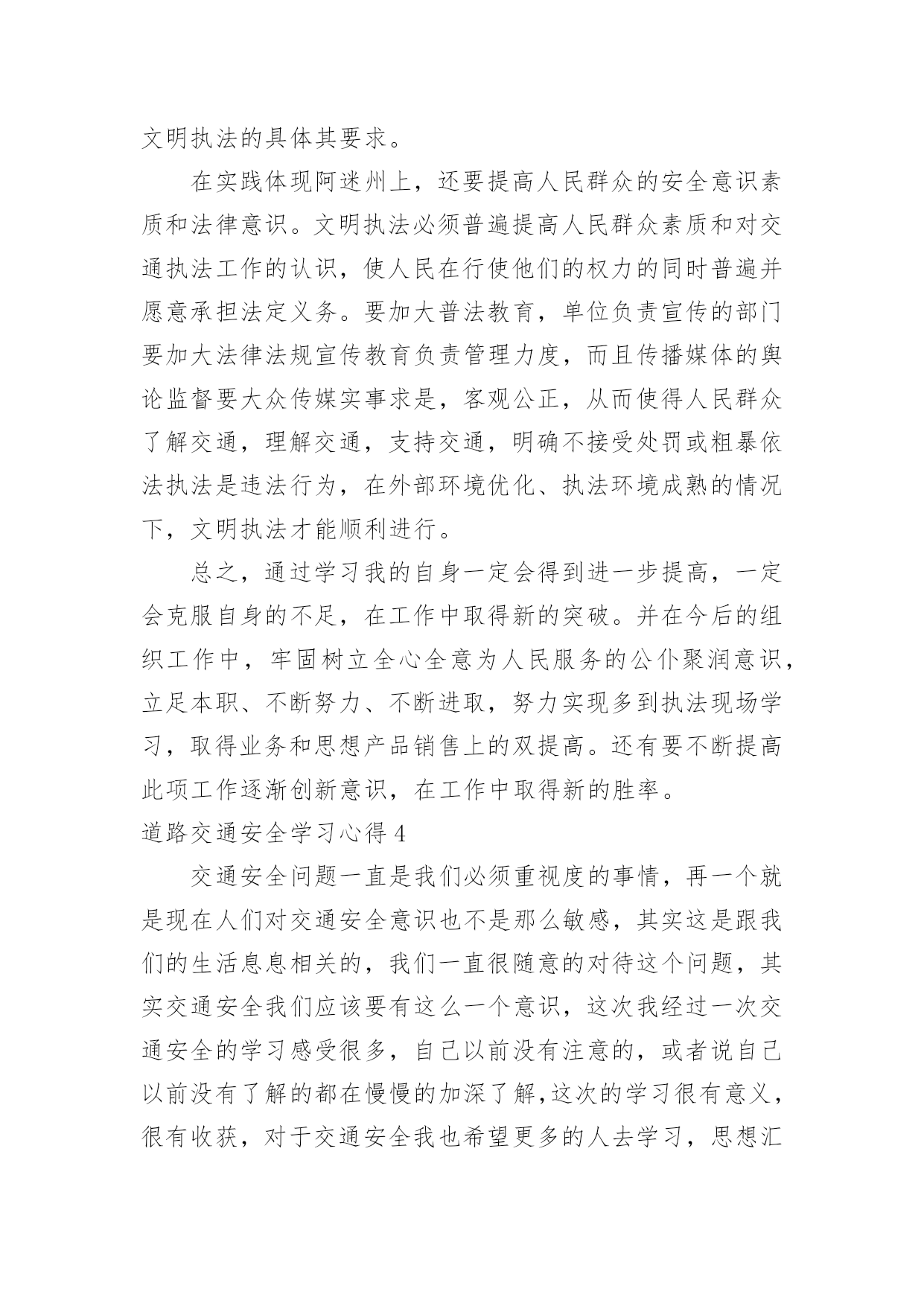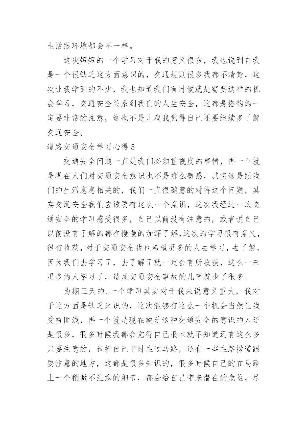道路交通安全学习心得道路交通安全学习心得当我们心中积累了不少感想和见解时,不如来好好地做个总结,写一篇心得体会,通过写心得体会,可以帮助我们总结积累经验。那么心得体会到底应该怎么写呢?下面是小编为大家整理的道路交通安全学习心得,仅供参考,欢迎大家阅读。道路交通安全学习心得1道路交通安全是每个人都应该重视的问题,特别是在当今社会,交通工具多样化、交通流量大的情况下,更需要每个人都具备相关的交通安全知识和技能。为了更好地了解和掌握道路交通安全知识,我参加了一次交通安全学习培训,下面是我对这次学习的心得体会。首先,在学习过程中,我明白了道路交通安全不仅仅是遵守交通法规,更是一种责任和义务。每个参与道路交通的人都应该保持谦让、礼让的态度,遵守交通规则,尊重他人,并且时刻保持警惕。只有大家共同遵守交通规则,才能保障自己和他人的生命安全。其次,我学会了遵守交通标志和标线的重要性。交通标志和标线是指引我们行驶的重要指示,遵守标志标线可以有效减少交通事故的发生。比如,在红灯停,绿灯行;遇到斑马线要礼让行人;超车时要注意路况,不在弯道、坡道、人行横道和无法看清前方路况的'地方超车等等。这些规定看似简单,却是我们行车过程中必须要时刻遵守的规则。此外,学习中我还了解到了酒驾、超速、疲劳驾驶等交通违法行为的危害。酒驾会严重影响驾驶员对道路的判断和反应能力,造成严重的交通事故;超速容易导致失控而发生交通事故;疲劳驾驶更容易使驾驶者出现打盹、注意力涣散等情况,增加了发生交通事故的风险。因此,我们要自觉杜绝这些违法行为,以免给自己和他人带来不幸。最后,我还学习到了采取紧急避险措施的方法。在交通安全学习中,我了解到了如果发生紧急情况时,如何正确、快速地做出反应,避免事故的发生。例如,遇到突然变道的车辆,可以适当减速并鸣笛示意;在车辆出现故障时,要及时将车停靠在安全地带,并使用危险报警闪光灯提示其他车辆等等。这些紧急避险措施的学习使我对处理突发情况更加从容自如。通过这次道路交通安全学习,我不仅加深了对交通安全知识的理解,更培养了我在道路交通中保护自己和他人的意识和能力。我认识到,只有每个人都能够自觉遵守交通法规,树立文明交通意识,才能真正实现道路交通安全。因此,我会将所学所悟付诸于实践,让自己成为一名遵纪守法、谦让有礼的交通参与者,以行动践行交通安全知识,为创造更加和谐、安全的道路交通环境贡献自己的力量。道路交通安全学习心得2一直以来,我都觉得自己不会那么倒霉,交通安全事故不会找上我,稍微注意一点就行了,就因为自己的麻痹大意,造成了交通事故,参加了为期七天的道路交通安全教育学习。通过学习了交通安全事故案例之后,一幕幕触目惊心的事件和惨不忍睹的画面在我的脑海徘徊久久挥之不去。这些事故无一例外都是因为忽视思想作风建设、忽略道路交通安全而引发的,事故的后果给国家和人民的生命财产造成无法弥补的重大损失。在学习道路交通安全警示的现场,我深刻体会到道路交通安全就存在于我们道路驾驶过程中的每一个细节里,稍有懈怠都有可能酿出恶果。参加道路交通安全警示教育学习后,我认识到交通安全在日常生活中的'重要性。“以人为本,安全第一”,严格自觉地遵守道路交通安全是一个机动车驾驶员最基本的义务,也是保障国家、人民以及个人财产和生命安全的必要行为。“防范胜于未然”,为此,我今后一定要时刻紧记并严格遵守道路交通安全法律法规,在思想上牢牢树立安全驾驶的意识,一刻也不能松懈;在作风上坚定贯彻谨慎行车的要求,杜绝一切不利于道路交通安全的行为。同时我也要以身作则,引导和带动周围的人共同维护好道路交通安全,切实为建设和谐社会奉献自己的力量。保证在今后的行车过程中,时刻保持高度警惕,克服麻痹思想,遵守交通规则,注意安全行驶。绝不酒后开车,不开“英雄车”。道路交通安全学习心得3有关法律环境问题的文件就有328件,这期间国务院还制定了700多件行政法规,各丘陵地区省级人大制定和批准了5000多件地方性法规。仅八届人大五年间有,就立法118件。通过普法教育,公民公民的责任意识也有了很大提高,这就要求我们在执法中会,非常注意执法的公正性。文明执法是社会文明的一个缩影,也是社会文明进步的整体表现。所谓文明执法,是指执法人员科学管理,依照立法规定的职权和权限程序,运用法律规范办理各种案件,坚持教育工作与处罚相结合,坚持严格、公正、文明执法。文明执法是行政执法的属性所决定的。我们执法的对象大多是人民百姓(驾驶员),遇到的症结大量的属于人民内部矛盾,有的违法行为轻微没有造成后果较轻的,应教育其纠正。如果言语粗鲁,行为野蛮,不但不能纠正其违法行为,而且会增加违法者的对立恐慌情绪,破坏政府形象。执法讲文明,要求有礼在先,出示证件在先,态度和蔼,举止端庄,教育疏导,以理服人,既是执法人员文明素养的公安民警展示,也是行政执法
