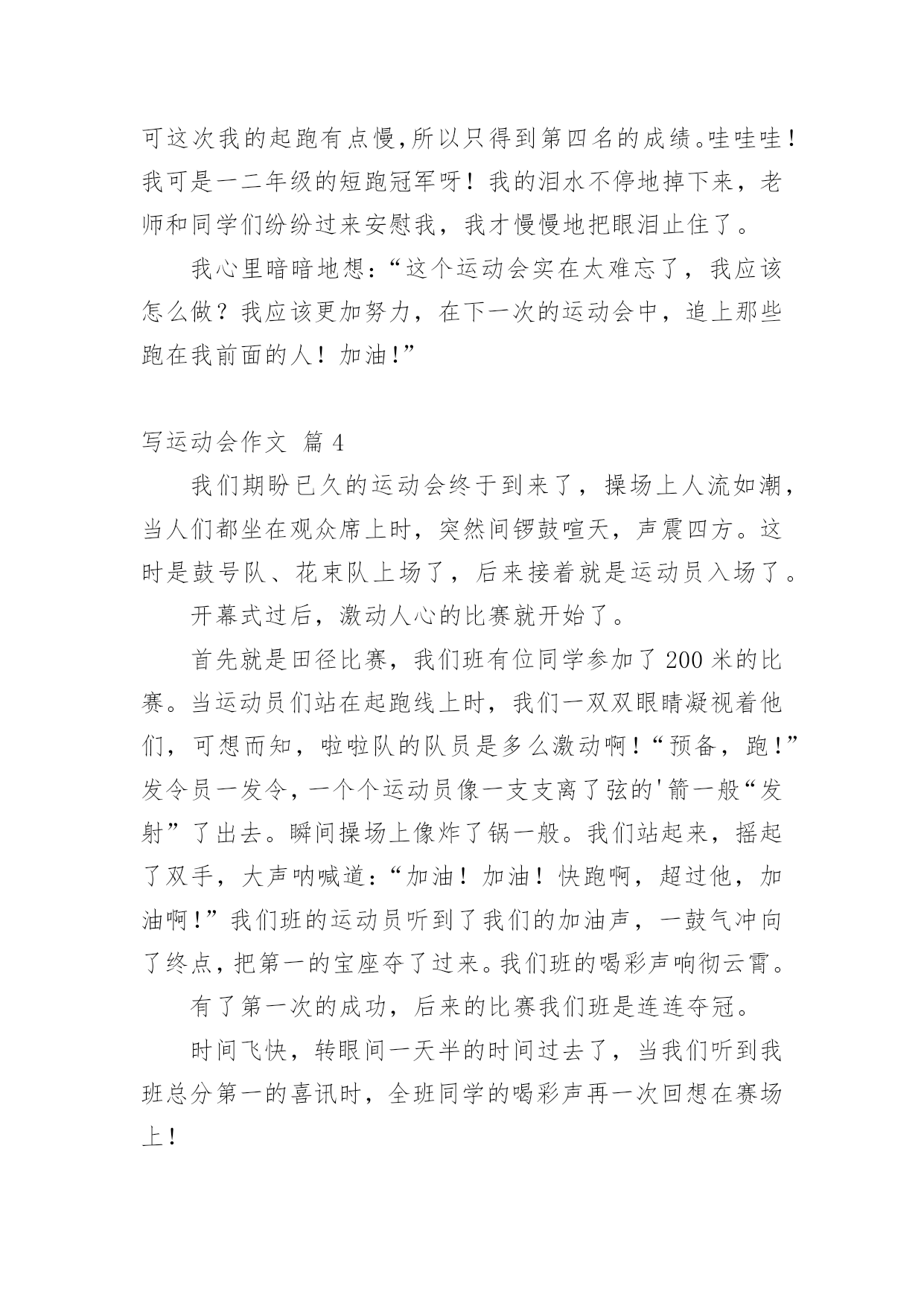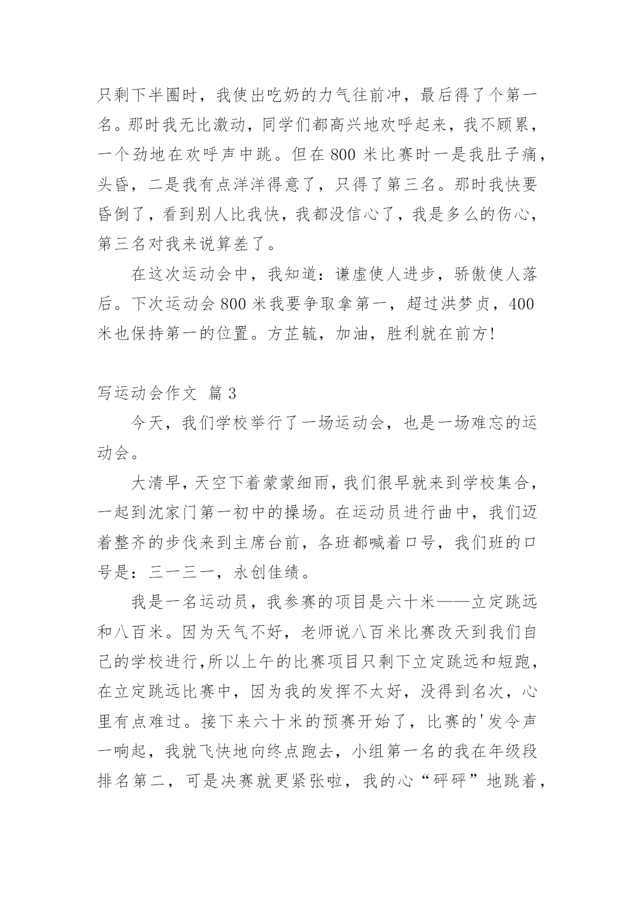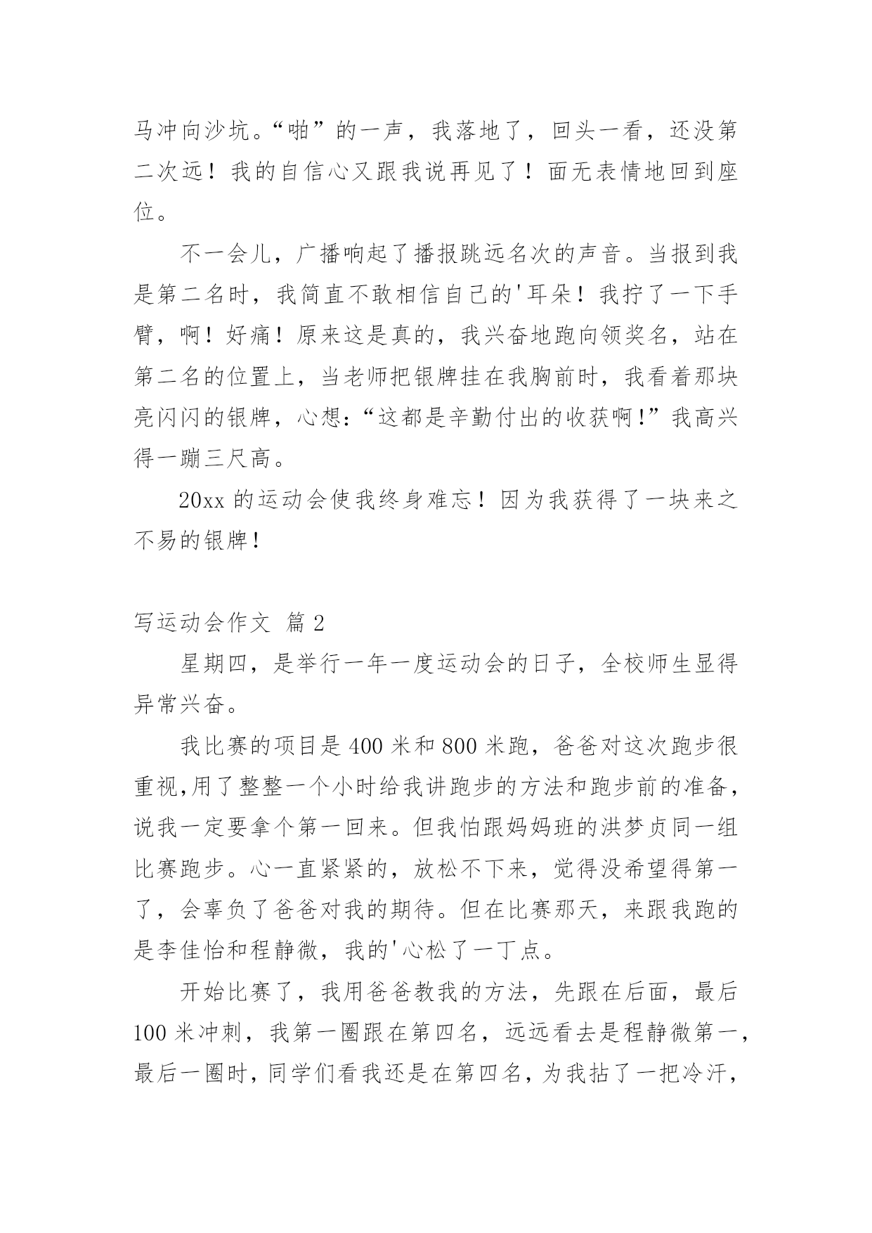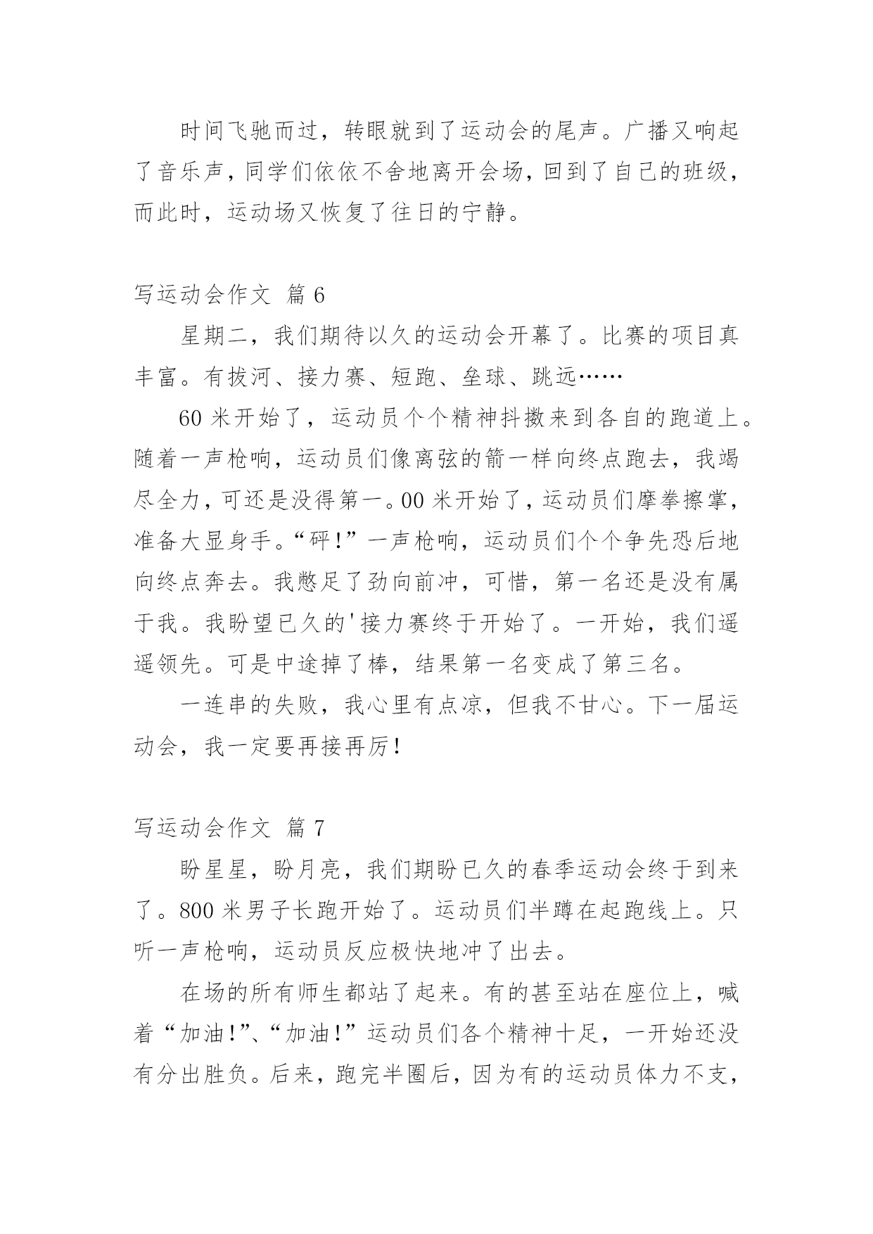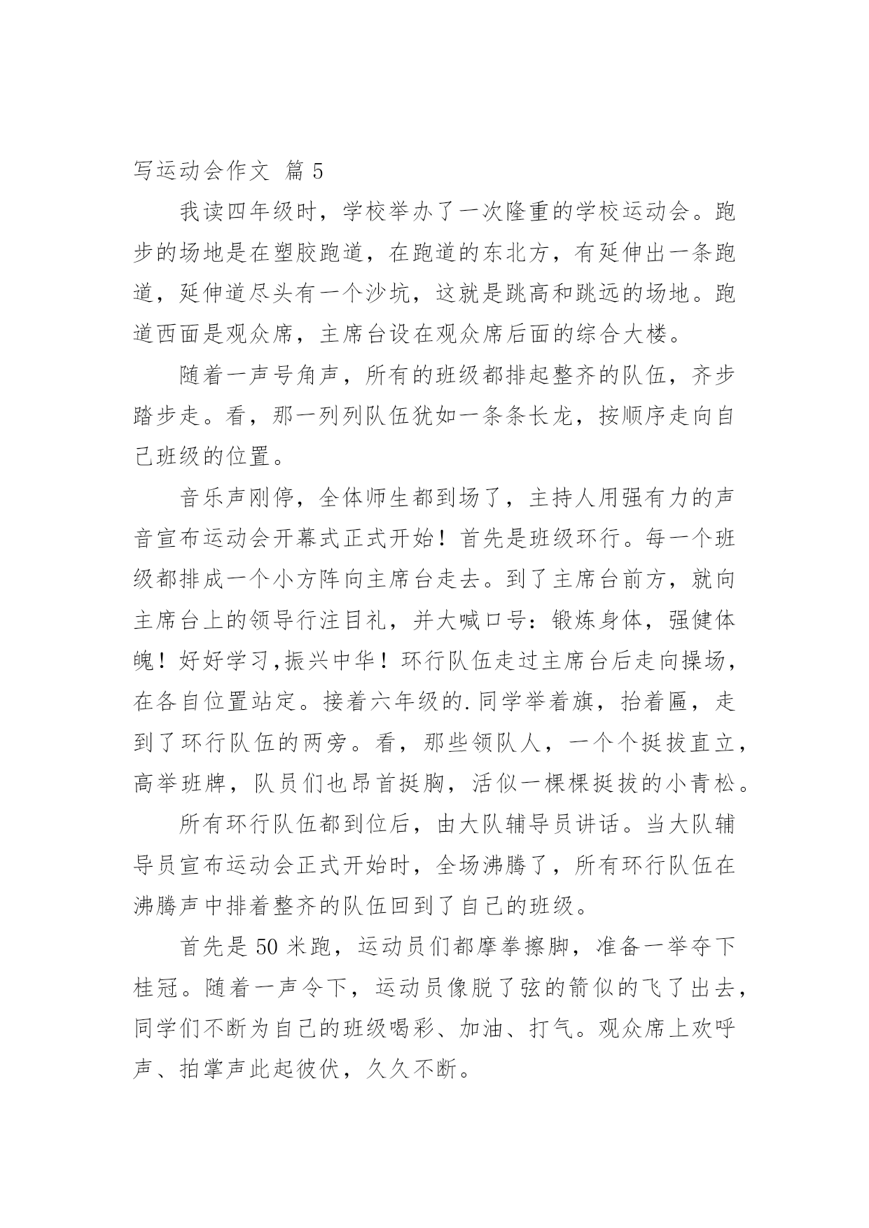 写运动会作文(优选)写运动会作文在平平淡淡的日常中,大家总少不了接触作文吧,作文根据体裁的不同可以分为记叙文、说明文、应用文、议论文。那么,怎么去写作文呢?以下是小编为大家整理的写运动会作文7篇,仅供参考,欢迎大家阅读。写运动会作文篇1一年一度的运动会开始了!运动员们个个精神抖擞,昂首挺胸走向运动场。当广播报到跳远运动员准备检录时,我紧张得心都提到嗓子眼了!轮到我时,我更加紧张感觉有只兔子在我心里砰砰直跳。当老师的旗子“唰”地下来,我像离弦的箭一样飞奔过去。可是,快到踏板时,我慢下来,生怕踩到线。结果,没发挥好,跳的太近了!当我垂头丧气地走回去时,突然有人对我说:“别灰心,还有两次机会,加油!你一定能行!”我听见了,在心里安慰自己:“没事,还有两次机会,我得努力!”我信心十足地走向起跑线,心里暗暗下定决心:“加油!你一定能行!”说完,我匀速跑了起来,到踏板时,我纵身一跃,跳进沙坑里。哇!这次比第一次远!我的自信心又重新飞了回来。我信心满满地走向起跑点。第三轮开始了,我暗暗对自己说:“加油!还有最后一次了!争取第三次跳的更远!”哨声一响,我便像脱缰的野马冲向沙坑。“啪”的一声,我落地了,回头一看,还没第二次远!我的自信心又跟我说再见了!面无表情地回到座位。不一会儿,广播响起了播报跳远名次的声音。当报到我是第二名时,我简直不敢相信自己的'耳朵!我拧了一下手臂,啊!好痛!原来这是真的,我兴奋地跑向领奖名,站在第二名的位置上,当老师把银牌挂在我胸前时,我看着那块亮闪闪的银牌,心想:“这都是辛勤付出的收获啊!”我高兴得一蹦三尺高。20xx的运动会使我终身难忘!因为我获得了一块来之不易的银牌!写运动会作文篇2星期四,是举行一年一度运动会的日子,全校师生显得异常兴奋。我比赛的项目是400米和800米跑,爸爸对这次跑步很重视,用了整整一个小时给我讲跑步的方法和跑步前的准备,说我一定要拿个第一回来。但我怕跟妈妈班的洪梦贞同一组比赛跑步。心一直紧紧的,放松不下来,觉得没希望得第一了,会辜负了爸爸对我的期待。但在比赛那天,来跟我跑的是李佳怡和程静微,我的'心松了一丁点。开始比赛了,我用爸爸教我的方法,先跟在后面,最后100米冲刺,我第一圈跟在第四名,远远看去是程静微第一,最后一圈时,同学们看我还是在第四名,为我拈了一把冷汗,只剩下半圈时,我使出吃奶的力气往前冲,最后得了个第一名。那时我无比激动,同学们都高兴地欢呼起来,我不顾累,一个劲地在欢呼声中跳。但在800米比赛时一是我肚子痛,头昏,二是我有点洋洋得意了,只得了第三名。那时我快要昏倒了,看到别人比我快,我都没信心了,我是多么的伤心,第三名对我来说算差了。在这次运动会中,我知道:谦虚使人进步,骄傲使人落后。下次运动会800米我要争取拿第一,超过洪梦贞,400米也保持第一的位置。方芷毓,加油,胜利就在前方!写运动会作文篇3今天,我们学校举行了一场运动会,也是一场难忘的运动会。大清早,天空下着蒙蒙细雨,我们很早就来到学校集合,一起到沈家门第一初中的操场。在运动员进行曲中,我们迈着整齐的步伐来到主席台前,各班都喊着口号,我们班的口号是:三一三一,永创佳绩。我是一名运动员,我参赛的项目是六十米——立定跳远和八百米。因为天气不好,老师说八百米比赛改天到我们自己的学校进行,所以上午的比赛项目只剩下立定跳远和短跑,在立定跳远比赛中,因为我的发挥不太好,没得到名次,心里有点难过。接下来六十米的预赛开始了,比赛的'发令声一响起,我就飞快地向终点跑去,小组第一名的我在年级段排名第二,可是决赛就更紧张啦,我的心“砰砰”地跳着,可这次我的起跑有点慢,所以只得到第四名的成绩。哇哇哇!我可是一二年级的短跑冠军呀!我的泪水不停地掉下来,老师和同学们纷纷过来安慰我,我才慢慢地把眼泪止住了。我心里暗暗地想:“这个运动会实在太难忘了,我应该怎么做?我应该更加努力,在下一次的运动会中,追上那些跑在我前面的人!加油!”写运动会作文篇4我们期盼已久的运动会终于到来了,操场上人流如潮,当人们都坐在观众席上时,突然间锣鼓喧天,声震四方。这时是鼓号队、花束队上场了,后来接着就是运动员入场了。开幕式过后,激动人心的比赛就开始了。首先就是田径比赛,我们班有位同学参加了200米的比赛。当运动员们站在起跑线上时,我们一双双眼睛凝视着他们,可想而知,啦啦队的队员是多么激动啊!“预备,跑!”发令员一发令,一个个运动员像一支支离了弦的'箭一般“发射”了出去。瞬间操场上像炸了锅一般。我们站起来,摇起了双手,大声呐喊道:“加油!加油!快跑啊,超过他,加油啊!”我们班的运动员听到了我们的加油声,一鼓气冲向了终点,把第一的宝座夺了过来。我们班的喝彩声响彻云霄。有了第一次的成功,后来的比赛我们班是连连夺冠。时间飞快,转眼间一天半的时间过去了,当我们听到我班总分第一