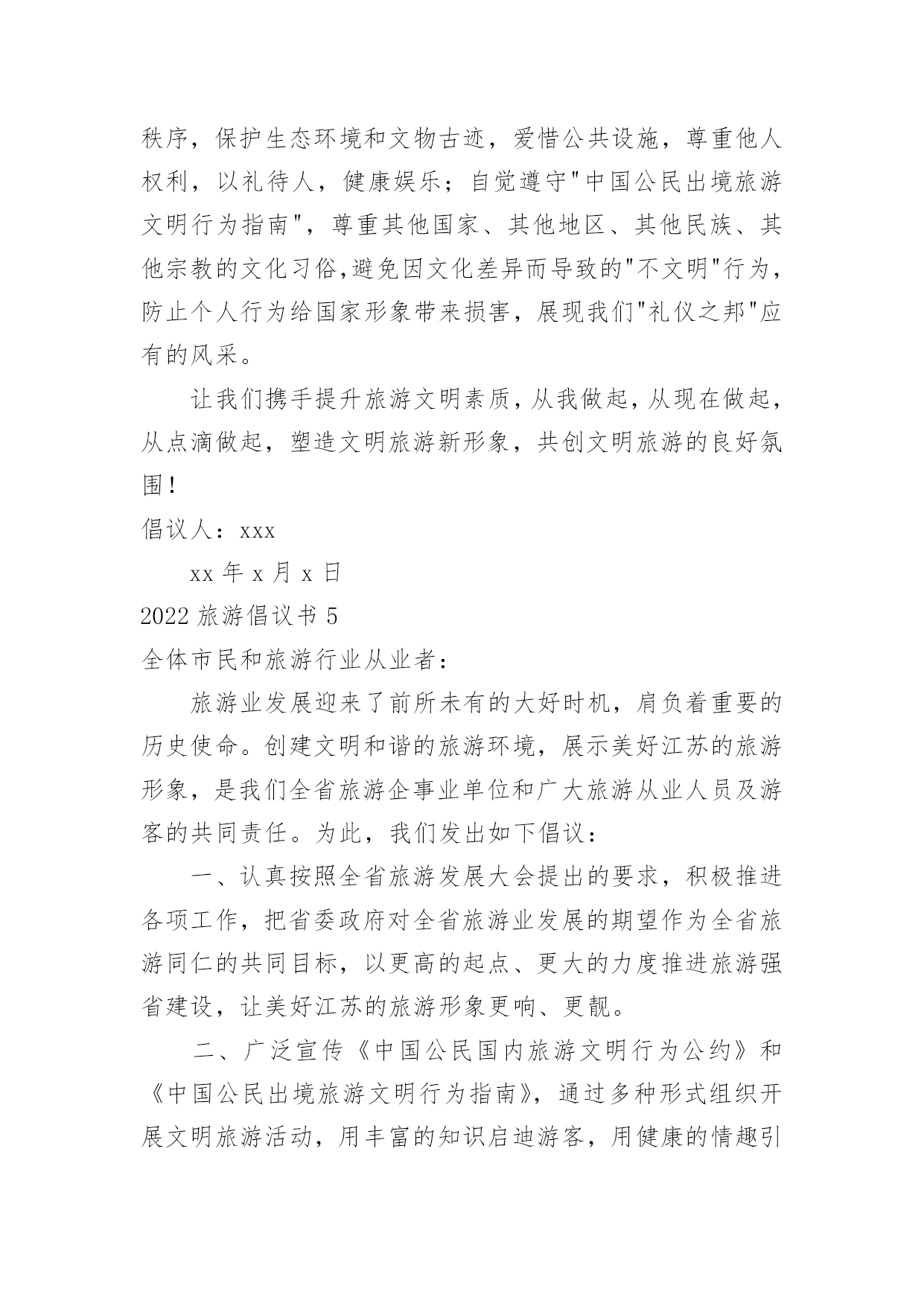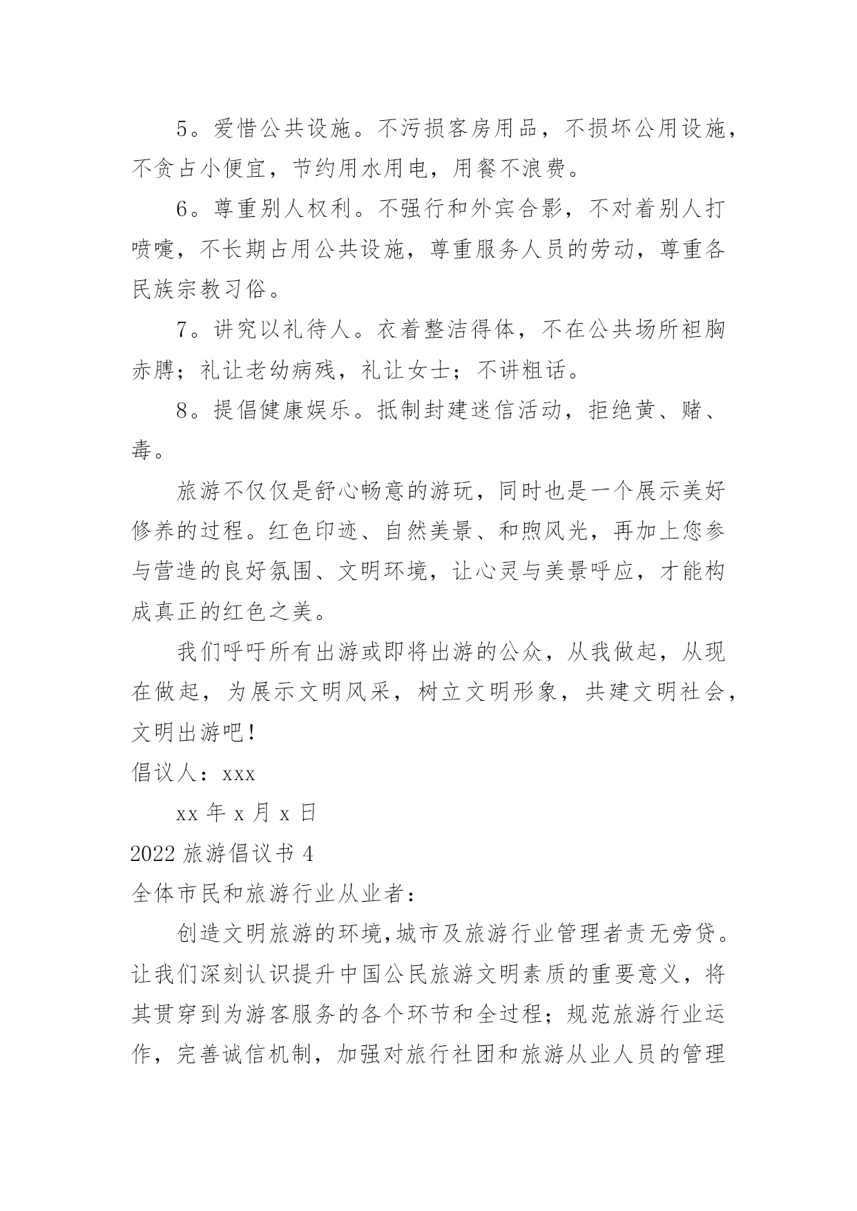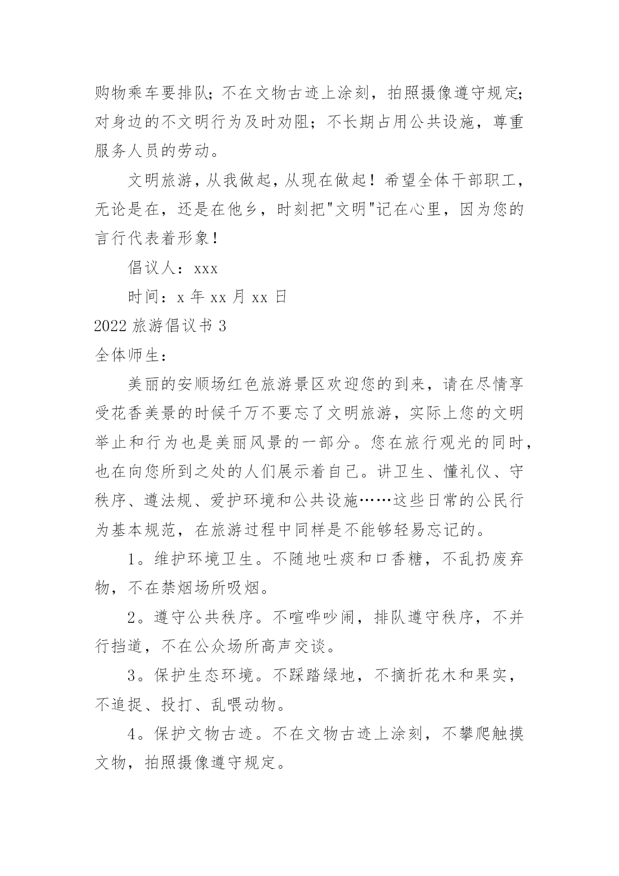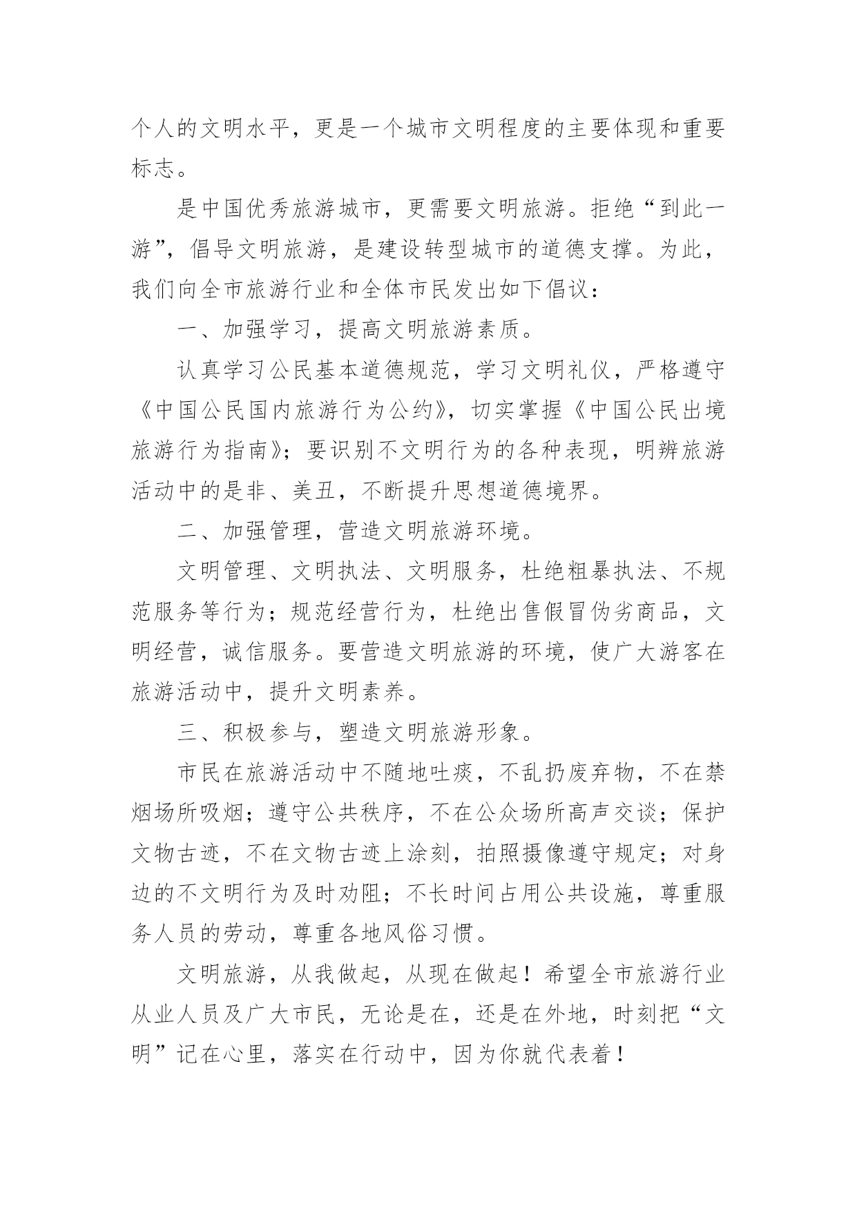 旅游倡议书2022旅游倡议书在现实社会中,我们都跟倡议书有着直接或间接的联系,倡议书是为倡议、发起某项活动而写的号召性的公开提议性的专用书信。写起倡议书来就毫无头绪?以下是小编帮大家整理的2022旅游倡议书,仅供参考,大家一起来看看吧。2022旅游倡议书1全体干部职工(子公司):随着我县公民生活水平的提高,外出旅游已成为大家日常生活中重要的休闲方式,我县旅游人数也是连年增高。出门在外,您在旅行观光、欣赏美景的同时,自身也是美丽风景的一部分,也在向您所到之处的人们展示着自己。讲卫生、懂礼仪、守秩序、遵法规、爱护环境和公共设施……这些日常的公民行为基本规范,在旅游过程中同样是不能够轻易忘记的。创建文明和谐的旅游环境,展示云梦美好的旅游形象,也是我们每位公民和旅游从业者共同的责任。旅游是一项发现美、欣赏美、享受美的活动,更是一项创造美的活动。市民在旅游活动中的一言一行,不仅体现了个人的文明水平,更是一个城市文明程度的主要体现和重要标志。美丽的旅游景点总是给人以美好的享受,请在尽情享受春光美景的时候千万不要忘了文明旅游。云梦县是中国优秀旅游城市,更需要文明旅游。拒绝"到此一游",倡导文明旅游,是提升云梦县全国优秀旅游城市及全国旅游标准化试点市创建水平的重大举措,更是建设现代化文明旅游城市的道德支撑。我们向全体干部职工(子公司)发出如下倡议:积极参与,塑造文明旅游形象。市民在旅游活动中不随地吐痰,不乱扔废弃物,不在禁烟场所吸烟;遵守公共秩序,排队遵守秩序,不在公众场所高声交谈;保护文物古迹,不在文物古迹上涂刻,拍照摄像遵守规定;对身边的不文明行为及时劝阻;不长期占用公共设施,尊重服务人员的劳动,尊重各地风俗习惯。文明旅游,从我做起,从现在做起!让每位游客都成为亮丽风景的花絮,使您和他人在享受大自然馈赠的同时,能得到最大限度的心灵抚慰和精神享受。旅游不仅仅是舒心畅意的游玩,同时也是一个展示美好修养的过程。提升旅游文明素质,无不是展现良好个人修养和社会文明程度的现实要求。自然美景、和煦春光,再加上您参与营造的良好氛围、文明的环境,才能构成真正的美。文明旅游,并不是一个口号、一句空谈,它需要您和我、景区、旅行社以及每位游客的共同努力。希望全市旅游行业从业人员及广大市民,无论是在云梦,还是在外地,时刻把"文明"记在心里,落实在行动中,因为您就代表着云梦!我们向全社会发出倡议,以讲文明为荣,让人人都和您一样能够做到环境美和心灵美的和谐统一。我们呼吁所有出游或即将出游的公众,从我做起,从现在做起,为展示文明风采,树立文明形象,共建文明社会,文明出游吧!倡议人:xxx时间:x年xx月xx日2022旅游倡议书2全体干部职工:旅游是一项发现美、欣赏美、享受美、创造美的活动。市民在旅游活动中的一言一行,不仅体现了个人的文明水平,更是体现一个城市文明程度的重要标志。x市正在创建全国文明城市,倡导文明旅游,是提升我市创建全国文明城市水平的重大举措。为此,我院向全体干部职工发出倡议:一、加强学习,提高文明旅游素质。认真学习公民基本道德规范,学习文明礼仪,严格遵守《中国公民国内旅游行为公约》,切实掌握《中国公民出境旅游行动指南》;要识别不文明行为的各种表现,明辨旅游活动中的是非、美丑,不断提升思想道德水平,在旅游活动中,"多看美景,不刻美名"。二、入乡随俗,尊重各地风俗习惯。尊重其他国家,其他地区,其他民族,其他宗教的文化习俗,避免因文化差异而导致的"不文明"行为,不要让个人行为给国家和我们的城市形象带来损害,用我们文明之邦的礼仪展示美好形象。三、积极参与,塑造文明旅游形象。出游讲礼仪,要做到垃圾不乱扔,举止要文明,不在公众场所高声交谈,旅游购物乘车要排队;不在文物古迹上涂刻,拍照摄像遵守规定;对身边的不文明行为及时劝阻;不长期占用公共设施,尊重服务人员的劳动。文明旅游,从我做起,从现在做起!希望全体干部职工,无论是在,还是在他乡,时刻把"文明"记在心里,因为您的言行代表着形象!倡议人:xxx时间:x年xx月xx日2022旅游倡议书3全体师生:美丽的安顺场红色旅游景区欢迎您的到来,请在尽情享受花香美景的时候千万不要忘了文明旅游,实际上您的文明举止和行为也是美丽风景的一部分。您在旅行观光的同时,也在向您所到之处的人们展示着自己。讲卫生、懂礼仪、守秩序、遵法规、爱护环境和公共设施……这些日常的公民行为基本规范,在旅游过程中同样是不能够轻易忘记的。1。维护环境卫生。不随地吐痰和口香糖,不乱扔废弃物,不在禁烟场所吸烟。2。遵守公共秩序。不喧哗吵闹,排队遵守秩序,不并行挡道,不在公众场所高声交谈。3。保护生态环境。不踩踏绿地,不摘折花木和果实,不追捉、投打、乱喂动物。4。保护文物古迹。不在文物古迹上涂刻,不攀爬触摸文物,拍照摄像遵守规定。5。爱惜公共设施。不污损客房用品