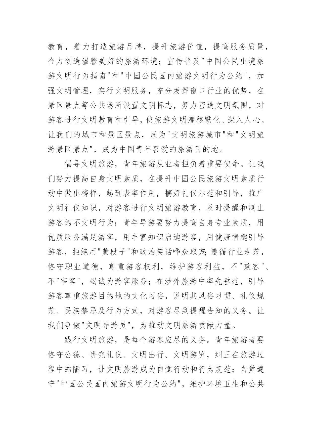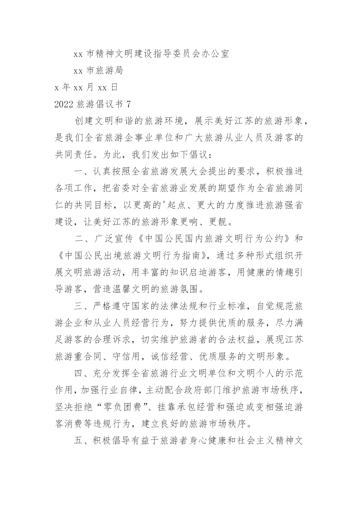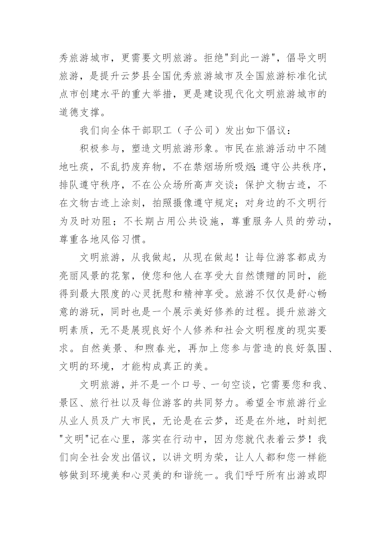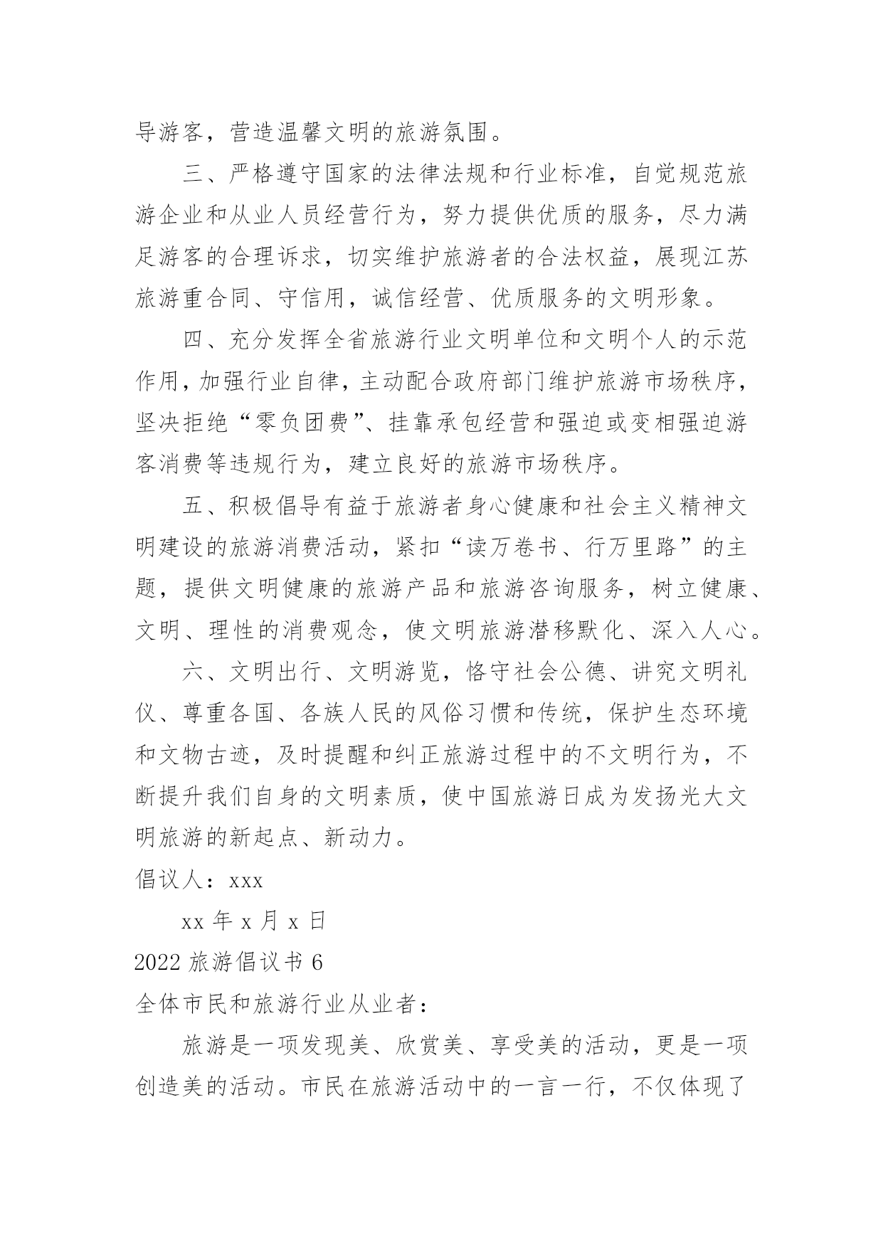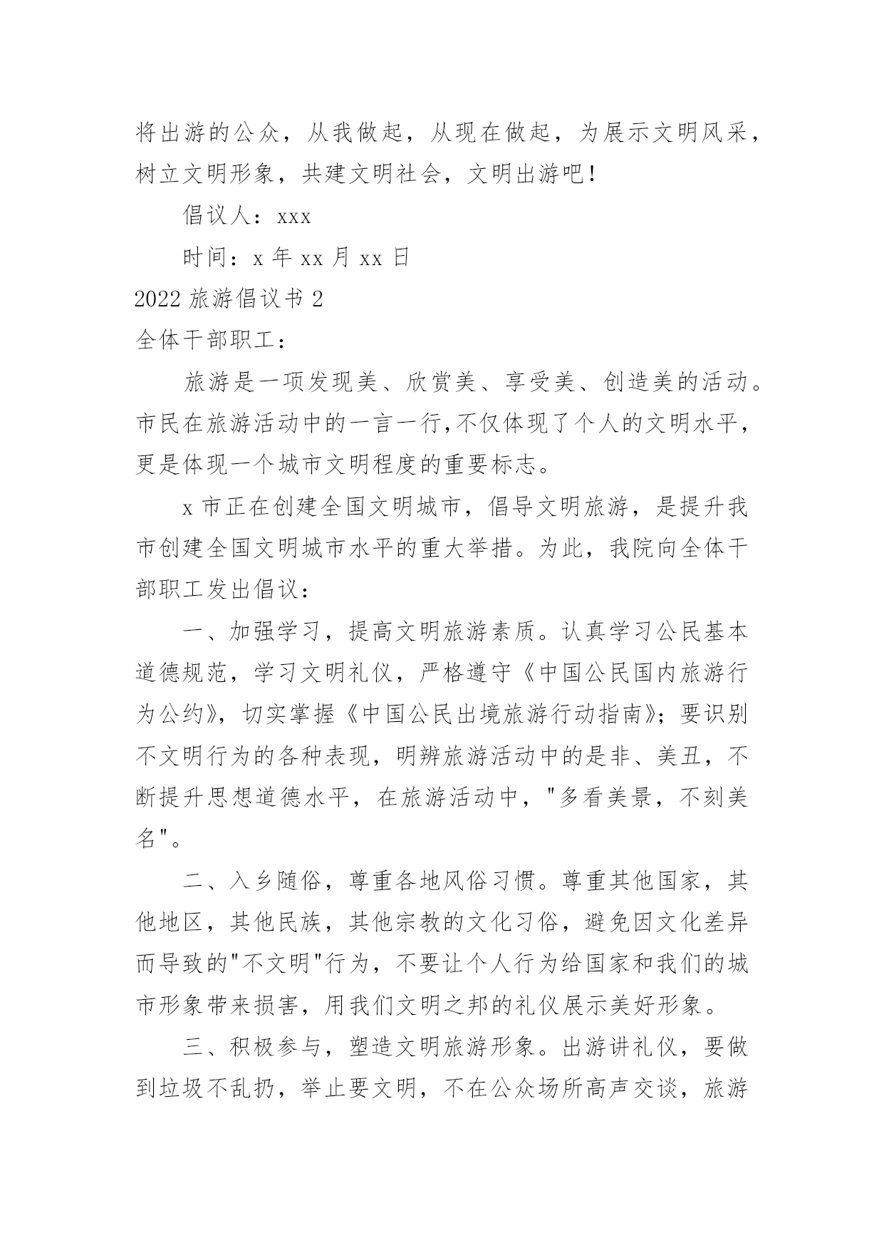 旅游倡议书2022旅游倡议书在现实社会中,我们都跟倡议书有着直接或间接的联系,倡议书是为倡议、发起某项活动而写的号召性的公开提议性的专用书信。写起倡议书来就毫无头绪?以下是小编帮大家整理的2022旅游倡议书,仅供参考,大家一起来看看吧。2022旅游倡议书1全体干部职工(子公司):随着我县公民生活水平的提高,外出旅游已成为大家日常生活中重要的休闲方式,我县旅游人数也是连年增高。出门在外,您在旅行观光、欣赏美景的同时,自身也是美丽风景的一部分,也在向您所到之处的人们展示着自己。讲卫生、懂礼仪、守秩序、遵法规、爱护环境和公共设施……这些日常的公民行为基本规范,在旅游过程中同样是不能够轻易忘记的。创建文明和谐的旅游环境,展示云梦美好的旅游形象,也是我们每位公民和旅游从业者共同的责任。旅游是一项发现美、欣赏美、享受美的活动,更是一项创造美的活动。市民在旅游活动中的一言一行,不仅体现了个人的文明水平,更是一个城市文明程度的主要体现和重要标志。美丽的旅游景点总是给人以美好的享受,请在尽情享受春光美景的时候千万不要忘了文明旅游。云梦县是中国优秀旅游城市,更需要文明旅游。拒绝"到此一游",倡导文明旅游,是提升云梦县全国优秀旅游城市及全国旅游标准化试点市创建水平的重大举措,更是建设现代化文明旅游城市的道德支撑。我们向全体干部职工(子公司)发出如下倡议:积极参与,塑造文明旅游形象。市民在旅游活动中不随地吐痰,不乱扔废弃物,不在禁烟场所吸烟;遵守公共秩序,排队遵守秩序,不在公众场所高声交谈;保护文物古迹,不在文物古迹上涂刻,拍照摄像遵守规定;对身边的不文明行为及时劝阻;不长期占用公共设施,尊重服务人员的劳动,尊重各地风俗习惯。文明旅游,从我做起,从现在做起!让每位游客都成为亮丽风景的花絮,使您和他人在享受大自然馈赠的同时,能得到最大限度的心灵抚慰和精神享受。旅游不仅仅是舒心畅意的游玩,同时也是一个展示美好修养的过程。提升旅游文明素质,无不是展现良好个人修养和社会文明程度的现实要求。自然美景、和煦春光,再加上您参与营造的良好氛围、文明的环境,才能构成真正的美。文明旅游,并不是一个口号、一句空谈,它需要您和我、景区、旅行社以及每位游客的共同努力。希望全市旅游行业从业人员及广大市民,无论是在云梦,还是在外地,时刻把"文明"记在心里,落实在行动中,因为您就代表着云梦!我们向全社会发出倡议,以讲文明为荣,让人人都和您一样能够做到环境美和心灵美的和谐统一。我们呼吁所有出游或即将出游的公众,从我做起,从现在做起,为展示文明风采,树立文明形象,共建文明社会,文明出游吧!倡议人:xxx时间:x年xx月xx日2022旅游倡议书2全体干部职工:旅游是一项发现美、欣赏美、享受美、创造美的活动。市民在旅游活动中的一言一行,不仅体现了个人的文明水平,更是体现一个城市文明程度的重要标志。x市正在创建全国文明城市,倡导文明旅游,是提升我市创建全国文明城市水平的重大举措。为此,我院向全体干部职工发出倡议:一、加强学习,提高文明旅游素质。认真学习公民基本道德规范,学习文明礼仪,严格遵守《中国公民国内旅游行为公约》,切实掌握《中国公民出境旅游行动指南》;要识别不文明行为的各种表现,明辨旅游活动中的是非、美丑,不断提升思想道德水平,在旅游活动中,"多看美景,不刻美名"。二、入乡随俗,尊重各地风俗习惯。尊重其他国家,其他地区,其他民族,其他宗教的文化习俗,避免因文化差异而导致的"不文明"行为,不要让个人行为给国家和我们的城市形象带来损害,用我们文明之邦的礼仪展示美好形象。三、积极参与,塑造文明旅游形象。出游讲礼仪,要做到垃圾不乱扔,举止要文明,不在公众场所高声交谈,旅游购物乘车要排队;不在文物古迹上涂刻,拍照摄像遵守规定;对身边的不文明行为及时劝阻;不长期占用公共设施,尊重服务人员的劳动。文明旅游,从我做起,从现在做起!希望全体干部职工,无论是在,还是在他乡,时刻把"文明"记在心里,因为您的言行代表着形象!倡议人:xxx时间:x年xx月xx日2022旅游倡议书3全体师生:美丽的安顺场红色旅游景区欢迎您的到来,请在尽情享受花香美景的时候千万不要忘了文明旅游,实际上您的文明举止和行为也是美丽风景的一部分。您在旅行观光的同时,也在向您所到之处的人们展示着自己。讲卫生、懂礼仪、守秩序、遵法规、爱护环境和公共设施……这些日常的公民行为基本规范,在旅游过程中同样是不能够轻易忘记的。1。维护环境卫生。不随地吐痰和口香糖,不乱扔废弃物,不在禁烟场所吸烟。2。遵守公共秩序。不喧哗吵闹,排队遵守秩序,不并行挡道,不在公众场所高声交谈。3。保护生态环境。不踩踏绿地,不摘折花木和果实,不追捉、投打、乱喂动物。4。保护文物古迹。不在文物古迹上涂刻,不攀爬触摸文物,拍照摄像遵守规定。5。爱惜公共设施。不污损客房用品