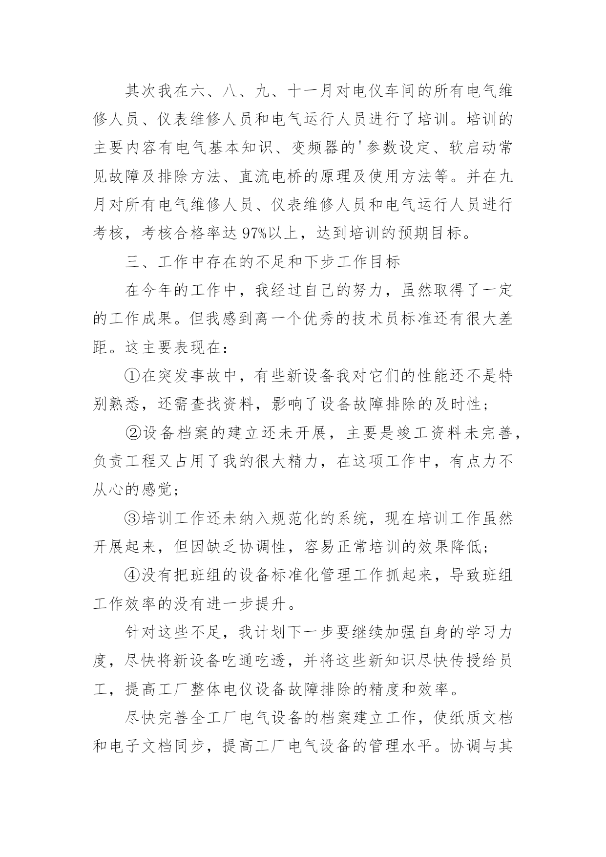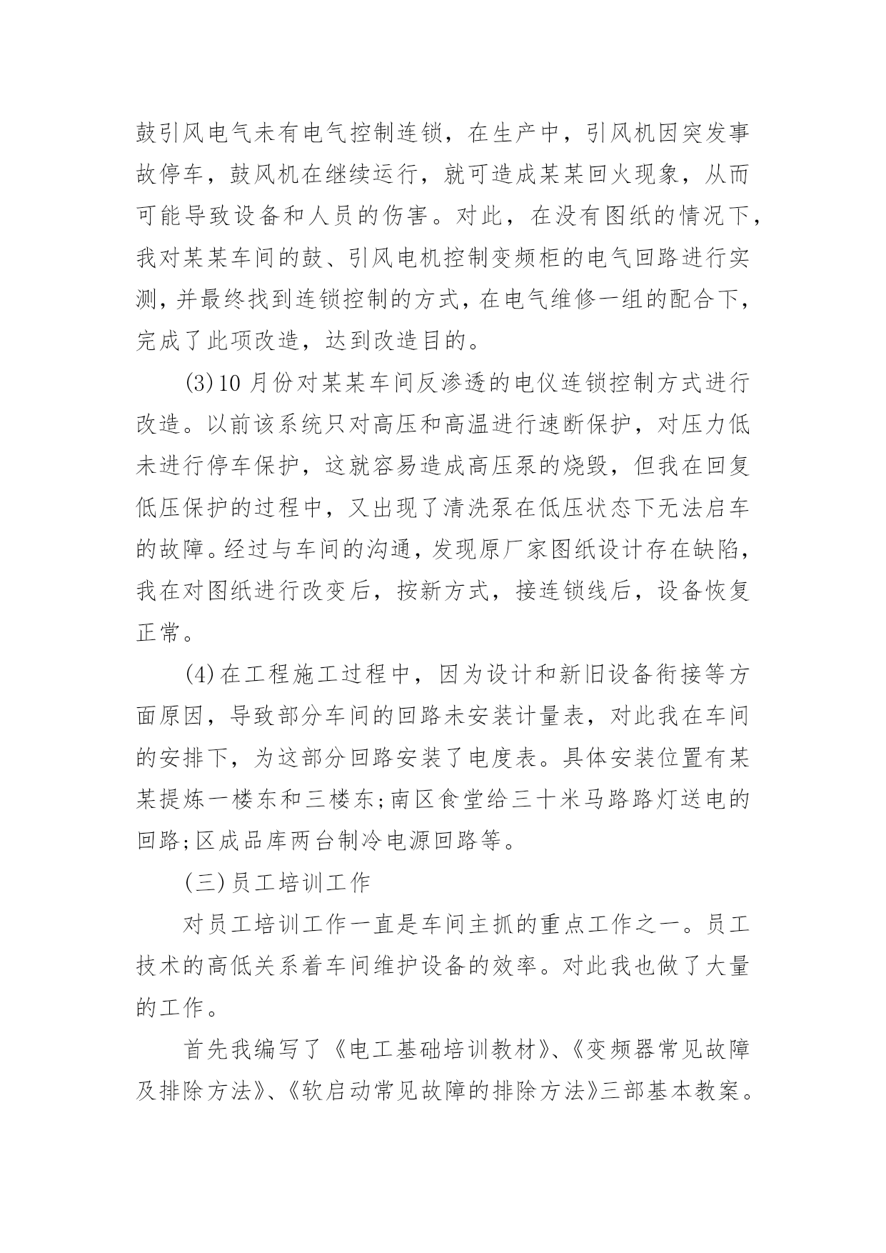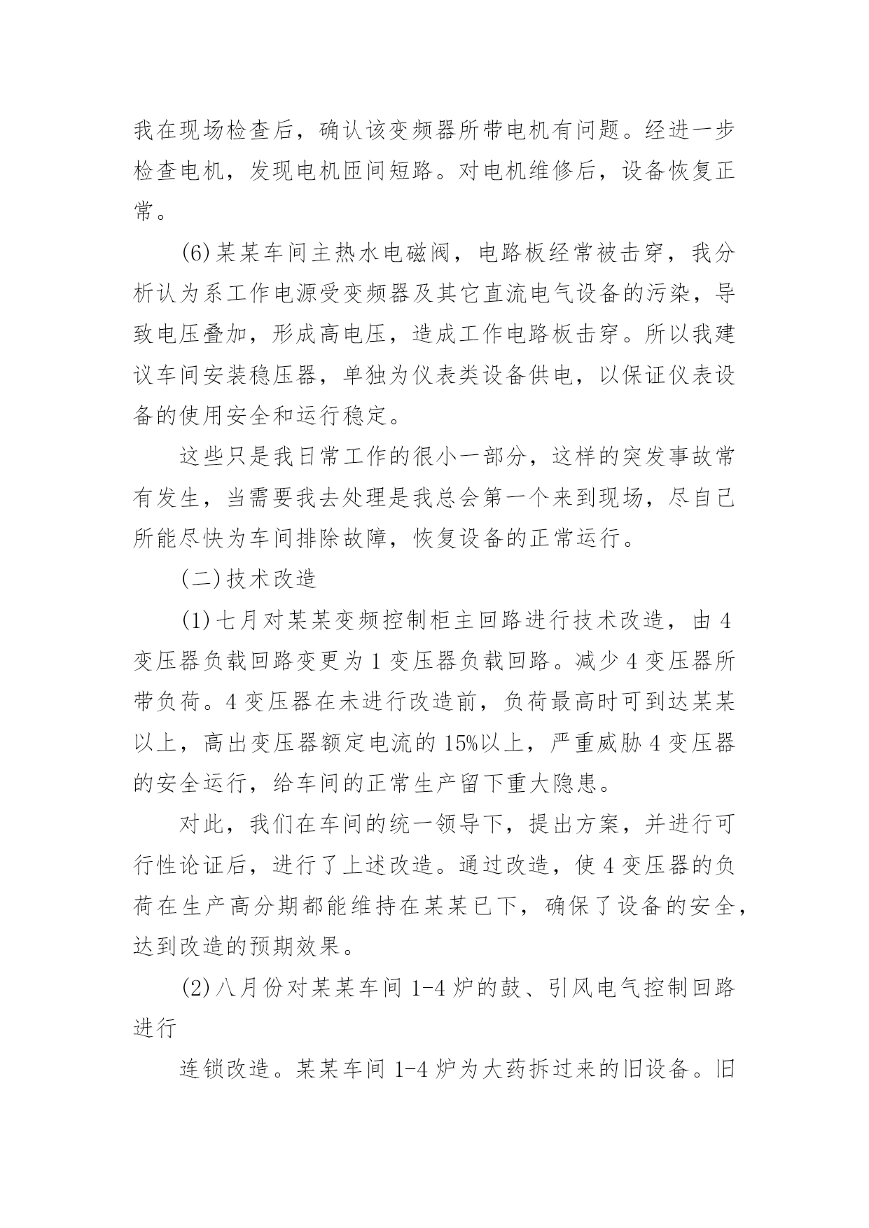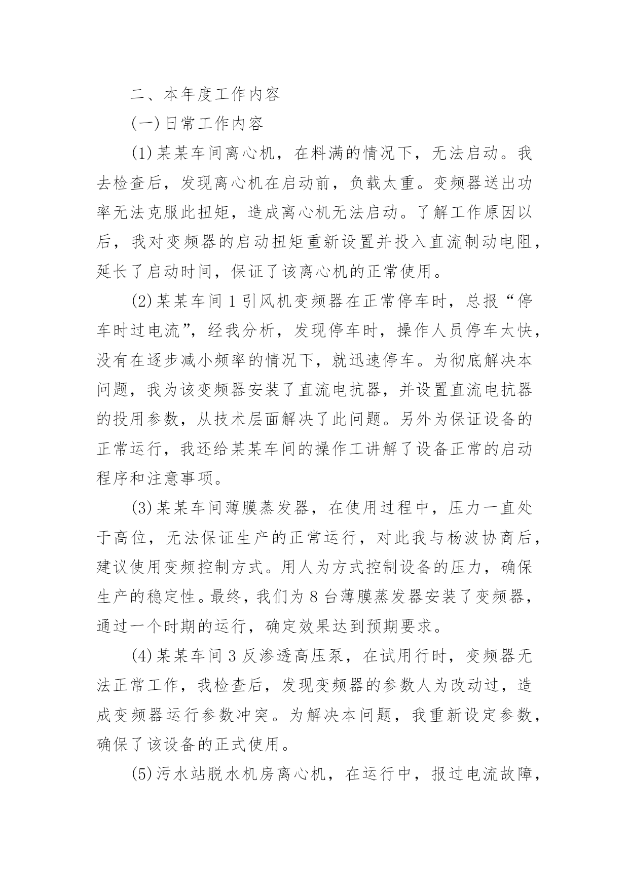 工厂技术员个人年终工作总结总结是对取得的成绩、存在的问题及得到的经验和教训等方面情况进行评价与描述的一种书面材料,通过它可以正确认识以往学习和工作中的优缺点,快快来写一份总结吧。那么总结要注意有什么内容呢?下面是小编为大家收集的工厂技术员个人年终工作总结,仅供参考,大家一起来看看吧。工厂技术员个人年终工作总结1自去年x月我来到某某区工作现今,已有一年多的时间了。在这一年中,我一直在项目部工作,负责电气施工的现场管理及技术指导工作,凭借自己的努力和领导的提携,从一名普通的电气监理,进而又被提拔到兼任电仪车间技术员一职。在这期间,我除负责对某某厂区所属的车间进行电气施工监理的工作之外,还承担电仪车间技术员应尽的职责。虽然工作量比以前要繁重的多,但给我提供了一个全面了解工厂整个电气系统的机会,加强了我对工厂电气系统的认知和掌握,并提高了我对一些系统发生各类事故时独立分析和处理问题的能力,为我进一步从事电气技术工作打下良好的基础。下面我对承担车间技术员工作进行总结。一、我对电仪技术员工作的认识及态度我被任命为电仪车间技术员之后,开始逐渐进入这一角色。虽然以前我在某某有限工厂承担电气设备员一职,对高低压电气技术及设备有着深入的了解和掌握。但自从来了新工地以后,在从事电气监理工作的过程中,感到要想当好一个合格电仪技术员的压力在增大。主要有以下几方面原因:一是工厂的电气设备数量庞大;二是电气设备种类繁多,涉及高低压输电、配电、送电和电气维修等方方面面;三是新旧设备混用增加了电气设备发生故障的几率和排除故障的难度;四是新上了110kva变电站,这是以前我未曾接触的新生事物;五是我有三、四年没有从事仪表工作了,我必须把以前漏掉的知识重新学习一次。面对这种压力,我感到自己责任的重大。为工厂电仪设备的正常稳定运行,提供技术支持,处理突发故障,就成了我的工作重点。我相信我有能力把这项工作做好,压力越大动力就越大。在从事电仪技术员初期,我对以前不熟悉的某某发酵车间、某某提炼车间、动力车间和制水站、某某变电站及某某开闭所的电气设备进行熟悉和了解。并对以前未接触过的电气设备收集使用说明书,熟悉其工作原理和参数的设定、维护保养及故障的排除方法。对有异议的问题与厂家和相关人员进行探讨,确保对相关设备掌握的彻底性。另为我与车间的维修组、运行组及仪表组进行沟通,了解现有员工的知识层次和对目前工作中存在那些技术问题需要解决。二、本年度工作内容(一)日常工作内容(1)某某车间离心机,在料满的情况下,无法启动。我去检查后,发现离心机在启动前,负载太重。变频器送出功率无法克服此扭矩,造成离心机无法启动。了解工作原因以后,我对变频器的启动扭矩重新设置并投入直流制动电阻,延长了启动时间,保证了该离心机的正常使用。(2)某某车间1引风机变频器在正常停车时,总报“停车时过电流”,经我分析,发现停车时,操作人员停车太快,没有在逐步减小频率的情况下,就迅速停车。为彻底解决本问题,我为该变频器安装了直流电抗器,并设置直流电抗器的投用参数,从技术层面解决了此问题。另外为保证设备的正常运行,我还给某某车间的操作工讲解了设备正常的启动程序和注意事项。(3)某某车间薄膜蒸发器,在使用过程中,压力一直处于高位,无法保证生产的正常运行,对此我与杨波协商后,建议使用变频控制方式。用人为方式控制设备的压力,确保生产的稳定性。最终,我们为8台薄膜蒸发器安装了变频器,通过一个时期的运行,确定效果达到预期要求。(4)某某车间3反渗透高压泵,在试用行时,变频器无法正常工作,我检查后,发现变频器的参数人为改动过,造成变频器运行参数冲突。为解决本问题,我重新设定参数,确保了该设备的正式使用。(5)污水站脱水机房离心机,在运行中,报过电流故障,我在现场检查后,确认该变频器所带电机有问题。经进一步检查电机,发现电机匝间短路。对电机维修后,设备恢复正常。(6)某某车间主热水电磁阀,电路板经常被击穿,我分析认为系工作电源受变频器及其它直流电气设备的污染,导致电压叠加,形成高电压,造成工作电路板击穿。所以我建议车间安装稳压器,单独为仪表类设备供电,以保证仪表设备的使用安全和运行稳定。这些只是我日常工作的很小一部分,这样的突发事故常有发生,当需要我去处理是我总会第一个来到现场,尽自己所能尽快为车间排除故障,恢复设备的正常运行。(二)技术改造(1)七月对某某变频控制柜主回路进行技术改造,由4变压器负载回路变更为1变压器负载回路。减少4变压器所带负荷。4变压器在未进行改造前,负荷最高时可到达某某以上,高出变压器额定电流的15%以上,严重威胁4变压器的安全运行,给车间的正常生产留下重大隐患。对此,我们在车间的统一领导下,提出方案,并进行可行性论证后,进行了上述改造。通过改造,使4变压器的负荷在生产高分期都能维持在某某已下,确保