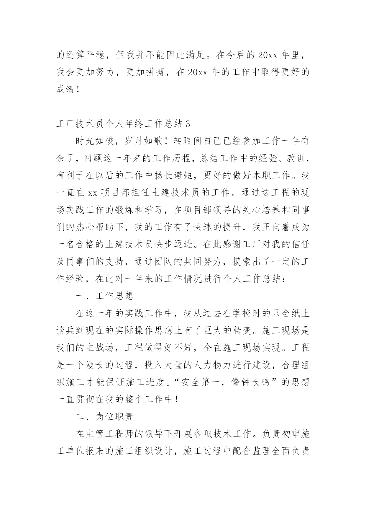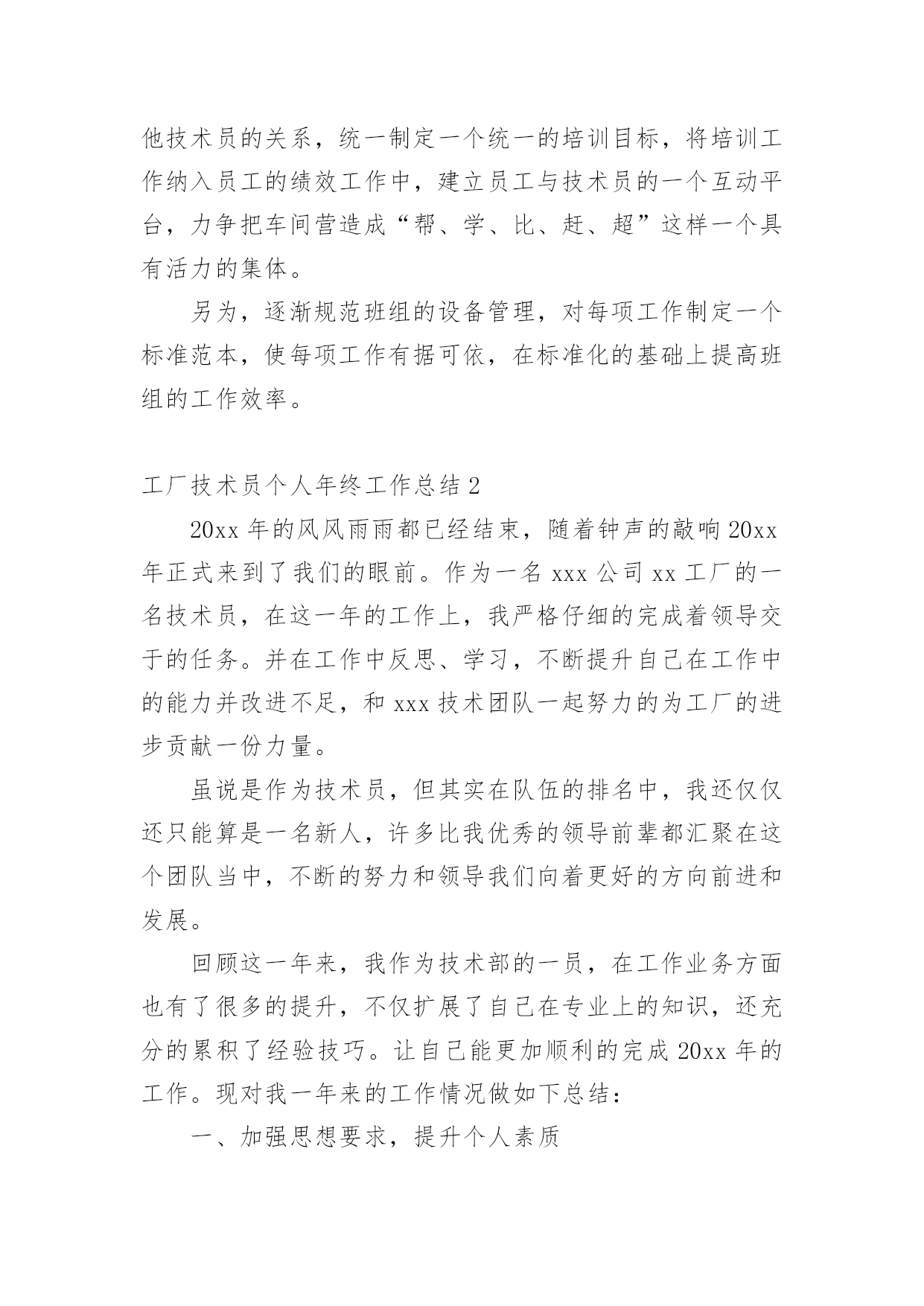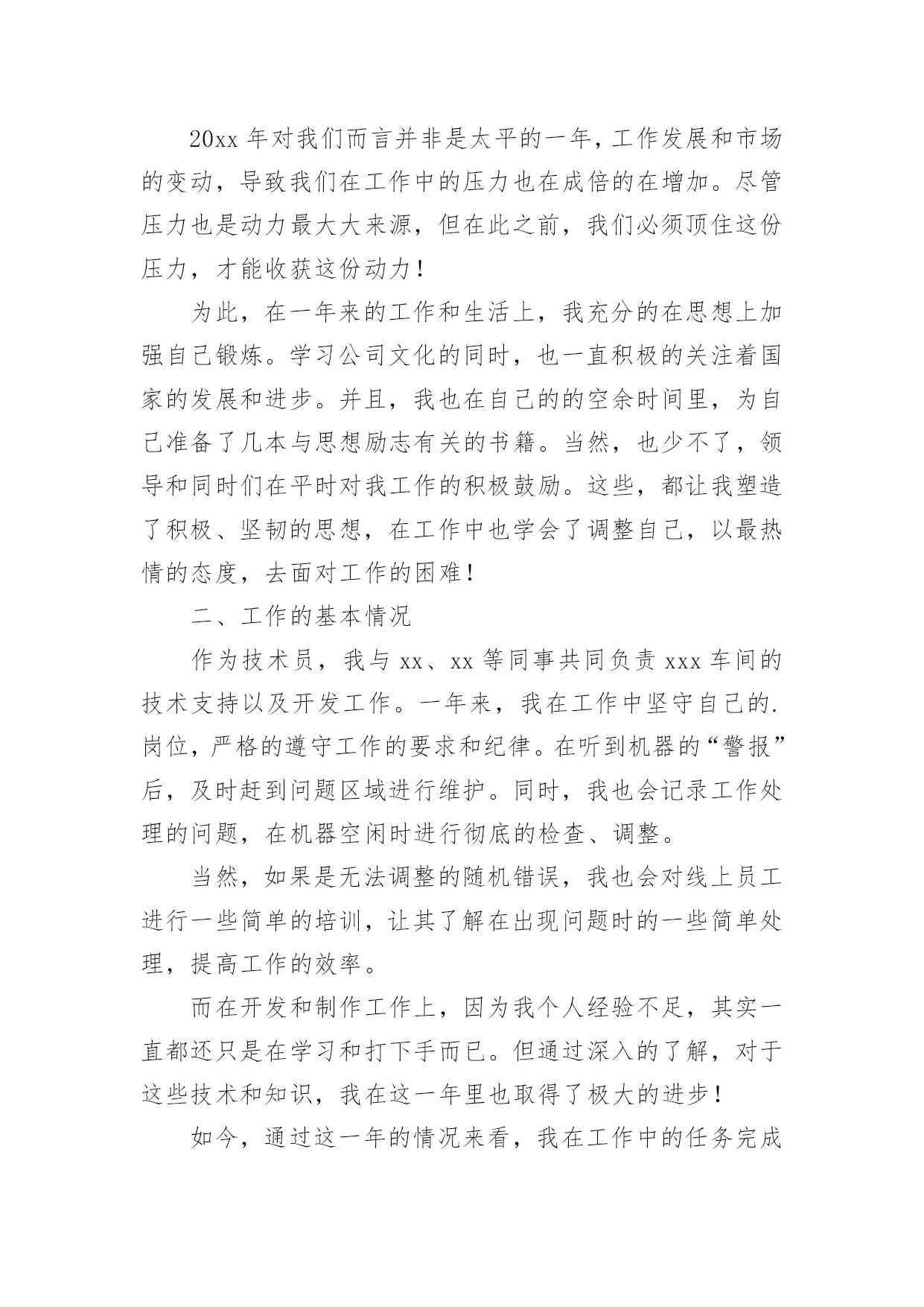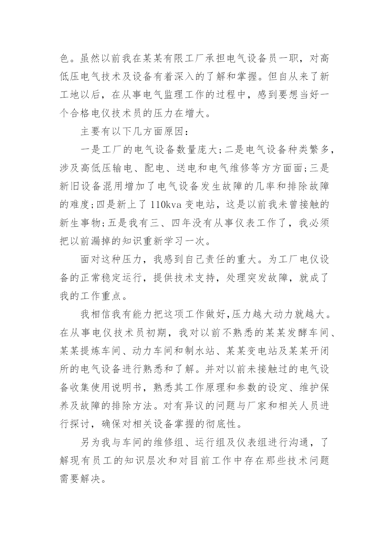 工厂技术员个人年终工作总结总结是对取得的成绩、存在的问题及得到的经验和教训等方面情况进行评价与描述的一种书面材料,通过它可以正确认识以往学习和工作中的优缺点,快快来写一份总结吧。那么总结要注意有什么内容呢?下面是小编为大家收集的工厂技术员个人年终工作总结,仅供参考,大家一起来看看吧。工厂技术员个人年终工作总结1自去年x月我来到某某区工作现今,已有一年多的时间了。在这一年中,我一直在项目部工作,负责电气施工的现场管理及技术指导工作,凭借自己的努力和领导的提携,从一名普通的电气监理,进而又被提拔到兼任电仪车间技术员一职。在这期间,我除负责对某某厂区所属的车间进行电气施工监理的工作之外,还承担电仪车间技术员应尽的职责。虽然工作量比以前要繁重的多,但给我提供了一个全面了解工厂整个电气系统的机会,加强了我对工厂电气系统的认知和掌握,并提高了我对一些系统发生各类事故时独立分析和处理问题的能力,为我进一步从事电气技术工作打下良好的基础。下面我对承担车间技术员工作进行总结。一、我对电仪技术员工作的认识及态度我被任命为电仪车间技术员之后,开始逐渐进入这一角色。虽然以前我在某某有限工厂承担电气设备员一职,对高低压电气技术及设备有着深入的了解和掌握。但自从来了新工地以后,在从事电气监理工作的过程中,感到要想当好一个合格电仪技术员的压力在增大。主要有以下几方面原因:一是工厂的电气设备数量庞大;二是电气设备种类繁多,涉及高低压输电、配电、送电和电气维修等方方面面;三是新旧设备混用增加了电气设备发生故障的几率和排除故障的难度;四是新上了110kva变电站,这是以前我未曾接触的新生事物;五是我有三、四年没有从事仪表工作了,我必须把以前漏掉的知识重新学习一次。面对这种压力,我感到自己责任的重大。为工厂电仪设备的正常稳定运行,提供技术支持,处理突发故障,就成了我的工作重点。我相信我有能力把这项工作做好,压力越大动力就越大。在从事电仪技术员初期,我对以前不熟悉的某某发酵车间、某某提炼车间、动力车间和制水站、某某变电站及某某开闭所的电气设备进行熟悉和了解。并对以前未接触过的电气设备收集使用说明书,熟悉其工作原理和参数的设定、维护保养及故障的排除方法。对有异议的问题与厂家和相关人员进行探讨,确保对相关设备掌握的彻底性。另为我与车间的维修组、运行组及仪表组进行沟通,了解现有员工的知识层次和对目前工作中存在那些技术问题需要解决。二、本年度工作内容(一)日常工作内容(1)某某车间离心机,在料满的情况下,无法启动。我去检查后,发现离心机在启动前,负载太重。变频器送出功率无法克服此扭矩,造成离心机无法启动。了解工作原因以后,我对变频器的启动扭矩重新设置并投入直流制动电阻,延长了启动时间,保证了该离心机的正常使用。(2)某某车间1引风机变频器在正常停车时,总报“停车时过电流”,经我分析,发现停车时,操作人员停车太快,没有在逐步减小频率的情况下,就迅速停车。为彻底解决本问题,我为该变频器安装了直流电抗器,并设置直流电抗器的投用参数,从技术层面解决了此问题。另外为保证设备的正常运行,我还给某某车间的操作工讲解了设备正常的启动程序和注意事项。(3)某某车间薄膜蒸发器,在使用过程中,压力一直处于高位,无法保证生产的正常运行,对此我与杨波协商后,建议使用变频控制方式。用人为方式控制设备的压力,确保生产的稳定性。最终,我们为8台薄膜蒸发器安装了变频器,通过一个时期的运行,确定效果达到预期要求。(4)某某车间3反渗透高压泵,在试用行时,变频器无法正常工作,我检查后,发现变频器的参数人为改动过,造成变频器运行参数冲突。为解决本问题,我重新设定参数,确保了该设备的正式使用。(5)污水站脱水机房离心机,在运行中,报过电流故障,我在现场检查后,确认该变频器所带电机有问题。经进一步检查电机,发现电机匝间短路。对电机维修后,设备恢复正常。(6)某某车间主热水电磁阀,电路板经常被击穿,我分析认为系工作电源受变频器及其它直流电气设备的污染,导致电压叠加,形成高电压,造成工作电路板击穿。所以我建议车间安装稳压器,单独为仪表类设备供电,以保证仪表设备的使用安全和运行稳定。这些只是我日常工作的很小一部分,这样的突发事故常有发生,当需要我去处理是我总会第一个来到现场,尽自己所能尽快为车间排除故障,恢复设备的正常运行。(二)技术改造(1)七月对某某变频控制柜主回路进行技术改造,由4变压器负载回路变更为1变压器负载回路。减少4变压器所带负荷。4变压器在未进行改造前,负荷最高时可到达某某以上,高出变压器额定电流的15%以上,严重威胁4变压器的安全运行,给车间的正常生产留下重大隐患。对此,我们在车间的统一领导下,提出方案,并进行可行性论证后,进行了上述改造。通过改造,使4变压器的负荷在生产高分期都能维持在某某已下,确保