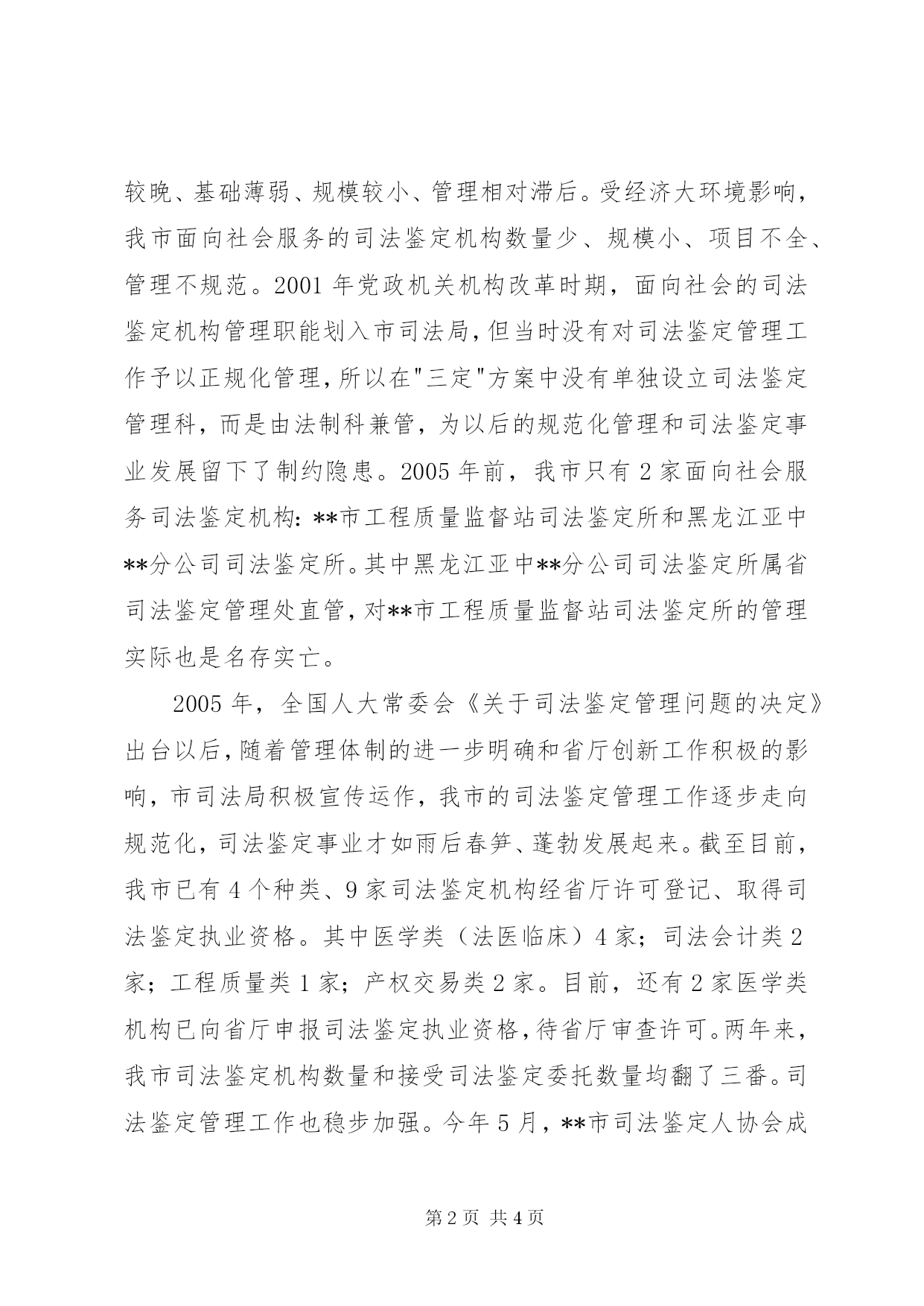 第PAGE\*Arabic\*MERGEFORMAT4页共NUMPAGES\*MERGEFORMAT4页司法鉴定工作现状调研报告**市面向社会服务司法鉴定机构如雨后春笋、蓬勃发展起来,司法鉴定管理模式在我市呈现出积极探索、稳妥推进的新局面。但我市也存在着司法鉴定的运行机制较为混乱、司法鉴定从业人员的整体素质不高、司法鉴定人员的管理机制不够科学、合理等问题。为此,笔者根据工作经验和体会,对发展我市司法鉴定事业提出了一些主要对策和建议。【关键词】司法鉴定;现状;问题;对策司法鉴定是在诉讼过程中,对于案件中的某些专门性问题,按诉讼法的规定,经当事人申请,司法机关决定,或司法机关主动决定,指派、聘请具有专门知识的鉴定人,运用科学技术手段,对专门性问题做出判断结论的一种核实证据的活动。简单地说,司法鉴定就是侦查、起诉、审判等诉讼活动中依法进行的鉴定。那么什么是面向社会服务的司法鉴定活动。除司法机关内部鉴定机构因业务需要而进行的无偿司法鉴定活动之外的其他司法鉴定活动,均为面向社会服务的司法鉴定活动。目前,司法鉴定管理模式在我市呈现出积极探索、稳妥推进的新局面。现笔者就我市司法鉴定工作的发展及现状、存在主要问题、完善对策建议作尝试性的探讨。一、我市司法鉴定工作的发展和现状**市面向社会服务司法鉴定工作同全省其他地市相比起步较晚、基础薄弱、规模较小、管理相对滞后。受经济大环境影响,我市面向社会服务的司法鉴定机构数量少、规模小、项目不全、管理不规范。2001年党政机关机构改革时期,面向社会的司法鉴定机构管理职能划入市司法局,但当时没有对司法鉴定管理工作予以正规化管理,所以在"三定"方案中没有单独设立司法鉴定管理科,而是由法制科兼管,为以后的规范化管理和司法鉴定事业发展留下了制约隐患。2005年前,我市只有2家面向社会服务司法鉴定机构:**市工程质量监督站司法鉴定所和黑龙江亚中**分公司司法鉴定所。其中黑龙江亚中**分公司司法鉴定所属省司法鉴定管理处直管,对**市工程质量监督站司法鉴定所的管理实际也是名存实亡。2005年,全国人大常委会《关于司法鉴定管理问题的决定》出台以后,随着管理体制的进一步明确和省厅创新工作积极的影响,市司法局积极宣传运作,我市的司法鉴定管理工作逐步走向规范化,司法鉴定事业才如雨后春笋、蓬勃发展起来。截至目前,我市已有4个种类、9家司法鉴定机构经省厅许可登记、取得司法鉴定执业资格。其中医学类(法医临床)4家;司法会计类2家;工程质量类1家;产权交易类2家。目前,还有2家医学类机构已向省厅申报司法鉴定执业资格,待省厅审查许可。两年来,我市司法鉴定机构数量和接受司法鉴定委托数量均翻了三番。司法鉴定管理工作也稳步加强。今年5月,**市司法鉴定人协会成立,对面向社会服务司法鉴定的管理由单一的行政管理模式转变为行政管理和行业管理双管齐下的管理模式。虽然如此,无论是在司法鉴定机构数量和人员规模、业务开展上,还是在管理模式和工作力度上,我市目前在全省还是处于后几位。二、我市司法鉴定工作存在的主要问题(一)司法鉴定机构的部门设置和运行机制亟待规范首先,当前我市除由司法行政部门管理的面向社会司法鉴定机构外,还存在一些鉴定机构或部门,有些是司法机构内部设置的,有些是行政机关的附属单位,有些本身就是行政机关,公安、检察及卫生、物价等部门对外服务的鉴定机构各级都有。只要机构成立,不管鉴定人员技术、条件是否合格、齐全,都可以挂牌营业,出具鉴定结论。这种行为和做法明显违反全国人大常委会《关于司法鉴定管理问题的决定》的规定。另外,我市司法鉴定的运行机制也较为混乱。当前,尤其是公、检、法等不同系统、不同层次的司法鉴定机构之间受理鉴定的范围不明确,没有一套科学完备的有关鉴定受理的统一制度。在司法实践中,各系统、各层次的鉴定机构的鉴定受理工作普遍存在着随意性、混乱性和重复性,也使得司法鉴定工作的秩序出现了混乱,容易对案件的起诉和审理产生负面的效应。(二)司法鉴定从业人员素质、司法鉴定公信力还需加强首先,由于法律对从事司法鉴定的机构和人员准入资格要求规定不够严格,所以,受委托从事司法鉴定的社会专业鉴定组织仪器设备标准不等,鉴定人员水平也参差不齐,又因为缺乏严密的操作规则和监督制度,难以保证鉴定结论的客观、公正。鉴定人员素质良莠不齐,司法鉴定整体水平不高。由于鉴定机构多而杂乱,难免鉴定人员中有滥竽充数者,特别是依附国家机关的庇护而生存的鉴定机构,其人员素质更令人堪忧,司法鉴定从业人员的整体素质不高,很难形成鉴定人队伍的专业化和职业化。其次,一些鉴定单位或鉴定人为追求经济利益,曲意迎合一些当事人或办案人员的不合理要求,扭曲了司法鉴