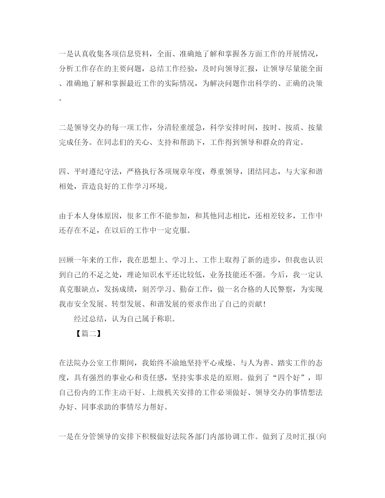 此资料由网络收集而来,如有侵权请告知上传者立即删除。资料共分享,我们负责传递知识。公务员工作年终总结范文【篇一】XX年,我坚持以xx重要思想和科学发展观为指导,认真学习xx大、xx届x中全会精神,在各级领导的带领下,认真完成了各项工作任务。现总结如下:一、自觉加强党性锻炼,党性修养和政治思想觉悟进一步提高。一年来,我始终坚持科学发展观,以正确的世界观、人生观、价值观,指导自己的学习、工作和生活实践,在思想上积极构筑抵御资产阶级民主和自由化、拜金主义、自由主义等一切腐朽思想侵蚀的坚固防线。认真贯彻执行党的路线、方针、政策,工作积极主动,不畏艰难,尽职尽责,在工作岗位上作出力所能及的贡献。二、强化理论和业务学习,不断提高自身综合素质。重视加强理论和业务知识学习,在工作中,坚持一边工作一边学习,不断提高自身综合素质水平。一是认真学习科学发展观,深刻领会其科学内涵,增强自己实践科学发展观的自觉性和坚定性;认真学习党的xx大及xx届三中全会精神,自觉坚持以党的xx大精神为指导。二是认真学习工作业务知识。在学习方法上做到在重点中找重点,抓住重点,并结合自己不足之处,有针对性地进行学习,不断提高自己业务工作能力。三是认真学习法律知识,结合自己工作实际特点,选择性地开展学习,进一步增强法制意识和法制观念。三、努力工作,按时完成工作任务。始终坚持严格要求自己,勤奋努力,时刻牢记党全心全意为人民服务的宗旨,努力实践“xxxx”重要思想,在自己平凡而普通的工作岗位上,努力做好本职工作。在具体工作中,我努力做好服务工作,当好参谋助手:一是认真收集各项信息资料,全面、准确地了解和掌握各方面工作的开展情况,分析工作存在的主要问题,总结工作经验,及时向领导汇报,让领导尽量能全面、准确地了解和掌握最近工作的实际情况,为解决问题作出科学的、正确的决策。二是领导交办的每一项工作,分清轻重缓急,科学安排时间,按时、按质、按量完成任务。在同志们的关心、支持和帮助下,工作得到领导和群众的肯定。四、平时遵纪守法,严格执行各项规章年度,尊重领导,团结同志,与大家和谐相处,营造良好的工作学习环境。由于本人身体原因,很多工作不能参加,和其他同志相比,还相差较多,工作中还存在不足,在以后的工作中一定克服。回顾一年来的工作,我在思想上、学习上、工作上取得了新的进步,但我也认识到自己的不足之处,理论知识水平还比较低,业务技能还不强。今后,我一定认真克服缺点,发扬成绩,刻苦学习、勤奋工作,做一名合格的人民警察,为实现我市安全发展、转型发展、和谐发展的要求作出了自己的贡献!经过总结,认为自己属于称职。【篇二】在法院办公室工作期间,我始终不渝地坚持平心戒燥、与人为善、踏实工作的态度,具有强烈的事业心和责任感,坚持实事求是的原则。做到了“四个好”,即自己份内的工作主动干好、上级机关安排的工作必须做好、领导交办的事情想法办好、同事求助的事情尽力帮好。一是在分管领导的安排下积极做好法院各部门内部协调工作。做到了及时汇报(向上级机关和领导)、及时反馈(种类情况和信息)、及时通知(各种会议和活动),为有效地促进法院以审判为主的各项工作的顺利开展作出了自己的贡献。二是从严要求自己,认真对待每一项工作,发挥好领导的参谋助手作用。一年来,所负责的印章管理、外事接待工作没有出现任何问题。三是做好新闻外宣工作。全年撰写新闻信息稿件xx篇,被xx法院网、xx法院网、广西人民广播电台等各媒体采用xx篇,投稿被采用率100%。四是做好其他办公室工作。