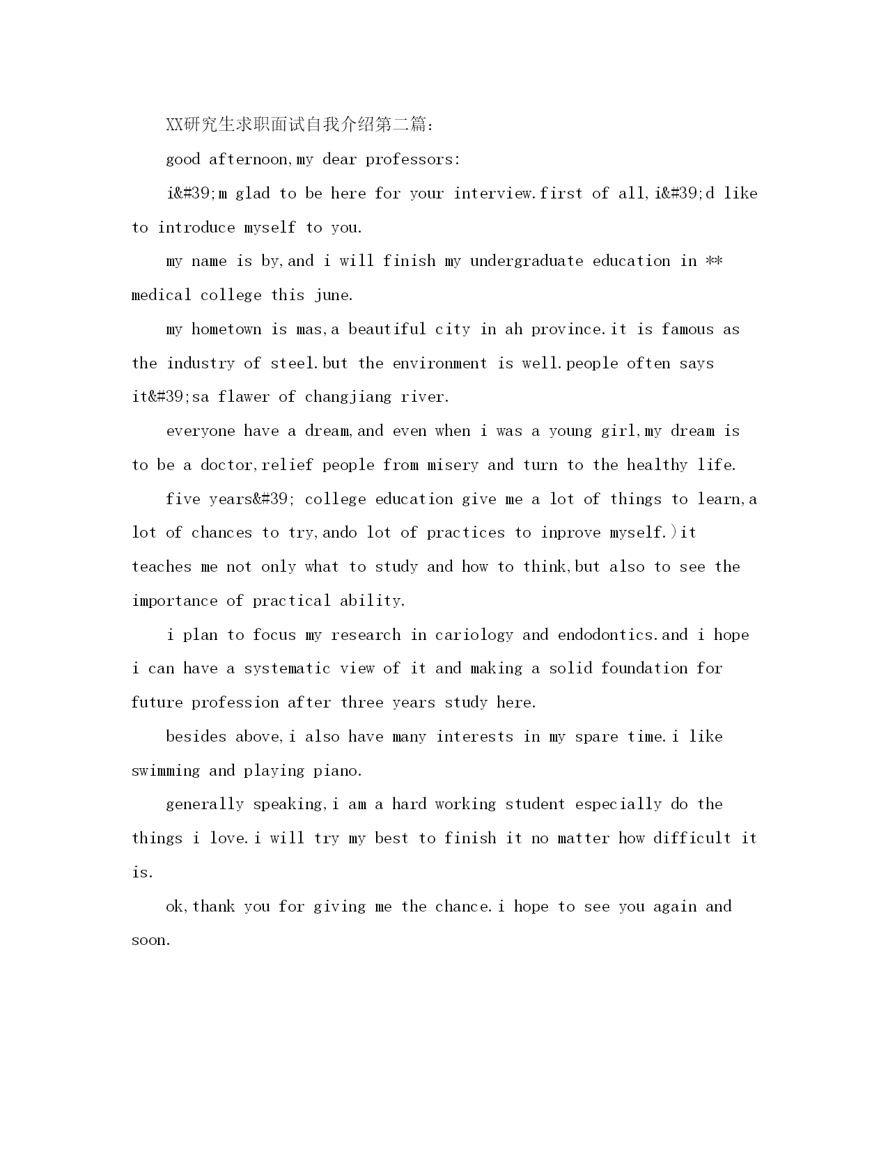 此资料由网络收集而来,如有侵权请告知上传者立即删除。资料共分享,我们负责传递知识。2020研究生求职面试自我介绍XX研究生求职面试自我介绍第一篇:各位领导好!首先谢谢你们给我这样一个机会,是我莫大的殊荣。我是xx学校x级xx专业的学生。大学生活即将结束,一个新开始即将来到,等待我的是新的挑战。四年的大学生活充实而紧张,我努力把自己培养成为一名社会所需要的人才,我个性上,比较诚实、乐观、热情,具有团队精神,踏实努力,很强的责任心大学四年是我思想、知识结构生长成熟的四年。在大学期间,我自己认真学习专业技能,所以我掌握了较强的专业知识,并把理论知识运用到实践中去,期末总评成绩名列年级前茅。但是我不满足于现状,不断挑战自己,顺利通过英语四、六级考试,全国计算机二级考试,等等称号。学习同时我还不断培养业余爱好,入校我便参加了某某协会,由干事到副会长,这是对我的付出与努力的肯定。组织开展一系列活动丰富校园生活,被评选为优秀学生社团,受到师生首肯。此外,在担任班团支书和辅导员助理期间积极,为同学服务,表现出色,贡献卓越荣,获校级优秀学生干部称号。大学间我以优异的成绩与表现,光荣地加入了中国共产党。加入这个先进的团体,是我人生的一次升华。在保先教育中,我更是严格要求自己,带领身边同学,一起进步(如果是党员的加入)。社会实践方面:在xxxx年暑假,我在xxxx实习,通过做xxx的工作使我更加深刻认识到,一定要投入到社会这所大学校自己才会真正地长大:存在一颗好学的心才会不断的完善自我;用感恩的心来面对周围的世界,生活才会美好!回顾过去,自己仍然有不少缺点,如创新能力还不够强,有时候不懂得坚持,但我会尽可能地在以后的学习和生活中着重提高这些方面的能力,争取做到各方面都具有新素质的人才。XX研究生求职面试自我介绍第二篇:goodafternoon,mydearprofessors:i'mgladtobehereforyourinterview.firstofall,i'dliketointroducemyselftoyou.mynameisby,andiwillfinishmyundergraduateeducationin**medicalcollegethisjune.myhometownismas,abeautifulcityinahprovince.itisfamousastheindustryofsteel.buttheenvironmentiswell.peopleoftensaysit'saflawerofchangjiangriver.everyonehaveadream,andevenwheniwasayounggirl,mydreamistobeadoctor,reliefpeoplefrommiseryandturntothehealthylife.fiveyears'collegeeducationgivemealotofthingstolearn,alotofchancestotry,andolotofpracticestoinprovemyself.)itteachesmenotonlywhattostudyandhowtothink,butalsotoseetheimportanceofpracticalability.iplantofocusmyresearchincariologyandendodontics.andihopeicanhaveasystematicviewofitandmakingasolidfoundationforfutureprofessionafterthreeyearsstudyhere.besidesabove,ialsohavemanyinterestsinmysparetime.ilikeswimmingandplayingpiano.generallyspeaking,iamahardworkingstudentespeciallydothethingsilove.iwilltrymybesttofinishitnomatterhowdifficultitis.ok,thankyouforgivingmethechance.ihopetoseeyouagainandsoon.