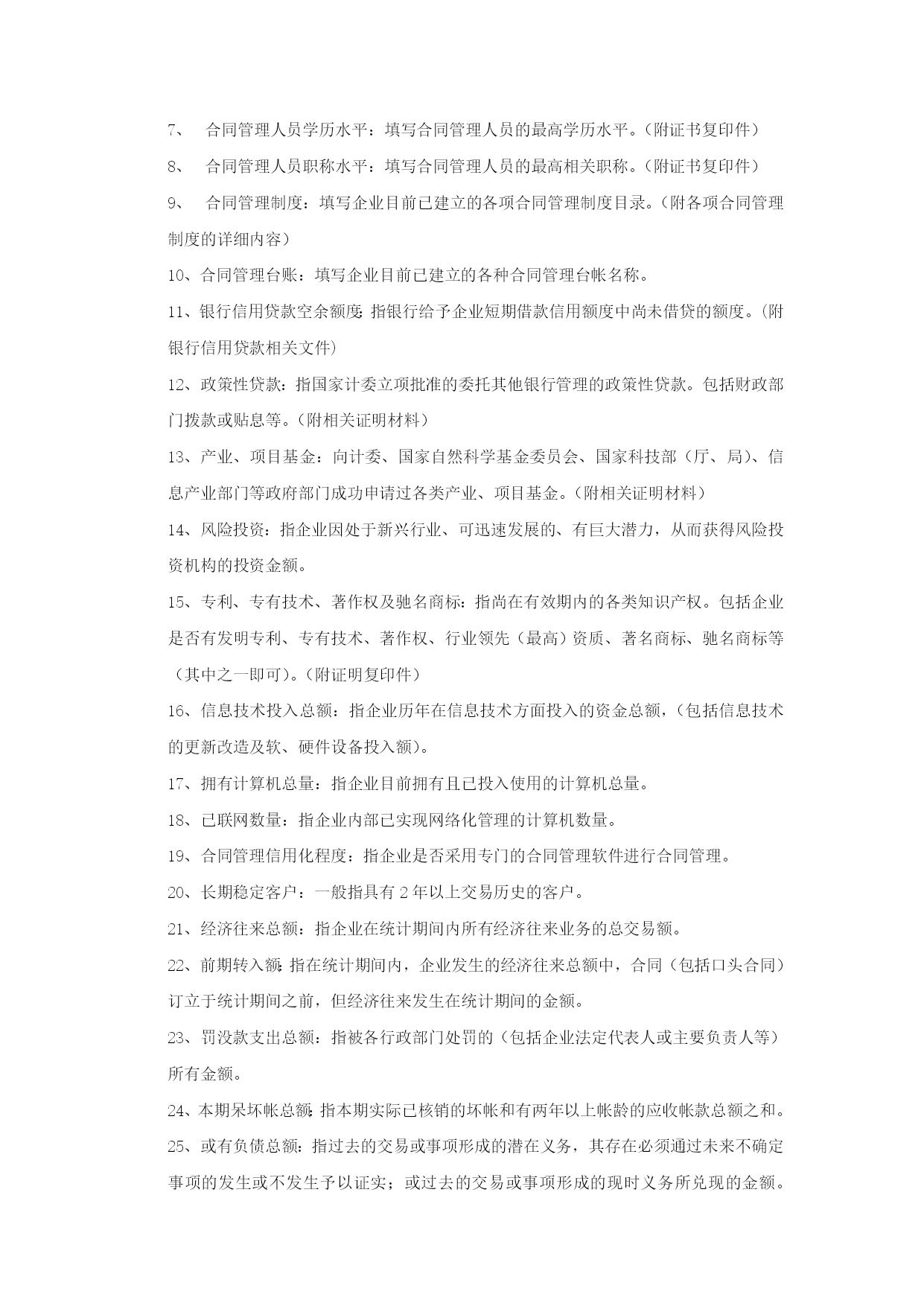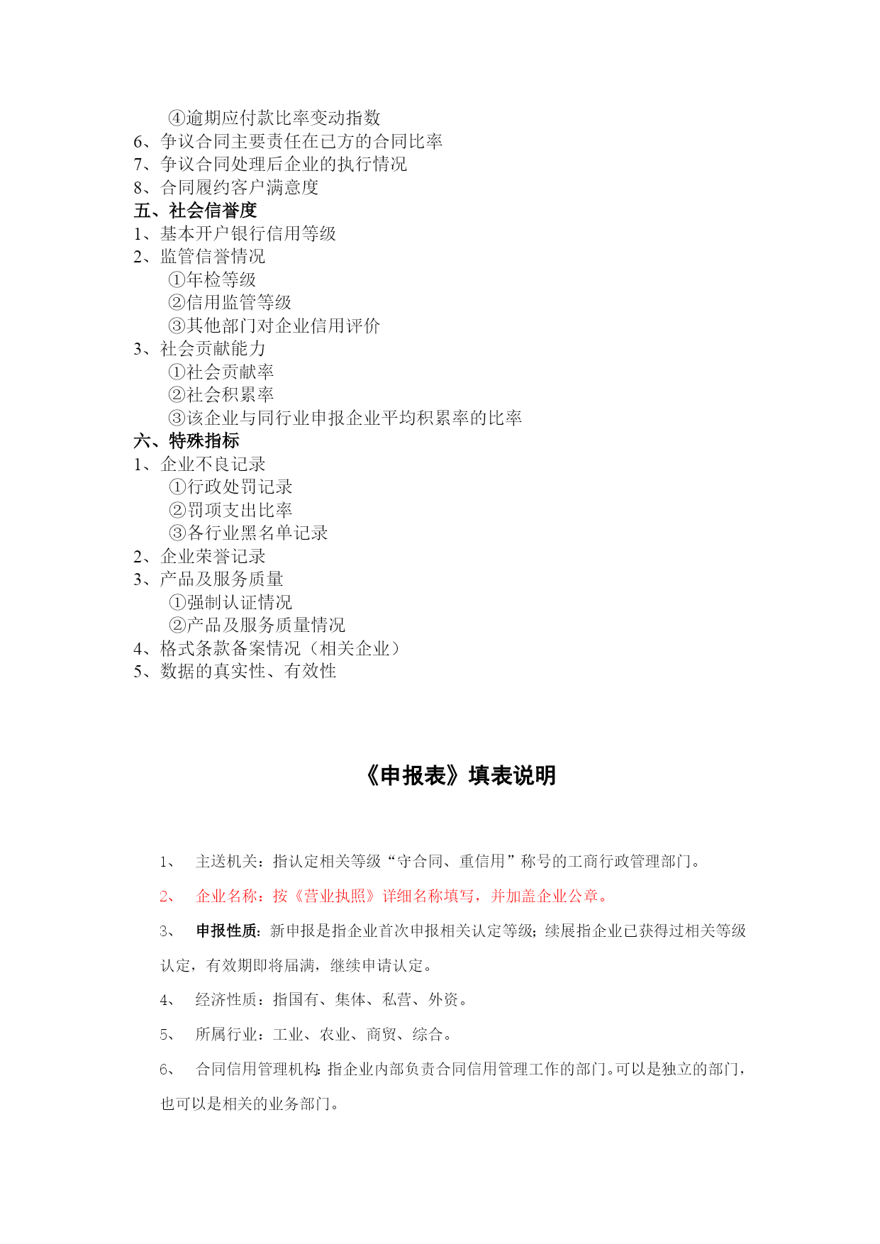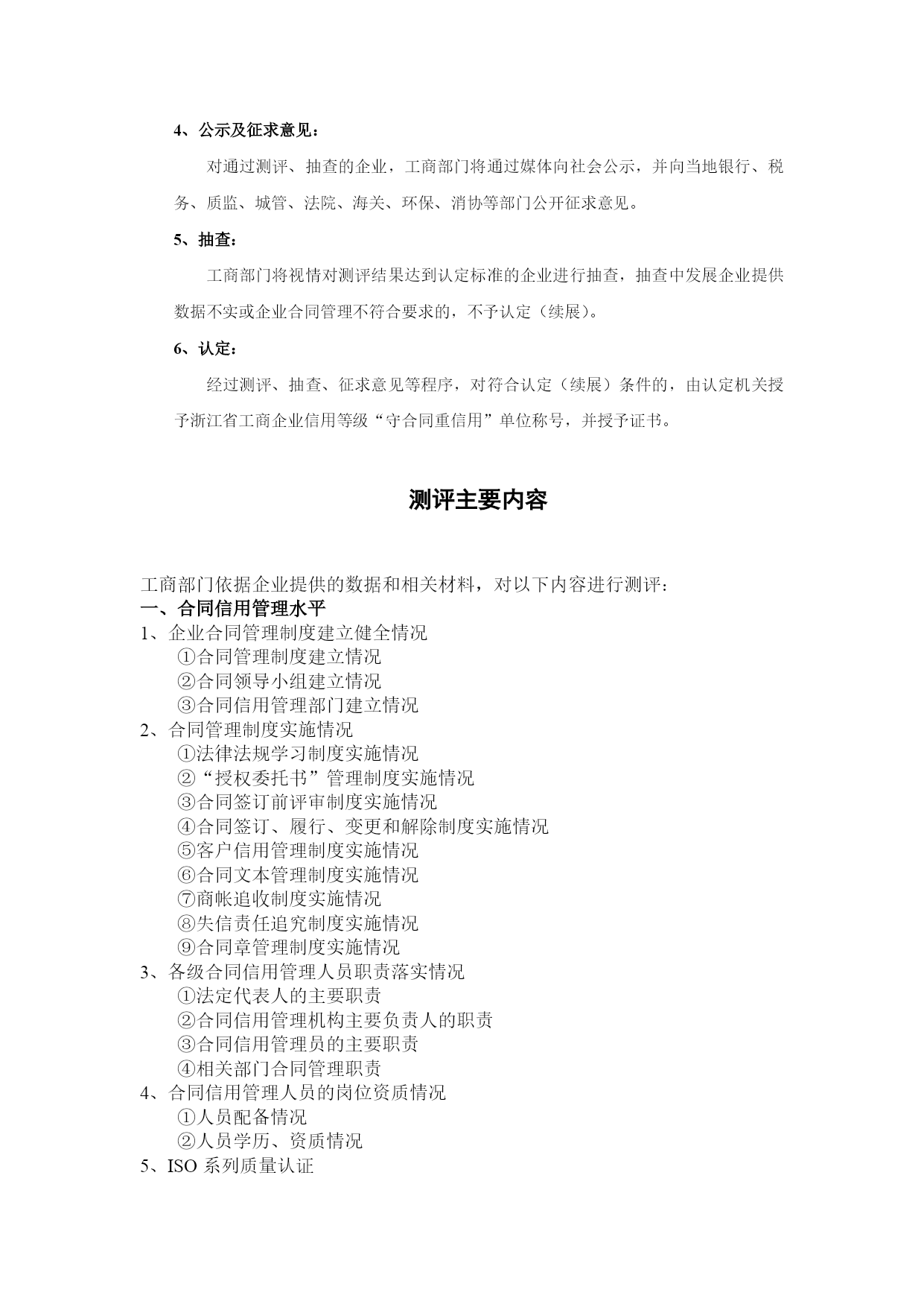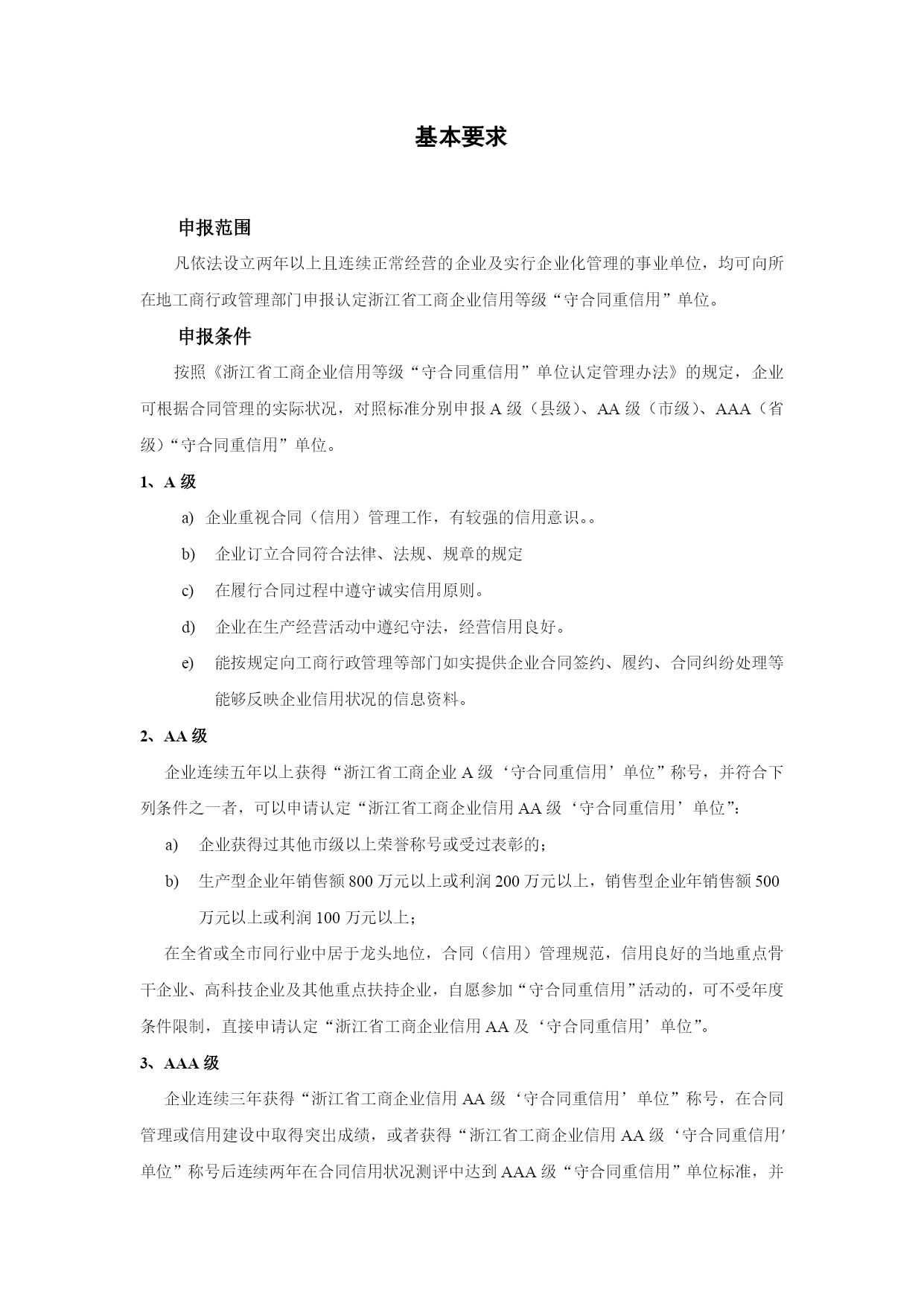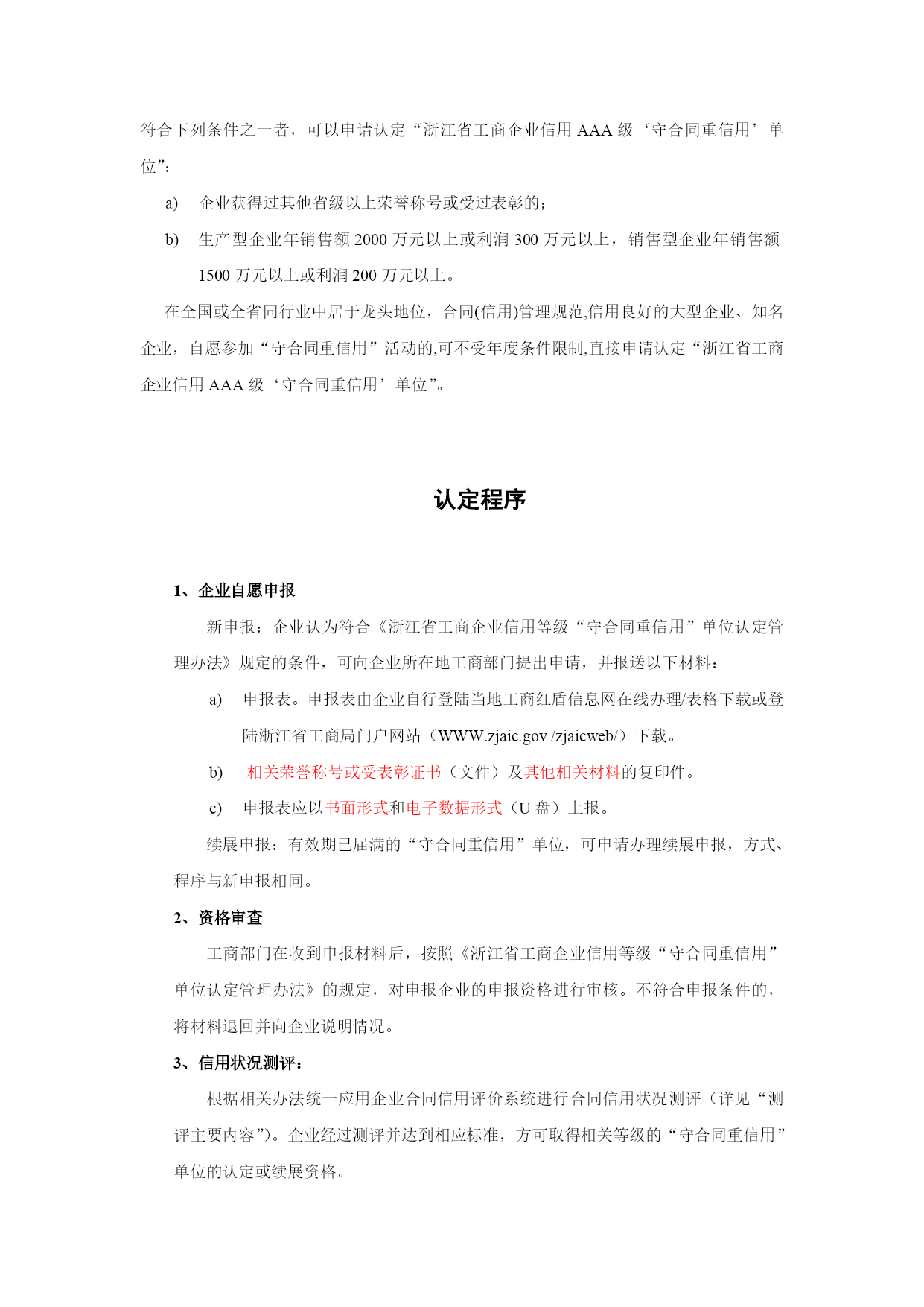 守合同重信用《工商局-申报指南》最新文档(可以直接使用,可编辑最新文档,欢迎下载)浙江省工商企业信用等级“守合同重信用”单位申报指南(申报前请认真阅读)浙江省工商行政管理局基本要求申报范围凡依法设立两年以上且连续正常经营的企业及实行企业化管理的事业单位,均可向所在地工商行政管理部门申报认定浙江省工商企业信用等级“守合同重信用”单位。申报条件按照《浙江省工商企业信用等级“守合同重信用”单位认定管理办法》的规定,企业可根据合同管理的实际状况,对照标准分别申报A级(县级)、AA级(市级)、AAA(省级)“守合同重信用”单位。1、A级企业重视合同(信用)管理工作,有较强的信用意识。。企业订立合同符合法律、法规、规章的规定在履行合同过程中遵守诚实信用原则。企业在生产经营活动中遵纪守法,经营信用良好。能按规定向工商行政管理等部门如实提供企业合同签约、履约、合同纠纷处理等能够反映企业信用状况的信息资料。2、AA级企业连续五年以上获得“浙江省工商企业A级‘守合同重信用’单位”称号,并符合下列条件之一者,可以申请认定“浙江省工商企业信用AA级‘守合同重信用’单位”:企业获得过其他市级以上荣誉称号或受过表彰的;生产型企业年销售额800万元以上或利润200万元以上,销售型企业年销售额500万元以上或利润100万元以上;在全省或全市同行业中居于龙头地位,合同(信用)管理规范,信用良好的当地重点骨干企业、高科技企业及其他重点扶持企业,自愿参加“守合同重信用”活动的,可不受年度条件限制,直接申请认定“浙江省工商企业信用AA及‘守合同重信用’单位”。3、AAA级企业连续三年获得“浙江省工商企业信用AA级‘守合同重信用’单位”称号,在合同管理或信用建设中取得突出成绩,或者获得“浙江省工商企业信用AA级‘守合同重信用'单位”称号后连续两年在合同信用状况测评中达到AAA级“守合同重信用”单位标准,并符合下列条件之一者,可以申请认定“浙江省工商企业信用AAA级‘守合同重信用’单位”:企业获得过其他省级以上荣誉称号或受过表彰的;生产型企业年销售额2000万元以上或利润300万元以上,销售型企业年销售额1500万元以上或利润200万元以上。在全国或全省同行业中居于龙头地位,合同(信用)管理规范,信用良好的大型企业、知名企业,自愿参加“守合同重信用”活动的,可不受年度条件限制,直接申请认定“浙江省工商企业信用AAA级‘守合同重信用’单位”。认定程序1、企业自愿申报新申报:企业认为符合《浙江省工商企业信用等级“守合同重信用”单位认定管理办法》规定的条件,可向企业所在地工商部门提出申请,并报送以下材料:申报表。申报表由企业自行登陆当地工商红盾信息网在线办理/表格下载或登陆浙江省工商局门户网站(WWW.zjaic.gov/zjaicweb/)下载。相关荣誉称号或受表彰证书(文件)及其他相关材料的复印件。申报表应以书面形式和电子数据形式(U盘)上报。续展申报:有效期已届满的“守合同重信用”单位,可申请办理续展申报,方式、程序与新申报相同。2、资格审查工商部门在收到申报材料后,按照《浙江省工商企业信用等级“守合同重信用”单位认定管理办法》的规定,对申报企业的申报资格进行审核。不符合申报条件的,将材料退回并向企业说明情况。3、信用状况测评:根据相关办法统一应用企业合同信用评价系统进行合同信用状况测评(详见“测评主要内容”)。企业经过测评并达到相应标准,方可取得相关等级的“守合同重信用”单位的认定或续展资格。4、公示及征求意见:对通过测评、抽查的企业,工商部门将通过媒体向社会公示,并向当地银行、税务、质监、城管、法院、海关、环保、消协等部门公开征求意见。5、抽查:工商部门将视情对测评结果达到认定标准的企业进行抽查,抽查中发展企业提供数据不实或企业合同管理不符合要求的,不予认定(续展)。6、认定:经过测评、抽查、征求意见等程序,对符合认定(续展)条件的,由认定机关授予浙江省工商企业信用等级“守合同重信用”单位称号,并授予证书。测评主要内容工商部门依据企业提供的数据和相关材料,对以下内容进行测评:一、合同信用管理水平1、企业合同管理制度建立健全情况①合同管理制度建立情况②合同领导小组建立情况③合同信用管理部门建立情况2、合同管理制度实施情况①法律法规学习制度实施情况②“授权委托书”管理制度实施情况③合同签订前评审制度实施情况④合同签订、履行、变更和解除制度实施情况⑤客户信用管理制度实施情况⑥合同文本管理制度实施情况⑦商帐追收制度实施情况⑧失信责任追究制度实施情况⑨合同章管理制度实施情况3、各级合同信用管理人员职责落实情况