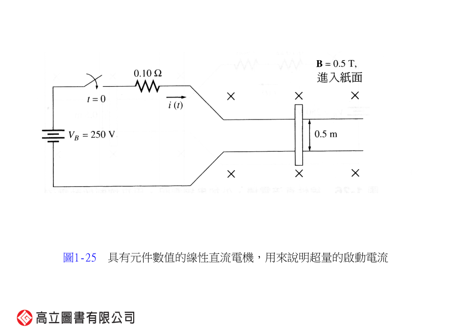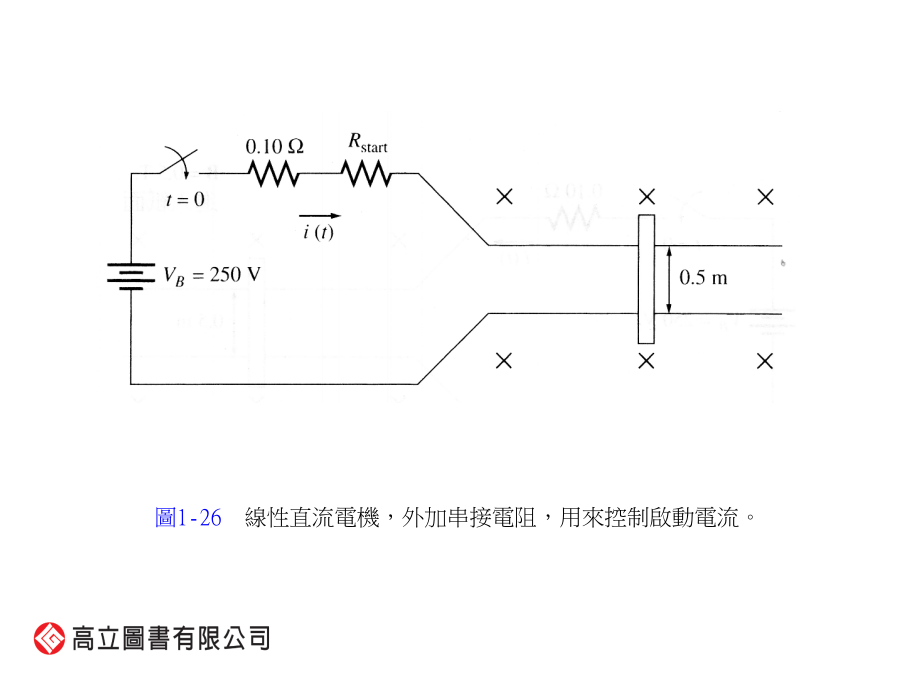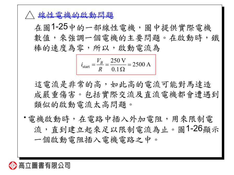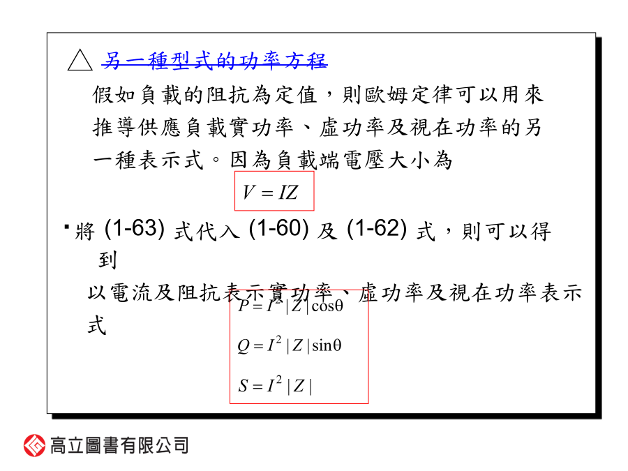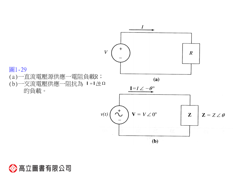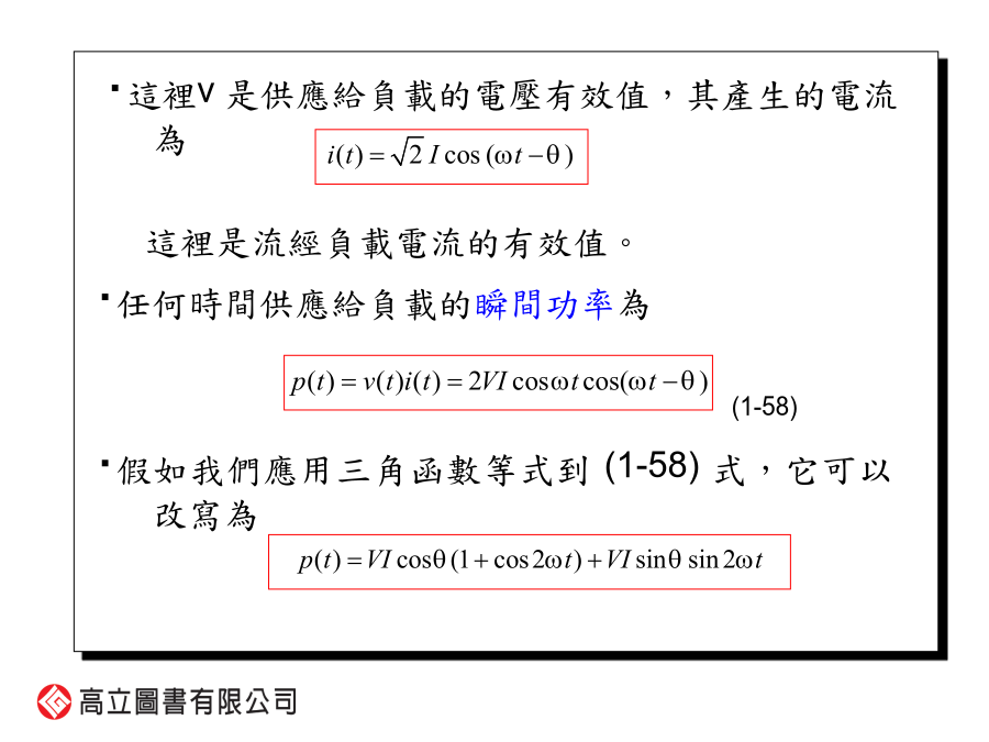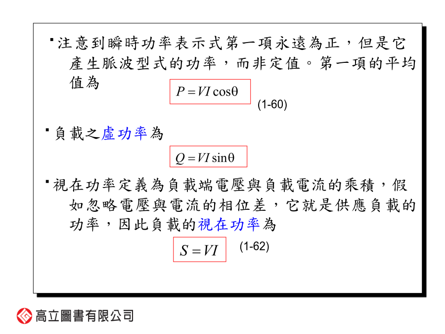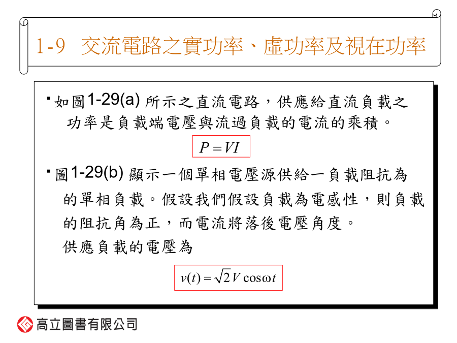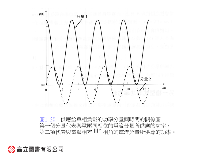 ‧總結其行為如下:1.施加一力於運動方向,在運動的方向。2.加速度為正,所以鐵棒速度上升。3.電壓上升,所以也上升。4.感應力上升,直到在一個較高速度情況下為止。5.機械功率現在被轉換成電功率,而電機當作一個發電機運轉。‧相同的電機既可當作馬達,也可當作發電機。唯一的差別在於外加的力是在轉動的方向(發電機)或是轉動的反方向(馬達)。以電路的觀點,當,則電機為發電機,當,則電機為馬達。圖1-25具有元件數值的線性直流電機,用來說明超量的啟動電流△線性電機的啟動問題在圖1-25中的一部線性電機,圖中提供實際電機數值,來強調一個電機的主要問題。在啟動時,鐵棒的速度為零,所以,啟動電流為這電流是非常的高,如此高的電流可能對馬達造成嚴重傷害。包括實際交流及直流電機都會遭遇到類似的啟動電流太高問題。‧電機啟動時,在電路中插入外加電阻,用來限制電流,直到建立起來足以限制電流為止。圖1-26顯示一個啟動電阻插入電機電路之中。圖1-26線性直流電機,外加串接電阻,用來控制啟動電流。‧如圖1-29(a)所示之直流電路,供應給直流負載之功率是負載端電壓與流過負載的電流的乘積。‧圖1-29(b)顯示一個單相電壓源供給一負載阻抗為的單相負載。假設我們假設負載為電感性,則負載的阻抗角為正,而電流將落後電壓角度。供應負載的電壓為圖1-29一直流電壓源供應一電阻負載R;一交流電壓供應一阻抗為的負載。‧這裡v是供應給負載的電壓有效值,其產生的電流為這裡是流經負載電流的有效值。‧任何時間供應給負載的瞬間功率為(1-58)‧假如我們應用三角函數等式到(1-58)式,它可以改寫為圖1-30供應給單相負載的功率分量與時間的關係圖第一個分量代表與電壓同相位的電流分量所供應的功率,第二項代表與電壓相差相角的電流分量所供應的功率。‧注意到瞬時功率表示式第一項永遠為正,但是它產生脈波型式的功率,而非定值。第一項的平均值為(1-60)‧負載之虛功率為‧視在功率定義為負載端電壓與負載電流的乘積,假如忽略電壓與電流的相位差,它就是供應負載的功率,因此負載的視在功率為(1-62)△另一種型式的功率方程假如負載的阻抗為定值,則歐姆定律可以用來推導供應負載實功率、虛功率及視在功率的另一種表示式。因為負載端電壓大小為‧將(1-63)式代入(1-60)及(1-62)式,則可以得到以電流及阻抗表示實功率、虛功率及視在功率表示式‧我們由方程式可以知道及,所以負載的實功率及虛功率可以被表示為這裡R是負載z的電阻,而是負載z的電抗。△複數功率‧為了方便電腦計算,實功率及虛功率有時被一起表示為複數功率S,這裡‧供應給負載的複數功率可由下式計算得到這裡星號“*”代表共軛複數運算符號。△阻抗角、電流相角、功率之間關係一個電感性負載(圖1-31),有正的阻抗角,因為電抗器的電抗為正,則流經負載的電流,其相角將會落後負載端電壓角度。反之,電容性負載(圖1-32)有負的阻抗角,因為電容器的電抗為負,則流經負載的電流,其相角領先負載端電壓相角角度。圖1-31電感性負載的阻抗角為正。這個負載產生落後之電流,而它從電源消耗的功率,同時包括實功率P及虛功率Q。圖1-33功率三角形△功率三角形‧通常被稱為負載功率因數,功率因數定義為視在功率實際轉換成為負載實功率的分量,因此這裡θ是負載的阻抗角。1-10總結‧一條導線以適當的方向通過磁場,則在導線將有一感應電壓,這個行為是所有實際電機發電機運轉的基本原理。‧一個由在磁場內移動鐵棒所構成的簡單直流電機,說明實際馬達及發電機的許多特性。當加上負載,它會變慢,而當作一個馬達運轉,轉換電功率成為機械功率。當有一外力牽引鐵棒速度高於無載穩態轉速,它會當作一個發電機運轉,轉換機械功率成為電功率。‧在交流電路,實功率P是由電源供應給負載的平均功率。虛功率Q是功率的分量,它在電源與負載來回地交換。