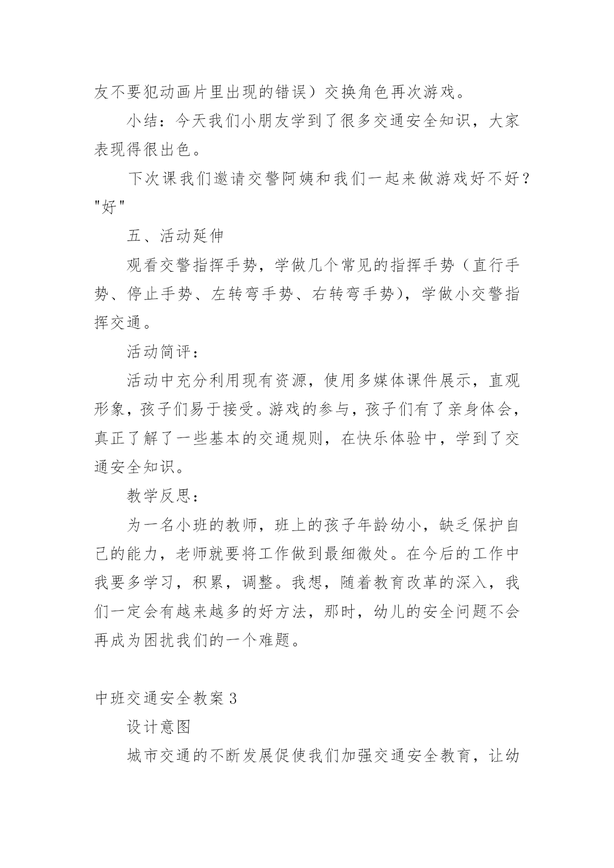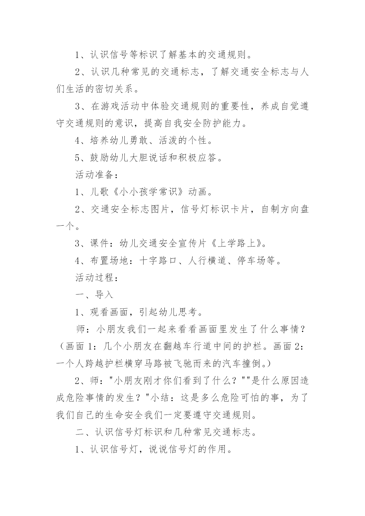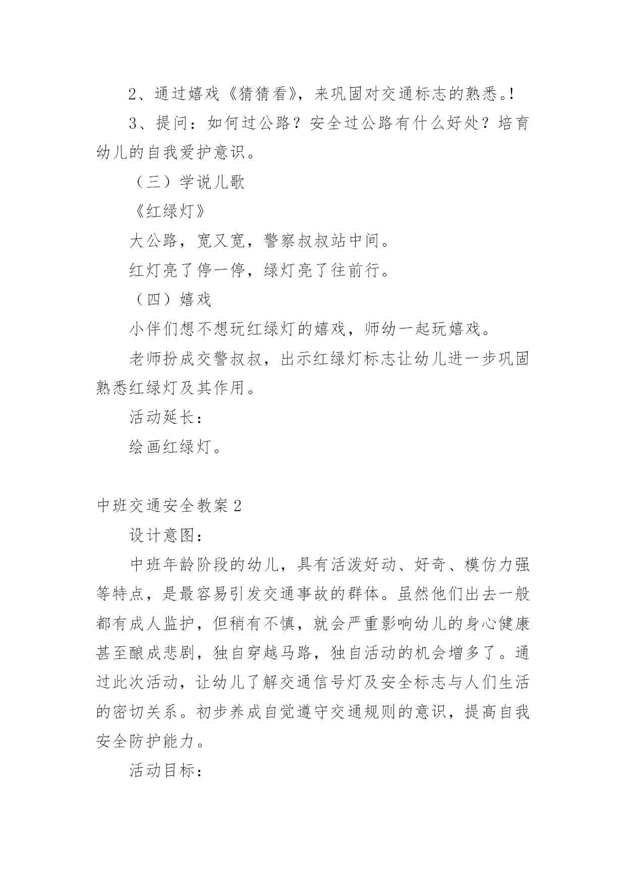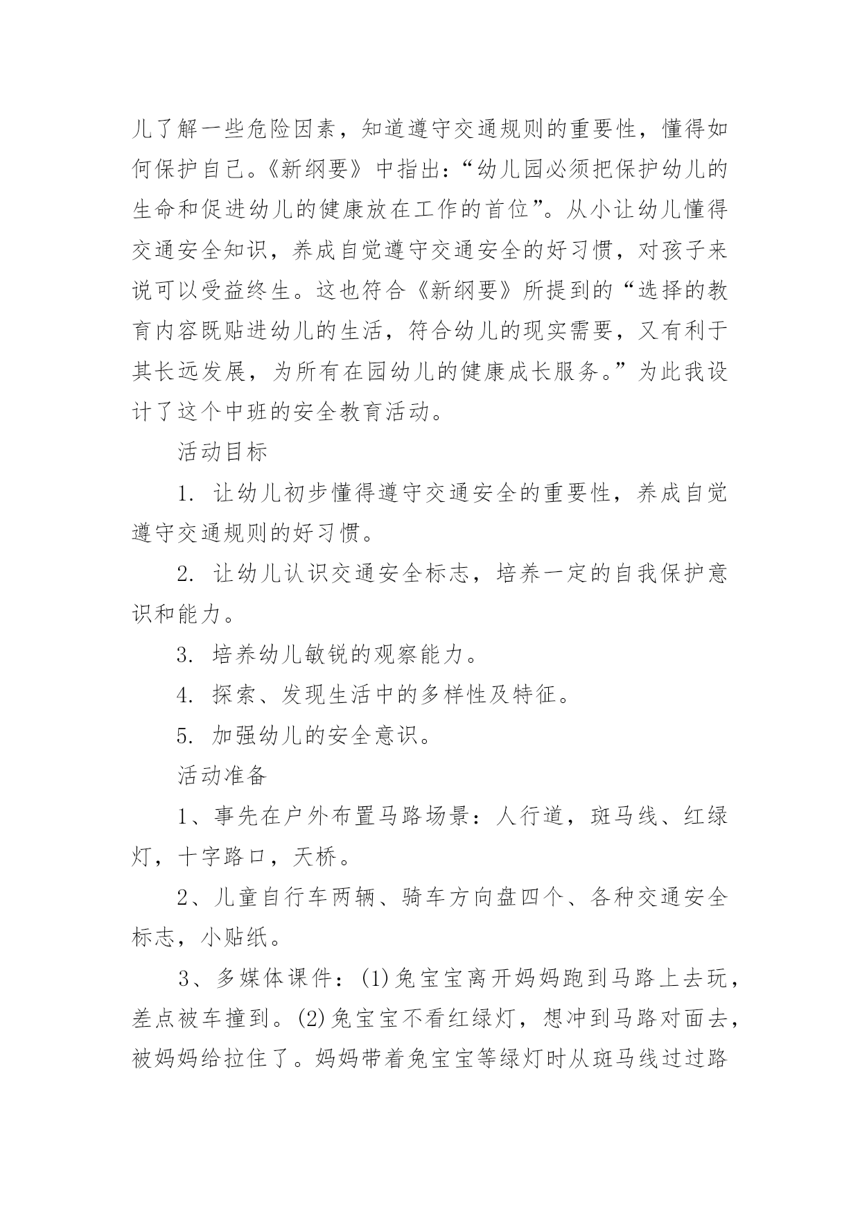 中班交通安全教案中班交通安全教案15篇【精】作为一名优秀的教育工作者,时常需要编写教案,教案是备课向课堂教学转化的关节点。那么写教案需要注意哪些问题呢?以下是小编为大家收集的中班交通安全教案,希望对大家有所帮助。中班交通安全教案1活动目标:1、留意安全,初步培育幼儿的自我爱护意识。2、能熟悉简洁的交通标记并了解安全通过公路应遵守的交通规章。3、加强幼儿的安全意识。4、遵守社会行为规章,不做“禁止'的`事。5、探究、发觉生活中的多样性及特征。活动预备:挂图四幅,红绿灯标牌各一个。视频资料活动过程:(一)导入:幼儿观看视频,引起幼儿留意。提问:发生了什么事?怎么发生的?(二)熟悉交通标志。1、出示挂图熟悉简洁的交通标志:人行横道线、信号灯、停车线等。2、通过嬉戏《猜猜看》,来巩固对交通标志的熟悉。!3、提问:如何过公路?安全过公路有什么好处?培育幼儿的自我爱护意识。(三)学说儿歌《红绿灯》大公路,宽又宽,警察叔叔站中间。红灯亮了停一停,绿灯亮了往前行。(四)嬉戏小伴们想不想玩红绿灯的嬉戏,师幼一起玩嬉戏。老师扮成交警叔叔,出示红绿灯标志让幼儿进一步巩固熟悉红绿灯及其作用。活动延长:绘画红绿灯。中班交通安全教案2设计意图:中班年龄阶段的幼儿,具有活泼好动、好奇、模仿力强等特点,是最容易引发交通事故的群体。虽然他们出去一般都有成人监护,但稍有不慎,就会严重影响幼儿的身心健康甚至酿成悲剧,独自穿越马路,独自活动的机会增多了。通过此次活动,让幼儿了解交通信号灯及安全标志与人们生活的密切关系。初步养成自觉遵守交通规则的意识,提高自我安全防护能力。活动目标:1、认识信号等标识了解基本的交通规则。2、认识几种常见的交通标志,了解交通安全标志与人们生活的密切关系。3、在游戏活动中体验交通规则的重要性,养成自觉遵守交通规则的意识,提高自我安全防护能力。4、培养幼儿勇敢、活泼的个性。5、鼓励幼儿大胆说话和积极应答。活动准备:1、儿歌《小小孩学常识》动画。2、交通安全标志图片,信号灯标识卡片,自制方向盘一个。3、课件:幼儿交通安全宣传片《上学路上》。4、布置场地:十字路口、人行横道、停车场等。活动过程:一、导入1、观看画面,引起幼儿思考。师:小朋友我们一起来看看画面里发生了什么事情?(画面1:几个小朋友在翻越车行道中间的护栏。画面2:一个人跨越护栏横穿马路被飞驰而来的汽车撞倒。)2、师:"小朋友刚才你们看到了什么?""是什么原因造成危险事情的发生?"小结:这是多么危险可怕的事,为了我们自己的生命安全我们一定要遵守交通规则。二、认识信号灯标识和几种常见交通标志。1、认识信号灯,说说信号灯的作用。师:今天老师请一位小客人来教给我们一些最基本的交通规则,我们一起来看看吧!(播放动画《小小孩学常识》)师:动画里面的小客人告诉我们信号灯有几种颜色?(三种,红、黄、绿)红灯停,绿灯行,黄灯亮了等一等。2、模拟游戏,体验信号灯在交通中的.作用。师:我们来做一个小游戏,"遵守规则的小朋友"。请小朋友们看信号灯过马路。小结:小朋友们真遵守交通规则,相信平安一定会伴随你们。3、认识几种常见的交通标志。师:在车辆穿梭的大马路上,除了信号等这个交通标志外,还有很多交通标志,今天老师就带来了几种,你们想看吗?播放标志图片,问:这是什么标志?是什么意思?我们应该怎么做?4、请小朋友指认标志,答对的奖一颗智慧星。三、观看交通安全宣传片《上学路上》师:小朋友们认识了这么多交通安全标志,老师奖励你们看一段动画片《上学路上》,动画片里的小朋友有的做得对,有的做得不对,我们可要看仔细哟!(观看交通安全宣传片《上学路上》)四、模拟游戏动画片看完了,我们来做个游戏,《安全小卫士》男孩扮演小司机,女孩扮演小朋友,一起去上学,路途中要注意交通信号和标志,遵守交通规则。(提醒小朋友不要犯动画片里出现的错误)交换角色再次游戏。小结:今天我们小朋友学到了很多交通安全知识,大家表现得很出色。下次课我们邀请交警阿姨和我们一起来做游戏好不好?"好"五、活动延伸观看交警指挥手势,学做几个常见的指挥手势(直行手势、停止手势、左转弯手势、右转弯手势),学做小交警指挥交通。活动简评:活动中充分利用现有资源,使用多媒体课件展示,直观形象,孩子们易于接受。游戏的参与,孩子们有了亲身体会,真正了解了一些基本的交通规则,在快乐体验中,学到了交通安全知识。教学反思:为一名小班的教师,班上的孩子年龄幼小,缺乏保护自己的能力,老师就要将工作做到最细微处。在今后的工作中我要多学习,积累,调整。我想,随着教育改革的深入,我们一定会有越来越多的好方法,那时,幼儿的安全问题不会再成为困扰我们的一个难题。中班交通安全教案3设计意图城市交通的不断发展促使我们加强交通安全教育,让幼儿了解一些危险因素,知道遵守交通规则的重要性,懂得如何保护自