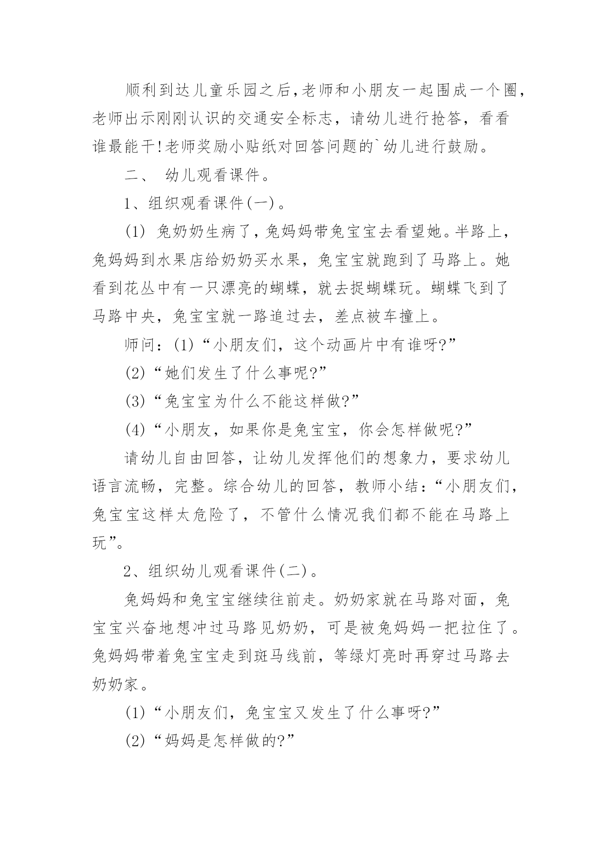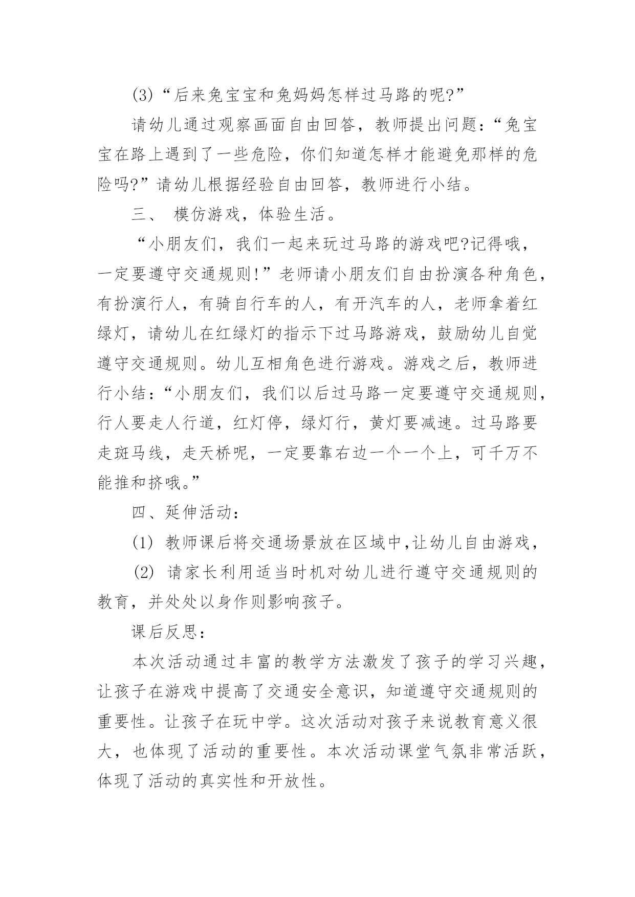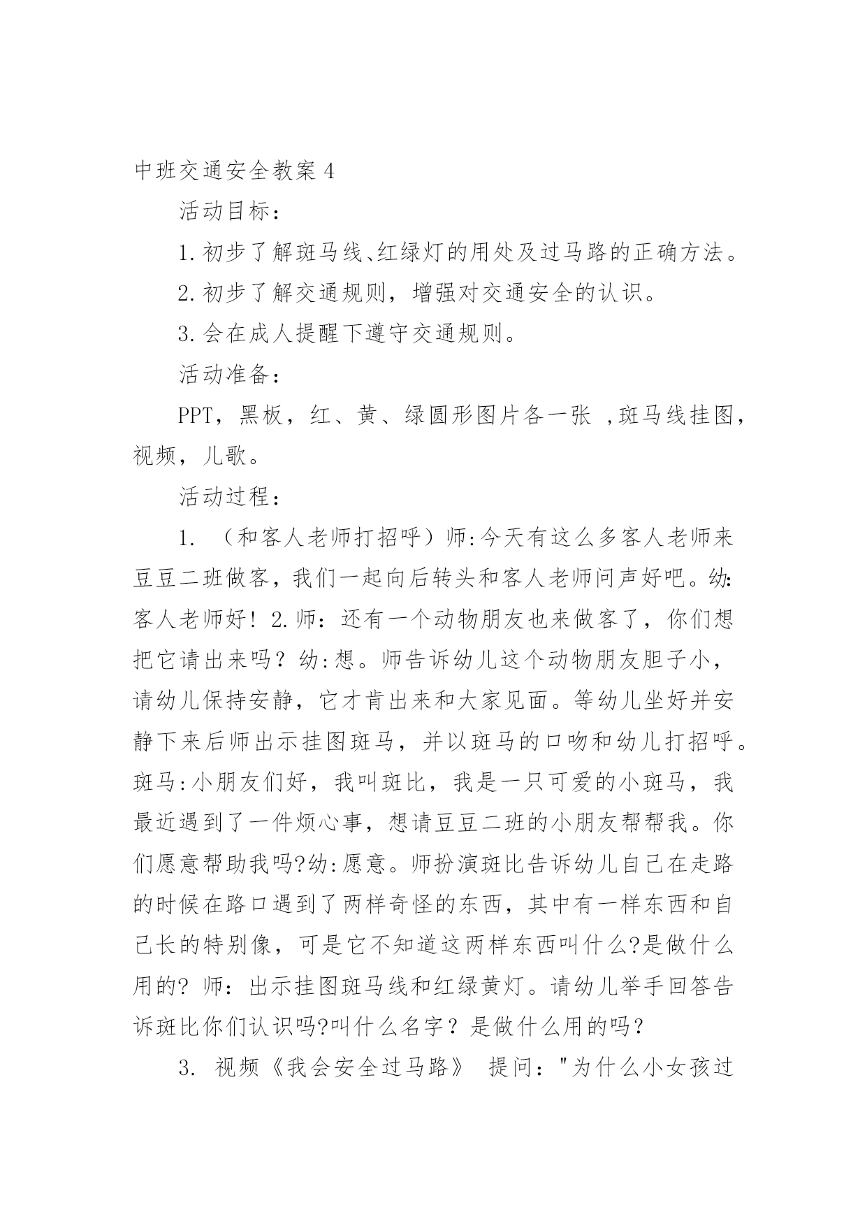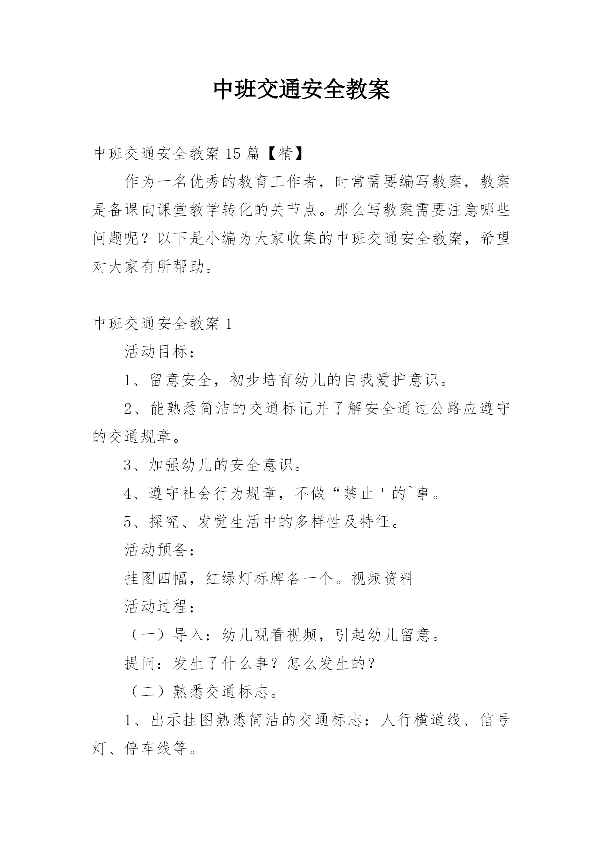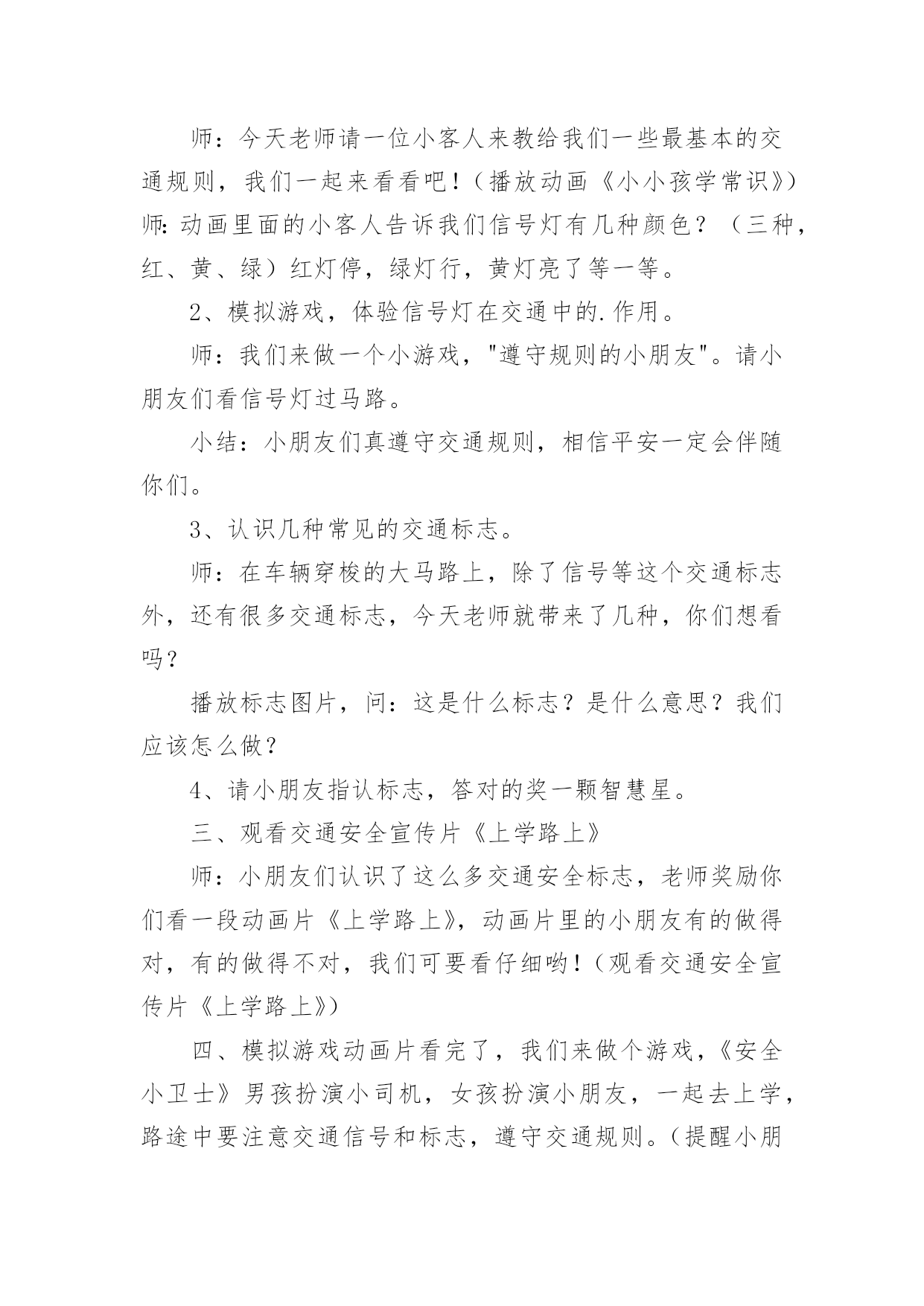 中班交通安全教案中班交通安全教案15篇【精】作为一名优秀的教育工作者,时常需要编写教案,教案是备课向课堂教学转化的关节点。那么写教案需要注意哪些问题呢?以下是小编为大家收集的中班交通安全教案,希望对大家有所帮助。中班交通安全教案1活动目标:1、留意安全,初步培育幼儿的自我爱护意识。2、能熟悉简洁的交通标记并了解安全通过公路应遵守的交通规章。3、加强幼儿的安全意识。4、遵守社会行为规章,不做“禁止'的`事。5、探究、发觉生活中的多样性及特征。活动预备:挂图四幅,红绿灯标牌各一个。视频资料活动过程:(一)导入:幼儿观看视频,引起幼儿留意。提问:发生了什么事?怎么发生的?(二)熟悉交通标志。1、出示挂图熟悉简洁的交通标志:人行横道线、信号灯、停车线等。2、通过嬉戏《猜猜看》,来巩固对交通标志的熟悉。!3、提问:如何过公路?安全过公路有什么好处?培育幼儿的自我爱护意识。(三)学说儿歌《红绿灯》大公路,宽又宽,警察叔叔站中间。红灯亮了停一停,绿灯亮了往前行。(四)嬉戏小伴们想不想玩红绿灯的嬉戏,师幼一起玩嬉戏。老师扮成交警叔叔,出示红绿灯标志让幼儿进一步巩固熟悉红绿灯及其作用。活动延长:绘画红绿灯。中班交通安全教案2设计意图:中班年龄阶段的幼儿,具有活泼好动、好奇、模仿力强等特点,是最容易引发交通事故的群体。虽然他们出去一般都有成人监护,但稍有不慎,就会严重影响幼儿的身心健康甚至酿成悲剧,独自穿越马路,独自活动的机会增多了。通过此次活动,让幼儿了解交通信号灯及安全标志与人们生活的密切关系。初步养成自觉遵守交通规则的意识,提高自我安全防护能力。活动目标:1、认识信号等标识了解基本的交通规则。2、认识几种常见的交通标志,了解交通安全标志与人们生活的密切关系。3、在游戏活动中体验交通规则的重要性,养成自觉遵守交通规则的意识,提高自我安全防护能力。4、培养幼儿勇敢、活泼的个性。5、鼓励幼儿大胆说话和积极应答。活动准备:1、儿歌《小小孩学常识》动画。2、交通安全标志图片,信号灯标识卡片,自制方向盘一个。3、课件:幼儿交通安全宣传片《上学路上》。4、布置场地:十字路口、人行横道、停车场等。活动过程:一、导入1、观看画面,引起幼儿思考。师:小朋友我们一起来看看画面里发生了什么事情?(画面1:几个小朋友在翻越车行道中间的护栏。画面2:一个人跨越护栏横穿马路被飞驰而来的汽车撞倒。)2、师:"小朋友刚才你们看到了什么?""是什么原因造成危险事情的发生?"小结:这是多么危险可怕的事,为了我们自己的生命安全我们一定要遵守交通规则。二、认识信号灯标识和几种常见交通标志。1、认识信号灯,说说信号灯的作用。师:今天老师请一位小客人来教给我们一些最基本的交通规则,我们一起来看看吧!(播放动画《小小孩学常识》)师:动画里面的小客人告诉我们信号灯有几种颜色?(三种,红、黄、绿)红灯停,绿灯行,黄灯亮了等一等。2、模拟游戏,体验信号灯在交通中的.作用。师:我们来做一个小游戏,"遵守规则的小朋友"。请小朋友们看信号灯过马路。小结:小朋友们真遵守交通规则,相信平安一定会伴随你们。3、认识几种常见的交通标志。师:在车辆穿梭的大马路上,除了信号等这个交通标志外,还有很多交通标志,今天老师就带来了几种,你们想看吗?播放标志图片,问:这是什么标志?是什么意思?我们应该怎么做?4、请小朋友指认标志,答对的奖一颗智慧星。三、观看交通安全宣传片《上学路上》师:小朋友们认识了这么多交通安全标志,老师奖励你们看一段动画片《上学路上》,动画片里的小朋友有的做得对,有的做得不对,我们可要看仔细哟!(观看交通安全宣传片《上学路上》)四、模拟游戏动画片看完了,我们来做个游戏,《安全小卫士》男孩扮演小司机,女孩扮演小朋友,一起去上学,路途中要注意交通信号和标志,遵守交通规则。(提醒小朋友不要犯动画片里出现的错误)交换角色再次游戏。小结:今天我们小朋友学到了很多交通安全知识,大家表现得很出色。下次课我们邀请交警阿姨和我们一起来做游戏好不好?"好"五、活动延伸观看交警指挥手势,学做几个常见的指挥手势(直行手势、停止手势、左转弯手势、右转弯手势),学做小交警指挥交通。活动简评:活动中充分利用现有资源,使用多媒体课件展示,直观形象,孩子们易于接受。游戏的参与,孩子们有了亲身体会,真正了解了一些基本的交通规则,在快乐体验中,学到了交通安全知识。教学反思:为一名小班的教师,班上的孩子年龄幼小,缺乏保护自己的能力,老师就要将工作做到最细微处。在今后的工作中我要多学习,积累,调整。我想,随着教育改革的深入,我们一定会有越来越多的好方法,那时,幼儿的安全问题不会再成为困扰我们的一个难题。中班交通安全教案3设计意图城市交通的不断发展促使我们加强交通安全教育,让幼儿了解一些危险因素,知道遵守交通规则的重要性,懂得如何保护自