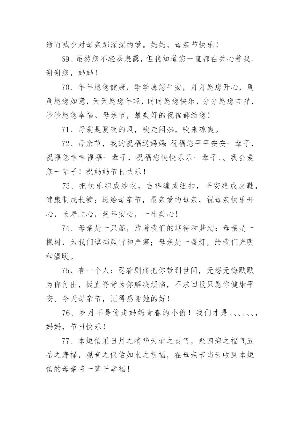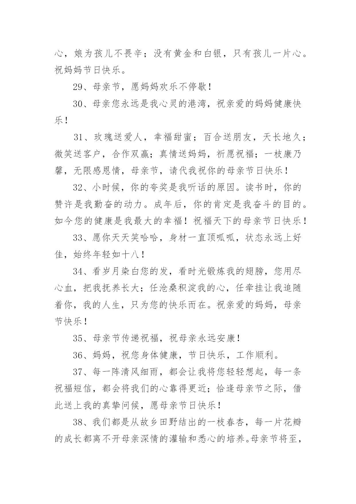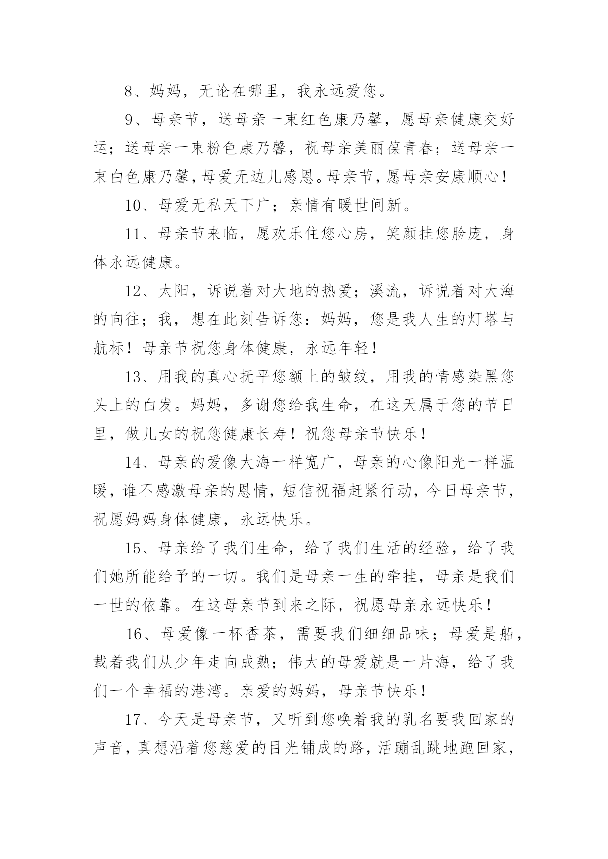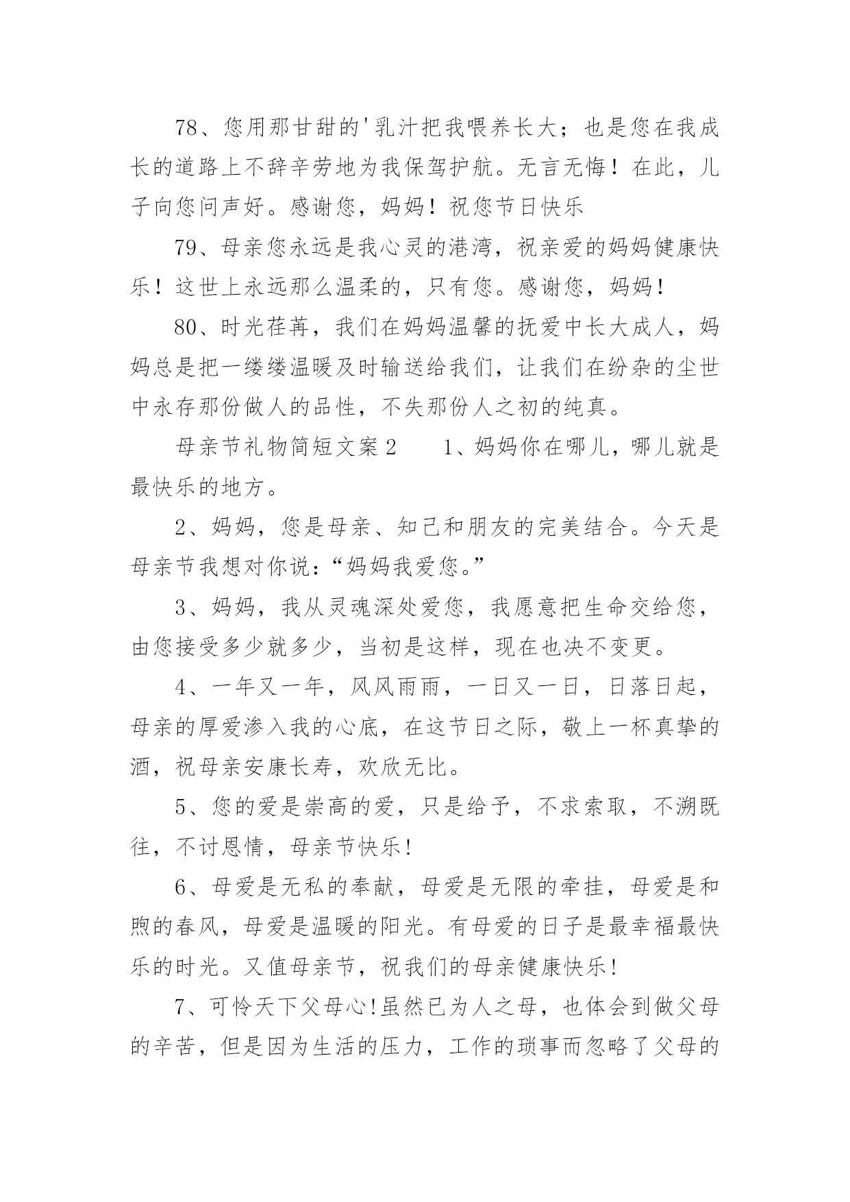 母亲节礼物简短文案母亲节礼物简短文案(精选230句)在平凡的学习、工作、生活中,许多人对一些广为流传的文案都不陌生吧,文案用以记录和分享生活日常。那么问题来了,到底什么样的文案才是低调奢华有内涵的呢?下面是小编为大家收集的母亲节礼物简短文案,欢迎阅读,希望大家能够喜欢。母亲节礼物简短文案11、一双慈目,两鬓风霜,游子三思春晖梦;五月榴花,六封笺纸,雁行七顾慈母心。2、祝你的母亲节日快乐,身体健康,千万别忘记打电话问候祝福哦!3、母亲呵!你是荷叶,我是红莲,心中的雨点来了,除了你,谁是我天空下的荫蔽?祝您母亲节快乐!4、宇宙洪荒,生命浩瀚无垠,但只有母亲和孩子真正分享过心跳。妈妈,节日快乐!5、愿母亲吉祥一生,快乐不断,平安永远,美好不断,健康常伴!6、母爱情深深似海,母爱爱重重如山,平日碎语与闲言,安知皆为儿女鉴,夜思双亲鼻亦酸。快乐寄予母亲前,乐天知命享晚年。母亲节快乐。7、多点挂念,常回家看看;多点时间,常陪她聊天;多点空闲,常做些美餐;多点依恋,常把她陪伴;多点问候,常信息传传;愿天下母亲节日快乐永平安。8、妈妈,无论在哪里,我永远爱您。9、母亲节,送母亲一束红色康乃馨,愿母亲健康交好运;送母亲一束粉色康乃馨,祝母亲美丽葆青春;送母亲一束白色康乃馨,母爱无边儿感恩。母亲节,愿母亲安康顺心!10、母爱无私天下广;亲情有暖世间新。11、母亲节来临,愿欢乐住您心房,笑颜挂您脸庞,身体永远健康。12、太阳,诉说着对大地的热爱;溪流,诉说着对大海的向往;我,想在此刻告诉您:妈妈,您是我人生的灯塔与航标!母亲节祝您身体健康,永远年轻!13、用我的真心抚平您额上的皱纹,用我的情感染黑您头上的白发。妈妈,多谢您给我生命,在这天属于您的节日里,做儿女的祝您健康长寿!祝您母亲节快乐!14、母亲的爱像大海一样宽广,母亲的心像阳光一样温暖,谁不感激母亲的恩情,短信祝福赶紧行动,今日母亲节,祝愿妈妈身体健康,永远快乐。15、母亲给了我们生命,给了我们生活的经验,给了我们她所能给予的一切。我们是母亲一生的牵挂,母亲是我们一世的依靠。在这母亲节到来之际,祝愿母亲永远快乐!16、母爱像一杯香茶,需要我们细细品味;母爱是船,载着我们从少年走向成熟;伟大的母爱就是一片海,给了我们一个幸福的港湾。亲爱的妈妈,母亲节快乐!17、今天是母亲节,又听到您唤着我的乳名要我回家的声音,真想沿着您慈爱的目光铺成的路,活蹦乱跳地跑回家,喊一声:妈妈,节日快乐!18、妈妈,相信我,女儿自有女儿的报答。19、妈妈,千言万语在一躬,祝母亲节快乐!20、你的坚强让我坚强,你的宽容让我宽容,愿节日快乐,天天好心情。21、母亲节就要到了,我亲手为您熬了一碗孝心汤:一颗感恩心,两枚开心果,三片健康丹,四副长寿剂,五株平安草,六味幸运散。祝母亲节愉快。22、今天母亲节哦,不要忘了打个电话回家给妈妈,跟妈妈说声“妈妈,这些年辛苦你了,谢谢你给予我生命,成长,健康,快乐,祝母亲节快乐。23、什么是幸福?小羊羔有妈妈喂它奶喝,小鸟儿有妈妈喂它虫吃,这就是幸福!母亲节就到了,想想我们儿时的幸福,记得给辛劳的母亲送去祝福!24、母爱是多么强烈、自私、狂热地占据我们整个心灵的感情。25、身处千里外,问候如天籁。牵挂在心间,祝福如蜜甜。儿行千里外,母爱花常开。风雨人生路,母爱常萦怀。母亲节到来,愿母亲永远平安健康幸福快乐!26、我愿是一捧溪水,带走您的烦忧;我愿是一缕清风,拂去您的疲惫;我愿是一片白云,点缀您的心境;我愿是一朵小花,芬芳您的岁月。母亲节,祝您快乐健康!27、母亲节,祝愿您健康快乐每一天!28、真心诚心儿的心,山亲水亲娘最亲;游子在外娘挂心,娘为孩儿不畏辛;没有黄金和白银,只有孩儿一片心。祝妈妈节日快乐。29、母亲节,愿妈妈欢乐不停歇!30、母亲您永远是我心灵的港湾,祝亲爱的妈妈健康快乐!31、玫瑰送爱人,幸福甜蜜;百合送朋友,天长地久;微笑送客户,合作双赢;真情送妈妈,祈愿祝福;一枝康乃馨,无限感恩情,母亲节,请代我祝你的母亲节日快乐!32、小时候,你的夸奖是我听话的原因。读书时,你的赞许是我勤奋的动力。成年后,你的肯定是我奋斗的目的。如今您的健康是我最大的幸福!祝福天下的母亲节日快乐!33、愿你天天笑哈哈,身材一直顶呱呱,状态永远上好佳,始终年轻如十八!34、看岁月染白您的发,看时光锻炼我的翅膀,您用尽心血,把我抚养长大;任沧桑积淀我的心,任牵挂让我追随着你,我的人生,只为您的快乐而在。祝亲爱的妈妈,母亲节快乐!35、母亲节传递祝福,祝母亲永远安康!36、妈妈,祝您身体健康,节日快乐,工作顺利。37、每一阵清风细雨,都会让我将您轻轻想起,每一条祝福短信,都会将我们的心靠得更近;恰逢母亲节之际,借此送上我的真挚问候,愿母亲节日快乐!38、我们都是从故乡田野结出的一枝春杏,每一片花瓣