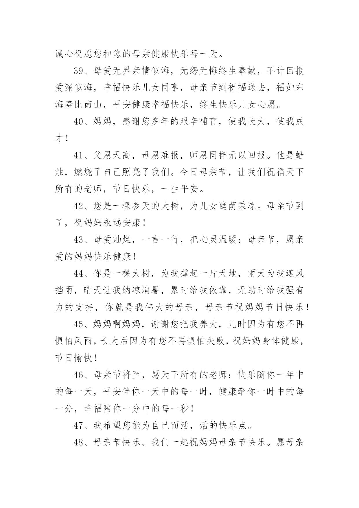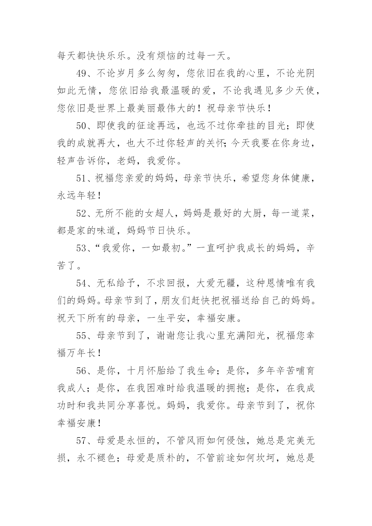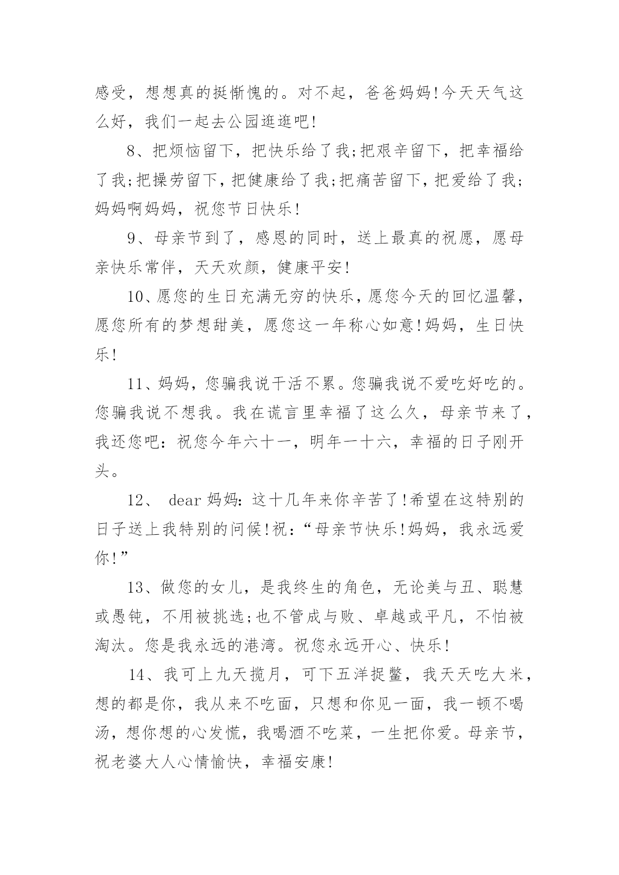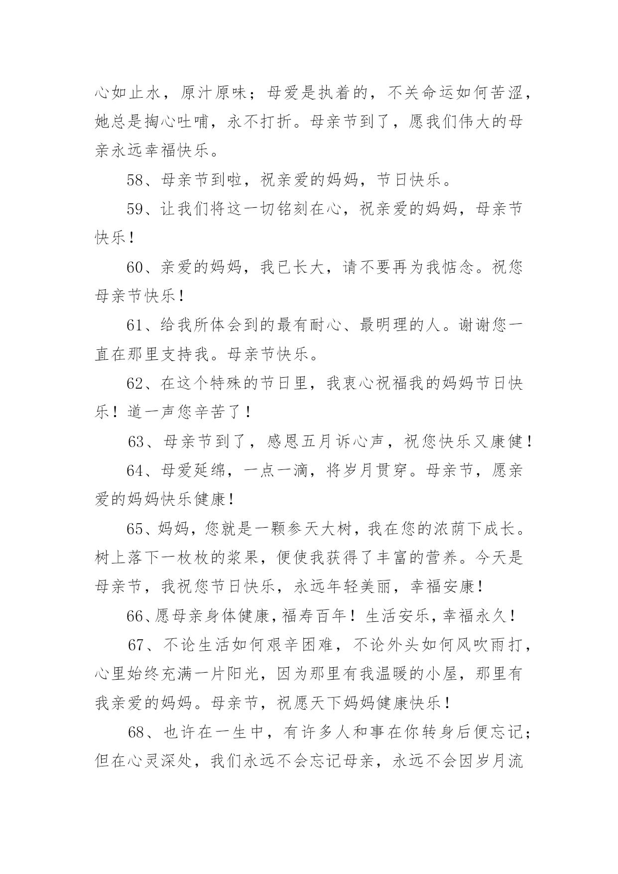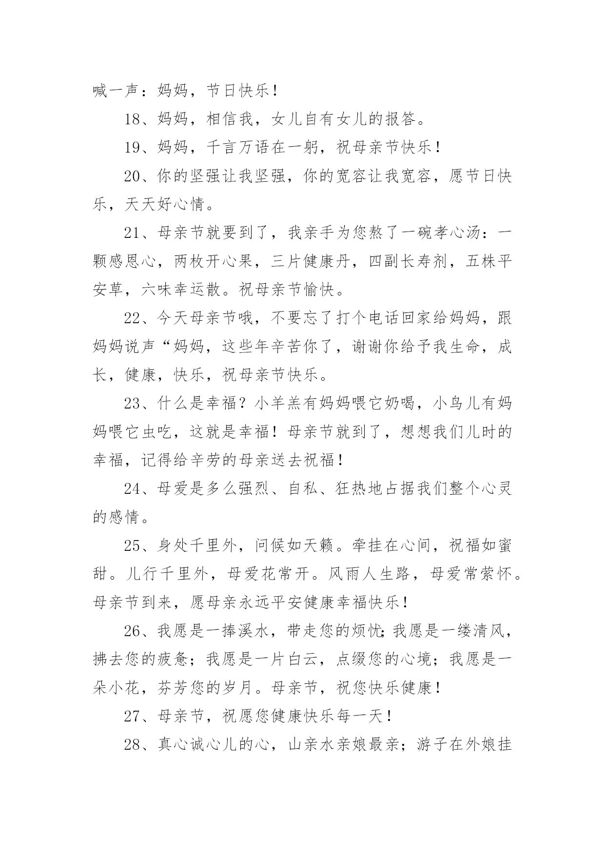 母亲节礼物简短文案母亲节礼物简短文案(精选230句)在平凡的学习、工作、生活中,许多人对一些广为流传的文案都不陌生吧,文案用以记录和分享生活日常。那么问题来了,到底什么样的文案才是低调奢华有内涵的呢?下面是小编为大家收集的母亲节礼物简短文案,欢迎阅读,希望大家能够喜欢。母亲节礼物简短文案11、一双慈目,两鬓风霜,游子三思春晖梦;五月榴花,六封笺纸,雁行七顾慈母心。2、祝你的母亲节日快乐,身体健康,千万别忘记打电话问候祝福哦!3、母亲呵!你是荷叶,我是红莲,心中的雨点来了,除了你,谁是我天空下的荫蔽?祝您母亲节快乐!4、宇宙洪荒,生命浩瀚无垠,但只有母亲和孩子真正分享过心跳。妈妈,节日快乐!5、愿母亲吉祥一生,快乐不断,平安永远,美好不断,健康常伴!6、母爱情深深似海,母爱爱重重如山,平日碎语与闲言,安知皆为儿女鉴,夜思双亲鼻亦酸。快乐寄予母亲前,乐天知命享晚年。母亲节快乐。7、多点挂念,常回家看看;多点时间,常陪她聊天;多点空闲,常做些美餐;多点依恋,常把她陪伴;多点问候,常信息传传;愿天下母亲节日快乐永平安。8、妈妈,无论在哪里,我永远爱您。9、母亲节,送母亲一束红色康乃馨,愿母亲健康交好运;送母亲一束粉色康乃馨,祝母亲美丽葆青春;送母亲一束白色康乃馨,母爱无边儿感恩。母亲节,愿母亲安康顺心!10、母爱无私天下广;亲情有暖世间新。11、母亲节来临,愿欢乐住您心房,笑颜挂您脸庞,身体永远健康。12、太阳,诉说着对大地的热爱;溪流,诉说着对大海的向往;我,想在此刻告诉您:妈妈,您是我人生的灯塔与航标!母亲节祝您身体健康,永远年轻!13、用我的真心抚平您额上的皱纹,用我的情感染黑您头上的白发。妈妈,多谢您给我生命,在这天属于您的节日里,做儿女的祝您健康长寿!祝您母亲节快乐!14、母亲的爱像大海一样宽广,母亲的心像阳光一样温暖,谁不感激母亲的恩情,短信祝福赶紧行动,今日母亲节,祝愿妈妈身体健康,永远快乐。15、母亲给了我们生命,给了我们生活的经验,给了我们她所能给予的一切。我们是母亲一生的牵挂,母亲是我们一世的依靠。在这母亲节到来之际,祝愿母亲永远快乐!16、母爱像一杯香茶,需要我们细细品味;母爱是船,载着我们从少年走向成熟;伟大的母爱就是一片海,给了我们一个幸福的港湾。亲爱的妈妈,母亲节快乐!17、今天是母亲节,又听到您唤着我的乳名要我回家的声音,真想沿着您慈爱的目光铺成的路,活蹦乱跳地跑回家,喊一声:妈妈,节日快乐!18、妈妈,相信我,女儿自有女儿的报答。19、妈妈,千言万语在一躬,祝母亲节快乐!20、你的坚强让我坚强,你的宽容让我宽容,愿节日快乐,天天好心情。21、母亲节就要到了,我亲手为您熬了一碗孝心汤:一颗感恩心,两枚开心果,三片健康丹,四副长寿剂,五株平安草,六味幸运散。祝母亲节愉快。22、今天母亲节哦,不要忘了打个电话回家给妈妈,跟妈妈说声“妈妈,这些年辛苦你了,谢谢你给予我生命,成长,健康,快乐,祝母亲节快乐。23、什么是幸福?小羊羔有妈妈喂它奶喝,小鸟儿有妈妈喂它虫吃,这就是幸福!母亲节就到了,想想我们儿时的幸福,记得给辛劳的母亲送去祝福!24、母爱是多么强烈、自私、狂热地占据我们整个心灵的感情。25、身处千里外,问候如天籁。牵挂在心间,祝福如蜜甜。儿行千里外,母爱花常开。风雨人生路,母爱常萦怀。母亲节到来,愿母亲永远平安健康幸福快乐!26、我愿是一捧溪水,带走您的烦忧;我愿是一缕清风,拂去您的疲惫;我愿是一片白云,点缀您的心境;我愿是一朵小花,芬芳您的岁月。母亲节,祝您快乐健康!27、母亲节,祝愿您健康快乐每一天!28、真心诚心儿的心,山亲水亲娘最亲;游子在外娘挂心,娘为孩儿不畏辛;没有黄金和白银,只有孩儿一片心。祝妈妈节日快乐。29、母亲节,愿妈妈欢乐不停歇!30、母亲您永远是我心灵的港湾,祝亲爱的妈妈健康快乐!31、玫瑰送爱人,幸福甜蜜;百合送朋友,天长地久;微笑送客户,合作双赢;真情送妈妈,祈愿祝福;一枝康乃馨,无限感恩情,母亲节,请代我祝你的母亲节日快乐!32、小时候,你的夸奖是我听话的原因。读书时,你的赞许是我勤奋的动力。成年后,你的肯定是我奋斗的目的。如今您的健康是我最大的幸福!祝福天下的母亲节日快乐!33、愿你天天笑哈哈,身材一直顶呱呱,状态永远上好佳,始终年轻如十八!34、看岁月染白您的发,看时光锻炼我的翅膀,您用尽心血,把我抚养长大;任沧桑积淀我的心,任牵挂让我追随着你,我的人生,只为您的快乐而在。祝亲爱的妈妈,母亲节快乐!35、母亲节传递祝福,祝母亲永远安康!36、妈妈,祝您身体健康,节日快乐,工作顺利。37、每一阵清风细雨,都会让我将您轻轻想起,每一条祝福短信,都会将我们的心靠得更近;恰逢母亲节之际,借此送上我的真挚问候,愿母亲节日快乐!38、我们都是从故乡田野结出的一枝春杏,每一片花瓣