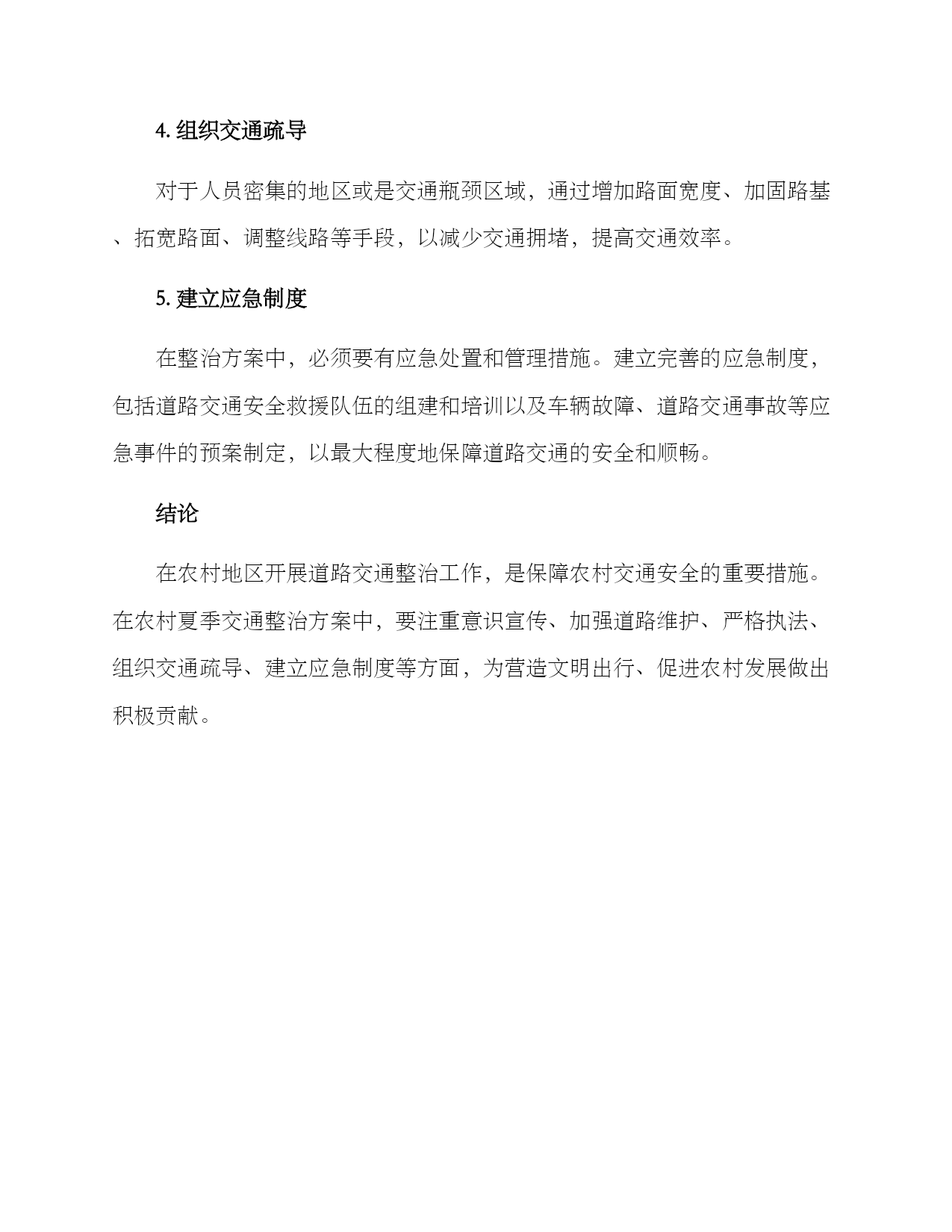 农村夏季交通整治方案背景由于夏季天气炎热潮湿,道路上易出现路面塌陷、路面坍塌、道路脱陷等问题,给农村交通安全带来了很大的威胁。因此,为保障农村交通安全,制定一套农村夏季交通整治方案显得尤为必要。农村夏季交通整治方案1.意识宣传在农村地区开展道路安全知识宣传,普及一些基本的道路交通安全知识,引导农民正确认识道路交通安全的重要性,并提醒他们避免不必要的出行,减少对道路交通的压力。2.加强维护夏季受天气影响较大,为避免道路塌陷、路面坍塌和道路损坏等问题的发生,要加强对道路的维护。在路面有明显缺陷的地方及时给予维修和加固,确保道路通畅。3.整治交通违章为减少车辆在路上的拥堵,要严格执法,对违章行为进行严厉处罚,鼓励公众文明礼貌出行,营造文明出行的良好氛围。4.组织交通疏导对于人员密集的地区或是交通瓶颈区域,通过增加路面宽度、加固路基、拓宽路面、调整线路等手段,以减少交通拥堵,提高交通效率。5.建立应急制度在整治方案中,必须要有应急处置和管理措施。建立完善的应急制度,包括道路交通安全救援队伍的组建和培训以及车辆故障、道路交通事故等应急事件的预案制定,以最大程度地保障道路交通的安全和顺畅。结论在农村地区开展道路交通整治工作,是保障农村交通安全的重要措施。在农村夏季交通整治方案中,要注重意识宣传、加强道路维护、严格执法、组织交通疏导、建立应急制度等方面,为营造文明出行、促进农村发展做出积极贡献。