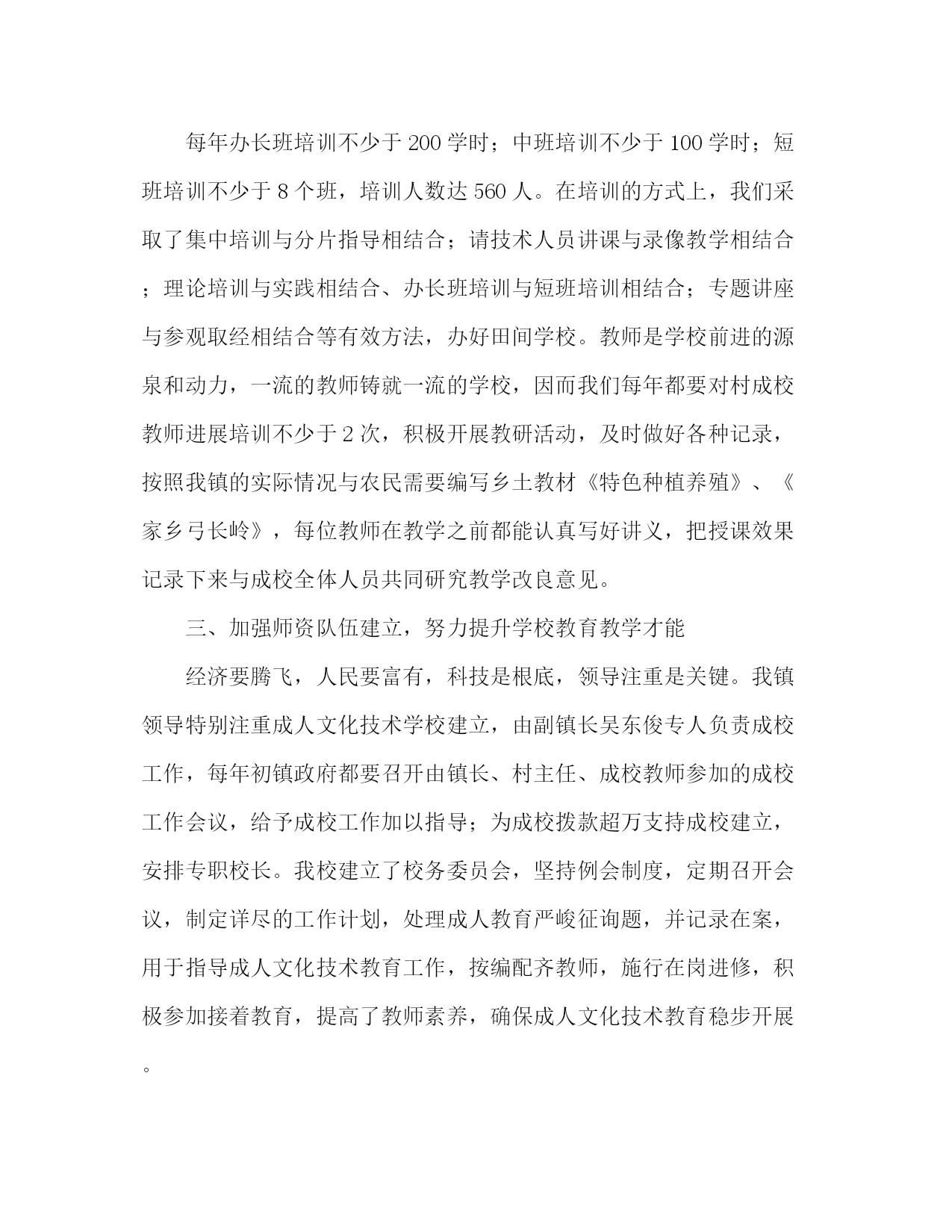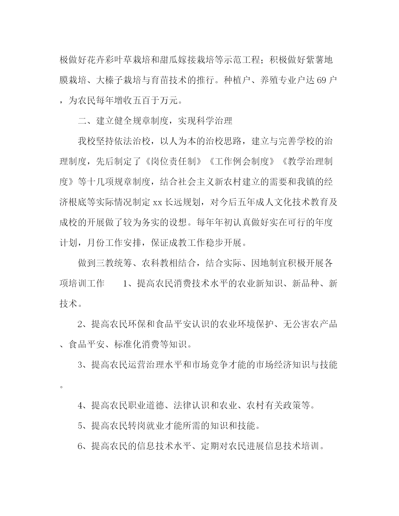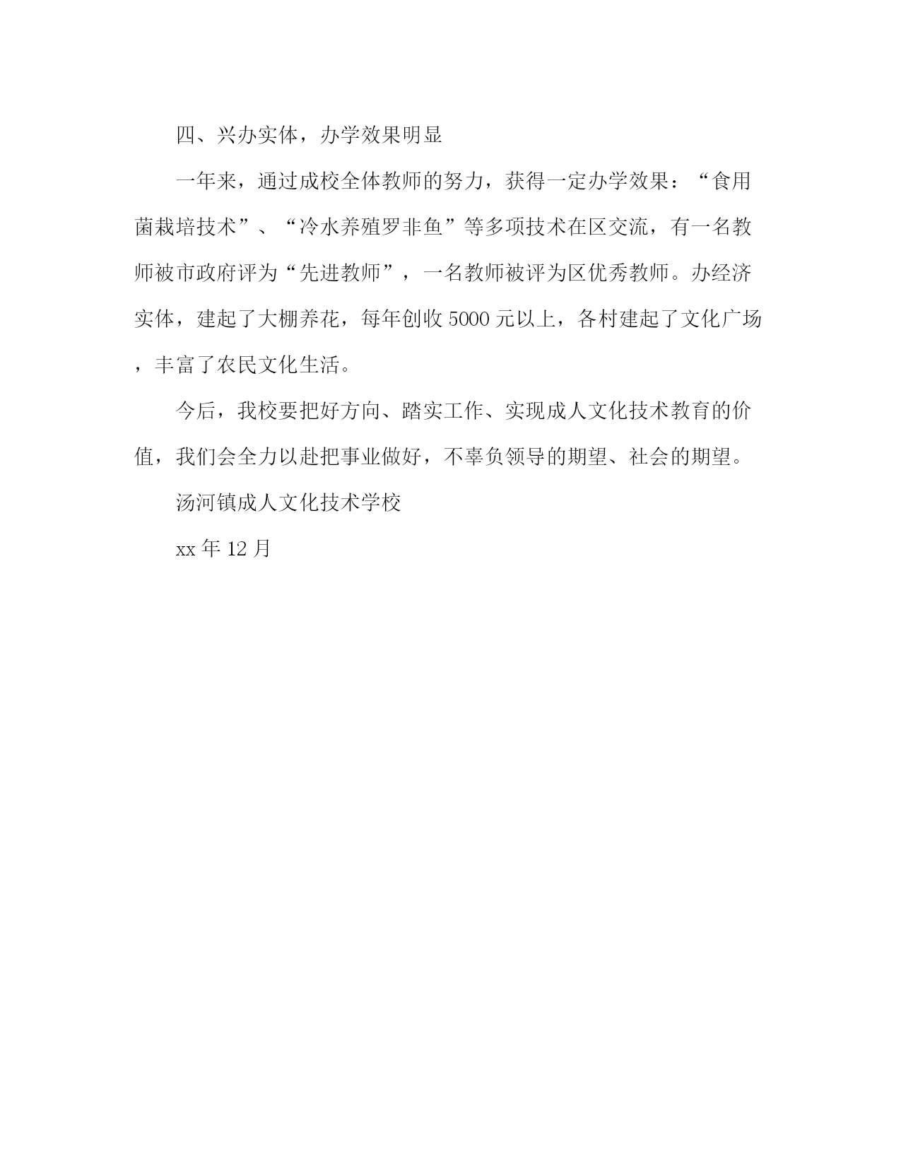 2021文化技术学校工作参考总结范文我们汤河镇成人文化技术学校不断坚持以党的方针、政策为指导,坚持稳中求进的方针,坚持科教兴农的开展战略,在广大农民中积极开展思想政治教育、文化科学教育和有用技术培训,积极推行新技术、新工艺、新品种,向广大农民倡导科学文明、健康的生活方式。破除封建迷信,改善落后风俗,推进了我镇两个文明建立和和谐社会的健康开展。几年来为推进新农村建立做出了一定奉献。一、改善办学条件,为成人教育奠定坚实根底。汤河镇成人文化技术学校在各级领导关心、扶持下,在全校教师的团结协作、努力工作下,建起了独立标准化教室,购置标准化桌椅68套,配齐了档案柜,标准了档案治理,有独立办公室、综合室,新购进档案柜2组、标本柜2组、图书柜3组,图书材料达二十几种,共计xx余册;标本达10个类别以上,培训设备齐全:有电脑、电视、vcd、摄像机、投影等,各类培训光碟齐全,建有四处实验实习基地,总面积达38亩,在本校建有小果园、塑料大棚各0.8亩,为确保成人文化技术教育到达高质量、高水平,不走过场,我校按照全镇农村经济开展的特点和农业构造的实际,积极做好“罗非鱼与河蟹混养”“大榛子育苗技术”“人参庭院栽培”等实验工程并获得成功,积极做好花卉彩叶草栽培和甜瓜嫁接栽培等示范工程;积极做好紫薯地膜栽培、大榛子栽培与育苗技术的推行。种植户、养殖专业户达69户,为农民每年增收五百于万元。二、建立健全规章制度,实现科学治理我校坚持依法治校,以人为本的治校思路,建立与完善学校的治理制度,先后制定了《岗位责任制》《工作例会制度》《教学治理制度》等十几项规章制度,结合社会主义新农村建立的需要和我镇的经济根底等实际情况制定xx长远规划,对今后五年成人文化技术教育及成校的开展做了较为务实的设想。每年年初认真做好实在可行的年度计划,月份工作安排,保证成教工作稳步开展。做到三教统筹、农科教相结合,结合实际、因地制宜积极开展各项培训工作1、提高农民消费技术水平的农业新知识、新品种、新技术。2、提高农民环保和食品平安认识的农业环境保护、无公害农产品、食品平安、标准化消费等知识。3、提高农民运营治理水平和市场竞争才能的市场经济知识与技能。4、提高农民职业道德、法律认识和农业、农村有关政策等。5、提高农民转岗就业才能所需的知识和技能。6、提高农民的信息技术水平、定期对农民进展信息技术培训。每年办长班培训不少于200学时;中班培训不少于100学时;短班培训不少于8个班,培训人数达560人。在培训的方式上,我们采取了集中培训与分片指导相结合;请技术人员讲课与录像教学相结合;理论培训与实践相结合、办长班培训与短班培训相结合;专题讲座与参观取经相结合等有效方法,办好田间学校。教师是学校前进的源泉和动力,一流的教师铸就一流的学校,因而我们每年都要对村成校教师进展培训不少于2次,积极开展教研活动,及时做好各种记录,按照我镇的实际情况与农民需要编写乡土教材《特色种植养殖》、《家乡弓长岭》,每位教师在教学之前都能认真写好讲义,把授课效果记录下来与成校全体人员共同研究教学改良意见。三、加强师资队伍建立,努力提升学校教育教学才能经济要腾飞,人民要富有,科技是根底,领导注重是关键。我镇领导特别注重成人文化技术学校建立,由副镇长吴东俊专人负责成校工作,每年初镇政府都要召开由镇长、村主任、成校教师参加的成校工作会议,给予成校工作加以指导;为成校拨款超万支持成校建立,安排专职校长。我校建立了校务委员会,坚持例会制度,定期召开会议,制定详尽的工作计划,处理成人教育严峻征询题,并记录在案,用于指导成人文化技术教育工作,按编配齐教师,施行在岗进修,积极参加接着教育,提高了教师素养,确保成人文化技术教育稳步开展。四、兴办实体,办学效果明显一年来,通过成校全体教师的努力,获得一定办学效果:“食用菌栽培技术”、“冷水养殖罗非鱼”等多项技术在区交流,有一名教师被市政府评为“先进教师”,一名教师被评为区优秀教师。办经济实体,建起了大棚养花,每年创收5000元以上,各村建起了文化广场,丰富了农民文化生活。今后,我校要把好方向、踏实工作、实现成人文化技术教育的价值,我们会全力以赴把事业做好,不辜负领导的期望、社会的期望。汤河镇成人文化技术学校xx年12月