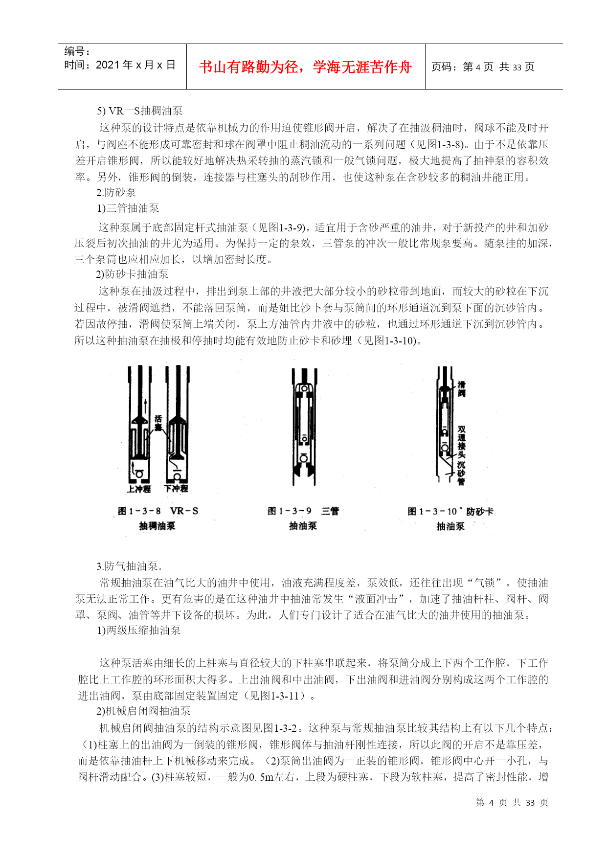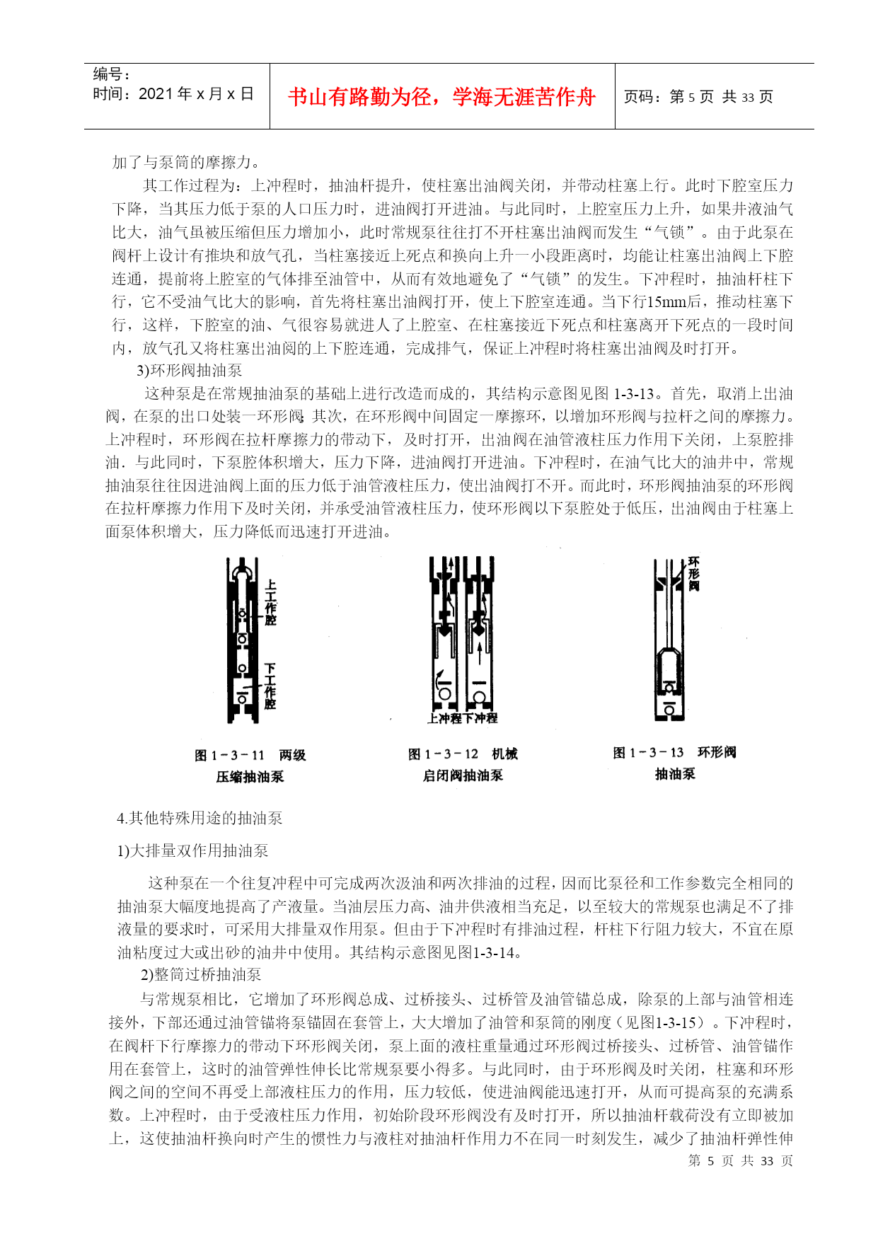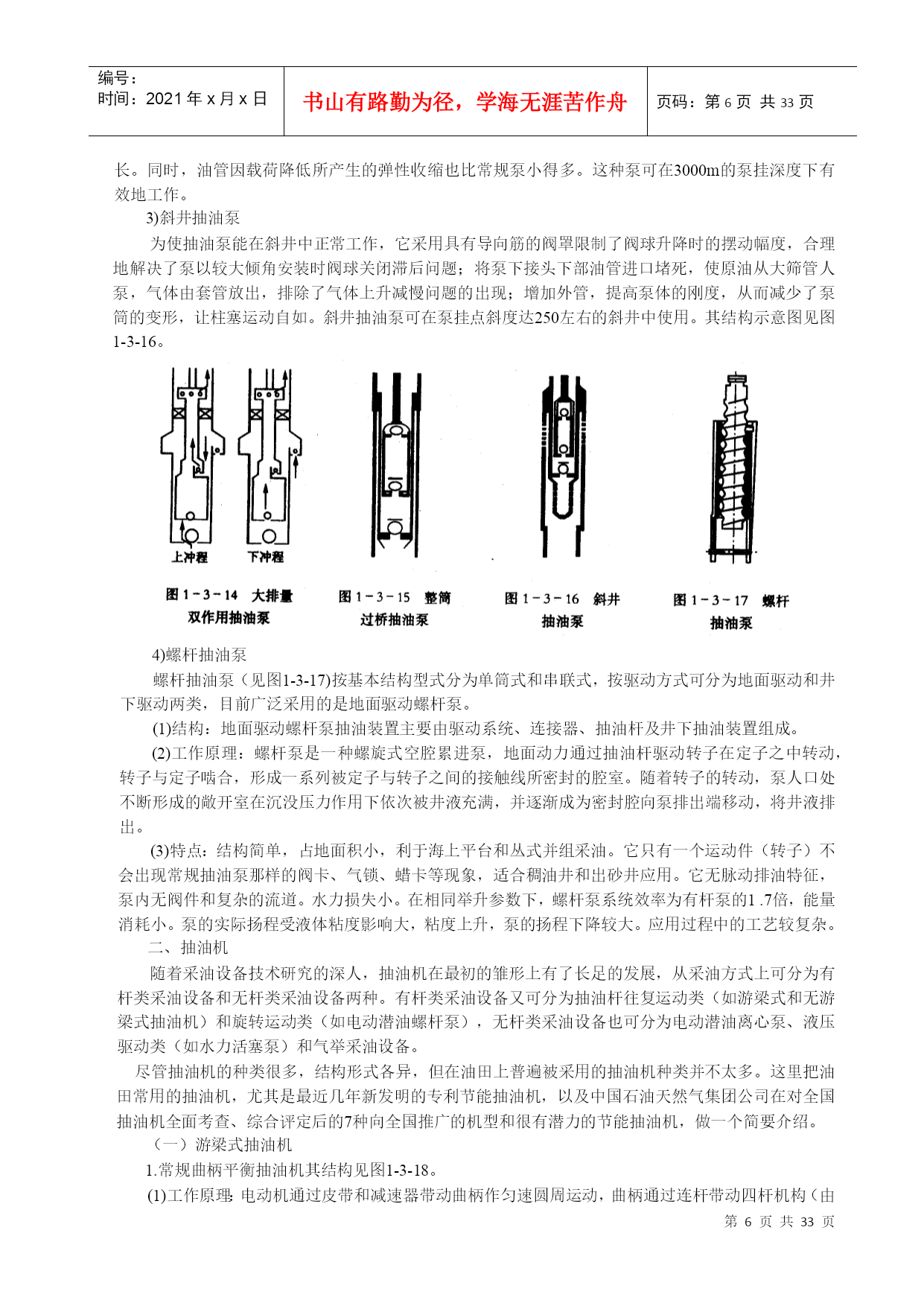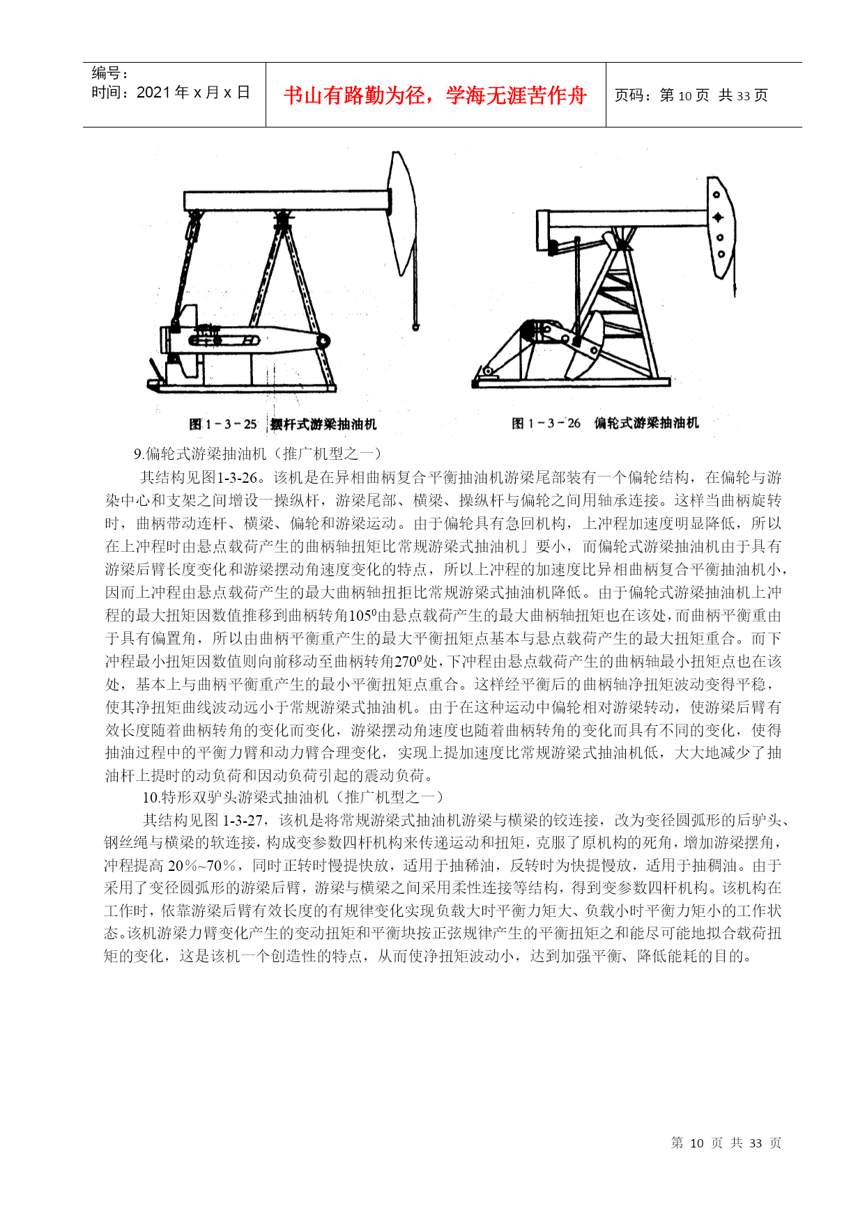 编号:时间:2021年x月x日书山有路勤为径,学海无涯苦作舟页码:第PAGE33页共NUMPAGES33页第PAGE\*MERGEFORMAT33页共NUMPAGES\*MERGEFORMAT33页第三章机械采油常识第一节有杆泵抽油机及井口装置在油田开发过程中,油田达到自喷晚期或停喷后,或原始地层压力不足,要对这些井进行采油,就必须安装一种人工举升装置,以维持所需要的井底流压和生产出地质配产要求的产量。人工举升采油有三种方式可供选择,即气举采油、有杆泵采油和无杆泵采油。当前,我国有杆泵采油方式占人工举升井数的90%。因此,本节就有杆泵抽油机及井口装置做一简单介绍。一、有杆抽油泵有杆抽油泵按用途可分为常规(标准)抽油泵和特种抽油泵两大类。通常,对于符合抽油泵标准设计和制造的抽油泵称作标准抽油泵或常规抽油泵,而具有专门用途的,如防砂、防气、抽稠油等,或具有与标准结构或尺寸不同的抽油泵称作特殊用途的抽油泵或专用抽油泵。我国抽油泵行业标准是SY/T5059-91《抽油泵》。(一)常规抽油泵常规抽油泵又分为管式泵和杆式泵两大类。1.管式抽油泵管式抽油泵是按设计的泵挂深度直接将泵筒连接在井下油管的下端,活塞连接在抽油杆的最下端,见图1-3-1。工作原理:上冲程时,抽油杆柱带动活塞上行,游动阀(排出阀)受自重和油管内液柱压力的作用而关闭,并提升柱塞上部的液体,与此同时柱塞下面的泵筒空间里的压力降低,当其压力低于套管压力时,该空间的液体将顶开油泵固定阀(吸人阀)而进人抽油泵活塞上冲程所让开的泵筒空间。当柱塞下行时,油泵的固定阀靠自重下落而关闭,泵筒内的液体受到压缩,在柱塞继续下行过程中,泵内的压力不断增高,当泵内压力增至超过油管内液柱压力时,将顶开油泵的游动阀使泵筒内的液体进人油管内。由于油泵柱塞在抽油机的带动下,连续做上下往复运动,因而油泵的固定阀和游动阀也将交替地关闭与打开,完成抽油泵的抽汲工作循环。管式抽油泵结构简单,成本低;泵筒壁较厚,承载能力大;在相同的油管尺寸下可安装的管式抽油泵直径比杆式抽油泵大,因而排液量也较大;对于产液量更大的油井还可通过脱接器安装泵径大于油管内径的管式抽油泵。因此在我国得到了广泛的应用。2.杆式抽油泵杆式抽油泵有定筒式顶部固定杆式泵、定筒式底部固定杆式泵及动筒式底部固定杆式泵三种。1)定筒式顶部固定杆式泵这种泵由泵顶部的固定支承装置将泵筒固定在油管内的预定位置上,见图1-3-2。顶部固定方式是杆式泵最常采用的,它不仅使用可靠,而且还具有下列优点:在柱塞运动时可将锁紧装置四周的砂子冲掉,防止砂卡,使起泵作业容易;泵筒可绕顶部锁紧装置这个支点摆动,所以在斜井中下泵时,泵筒和油管都不会损坏;在固定位置深度相同的情况下,泵的沉没度比底部固定的杆式抽油泵更大,所以更适合低产井和低液面并中使用;顶部固定位置使泵本身具有气锚作用,可在含气较多的油井中使用,其缺点为:由于顶部固定,泵筒受内压和液柱向下拉伸的复合载荷,受力状况比较恶劣;柱塞上行程时,泵筒受内部压力高于外部压力,使泵筒内孔增大,漏失量有所增加。2)定筒式底部固定杆式泵这种泵由泵的底部锁紧装置将泵筒固定在油管内的预定位置上,见图1-3-3。底部固定杆式泵应用也较广。它具有泵筒不会因液柱作用而伸长、只受外压、间隙不会增大的特点,适合在深井中使用;泵筒可绕底部锁紧装置这个支点摆动,在斜井中也可使用。但在固定支承套和底部锁紧装置的环形空间处极易沉积砂粒,使起泵作业困难,不宜在含砂井中使用。底部固定,工作时泵筒摆动大,加剧了阀杆、导向套的磨损,故不宜用作长冲程泵。3)动筒式底部固定杆式泵这种泵的泵筒与抽油杆柱连接,并作上下运动,柱塞通过拉管及底部锁紧装置固定在油管内预定位置上的支承套上,见图1-3-4。动筒式底部固定杆式抽油泵,主要用在含砂较多的油井中。因为工作时泵筒上下运动,不停地搅动井液,砂粒不易沉积在锁紧装置上产生卡泵;在周期开采抽油井停抽时,顶部阀球封闭阀座,油管中的砂粒不会沉积在泵内产生卡泵;固定阀和出油阀都为开式阀罩,流体的局部阻力小,有利于含砂较多的井液排出。但这种泵拉杆稳定差,不宜作长冲程泵和在稠油井中使用。杆式泵与管式泵相比具有起下泵时不起下油管的特点,适合在深井中使用。另外,它还具有形式多样、选择的余地大等优点,在我国正在逐步推广使用。(二)特殊用途有杆抽油泵为满足抽油井复杂开采条件(如稠油、高含砂、油气比大、斜井等)对抽油泵的专门要求,近几年,国内外研制出一些具有特殊用途的抽油泵。1.抽稠油泵稠油的粘度很高,阻力很大,用常规抽油泵无法使抽吸过程顺利进行,为此设计以下几种专门开采稠油的抽油泵。1)流线型管式抽油泵这种泵的结构与管式泵相比,有如下特点:(