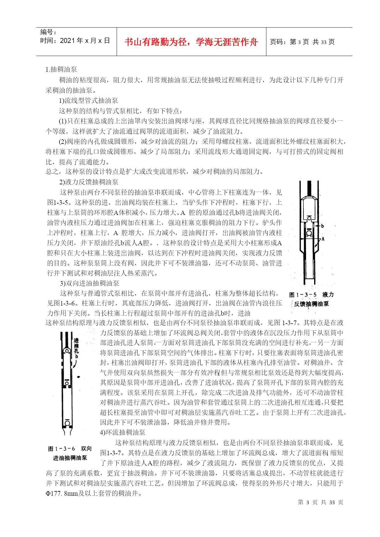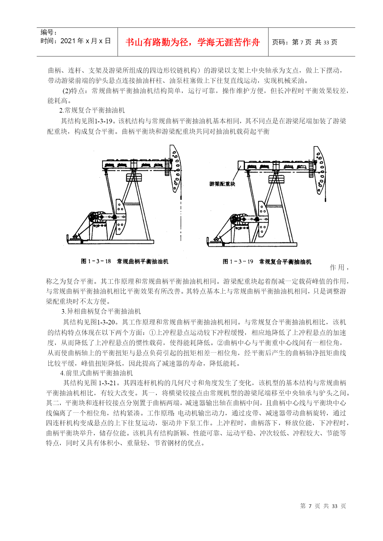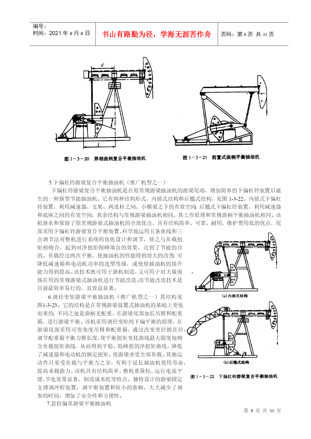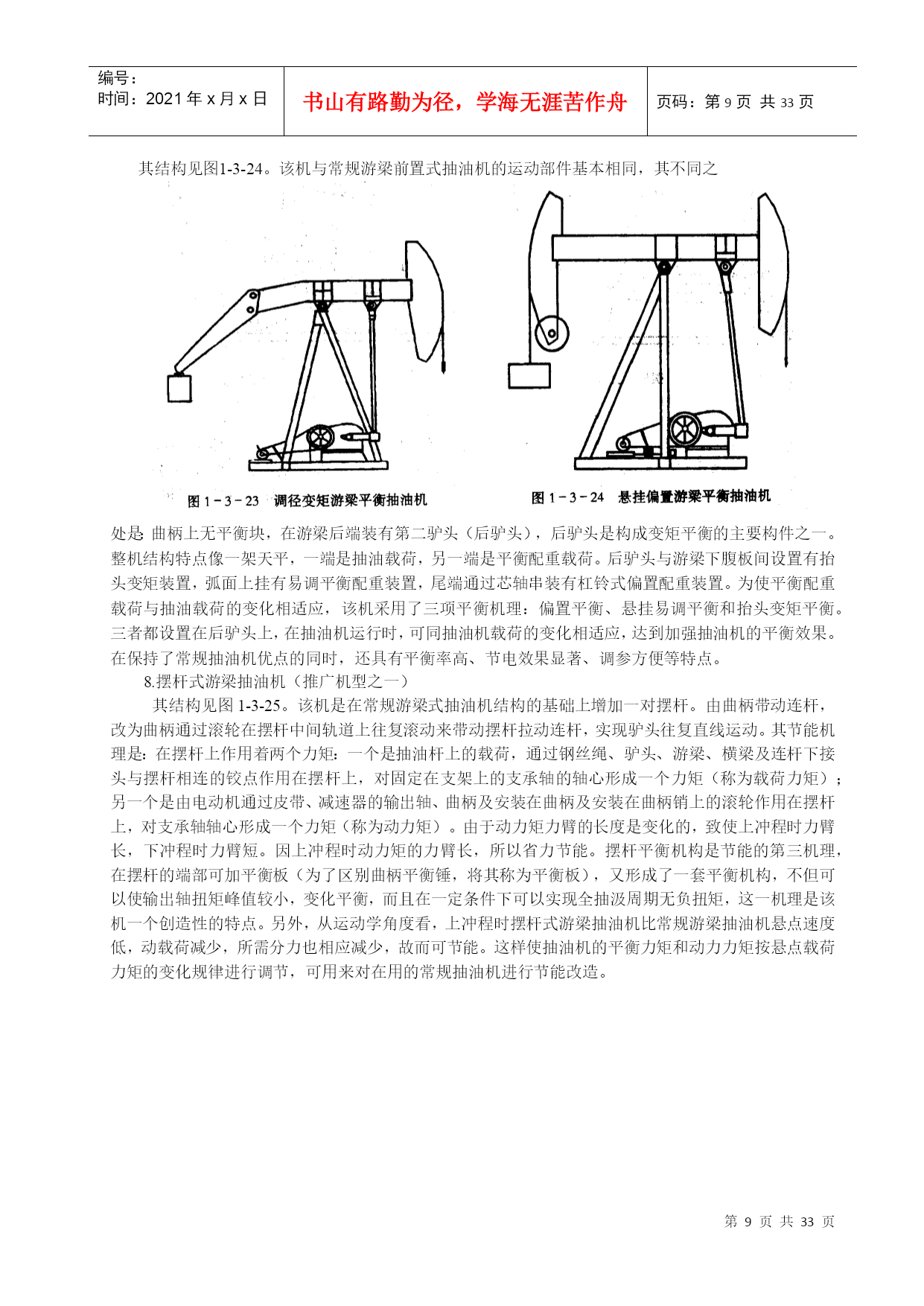 编号:时间:2021年x月x日书山有路勤为径,学海无涯苦作舟页码:第PAGE33页共NUMPAGES33页第PAGE\*MERGEFORMAT33页共NUMPAGES\*MERGEFORMAT33页第三章机械采油常识第一节有杆泵抽油机及井口装置在油田开发过程中,油田达到自喷晚期或停喷后,或原始地层压力不足,要对这些井进行采油,就必须安装一种人工举升装置,以维持所需要的井底流压和生产出地质配产要求的产量。人工举升采油有三种方式可供选择,即气举采油、有杆泵采油和无杆泵采油。当前,我国有杆泵采油方式占人工举升井数的90%。因此,本节就有杆泵抽油机及井口装置做一简单介绍。一、有杆抽油泵有杆抽油泵按用途可分为常规(标准)抽油泵和特种抽油泵两大类。通常,对于符合抽油泵标准设计和制造的抽油泵称作标准抽油泵或常规抽油泵,而具有专门用途的,如防砂、防气、抽稠油等,或具有与标准结构或尺寸不同的抽油泵称作特殊用途的抽油泵或专用抽油泵。我国抽油泵行业标准是SY/T5059-91《抽油泵》。(一)常规抽油泵常规抽油泵又分为管式泵和杆式泵两大类。1.管式抽油泵管式抽油泵是按设计的泵挂深度直接将泵筒连接在井下油管的下端,活塞连接在抽油杆的最下端,见图1-3-1。工作原理:上冲程时,抽油杆柱带动活塞上行,游动阀(排出阀)受自重和油管内液柱压力的作用而关闭,并提升柱塞上部的液体,与此同时柱塞下面的泵筒空间里的压力降低,当其压力低于套管压力时,该空间的液体将顶开油泵固定阀(吸人阀)而进人抽油泵活塞上冲程所让开的泵筒空间。当柱塞下行时,油泵的固定阀靠自重下落而关闭,泵筒内的液体受到压缩,在柱塞继续下行过程中,泵内的压力不断增高,当泵内压力增至超过油管内液柱压力时,将顶开油泵的游动阀使泵筒内的液体进人油管内。由于油泵柱塞在抽油机的带动下,连续做上下往复运动,因而油泵的固定阀和游动阀也将交替地关闭与打开,完成抽油泵的抽汲工作循环。管式抽油泵结构简单,成本低;泵筒壁较厚,承载能力大;在相同的油管尺寸下可安装的管式抽油泵直径比杆式抽油泵大,因而排液量也较大;对于产液量更大的油井还可通过脱接器安装泵径大于油管内径的管式抽油泵。因此在我国得到了广泛的应用。2.杆式抽油泵杆式抽油泵有定筒式顶部固定杆式泵、定筒式底部固定杆式泵及动筒式底部固定杆式泵三种。1)定筒式顶部固定杆式泵这种泵由泵顶部的固定支承装置将泵筒固定在油管内的预定位置上,见图1-3-2。顶部固定方式是杆式泵最常采用的,它不仅使用可靠,而且还具有下列优点:在柱塞运动时可将锁紧装置四周的砂子冲掉,防止砂卡,使起泵作业容易;泵筒可绕顶部锁紧装置这个支点摆动,所以在斜井中下泵时,泵筒和油管都不会损坏;在固定位置深度相同的情况下,泵的沉没度比底部固定的杆式抽油泵更大,所以更适合低产井和低液面并中使用;顶部固定位置使泵本身具有气锚作用,可在含气较多的油井中使用,其缺点为:由于顶部固定,泵筒受内压和液柱向下拉伸的复合载荷,受力状况比较恶劣;柱塞上行程时,泵筒受内部压力高于外部压力,使泵筒内孔增大,漏失量有所增加。2)定筒式底部固定杆式泵这种泵由泵的底部锁紧装置将泵筒固定在油管内的预定位置上,见图1-3-3。底部固定杆式泵应用也较广。它具有泵筒不会因液柱作用而伸长、只受外压、间隙不会增大的特点,适合在深井中使用;泵筒可绕底部锁紧装置这个支点摆动,在斜井中也可使用。但在固定支承套和底部锁紧装置的环形空间处极易沉积砂粒,使起泵作业困难,不宜在含砂井中使用。底部固定,工作时泵筒摆动大,加剧了阀杆、导向套的磨损,故不宜用作长冲程泵。3)动筒式底部固定杆式泵这种泵的泵筒与抽油杆柱连接,并作上下运动,柱塞通过拉管及底部锁紧装置固定在油管内预定位置上的支承套上,见图1-3-4。动筒式底部固定杆式抽油泵,主要用在含砂较多的油井中。因为工作时泵筒上下运动,不停地搅动井液,砂粒不易沉积在锁紧装置上产生卡泵;在周期开采抽油井停抽时,顶部阀球封闭阀座,油管中的砂粒不会沉积在泵内产生卡泵;固定阀和出油阀都为开式阀罩,流体的局部阻力小,有利于含砂较多的井液排出。但这种泵拉杆稳定差,不宜作长冲程泵和在稠油井中使用。杆式泵与管式泵相比具有起下泵时不起下油管的特点,适合在深井中使用。另外,它还具有形式多样、选择的余地大等优点,在我国正在逐步推广使用。(二)特殊用途有杆抽油泵为满足抽油井复杂开采条件(如稠油、高含砂、油气比大、斜井等)对抽油泵的专门要求,近几年,国内外研制出一些具有特殊用途的抽油泵。1.抽稠油泵稠油的粘度很高,阻力很大,用常规抽油泵无法使抽吸过程顺利进行,为此设计以下几种专门开采稠油的抽油泵。1)流线型管式抽油泵这种泵的结构与管式泵相比,有如下特点:(