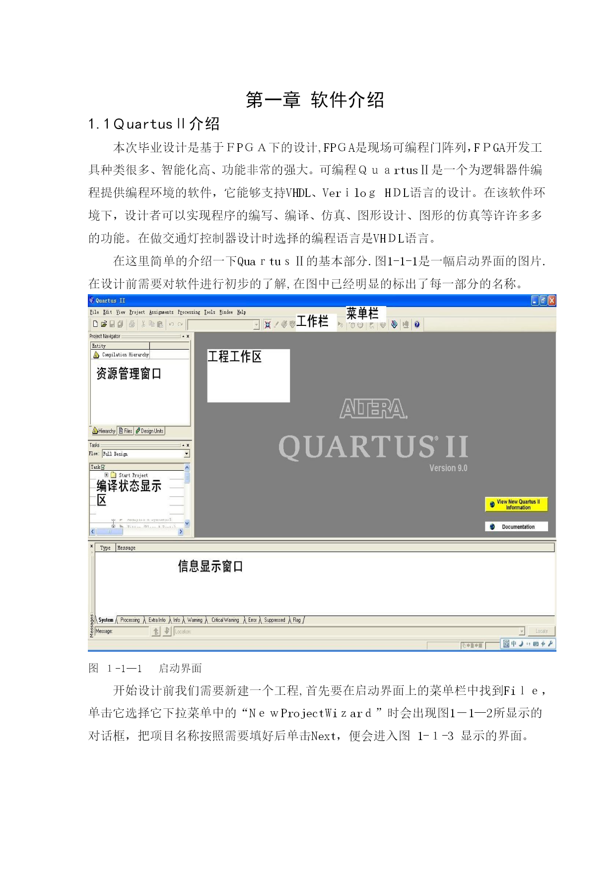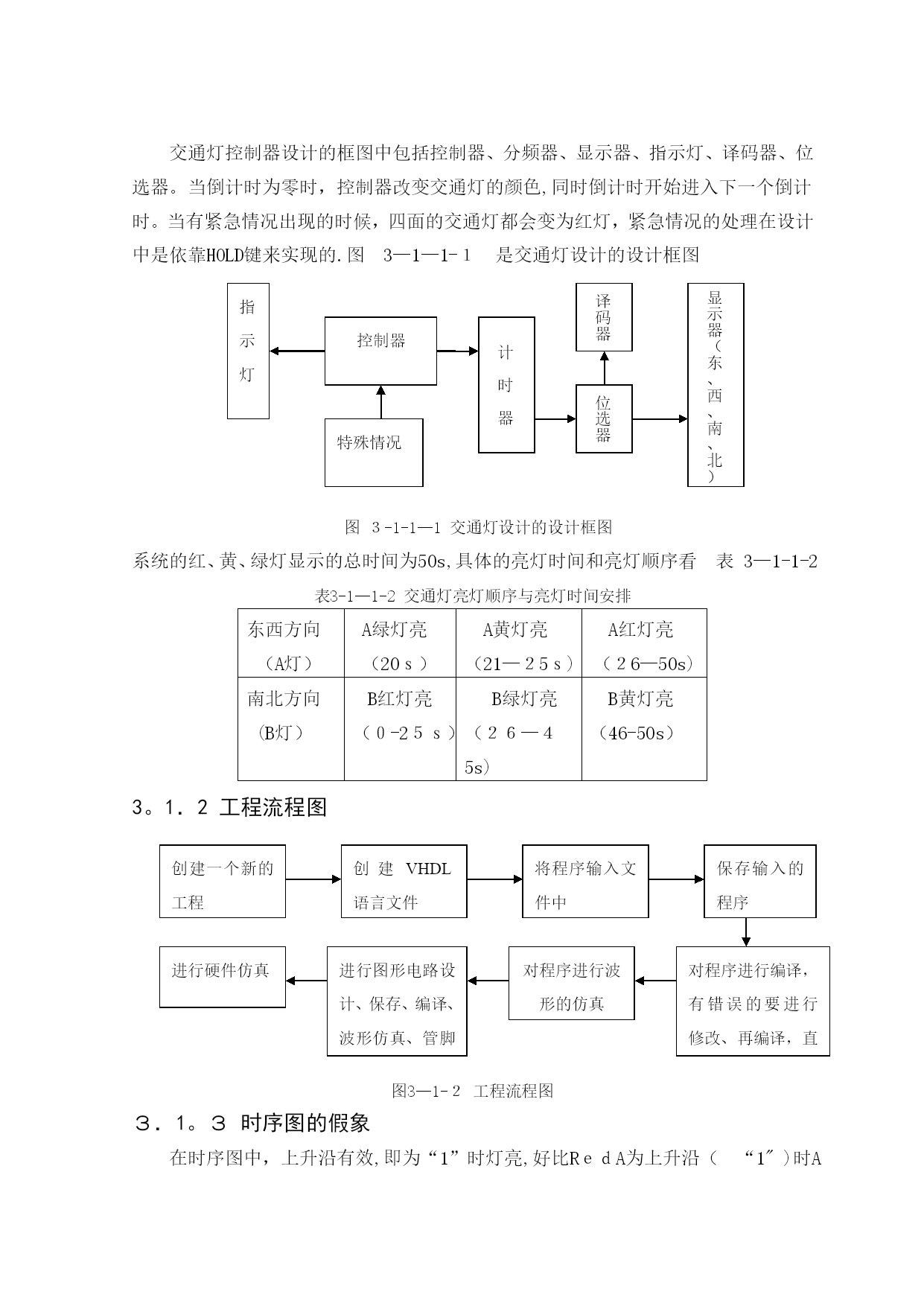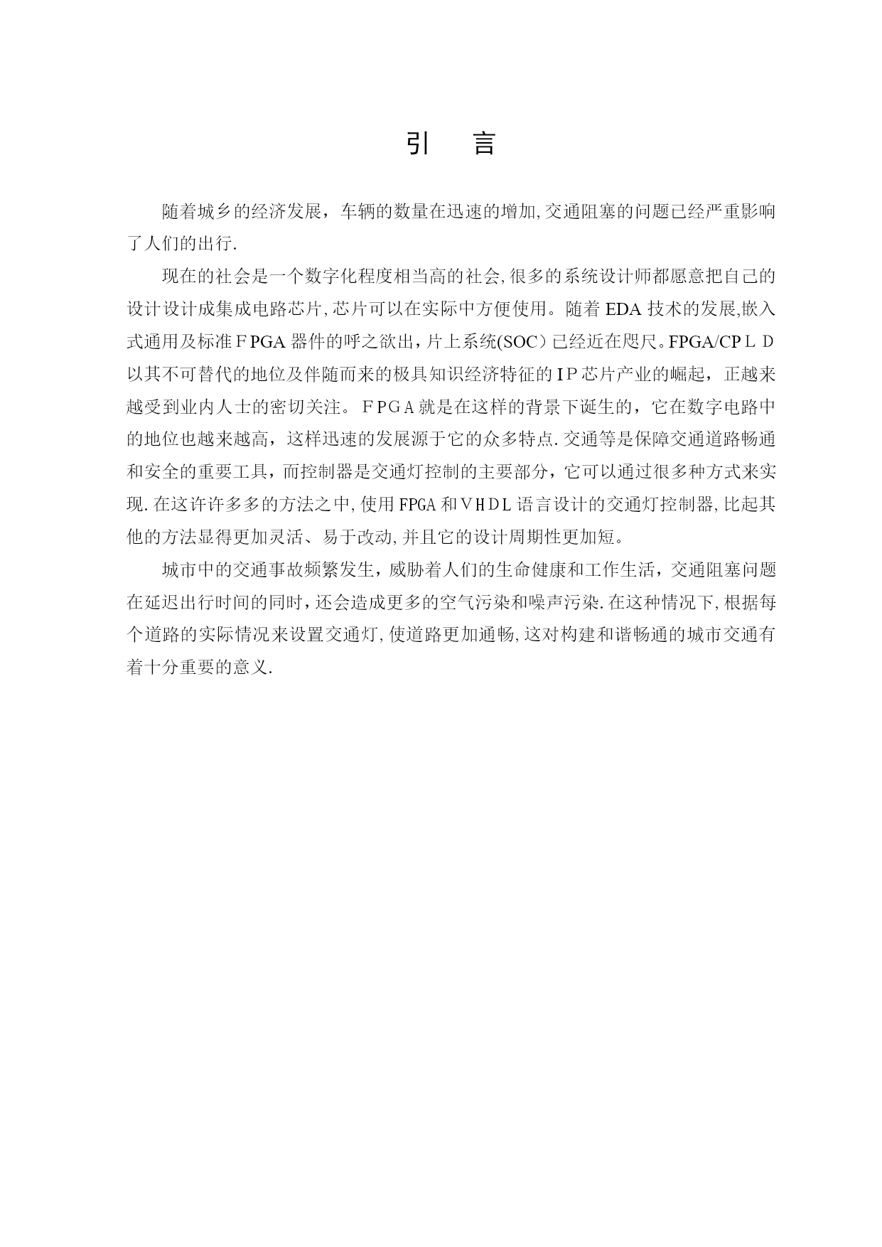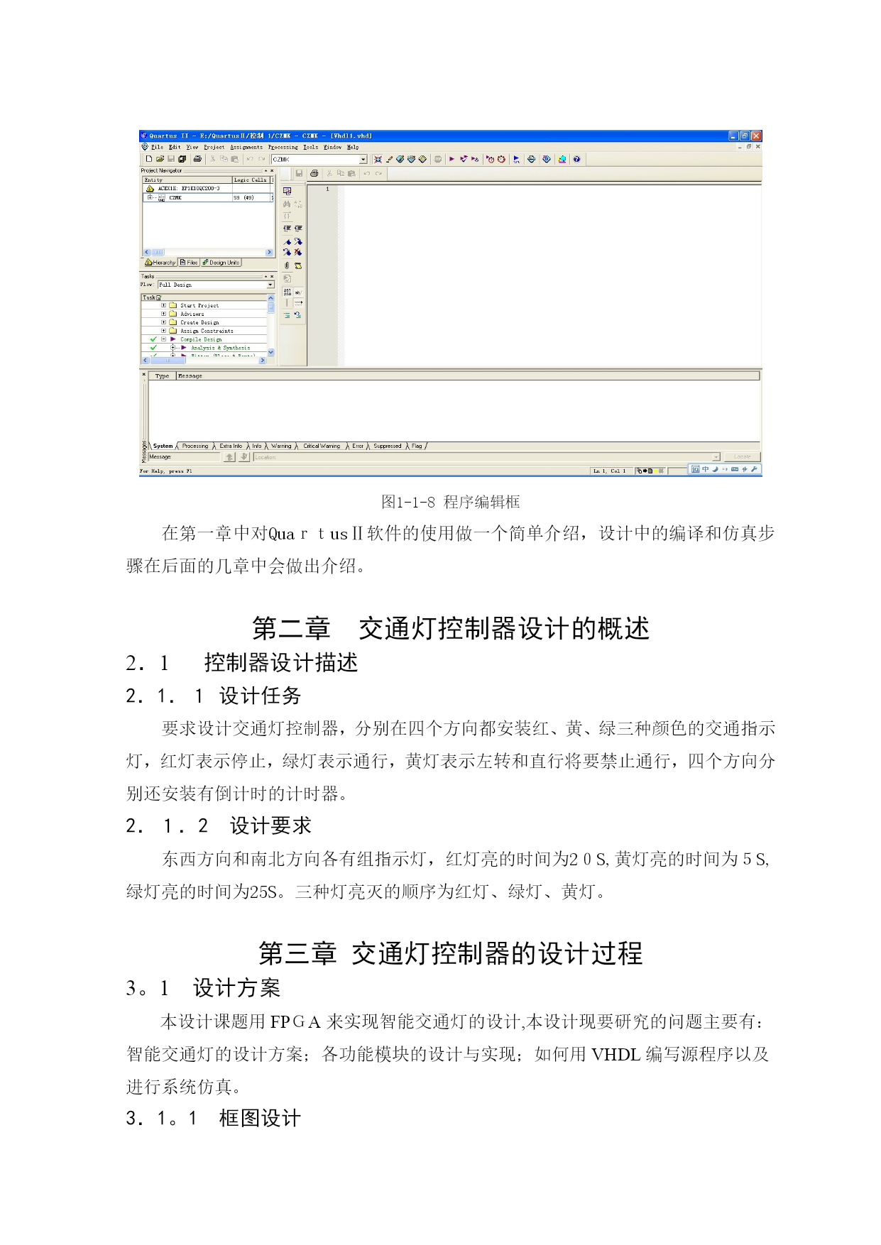 基于FPGA的交通灯控制器设计5(完整资料)(可以直接使用,可编辑优秀版资料,欢迎下载)引言随着城乡的经济发展,车辆的数量在迅速的增加,交通阻塞的问题已经严重影响了人们的出行.现在的社会是一个数字化程度相当高的社会,很多的系统设计师都愿意把自己的设计设计成集成电路芯片,芯片可以在实际中方便使用。随着EDA技术的发展,嵌入式通用及标准FPGA器件的呼之欲出,片上系统(SOC)已经近在咫尺。FPGA/CPLD以其不可替代的地位及伴随而来的极具知识经济特征的IP芯片产业的崛起,正越来越受到业内人士的密切关注。FPGA就是在这样的背景下诞生的,它在数字电路中的地位也越来越高,这样迅速的发展源于它的众多特点.交通等是保障交通道路畅通和安全的重要工具,而控制器是交通灯控制的主要部分,它可以通过很多种方式来实现.在这许许多多的方法之中,使用FPGA和VHDL语言设计的交通灯控制器,比起其他的方法显得更加灵活、易于改动,并且它的设计周期性更加短。城市中的交通事故频繁发生,威胁着人们的生命健康和工作生活,交通阻塞问题在延迟出行时间的同时,还会造成更多的空气污染和噪声污染.在这种情况下,根据每个道路的实际情况来设置交通灯,使道路更加通畅,这对构建和谐畅通的城市交通有着十分重要的意义.第一章软件介绍1.1QuartusⅡ介绍本次毕业设计是基于FPGA下的设计,FPGA是现场可编程门阵列,FPGA开发工具种类很多、智能化高、功能非常的强大。可编程QuartusⅡ是一个为逻辑器件编程提供编程环境的软件,它能够支持VHDL、VerilogHDL语言的设计。在该软件环境下,设计者可以实现程序的编写、编译、仿真、图形设计、图形的仿真等许许多多的功能。在做交通灯控制器设计时选择的编程语言是VHDL语言。在这里简单的介绍一下QuartusⅡ的基本部分.图1-1-1是一幅启动界面的图片.在设计前需要对软件进行初步的了解,在图中已经明显的标出了每一部分的名称。图1-1—1启动界面开始设计前我们需要新建一个工程,首先要在启动界面上的菜单栏中找到File,单击它选择它下拉菜单中的“NewProjectWizard”时会出现图1-1—2所显示的对话框,把项目名称按照需要填好后单击Next,便会进入图1-1-3显示的界面。图1-1-2创建工程框图1-1—3芯片选择框根据自己选择的实验设备选择好相应的芯片型号点击Next,进入下一个步骤当出现图1-1-5时,点击“Finish"后这个工程就建立好了。图1-1-4仿真器选择框图1-1-5对话框建好工程后开始进行设计,首先在图1-1-6中单击file后选择new,接着会出现图1-1—7,在交通灯控制器的设计中我们选择的是VHDLFile,当出现图1—1-8时就可以把编辑的程序敲入编辑器中.图1-1-6工程建好后的界面图1—1-7新建文件类型选择框图1-1-8程序编辑框在第一章中对QuartusⅡ软件的使用做一个简单介绍,设计中的编译和仿真步骤在后面的几章中会做出介绍。第二章交通灯控制器设计的概述2.1控制器设计描述2.1.1设计任务要求设计交通灯控制器,分别在四个方向都安装红、黄、绿三种颜色的交通指示灯,红灯表示停止,绿灯表示通行,黄灯表示左转和直行将要禁止通行,四个方向分别还安装有倒计时的计时器。2.1.2设计要求东西方向和南北方向各有组指示灯,红灯亮的时间为20S,黄灯亮的时间为5S,绿灯亮的时间为25S。三种灯亮灭的顺序为红灯、绿灯、黄灯。第三章交通灯控制器的设计过程3。1设计方案本设计课题用FPGA来实现智能交通灯的设计,本设计现要研究的问题主要有:智能交通灯的设计方案;各功能模块的设计与实现;如何用VHDL编写源程序以及进行系统仿真。3.1。1框图设计交通灯控制器设计的框图中包括控制器、分频器、显示器、指示灯、译码器、位选器。当倒计时为零时,控制器改变交通灯的颜色,同时倒计时开始进入下一个倒计时。当有紧急情况出现的时候,四面的交通灯都会变为红灯,紧急情况的处理在设计中是依靠HOLD键来实现的.图3—1—1-1是交通灯设计的设计框图特殊情况计时器位选器显示器(东、西、南、北)译码器控制器指示灯图3-1-1—1交通灯设计的设计框图系统的红、黄、绿灯显示的总时间为50s,具体的亮灯时间和亮灯顺序看表3—1-1-2表3-1—1-2交通灯亮灯顺序与亮灯时间安排东西方向(A灯)A绿灯亮(20s)A黄灯亮(21—25s)A红灯亮(26—50s)南北方向(B灯)B红灯亮(0-25s)B绿灯亮(26—45s)B黄灯亮(46-50s)3。1.2工程流程图创建一个新的工程创建VHDL语言文件保存输