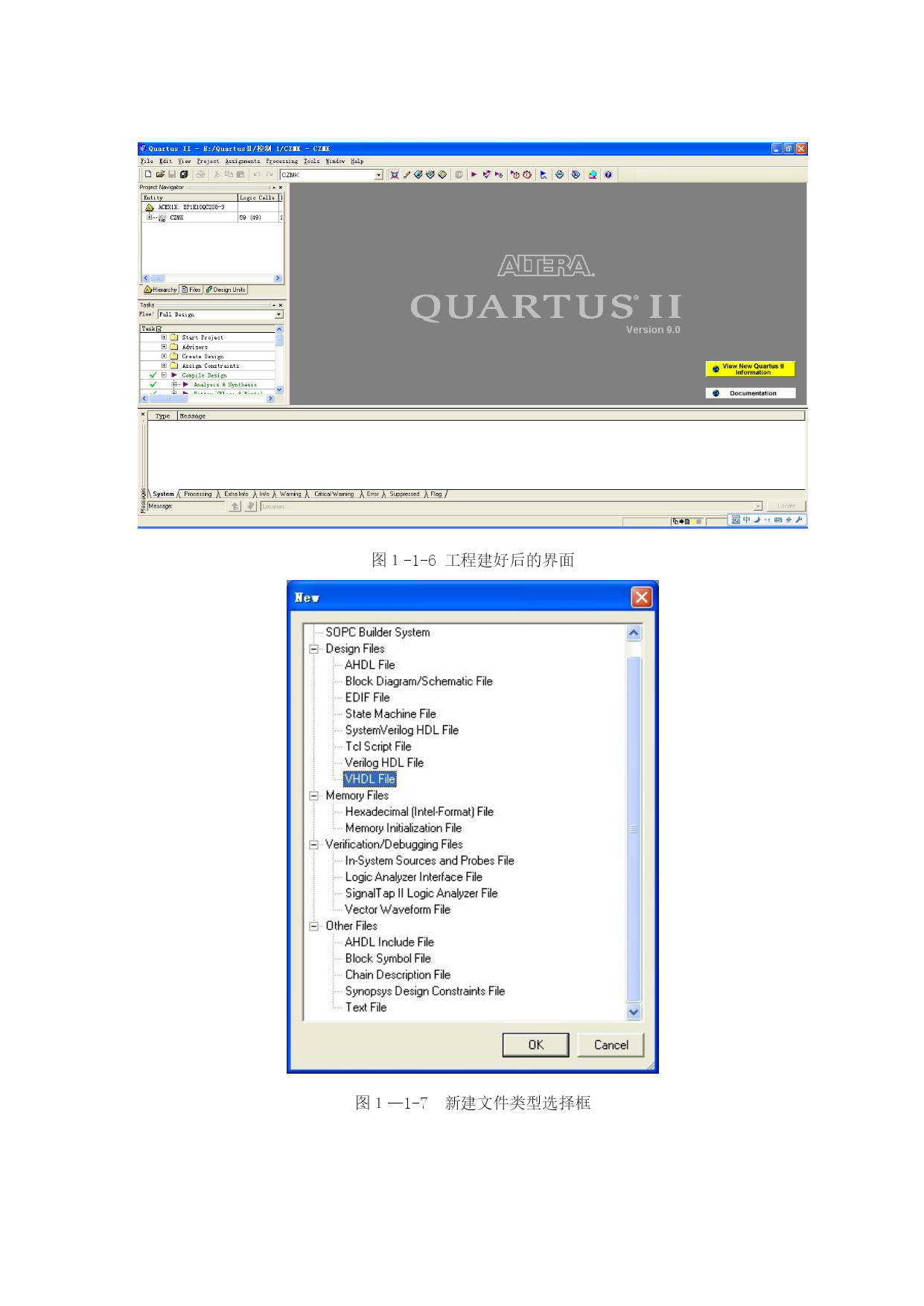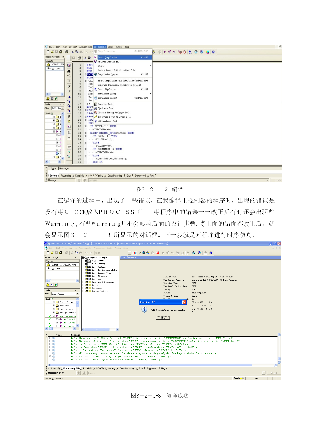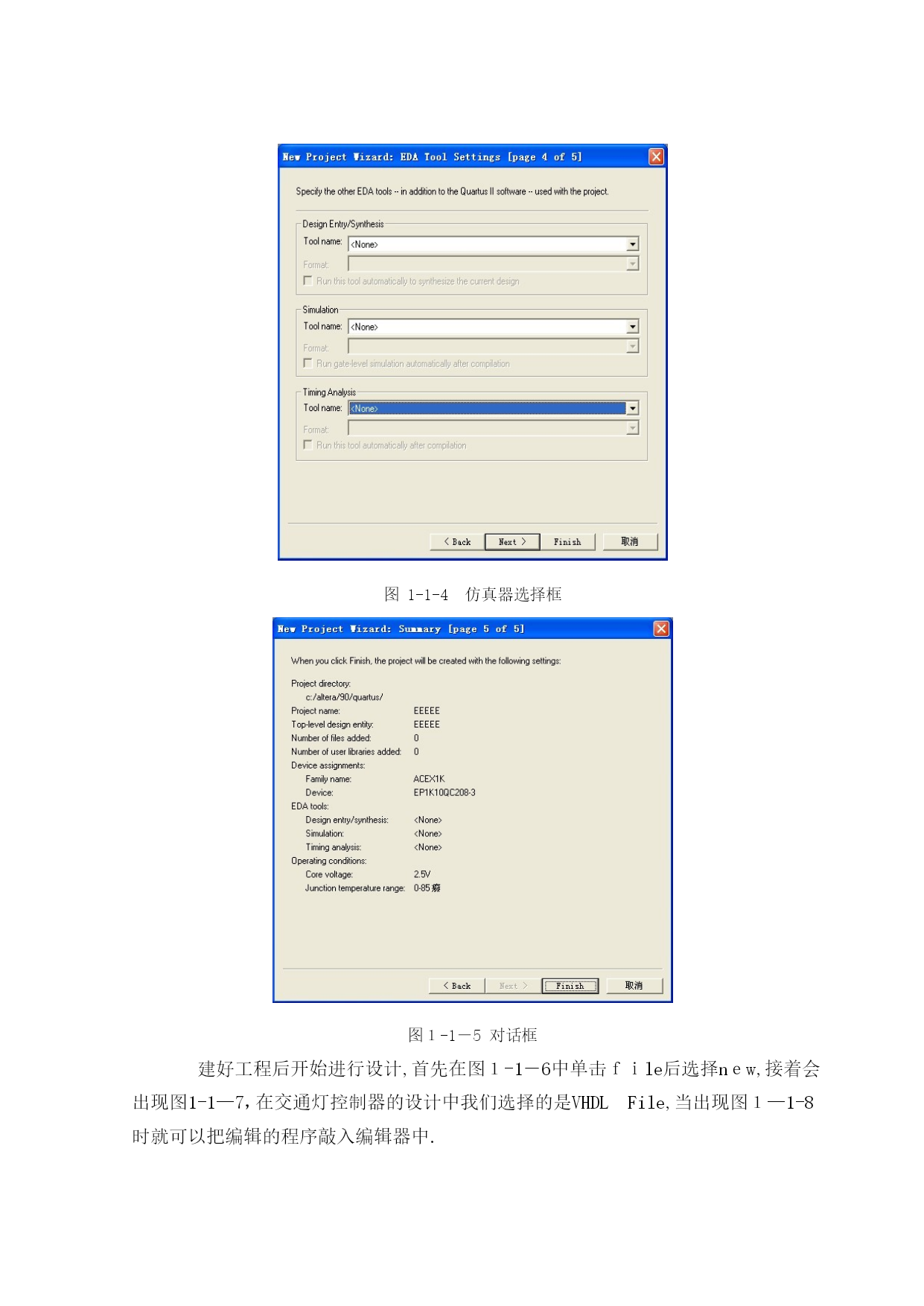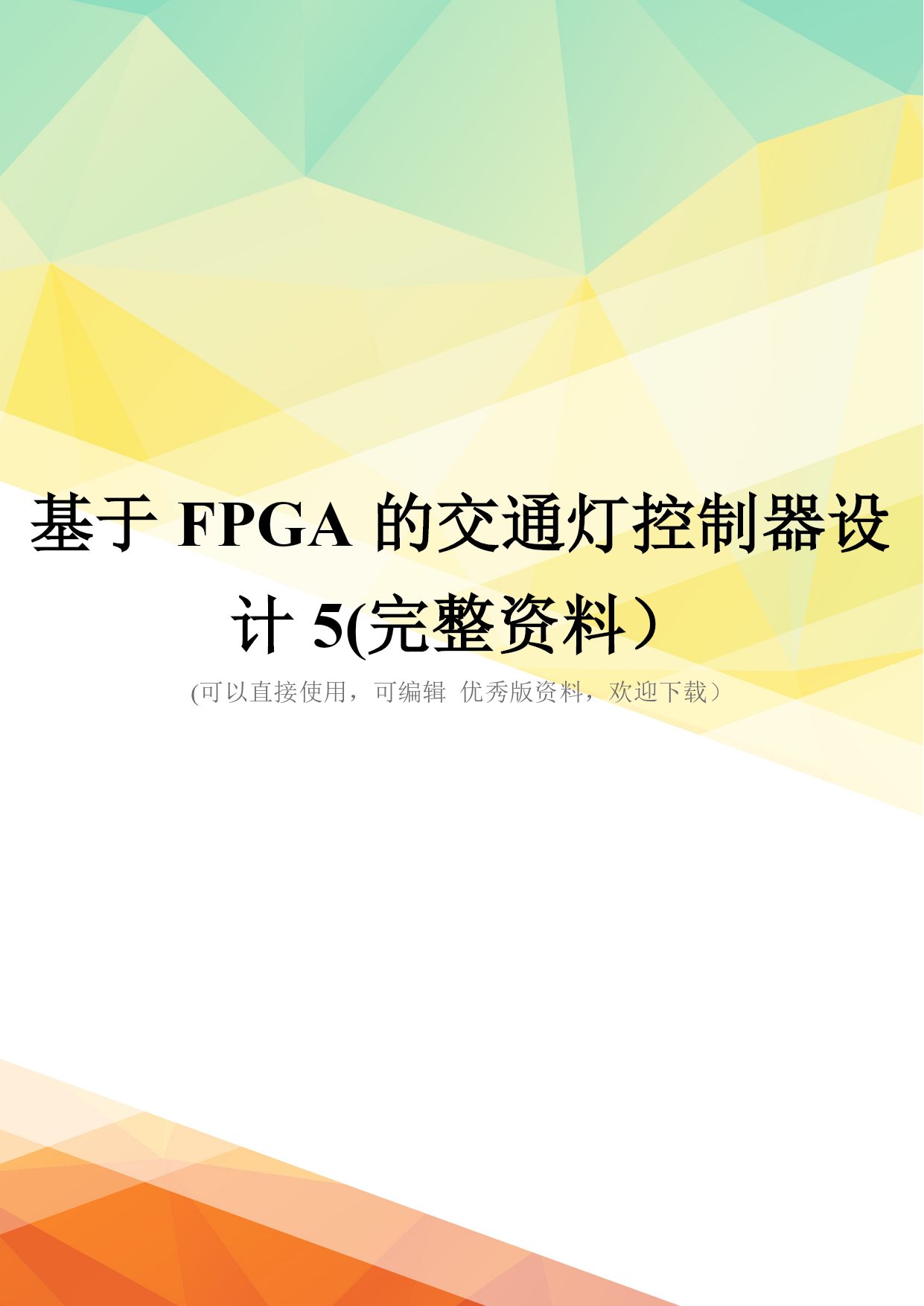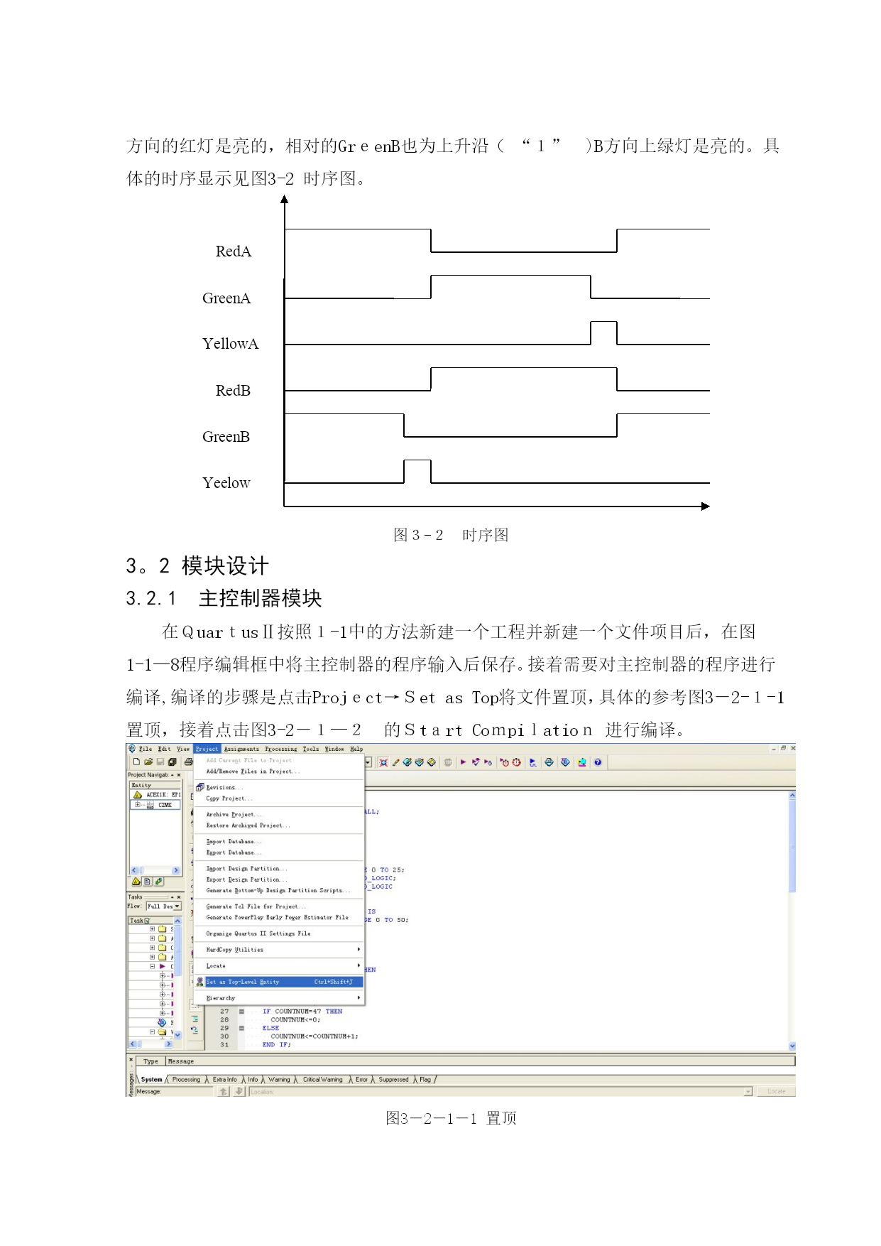 基于FPGA的交通灯控制器设计5(完整资料)(可以直接使用,可编辑优秀版资料,欢迎下载)引言随着城乡的经济发展,车辆的数量在迅速的增加,交通阻塞的问题已经严重影响了人们的出行.现在的社会是一个数字化程度相当高的社会,很多的系统设计师都愿意把自己的设计设计成集成电路芯片,芯片可以在实际中方便使用。随着EDA技术的发展,嵌入式通用及标准FPGA器件的呼之欲出,片上系统(SOC)已经近在咫尺。FPGA/CPLD以其不可替代的地位及伴随而来的极具知识经济特征的IP芯片产业的崛起,正越来越受到业内人士的密切关注。FPGA就是在这样的背景下诞生的,它在数字电路中的地位也越来越高,这样迅速的发展源于它的众多特点.交通等是保障交通道路畅通和安全的重要工具,而控制器是交通灯控制的主要部分,它可以通过很多种方式来实现.在这许许多多的方法之中,使用FPGA和VHDL语言设计的交通灯控制器,比起其他的方法显得更加灵活、易于改动,并且它的设计周期性更加短。城市中的交通事故频繁发生,威胁着人们的生命健康和工作生活,交通阻塞问题在延迟出行时间的同时,还会造成更多的空气污染和噪声污染.在这种情况下,根据每个道路的实际情况来设置交通灯,使道路更加通畅,这对构建和谐畅通的城市交通有着十分重要的意义.第一章软件介绍1.1QuartusⅡ介绍本次毕业设计是基于FPGA下的设计,FPGA是现场可编程门阵列,FPGA开发工具种类很多、智能化高、功能非常的强大。可编程QuartusⅡ是一个为逻辑器件编程提供编程环境的软件,它能够支持VHDL、VerilogHDL语言的设计。在该软件环境下,设计者可以实现程序的编写、编译、仿真、图形设计、图形的仿真等许许多多的功能。在做交通灯控制器设计时选择的编程语言是VHDL语言。在这里简单的介绍一下QuartusⅡ的基本部分.图1-1-1是一幅启动界面的图片.在设计前需要对软件进行初步的了解,在图中已经明显的标出了每一部分的名称。图1-1—1启动界面开始设计前我们需要新建一个工程,首先要在启动界面上的菜单栏中找到File,单击它选择它下拉菜单中的“NewProjectWizard”时会出现图1-1—2所显示的对话框,把项目名称按照需要填好后单击Next,便会进入图1-1-3显示的界面。图1-1-2创建工程框图1-1—3芯片选择框根据自己选择的实验设备选择好相应的芯片型号点击Next,进入下一个步骤当出现图1-1-5时,点击“Finish"后这个工程就建立好了。图1-1-4仿真器选择框图1-1-5对话框建好工程后开始进行设计,首先在图1-1-6中单击file后选择new,接着会出现图1-1—7,在交通灯控制器的设计中我们选择的是VHDLFile,当出现图1—1-8时就可以把编辑的程序敲入编辑器中.图1-1-6工程建好后的界面图1—1-7新建文件类型选择框图1-1-8程序编辑框在第一章中对QuartusⅡ软件的使用做一个简单介绍,设计中的编译和仿真步骤在后面的几章中会做出介绍。第二章交通灯控制器设计的概述2.1控制器设计描述2.1.1设计任务要求设计交通灯控制器,分别在四个方向都安装红、黄、绿三种颜色的交通指示灯,红灯表示停止,绿灯表示通行,黄灯表示左转和直行将要禁止通行,四个方向分别还安装有倒计时的计时器。2.1.2设计要求东西方向和南北方向各有组指示灯,红灯亮的时间为20S,黄灯亮的时间为5S,绿灯亮的时间为25S。三种灯亮灭的顺序为红灯、绿灯、黄灯。第三章交通灯控制器的设计过程3。1设计方案本设计课题用FPGA来实现智能交通灯的设计,本设计现要研究的问题主要有:智能交通灯的设计方案;各功能模块的设计与实现;如何用VHDL编写源程序以及进行系统仿真。3.1。1框图设计交通灯控制器设计的框图中包括控制器、分频器、显示器、指示灯、译码器、位选器。当倒计时为零时,控制器改变交通灯的颜色,同时倒计时开始进入下一个倒计时。当有紧急情况出现的时候,四面的交通灯都会变为红灯,紧急情况的处理在设计中是依靠HOLD键来实现的.图3—1—1-1是交通灯设计的设计框图特殊情况计时器位选器显示器(东、西、南、北)译码器控制器指示灯图3-1-1—1交通灯设计的设计框图系统的红、黄、绿灯显示的总时间为50s,具体的亮灯时间和亮灯顺序看表3—1-1-2表3-1—1-2交通灯亮灯顺序与亮灯时间安排东西方向(A灯)A绿灯亮(20s)A黄灯亮(21—25s)A红灯亮(26—50s)南北方向(B灯)B红灯亮(0-25s)B绿灯亮(26—45s)B黄灯亮(46-50s)3。1.2工程流程图创建一个新的工程创建VHDL语言文件保存输