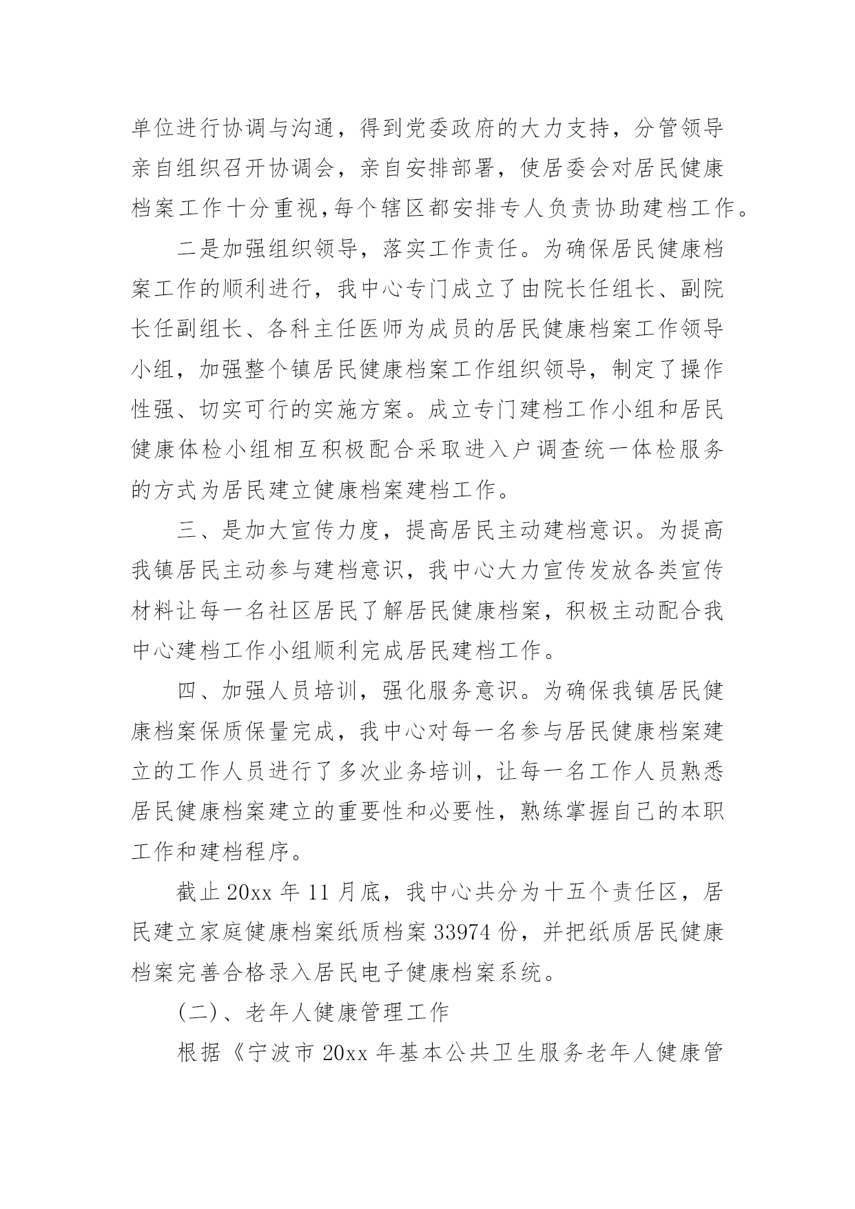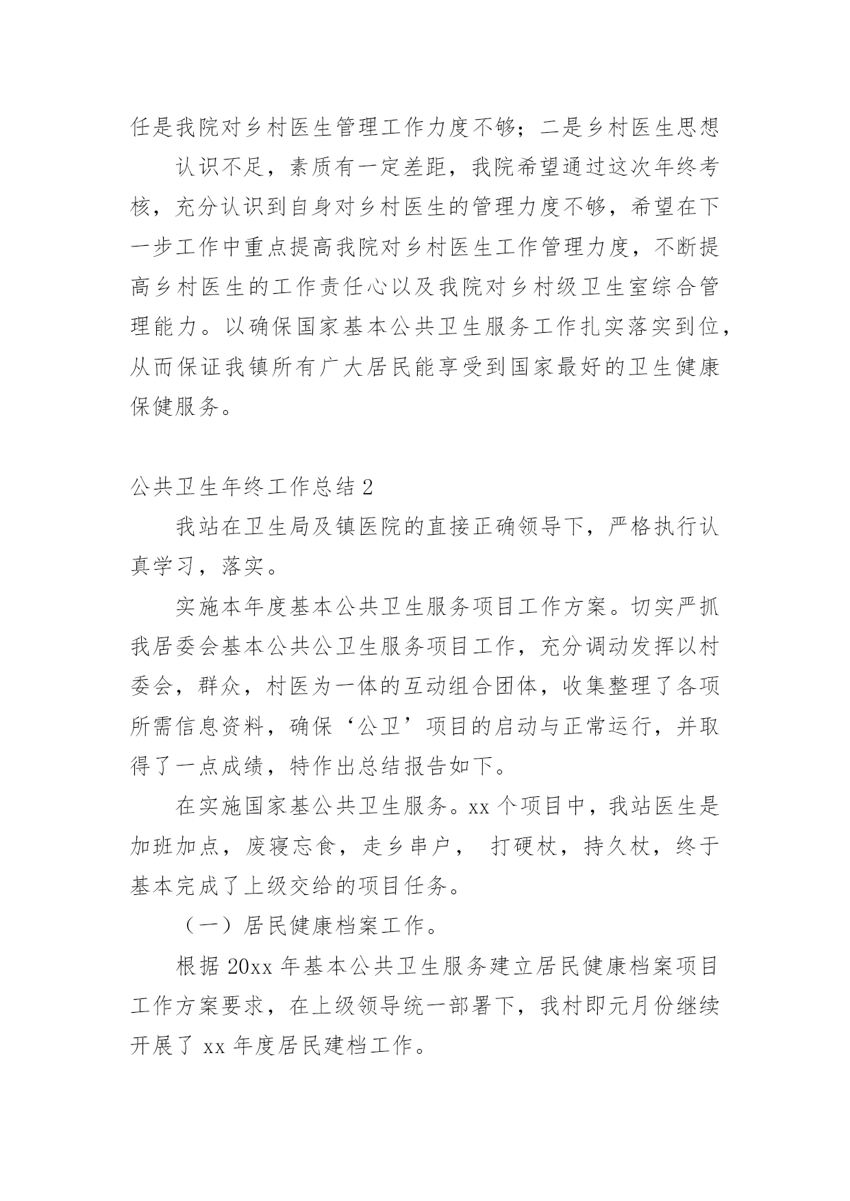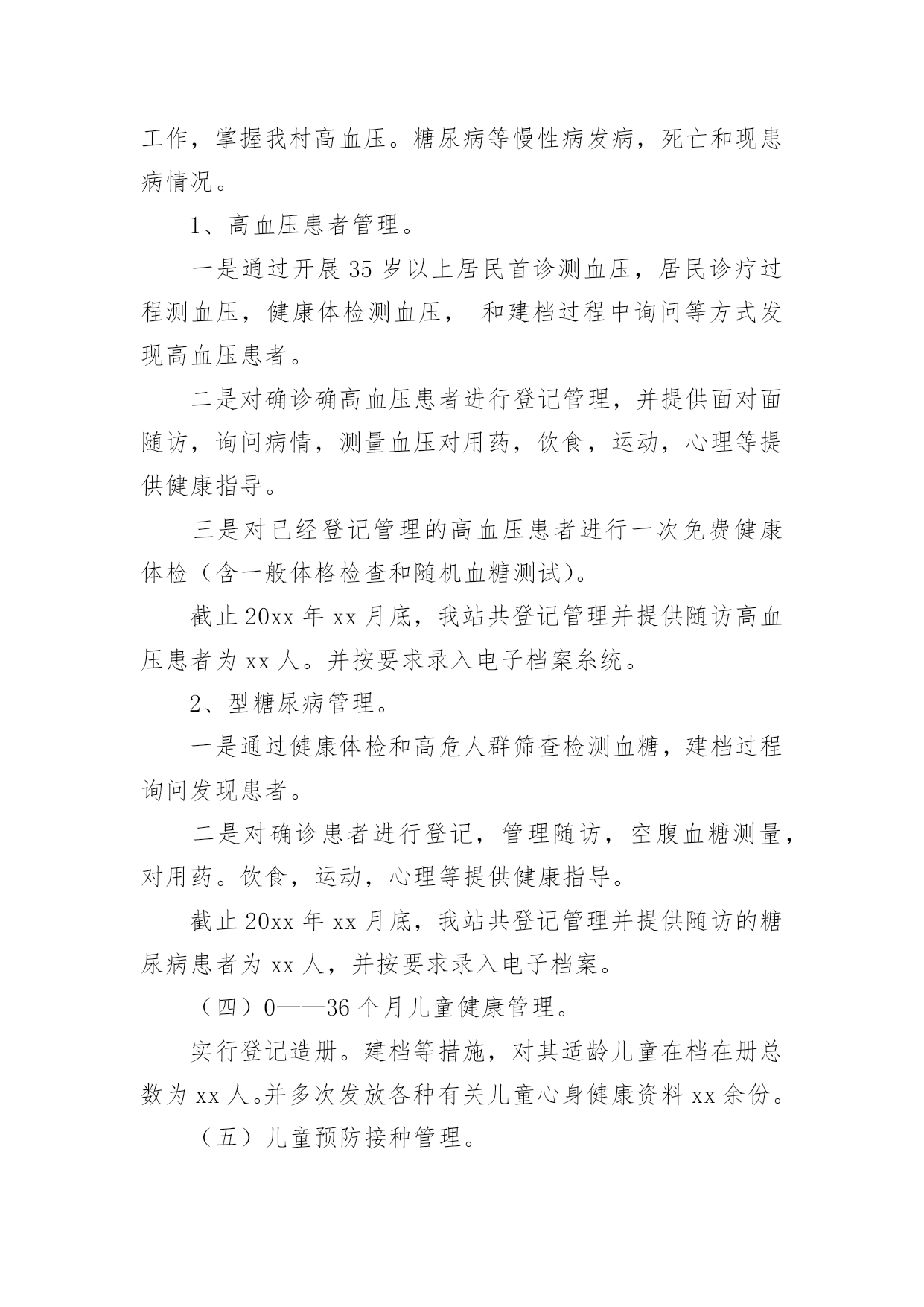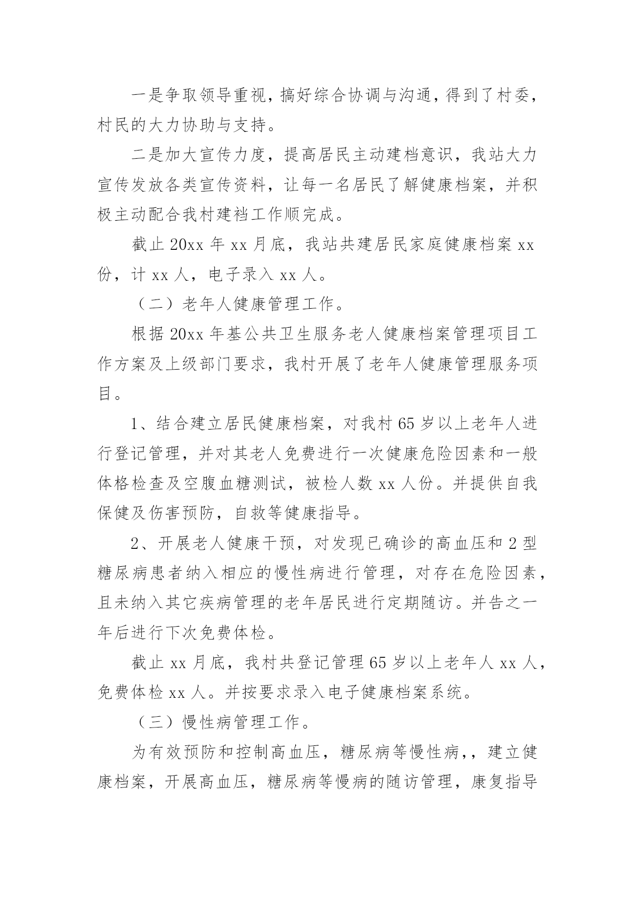 公共卫生年终工作总结总结就是把一个时段的学习、工作或其完成情况进行一次全面系统的总结,它可以提升我们发现问题的能力,让我们来为自己写一份总结吧。那么总结应该包括什么内容呢?以下是小编为大家整理的公共卫生年终工作总结,欢迎大家借鉴与参考,希望对大家有所帮助。公共卫生年终工作总结1为了进一步加强乡村医生管理,以提高乡村医生待遇,稳定农村卫生服务队伍,健全农村公共卫生服务体系,提高农村公共卫生服务能力,根据卫生局指示和精神及乡村医生年终工作绩效考核制度和管理细则,我院组织专班小组于20xx年1月5-6日对我镇辖区所有从事公共卫生的乡村医生进行了年终考核。现将考核情况总结如下:(一)各乡村卫生室基本公共卫生服务项目开展落实情况:专班小组对村级卫生室组织管理、公共卫生服务项目指标、满意度调查一系列工作进行考核并对其评分,参加考核人数26人,其中80分及以上为2人,70分及以上为13人,60分及以上为11人,优秀率为46%,合格率为100%。本次考核总分1607分,平均为66.9分,此次考核结果直接与乡村医生公共卫生服务补助经费挂钩,并将年终考核成绩纳入乡村医生定期执业考核范畴。(二)、基本药物制度及新农合开展情况院办小组对村级基本药物制度及新农合开展情况进行一系列的检查,有的乡村卫生室工作完成较好,开展工作基本完善,但个别医生仍不够重视,完成情况不到位。群众满意度不高。从考核情况总的来看,我镇所有的乡村医生在去年的国家公共卫生服务工作中,作出了一定的成绩和贡献,基本上能按照上级部门的安排和指示完成国家公共卫生服务项目的要求和任务,但是个别乡村医生的工作不能及时到位,其主要体现在以下几方面:一、健康知识讲座未开展,宣传教育力度不够二、传染病管理思想意识不强,经常迟报漏报,无传染病登记及报告。三、儿童基本情况摸底不清楚,对辖区内所有的儿童人数掌握不够彻底。四、慢性病管理工作不扎实,对上级下达的慢性病跟踪随访工作任务不能及时到位和有虚假现象。五,有例会迟到现象及未参加但没请假现象。六,对新生儿报告不及时和迟报、漏报现象。七,对叶酸的发放工作不重视发放卡及汇总表填写不规范及发现新增目标不及时。八、群众对基本药物制度认识度不够,新农合满意度不高。从以上年终考核综合分析来看,出现这些问题,主要责任是我院对乡村医生管理工作力度不够;二是乡村医生思想认识不足,素质有一定差距,我院希望通过这次年终考核,充分认识到自身对乡村医生的管理力度不够,希望在下一步工作中重点提高我院对乡村医生工作管理力度,不断提高乡村医生的工作责任心以及我院对乡村级卫生室综合管理能力。以确保国家基本公共卫生服务工作扎实落实到位,从而保证我镇所有广大居民能享受到国家最好的卫生健康保健服务。公共卫生年终工作总结2我站在卫生局及镇医院的直接正确领导下,严格执行认真学习,落实。实施本年度基本公共卫生服务项目工作方案。切实严抓我居委会基本公共公卫生服务项目工作,充分调动发挥以村委会,群众,村医为一体的互动组合团体,收集整理了各项所需信息资料,确保‘公卫’项目的启动与正常运行,并取得了一点成绩,特作出总结报告如下。在实施国家基公共卫生服务。xx个项目中,我站医生是加班加点,废寝忘食,走乡串户,打硬杖,持久杖,终于基本完成了上级交给的项目任务。(一)居民健康档案工作。根据20xx年基本公共卫生服务建立居民健康档案项目工作方案要求,在上级领导统一部署下,我村即元月份继续开展了xx年度居民建档工作。一是争取领导重视,搞好综合协调与沟通,得到了村委,村民的大力协助与支持。二是加大宣传力度,提高居民主动建档意识,我站大力宣传发放各类宣传资料,让每一名居民了解健康档案,并积极主动配合我村建裆工作顺完成。截止20xx年xx月底,我站共建居民家庭健康档案xx份,计xx人,电子录入xx人。(二)老年人健康管理工作。根据20xx年基公共卫生服务老人健康档案管理项目工作方案及上级部门要求,我村开展了老年人健康管理服务项目。1、结合建立居民健康档案,对我村65岁以上老年人进行登记管理,并对其老人免费进行一次健康危险因素和一般体格检查及空腹血糖测试,被检人数xx人份。并提供自我保健及伤害预防,自救等健康指导。2、开展老人健康干预,对发现已确诊的高血压和2型糖尿病患者纳入相应的慢性病进行管理,对存在危险因素,且未纳入其它疾病管理的老年居民进行定期随访。并告之一年后进行下次免费体检。截止xx月底,我村共登记管理65岁以上老年人xx人,免费体检xx人。并按要求录入电子健康档案系统。(三)慢性病管理工作。为有效预防和控制高血压,糖尿病等慢性病,,建立健康档案,开展高血压,糖尿病等慢病的随访管理,康复指导工作,掌握我村高血压。糖尿病等慢性病发病,死亡和现患病情况。1、高血压患者管理。一是通过开展35岁以上居民首诊测血压,居民