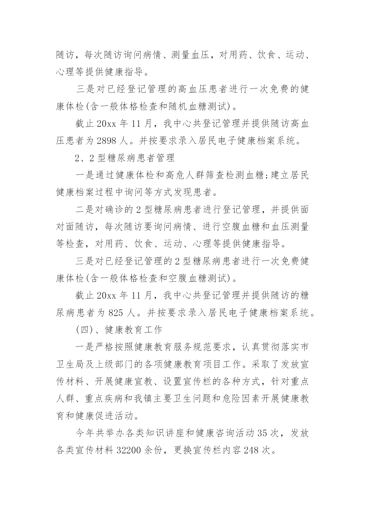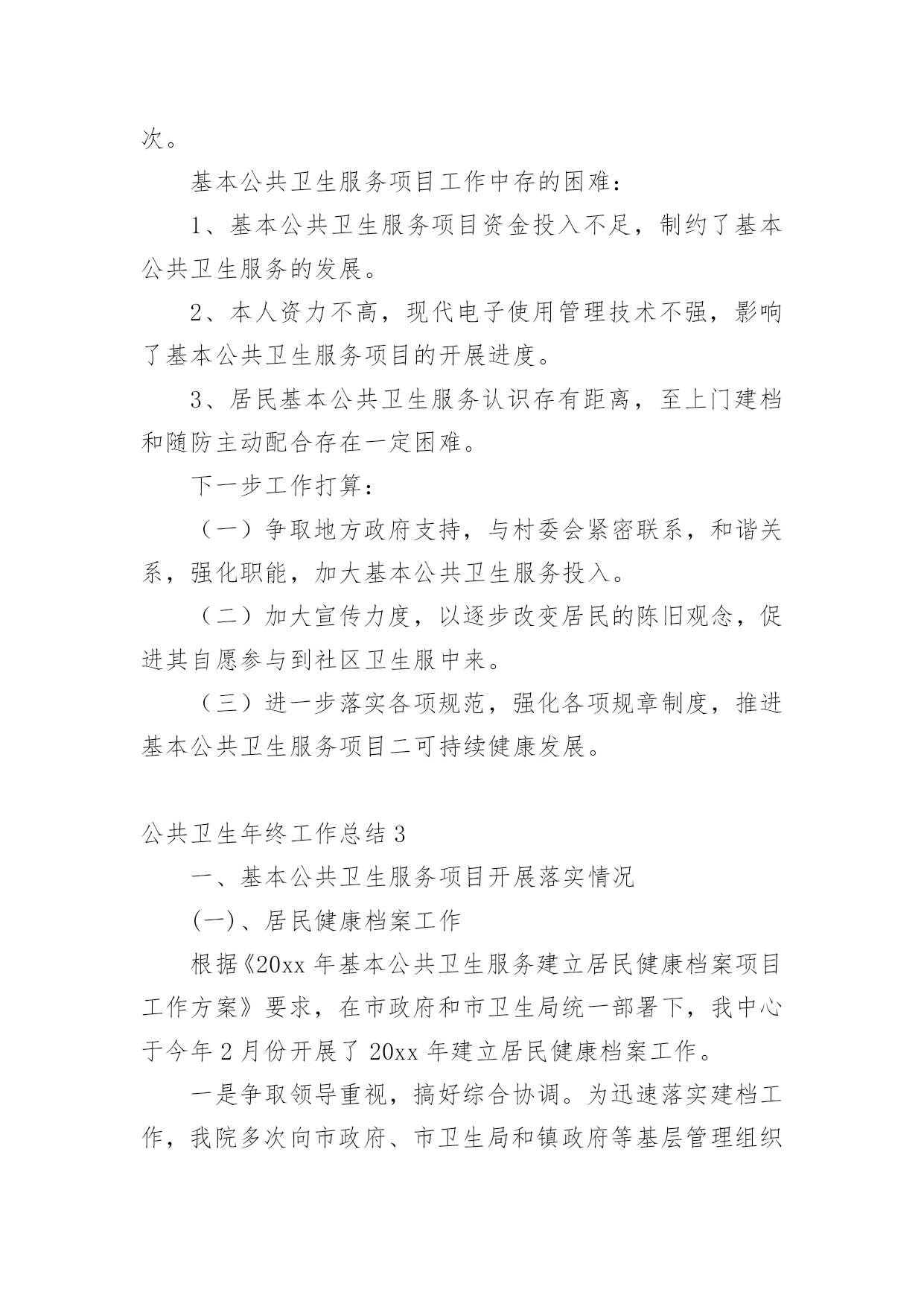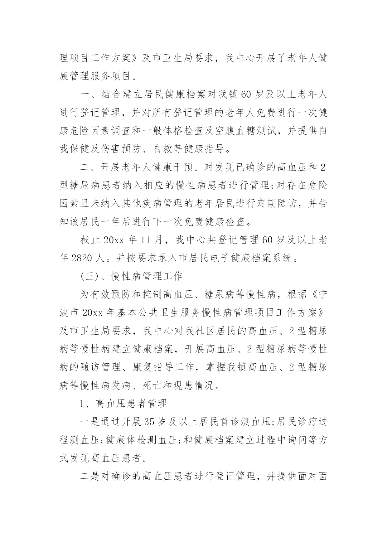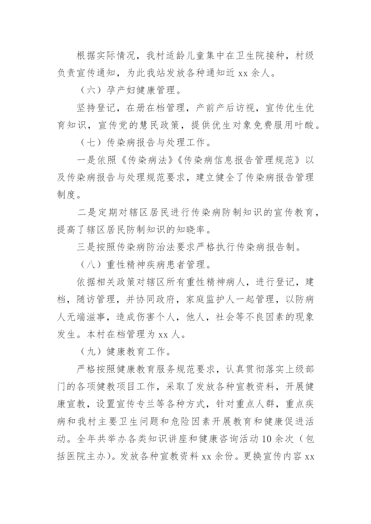 公共卫生年终工作总结总结就是把一个时段的学习、工作或其完成情况进行一次全面系统的总结,它可以提升我们发现问题的能力,让我们来为自己写一份总结吧。那么总结应该包括什么内容呢?以下是小编为大家整理的公共卫生年终工作总结,欢迎大家借鉴与参考,希望对大家有所帮助。公共卫生年终工作总结1为了进一步加强乡村医生管理,以提高乡村医生待遇,稳定农村卫生服务队伍,健全农村公共卫生服务体系,提高农村公共卫生服务能力,根据卫生局指示和精神及乡村医生年终工作绩效考核制度和管理细则,我院组织专班小组于20xx年1月5-6日对我镇辖区所有从事公共卫生的乡村医生进行了年终考核。现将考核情况总结如下:(一)各乡村卫生室基本公共卫生服务项目开展落实情况:专班小组对村级卫生室组织管理、公共卫生服务项目指标、满意度调查一系列工作进行考核并对其评分,参加考核人数26人,其中80分及以上为2人,70分及以上为13人,60分及以上为11人,优秀率为46%,合格率为100%。本次考核总分1607分,平均为66.9分,此次考核结果直接与乡村医生公共卫生服务补助经费挂钩,并将年终考核成绩纳入乡村医生定期执业考核范畴。(二)、基本药物制度及新农合开展情况院办小组对村级基本药物制度及新农合开展情况进行一系列的检查,有的乡村卫生室工作完成较好,开展工作基本完善,但个别医生仍不够重视,完成情况不到位。群众满意度不高。从考核情况总的来看,我镇所有的乡村医生在去年的国家公共卫生服务工作中,作出了一定的成绩和贡献,基本上能按照上级部门的安排和指示完成国家公共卫生服务项目的要求和任务,但是个别乡村医生的工作不能及时到位,其主要体现在以下几方面:一、健康知识讲座未开展,宣传教育力度不够二、传染病管理思想意识不强,经常迟报漏报,无传染病登记及报告。三、儿童基本情况摸底不清楚,对辖区内所有的儿童人数掌握不够彻底。四、慢性病管理工作不扎实,对上级下达的慢性病跟踪随访工作任务不能及时到位和有虚假现象。五,有例会迟到现象及未参加但没请假现象。六,对新生儿报告不及时和迟报、漏报现象。七,对叶酸的发放工作不重视发放卡及汇总表填写不规范及发现新增目标不及时。八、群众对基本药物制度认识度不够,新农合满意度不高。从以上年终考核综合分析来看,出现这些问题,主要责任是我院对乡村医生管理工作力度不够;二是乡村医生思想认识不足,素质有一定差距,我院希望通过这次年终考核,充分认识到自身对乡村医生的管理力度不够,希望在下一步工作中重点提高我院对乡村医生工作管理力度,不断提高乡村医生的工作责任心以及我院对乡村级卫生室综合管理能力。以确保国家基本公共卫生服务工作扎实落实到位,从而保证我镇所有广大居民能享受到国家最好的卫生健康保健服务。公共卫生年终工作总结2我站在卫生局及镇医院的直接正确领导下,严格执行认真学习,落实。实施本年度基本公共卫生服务项目工作方案。切实严抓我居委会基本公共公卫生服务项目工作,充分调动发挥以村委会,群众,村医为一体的互动组合团体,收集整理了各项所需信息资料,确保‘公卫’项目的启动与正常运行,并取得了一点成绩,特作出总结报告如下。在实施国家基公共卫生服务。xx个项目中,我站医生是加班加点,废寝忘食,走乡串户,打硬杖,持久杖,终于基本完成了上级交给的项目任务。(一)居民健康档案工作。根据20xx年基本公共卫生服务建立居民健康档案项目工作方案要求,在上级领导统一部署下,我村即元月份继续开展了xx年度居民建档工作。一是争取领导重视,搞好综合协调与沟通,得到了村委,村民的大力协助与支持。二是加大宣传力度,提高居民主动建档意识,我站大力宣传发放各类宣传资料,让每一名居民了解健康档案,并积极主动配合我村建裆工作顺完成。截止20xx年xx月底,我站共建居民家庭健康档案xx份,计xx人,电子录入xx人。(二)老年人健康管理工作。根据20xx年基公共卫生服务老人健康档案管理项目工作方案及上级部门要求,我村开展了老年人健康管理服务项目。1、结合建立居民健康档案,对我村65岁以上老年人进行登记管理,并对其老人免费进行一次健康危险因素和一般体格检查及空腹血糖测试,被检人数xx人份。并提供自我保健及伤害预防,自救等健康指导。2、开展老人健康干预,对发现已确诊的高血压和2型糖尿病患者纳入相应的慢性病进行管理,对存在危险因素,且未纳入其它疾病管理的老年居民进行定期随访。并告之一年后进行下次免费体检。截止xx月底,我村共登记管理65岁以上老年人xx人,免费体检xx人。并按要求录入电子健康档案系统。(三)慢性病管理工作。为有效预防和控制高血压,糖尿病等慢性病,,建立健康档案,开展高血压,糖尿病等慢病的随访管理,康复指导工作,掌握我村高血压。糖尿病等慢性病发病,死亡和现患病情况。1、高血压患者管理。一是通过开展35岁以上居民首诊测血压,居民