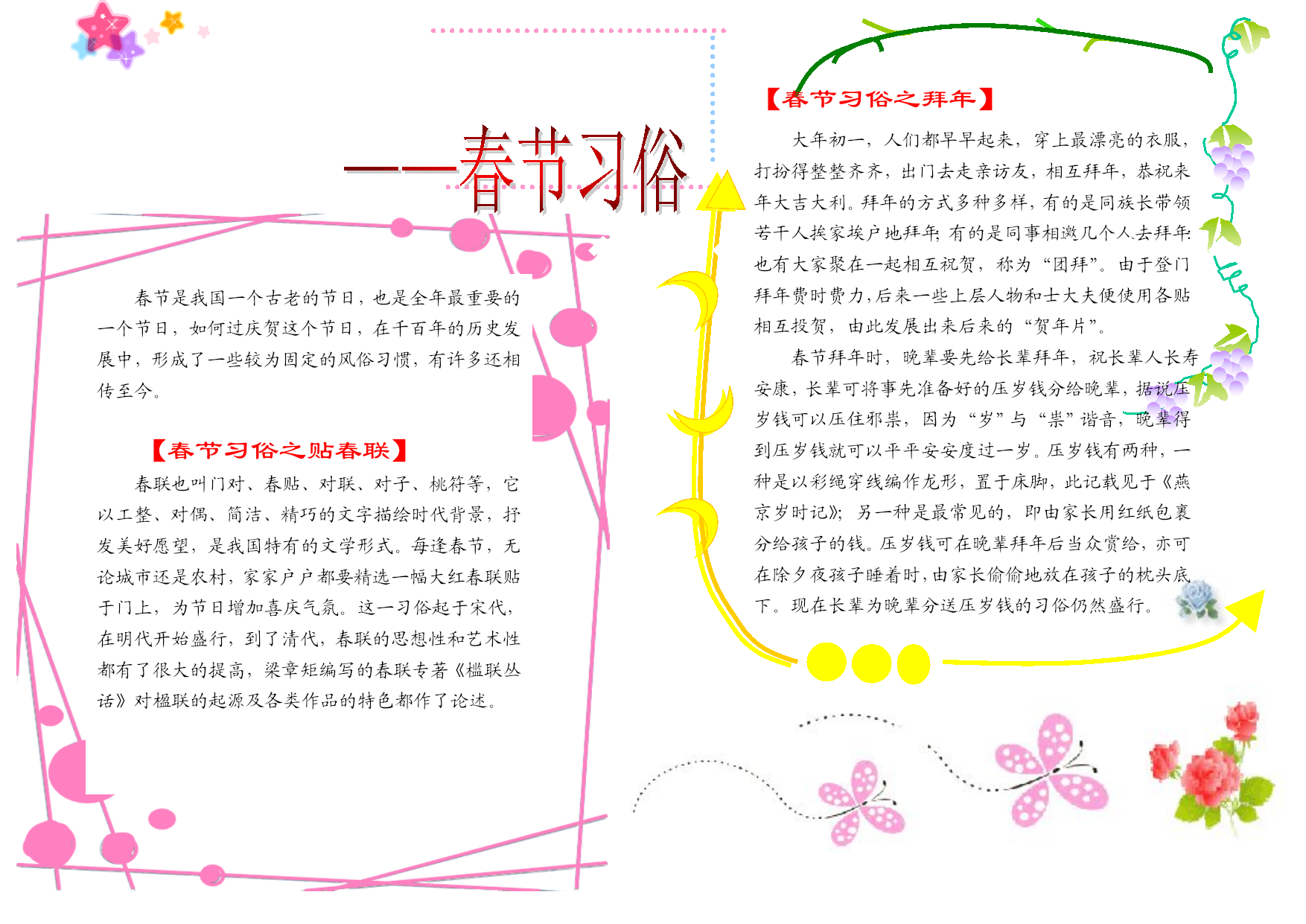 【春节习俗之拜年】大年初一,人们都早早起来,穿上最漂亮的衣服,打扮得整整齐齐,出门去走亲访友,相互拜年,恭祝来年大吉大利。拜年的方式多种多样,有的是同族长带领若干人挨家挨户地拜年;有的是同事相邀几个人去拜年;也有大家聚在一起相互祝贺,称为“团拜”。由于登门拜年费时费力,后来一些上层人物和士大夫便使用各贴相互投贺,由此发展出来后来的“贺年片”。春节拜年时,晚辈要先给长辈拜年,祝长辈人长寿安康,长辈可将事先准备好的压岁钱分给晚辈,据说压岁钱可以压住邪祟,因为“岁”与“祟”谐音,晚辈得到压岁钱就可以平平安安度过一岁。压岁钱有两种,一种是以彩绳穿线编作龙形,置于床脚,此记载见于《燕京岁时记》;另一种是最常见的,即由家长用红纸包裹分给孩子的钱。压岁钱可在晚辈拜年后当众赏给,亦可在除夕夜孩子睡着时,由家长偷偷地放在孩子的枕头底下。现在长辈为晚辈分送压岁钱的习俗仍然盛行。春节是我国一个古老的节日,也是全年最重要的一个节日,如何过庆贺这个节日,在千百年的历史发展中,形成了一些较为固定的风俗习惯,有许多还相传至今。【春节习俗之贴春联】春联也叫门对、春贴、对联、对子、桃符等,它以工整、对偶、简洁、精巧的文字描绘时代背景,抒发美好愿望,是我国特有的文学形式。每逢春节,无论城市还是农村,家家户户都要精选一幅大红春联贴于门上,为节日增加喜庆气氛。这一习俗起于宋代,在明代开始盛行,到了清代,春联的思想性和艺术性都有了很大的提高,梁章矩编写的春联专著《槛联丛话》对楹联的起源及各类作品的特色都作了论述。小学文明礼仪手抄报六年级学生“手抄报”五年级学生“手抄报”四年级学生“手抄报”三年级学生“手抄报”小学文明礼仪手抄报六年级学生“手抄报”五年级学生“手抄报”四年级学生“手抄报”三年级学生“手抄报”