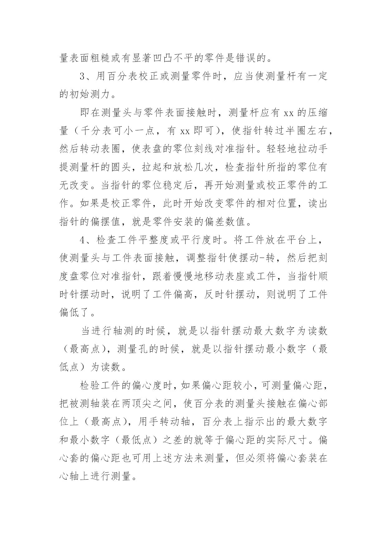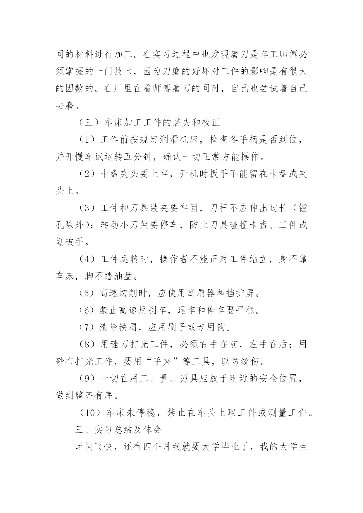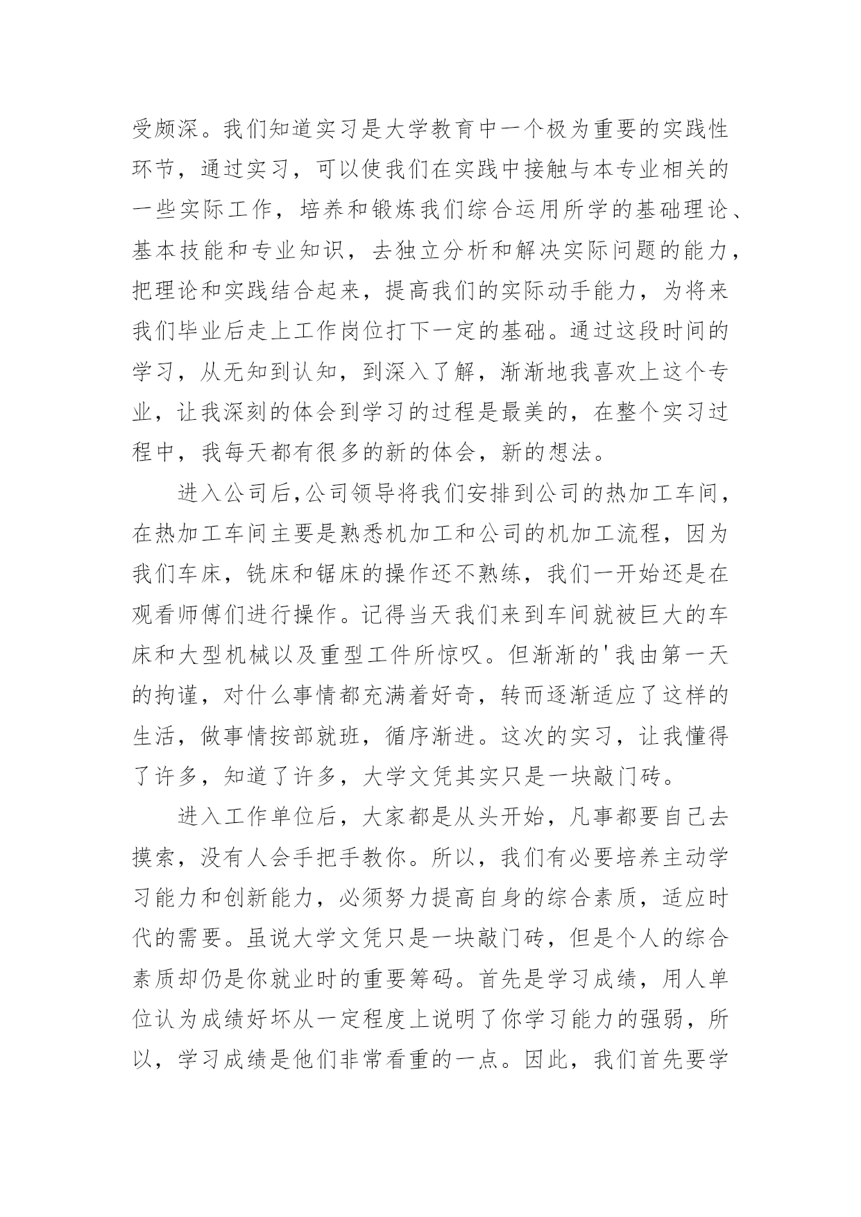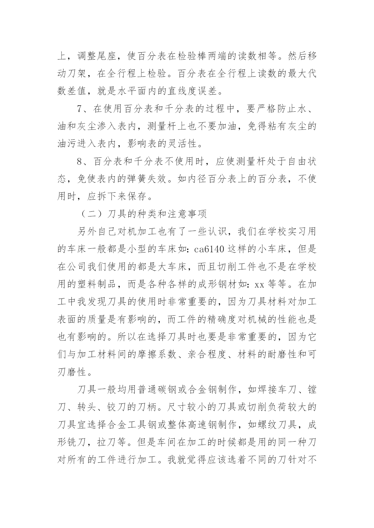 机电一体化技术专业顶岗实习报告机电一体化技术专业顶岗实习报告随着个人的素质不断提高,报告十分的重要,我们在写报告的时候要注意逻辑的合理性。相信很多朋友都对写报告感到非常苦恼吧,下面是小编整理的机电一体化技术专业顶岗实习报告,仅供参考,欢迎大家阅读。机电一体化技术专业顶岗实习报告1一、实习目的通过在xx的实习,可以使我们在实践中接触与本专业相关的一些实际工作,培养和锻炼我们综合运用所学的基础理论、基本技能和专业知识,去独立分析和解决实际问题的能力,把理论和实践结合起来,提高我们的实际动手能力,为将来我们毕业后走上工作岗位打下一定的基础。二、实习内容(一)量具当中百分表、千分尺在机加工中的使用1、使用前,应检查测量杆活动的灵活性。即轻轻推动测量杆时,测量杆在套筒内的移动要灵活,没有任何轧卡现象,且每次放松后,指针能回复到原来的刻度位置。2、测量时,不要使测量杆的行程超过它的测量范围;不要使测量头突然撞在零件上;不要使百分表和千分表受到剧烈的振动和撞击,亦不要把零件强迫推入测量头下,免得损坏百分表和千分表的机件而失去精度。因此,用百分表测量表面粗糙或有显著凹凸不平的零件是错误的。3、用百分表校正或测量零件时,应当使测量杆有一定的初始测力。即在测量头与零件表面接触时,测量杆应有xx的压缩量(千分表可小一点,有xx即可),使指针转过半圈左右,然后转动表圈,使表盘的零位刻线对准指针。轻轻地拉动手提测量杆的圆头,拉起和放松几次,检查指针所指的零位有无改变。当指针的零位稳定后,再开始测量或校正零件的工作。如果是校正零件,此时开始改变零件的相对位置,读出指针的偏摆值,就是零件安装的偏差数值。4、检查工件平整度或平行度时。将工件放在平台上,使测量头与工件表面接触,调整指针使摆动-转,然后把刻度盘零位对准指针,跟着慢慢地移动表座或工件,当指针顺时针摆动时,说明了工件偏高,反时针摆动,则说明了工件偏低了。当进行轴测的时候,就是以指针摆动最大数字为读数(最高点),测量孔的时候,就是以指针摆动最小数字(最低点)为读数。检验工件的偏心度时,如果偏心距较小,可测量偏心距,把被测轴装在两顶尖之间,使百分表的测量头接触在偏心部位上(最高点),用手转动轴,百分表上指示出的最大数字和最小数字(最低点)之差的就等于偏心距的实际尺寸。偏心套的偏心距也可用上述方法来测量,但必须将偏心套装在心轴上进行测量。偏心距较大的工件,因受到百分表测量范围的限制,就不能用上述方法测量。这时可用间接测量偏心距的方法。测量时,把v形铁放在平板上,并把工件放在v形铁中,转动偏心轴,用百分表测量出偏心轴的最高点,找出最高点后,工件固定不动。再用百分表水平移动,测出偏心轴外圆到基准外圆之间的距离a,然后用下式计算出偏心距e:偏心距的间接测量方法式中e——偏心距(mm);d——基准轴外径(mm);d——偏心轴直径(mm);a——基准轴外圆到偏心轴外圆之间最小距离(mm)。用上述方法,必须把基准轴直径和偏心轴直径用百分尺测量出正确的实际尺寸,否则计算时会产生误差。5、检验车床主轴轴线对刀架移动平行度时,在主轴锥孔中插入一检验棒,把百分表固定在刀架上,使百分表测头触及检验棒表面。移动刀架,分别对侧母线a和上母线b进行检验,记录百分表读数的最大差值。为消除检验棒轴线与旋转轴线不重合对测量的影响,必须旋转主轴xx,再同样检验一次a、b的误差分别计算,两次测量结果的代数和之半就是主轴轴线对刀架移动的平行度误差。要求水平面内的平行度允差只许向前偏,即检验棒前端偏向操作者;垂直平面内的平行度允差只许向上偏。6、检验刀架移动在水平面内直线度时,将百分表固定在刀架上,使其测头顶在主轴和尾座顶尖间的检验棒侧母线上,调整尾座,使百分表在检验棒两端的读数相等。然后移动刀架,在全行程上检验。百分表在全行程上读数的最大代数差值,就是水平面内的直线度误差。7、在使用百分表和千分表的过程中,要严格防止水、油和灰尘渗入表内,测量杆上也不要加油,免得粘有灰尘的油污进入表内,影响表的灵活性。8、百分表和千分表不使用时,应使测量杆处于自由状态,免使表内的弹簧失效。如内径百分表上的百分表,不使用时,应拆下来保存。(二)刀具的种类和注意事项另外自己对机加工也有了一些认识,我们在学校实习用的车床一般都是小型的车床如:ca6140这样的小车床,但是在公司我们使用的都是大车床,而且切削工件也不是在学校用的塑料制品,而是各种各样的成形钢材如:xx等等。在加工中我发现刀具的使用时非常重要的,因为刀具材料对加工表面的质量是有影响的,而工件的精确度对机械的性能也是也有影响的。所以在选择刀具时也要是非常重要的,因为它们与加工材料间的摩擦系数、亲合程度、材料的耐磨性和可刃磨性。刀具一般均用普通碳钢或合金钢制作,如焊接车刀、镗刀、转头、铰刀的刀柄。尺寸较小