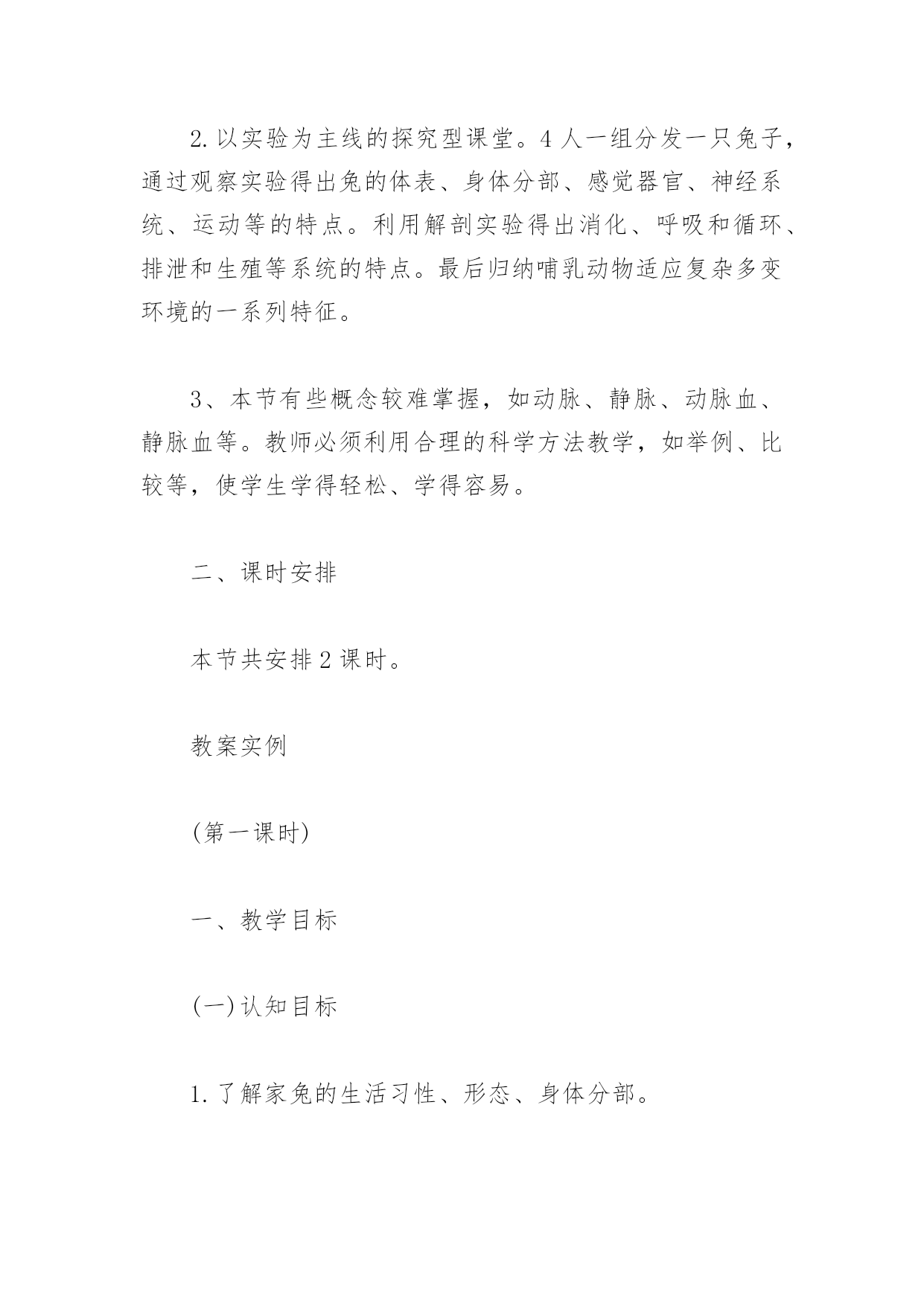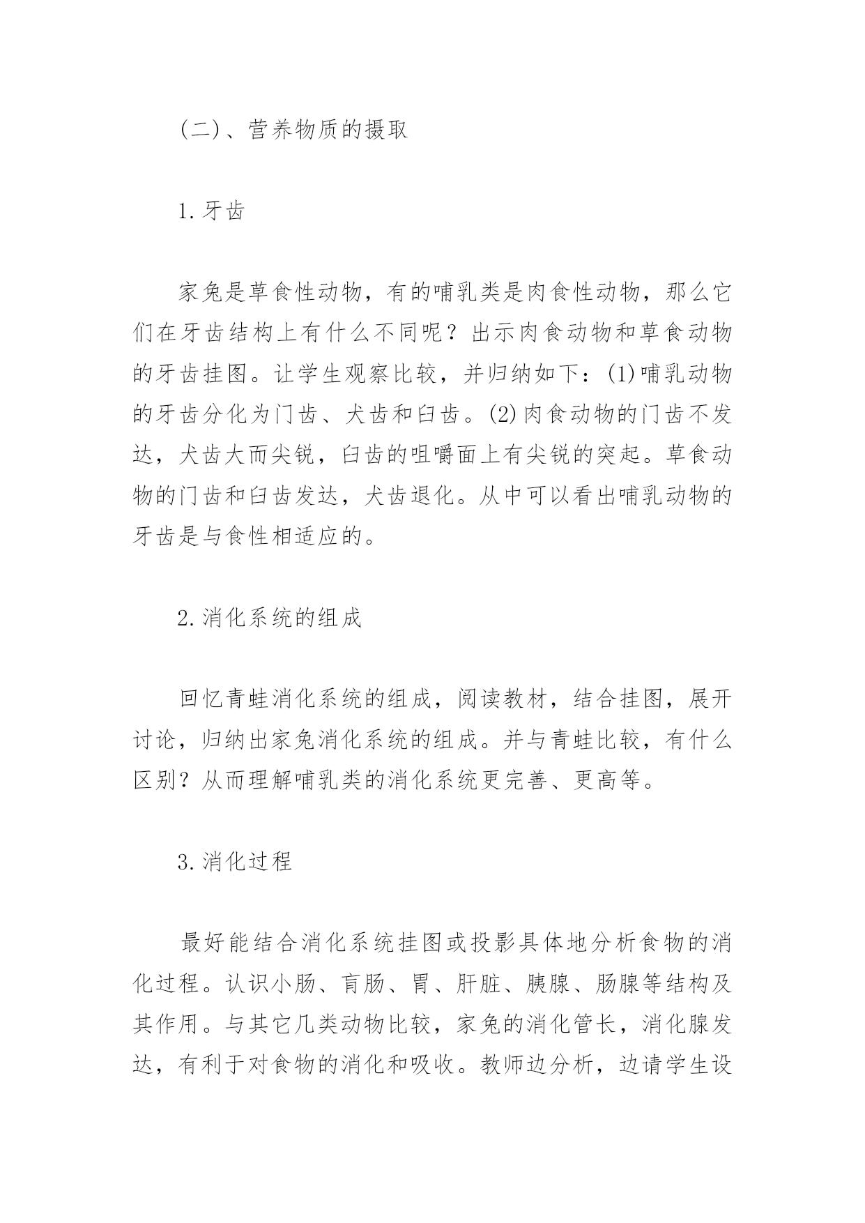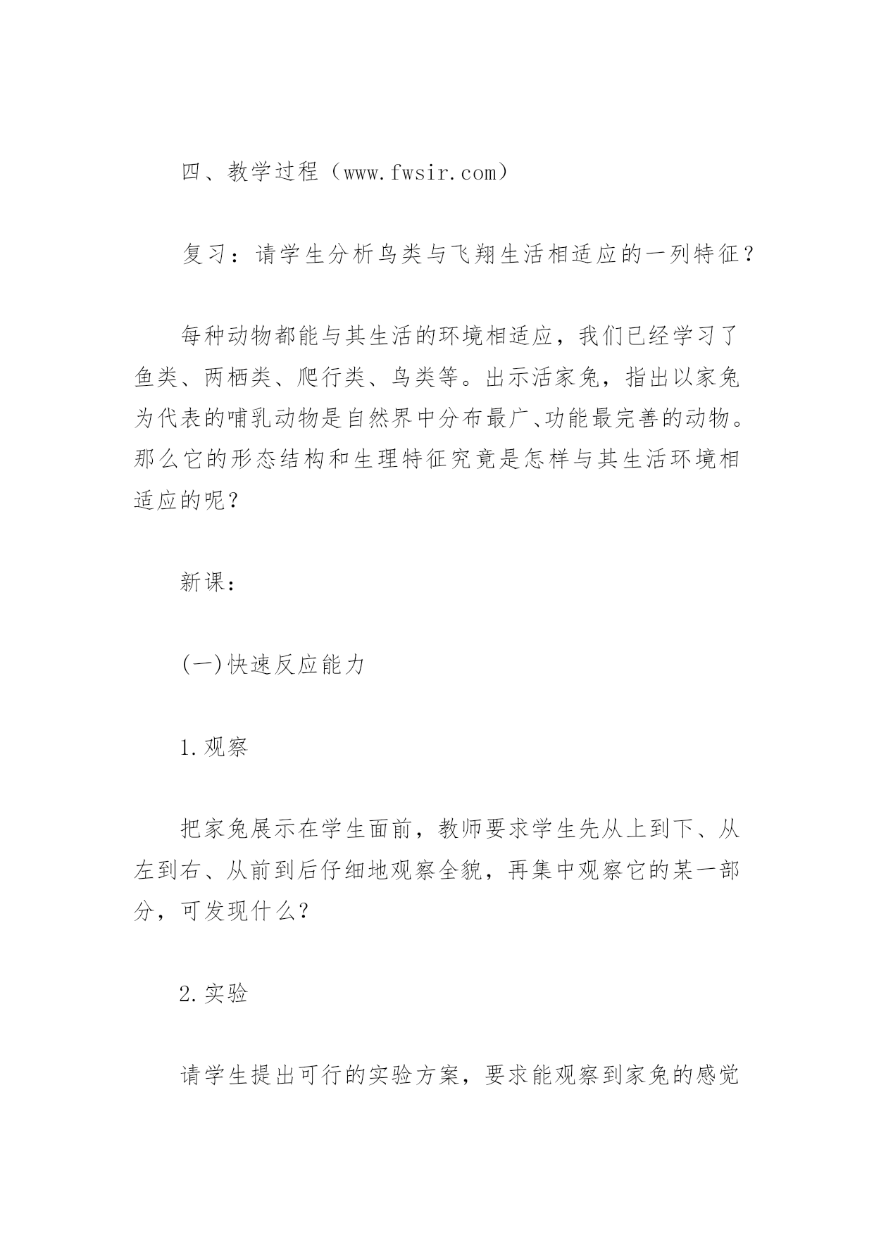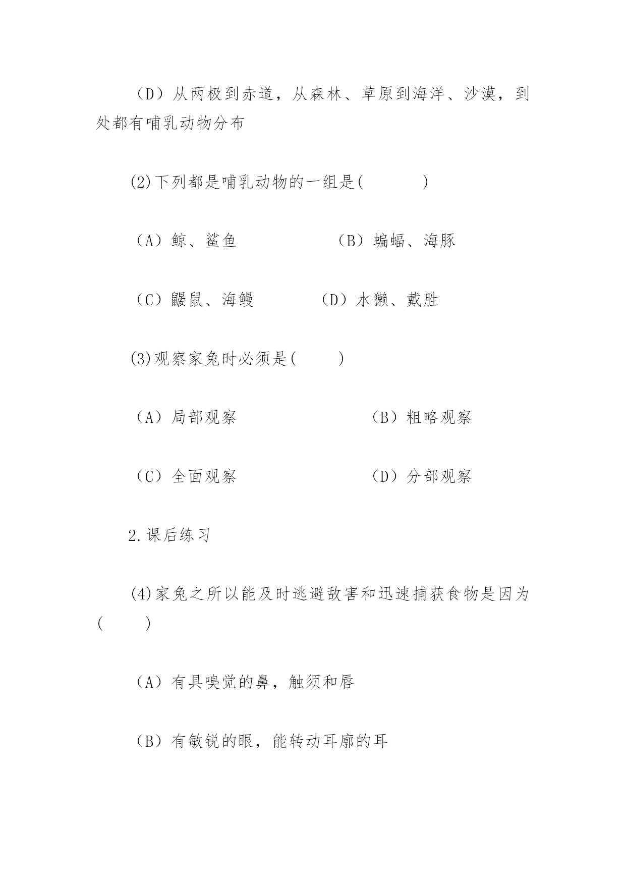 动物世界的教学设计动物世界的教学设计哺乳类教材分析哺乳类是动物界中分布最广泛、功能最完善、进化最高等的动物。教材紧紧围绕这一基本特点,以家兔为代表,采用特殊到一般,个别到整体的学习方法,从生活习性、形态、结构和生理特征等方面进行剖析。一方面明确了生物与环境之间的和谐统一,另一方面能体会到生物的进化规律。教法指导一、授课思路与方法1.利用实物、标本、挂图等教学资源引导学生仔细观察,分析家兔的体表、身体分部、神经系统、运动系统、消化系统、呼吸系统、循环系统、生殖系统、繁殖等方面的特点,体会生物体的结构与功能、生物与环境的和谐统一,以及生物进化的观点。2.以实验为主线的探究型课堂。4人一组分发一只兔子,通过观察实验得出兔的体表、身体分部、感觉器官、神经系统、运动等的特点。利用解剖实验得出消化、呼吸和循环、排泄和生殖等系统的特点。最后归纳哺乳动物适应复杂多变环境的一系列特征。3、本节有些概念较难掌握,如动脉、静脉、动脉血、静脉血等。教师必须利用合理的科学方法教学,如举例、比较等,使学生学得轻松、学得容易。二、课时安排本节共安排2课时。教案实例(第一课时)一、教学目标(一)认知目标1.了解家兔的生活习性、形态、身体分部。2.掌握家兔神经系统、消化系统的组成和功能。(二)技能目标提高学生观察实物、分析动物形态结构的能力。(三)情感目标1.体会生物体的结构与功能、生物与环境的和谐统一。2.通过对家兔的观察、小组间的合作交流,培养学生严谨、踏实的治学态度,培养学生的合作意识。二、教学重点与难点1.教学重点:与家兔复杂的取食、避敌等行为相适应的形态结构特点。2.教学难点:神经系统的功能和组成。(三)教学准备活家兔、家兔骨骼标本、家兔神经系统挂图、哺乳类牙齿挂图、家兔消化系统挂图。四、教学过程(www.fwsir.com)复习:请学生分析鸟类与飞翔生活相适应的一列特征?每种动物都能与其生活的环境相适应,我们已经学习了鱼类、两栖类、爬行类、鸟类等。出示活家兔,指出以家兔为代表的哺乳动物是自然界中分布最广、功能最完善的动物。那么它的形态结构和生理特征究竟是怎样与其生活环境相适应的呢?新课:(一)快速反应能力1.观察把家兔展示在学生面前,教师要求学生先从上到下、从左到右、从前到后仔细地观察全貌,再集中观察它的某一部分,可发现什么?2.实验请学生提出可行的实验方案,要求能观察到家兔的感觉器官、神经系统、运动系统等方面的特征。感觉器官:如敲击(耳的听觉)、菜叶(鼻的嗅觉、触须和唇的触觉、眼的视觉)。神经系统:菜叶作饵料,观察它的一系列反应。运动系统:用棒驱赶,观察它的运动情况。3.分析归纳以学生为主体,教师适当引导、分析。形态特征:体表被毛,体分头、颈、躯干、四肢和尾五部分。感觉器官:发达,包括眼、耳、触须、唇等。神经系统:由脑、脊髓和它们发出的神经组成。能通过感觉器官感受外界的各种刺激,并作出相应的反应。运动系统:展示家兔的骨骼标本,观察到后肢骨特别粗大,因而后肢肌肉发达。这与家兔快速取食和避敌有关。(二)、营养物质的摄取1.牙齿家兔是草食性动物,有的哺乳类是肉食性动物,那么它们在牙齿结构上有什么不同呢?出示肉食动物和草食动物的牙齿挂图。让学生观察比较,并归纳如下:(1)哺乳动物的牙齿分化为门齿、犬齿和臼齿。(2)肉食动物的门齿不发达,犬齿大而尖锐,臼齿的咀嚼面上有尖锐的突起。草食动物的门齿和臼齿发达,犬齿退化。从中可以看出哺乳动物的牙齿是与食性相适应的。2.消化系统的组成回忆青蛙消化系统的组成,阅读教材,结合挂图,展开讨论,归纳出家兔消化系统的组成。并与青蛙比较,有什么区别?从而理解哺乳类的消化系统更完善、更高等。3.消化过程最好能结合消化系统挂图或投影具体地分析食物的消化过程。认识小肠、肓肠、胃、肝脏、胰腺、肠腺等结构及其作用。与其它几类动物比较,家兔的消化管长,消化腺发达,有利于对食物的消化和吸收。教师边分析,边请学生设计消化过程图,对设计较好的图在班级加以展示,加深印象。最后小结家兔的形态结构特征和神经、运动、消化等生理特点,体会生物体结构与功能、生物与环境之间的和谐统一。五、板书设计(一)快速反应能力脑、脊髓、神经构成神经系统功能通过感觉器官(眼、耳、鼻、触须、唇)感受外界的刺激,产生相应的反应。如运动后肢粗大,善于跳跃,且运动速度快。(二)营养物质的摄取1.牙齿:分化为门齿、犬齿、臼齿。2.消化系统的组成及过程:食物→口腔→咽→食道→胃(胃腺分泌胃液)→小肠(肠腺分泌肠液)(营养物质被吸收,粗纤维进入盲肠)→大肠→肛门。六、习题与解析1.随堂练习(1)以下叙述中不符合哺乳类的是()(A)全身被毛,运动快速(B)各系统功能完善,体温恒定(C)分布较广泛,功能较完善的动物(D)从两极到赤道,从森林、草原到海洋、沙漠,到处都有哺乳动物分布(2)